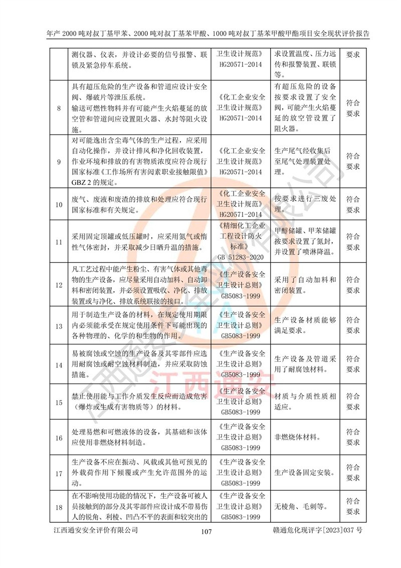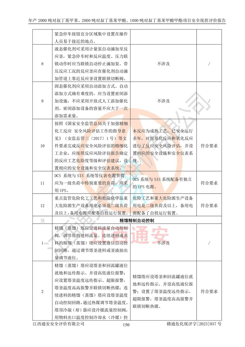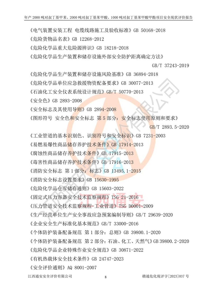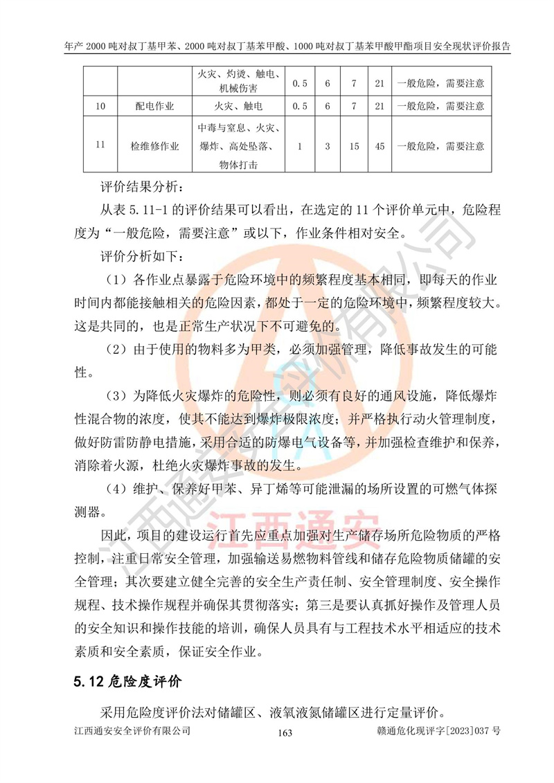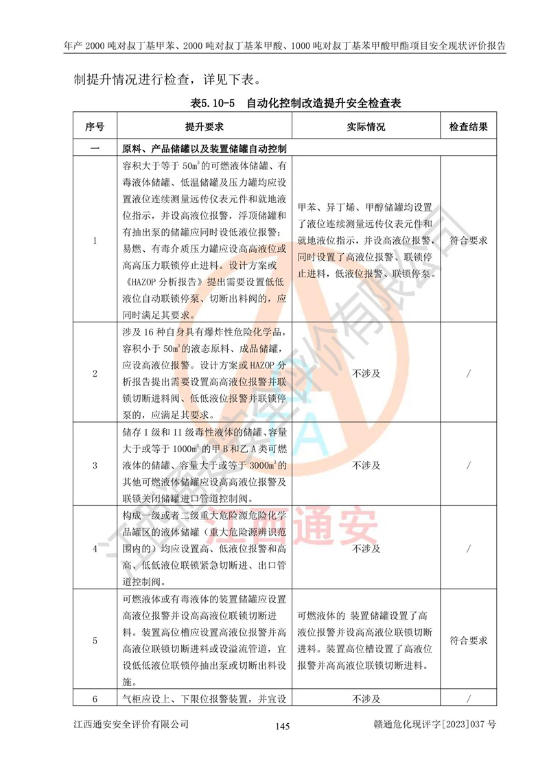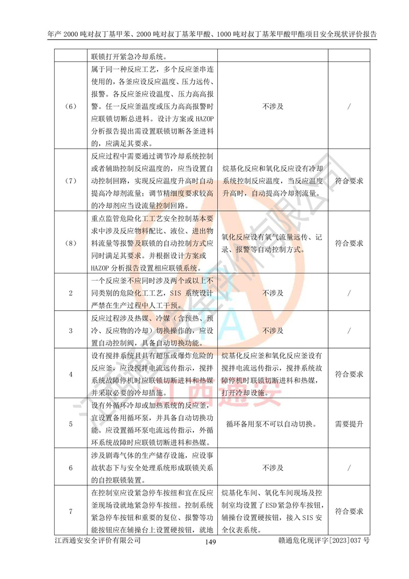 江西永通科技股份有限公司位于江西省贛州市寧都縣工業(yè)園,法定**人為劉忠春,成立于2009年09月25日,注冊(cè)資本玖仟陸佰肆拾陸萬(wàn)陸仟元整,營(yíng)業(yè)執(zhí)照經(jīng)營(yíng)范圍為化學(xué)原料藥、醫(yī)藥中間體等研發(fā)、生產(chǎn)、銷售等。 江西永通科技股份有限公司2020年10月26日取得了《安全生產(chǎn)許可證》,許可證編號(hào):(贛)WH安許證字[2011]0642號(hào),許可范圍為對(duì)叔丁基甲苯(2kt/a)、對(duì)叔丁基苯甲酸(2kt/a)、對(duì)叔丁基苯甲酸甲酯(1kt/a),**期:2020年10月26日至2023年10月25日。該公司2021年10月22日取得了安全生產(chǎn)標(biāo)準(zhǔn)化證書,證書編號(hào):贛市AQBWHⅢ[2021]168,**期至2024年10月21日。該公司現(xiàn)有員工133人,其中專職安全管理人員3人。 江西永通科技股份有限公司年產(chǎn)2000噸對(duì)叔丁基甲苯、2000噸對(duì)叔丁基苯甲酸、1000噸對(duì)叔丁基苯甲酸甲酯項(xiàng)目生產(chǎn)過(guò)程中涉及的原輔材料為甲苯、異丁烯、液氧(氧氣)、甲醇、濃硫酸、液堿(氫氧化鈉)、活性炭、硅藻土、氧化催化劑和氮?dú)?,產(chǎn)品為對(duì)叔丁基甲苯、對(duì)叔丁基苯甲酸和對(duì)叔丁基苯甲酸甲酯。根據(jù)《危險(xiǎn)化學(xué)品目錄》,該項(xiàng)目涉及的甲苯、異丁烯、液氧(氧氣)、甲醇、濃硫酸、液堿(氫氧化鈉)和氮?dú)鈱儆?/span>危險(xiǎn)化學(xué)品。經(jīng)辨識(shí),甲苯和甲醇屬于重點(diǎn)監(jiān)管的危險(xiǎn)化學(xué)品,甲苯和硫酸屬于第三類易制毒化學(xué)品、甲醇屬于特別管控的危險(xiǎn)化學(xué)品,不涉及監(jiān)控化學(xué)品、易制爆危險(xiǎn)化學(xué)品、劇毒化學(xué)品和高毒物品,儲(chǔ)罐區(qū)構(gòu)成三級(jí)重大危險(xiǎn)源,其他生產(chǎn)、儲(chǔ)存單元不構(gòu)成危險(xiǎn)化學(xué)品重大危險(xiǎn)源,涉及的烷基化反應(yīng)和氧化反應(yīng)屬于重點(diǎn)監(jiān)管的危險(xiǎn)化工工藝。根據(jù)《安全生產(chǎn)許可證條例》、《危險(xiǎn)化學(xué)品安全管理?xiàng)l例》和《危險(xiǎn)化學(xué)品生產(chǎn)企業(yè)安全生產(chǎn)許可實(shí)施辦法》的相關(guān)規(guī)定,該項(xiàng)目涉及甲苯回收,需要辦理危險(xiǎn)化學(xué)品安全生產(chǎn)許可證。根據(jù)生產(chǎn)工藝特點(diǎn)及物料的理化特性可知,該項(xiàng)目生產(chǎn)過(guò)程中存在火災(zāi)與爆炸、中毒與窒息、觸電、機(jī)械傷害等危險(xiǎn)有害因素。 該公司自2020年10月26日取得安全生產(chǎn)許可證以來(lái),生產(chǎn)運(yùn)行正常,未發(fā)生一般及以上生產(chǎn)安全事故。 |