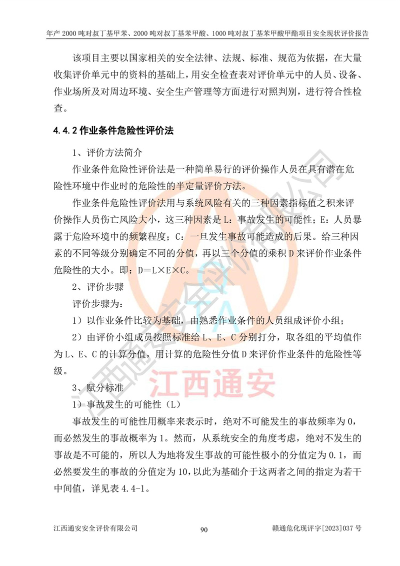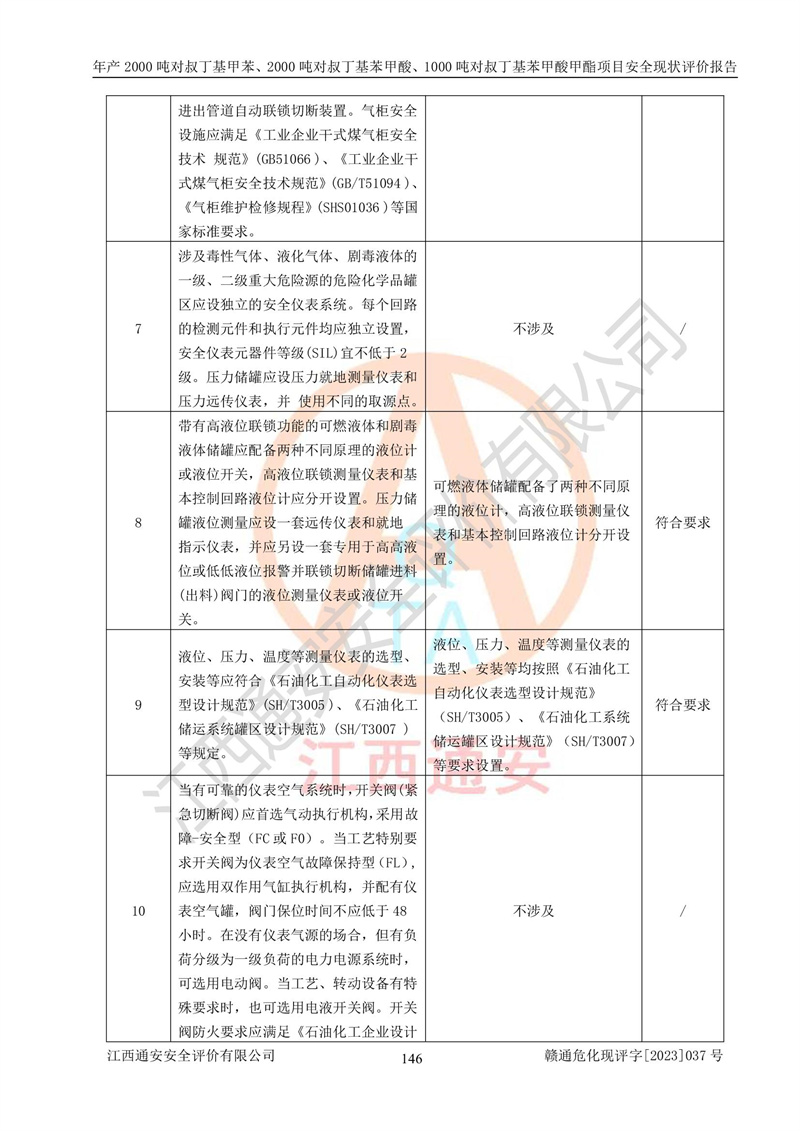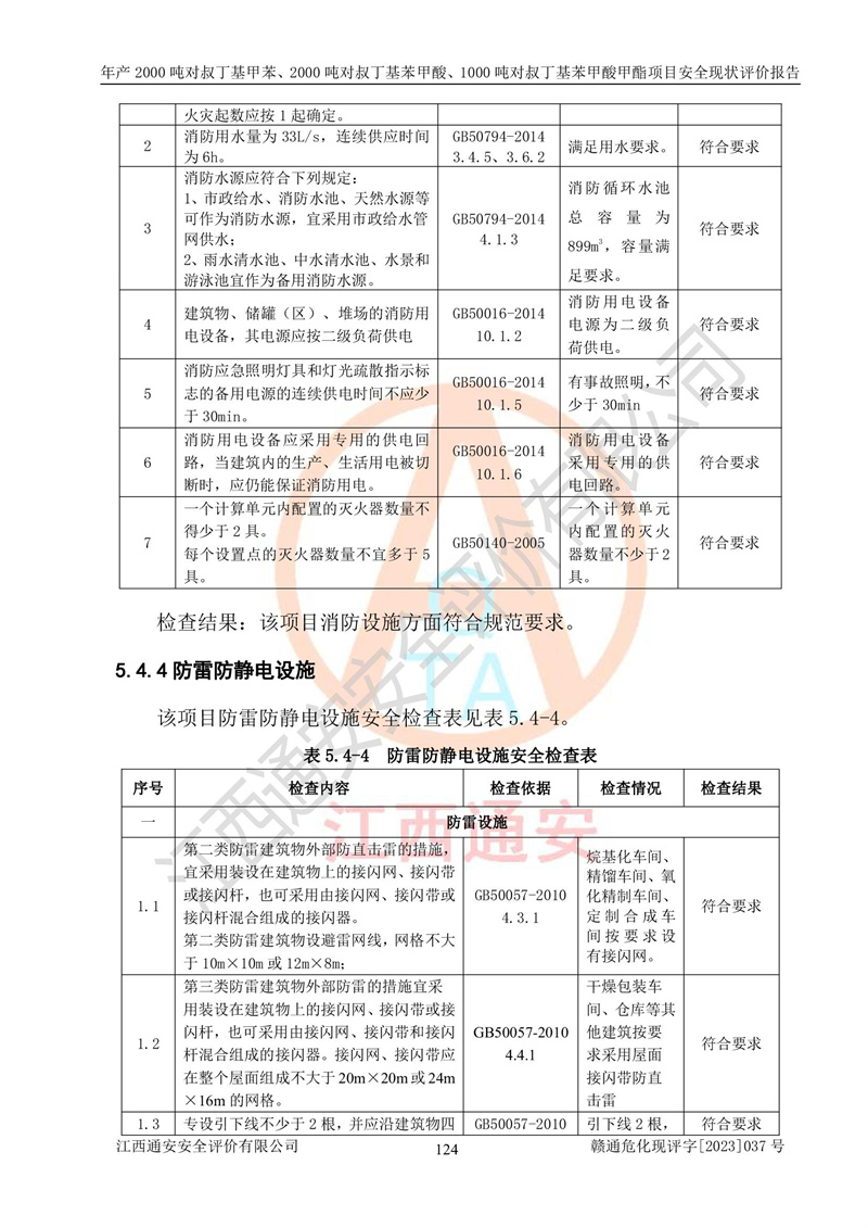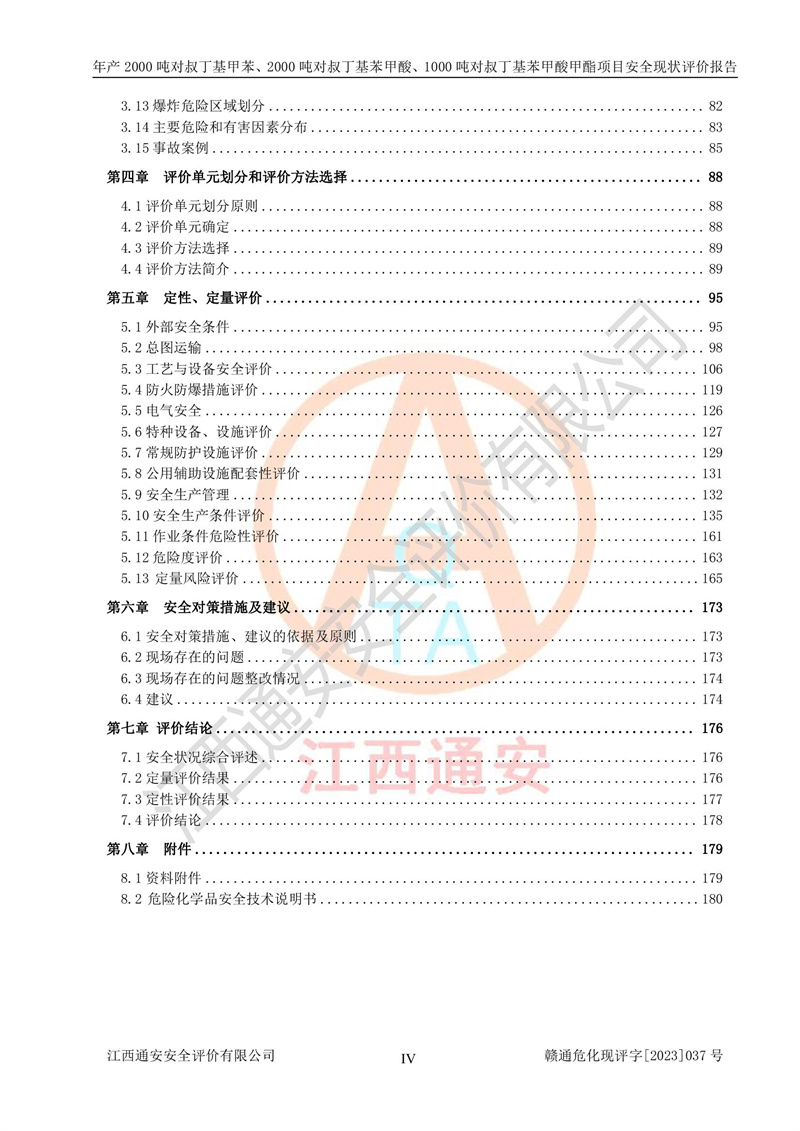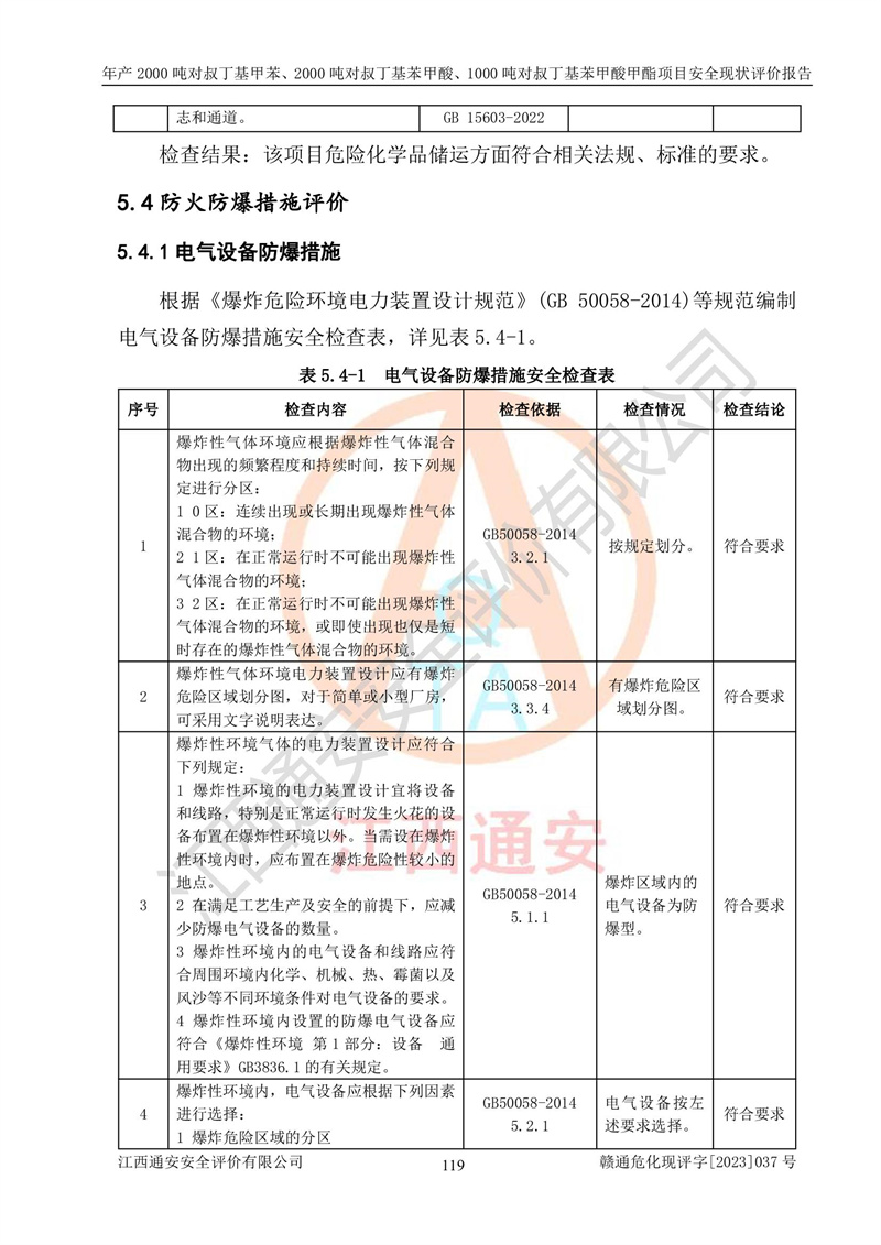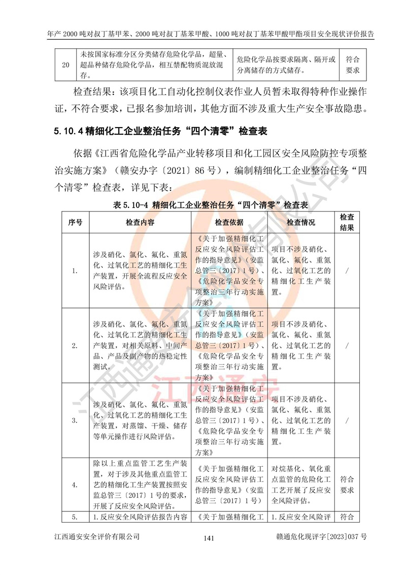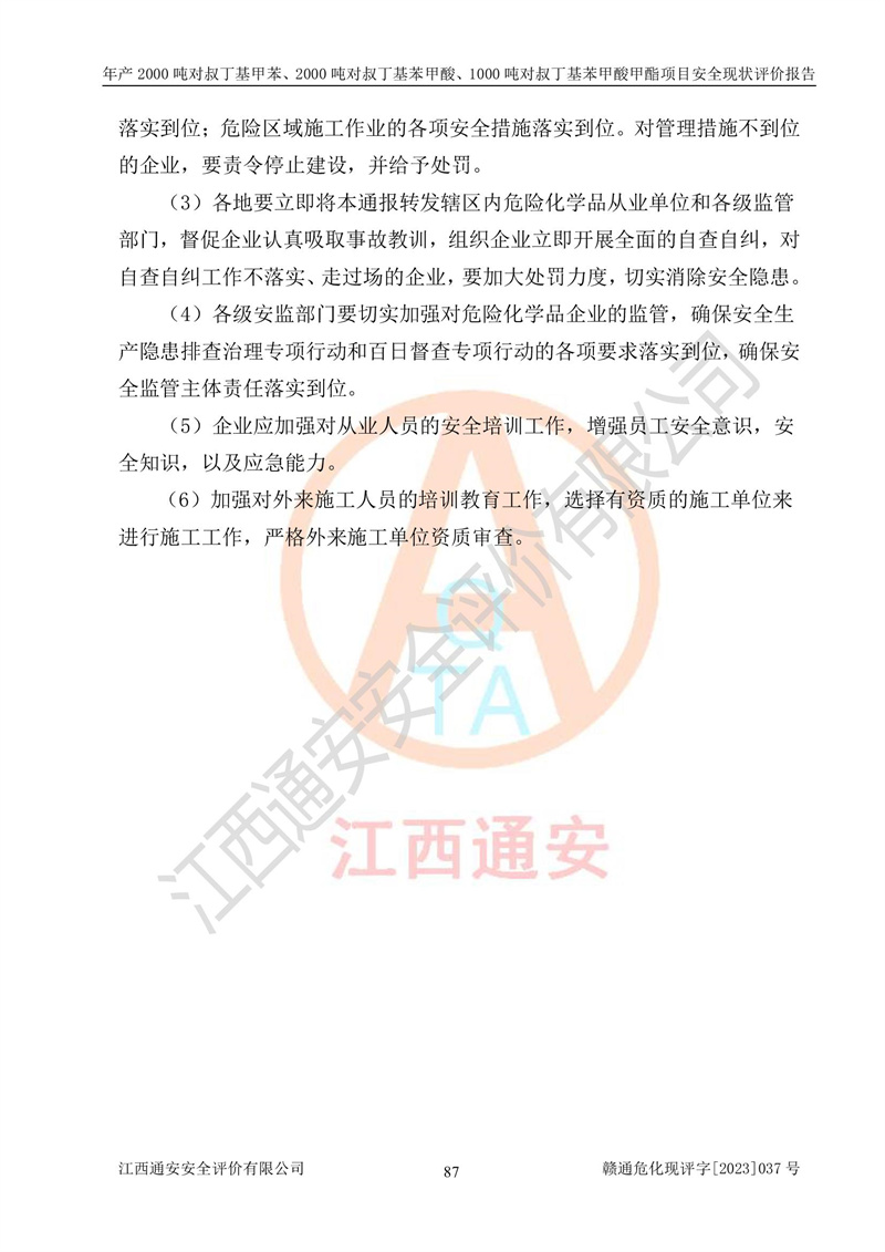 江西永通科技股份有限公司位于江西省贛州市寧都縣工業(yè)園,法定**人為劉忠春,成立于2009年09月25日,注冊(cè)資本玖仟陸佰肆拾陸萬(wàn)陸仟元整,營(yíng)業(yè)執(zhí)照經(jīng)營(yíng)范圍為化學(xué)原料藥、醫(yī)藥中間體等研發(fā)、生產(chǎn)、銷售等。 江西永通科技股份有限公司2020年10月26日取得了《安全生產(chǎn)許可證》,許可證編號(hào):(贛)WH安許證字[2011]0642號(hào),許可范圍為對(duì)叔丁基甲苯(2kt/a)、對(duì)叔丁基苯甲酸(2kt/a)、對(duì)叔丁基苯甲酸甲酯(1kt/a),**期:2020年10月26日至2023年10月25日。該公司2021年10月22日取得了安全生產(chǎn)標(biāo)準(zhǔn)化證書,證書編號(hào):贛市AQBWHⅢ[2021]168,**期至2024年10月21日。該公司現(xiàn)有員工133人,其中專職安全管理人員3人。 江西永通科技股份有限公司年產(chǎn)2000噸對(duì)叔丁基甲苯、2000噸對(duì)叔丁基苯甲酸、1000噸對(duì)叔丁基苯甲酸甲酯項(xiàng)目生產(chǎn)過(guò)程中涉及的原輔材料為甲苯、異丁烯、液氧(氧氣)、甲醇、濃硫酸、液堿(氫氧化鈉)、活性炭、硅藻土、氧化催化劑和氮?dú)?,產(chǎn)品為對(duì)叔丁基甲苯、對(duì)叔丁基苯甲酸和對(duì)叔丁基苯甲酸甲酯。根據(jù)《危險(xiǎn)化學(xué)品目錄》,該項(xiàng)目涉及的甲苯、異丁烯、液氧(氧氣)、甲醇、濃硫酸、液堿(氫氧化鈉)和氮?dú)鈱儆?/span>危險(xiǎn)化學(xué)品。經(jīng)辨識(shí),甲苯和甲醇屬于重點(diǎn)監(jiān)管的危險(xiǎn)化學(xué)品,甲苯和硫酸屬于第三類易制毒化學(xué)品、甲醇屬于特別管控的危險(xiǎn)化學(xué)品,不涉及監(jiān)控化學(xué)品、易制爆危險(xiǎn)化學(xué)品、劇毒化學(xué)品和高毒物品,儲(chǔ)罐區(qū)構(gòu)成三級(jí)重大危險(xiǎn)源,其他生產(chǎn)、儲(chǔ)存單元不構(gòu)成危險(xiǎn)化學(xué)品重大危險(xiǎn)源,涉及的烷基化反應(yīng)和氧化反應(yīng)屬于重點(diǎn)監(jiān)管的危險(xiǎn)化工工藝。根據(jù)《安全生產(chǎn)許可證條例》、《危險(xiǎn)化學(xué)品安全管理?xiàng)l例》和《危險(xiǎn)化學(xué)品生產(chǎn)企業(yè)安全生產(chǎn)許可實(shí)施辦法》的相關(guān)規(guī)定,該項(xiàng)目涉及甲苯回收,需要辦理危險(xiǎn)化學(xué)品安全生產(chǎn)許可證。根據(jù)生產(chǎn)工藝特點(diǎn)及物料的理化特性可知,該項(xiàng)目生產(chǎn)過(guò)程中存在火災(zāi)與爆炸、中毒與窒息、觸電、機(jī)械傷害等危險(xiǎn)有害因素。 該公司自2020年10月26日取得安全生產(chǎn)許可證以來(lái),生產(chǎn)運(yùn)行正常,未發(fā)生一般及以上生產(chǎn)安全事故。 |