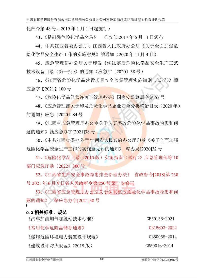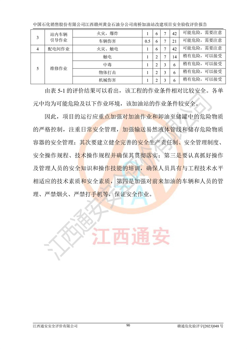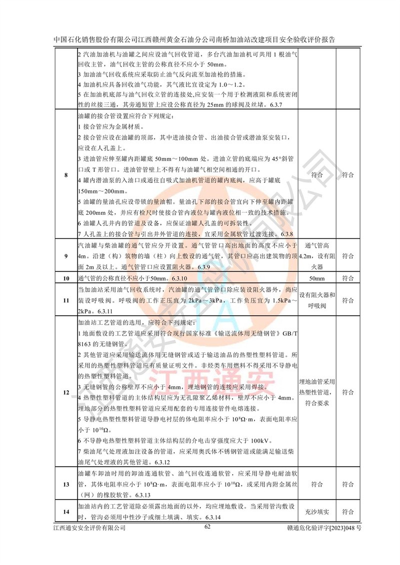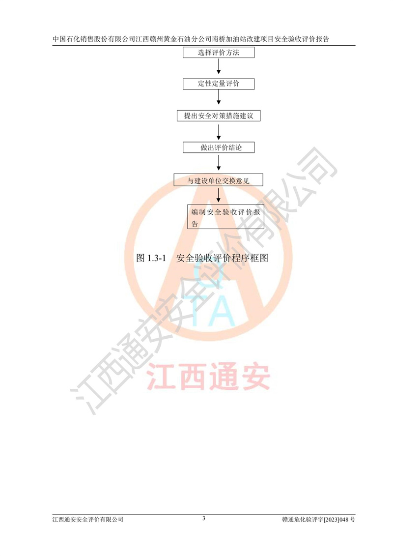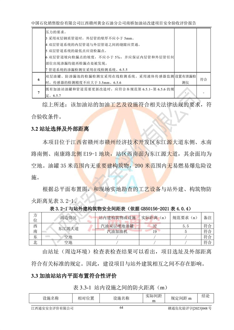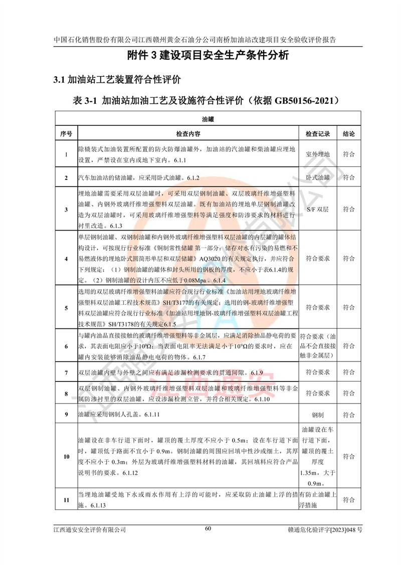 主要任務(wù) | 受中國石化銷售股份有限公司江西贛州黃金石油分公司南橋加油站改建項目的委托,江西通安安全評價有限公司承擔(dān)其項目安全驗收評價工作,于2023年7月組成評價小組,對所提供的資料、文件進(jìn)行了審核,對現(xiàn)場進(jìn)行了實地檢測,根據(jù)《汽車加油加氣加氫站技術(shù)標(biāo)準(zhǔn)》(GB50156-2021)、《安全評價通則》AQ8001-2007和《危險化學(xué)品建設(shè)項目安全評價細(xì)則(試行)》(安監(jiān)總?;痆2007]255號)要求,編寫此評價報告。 | ||||