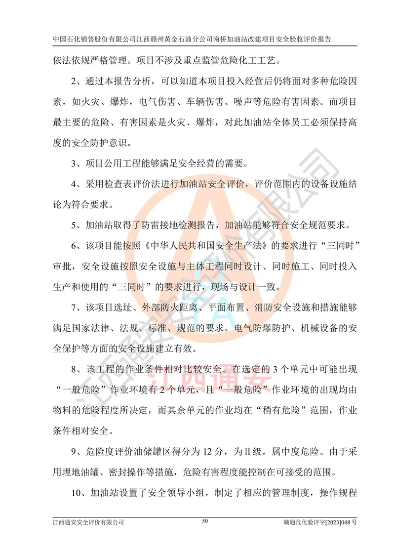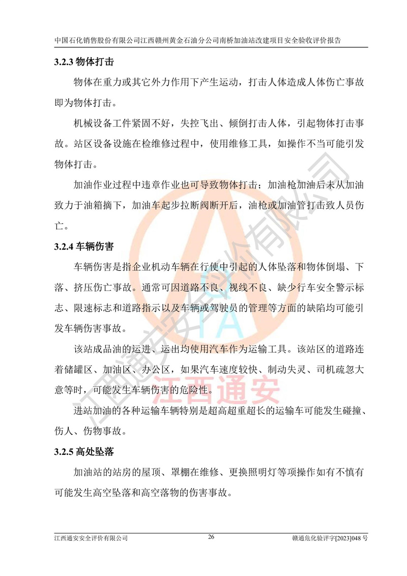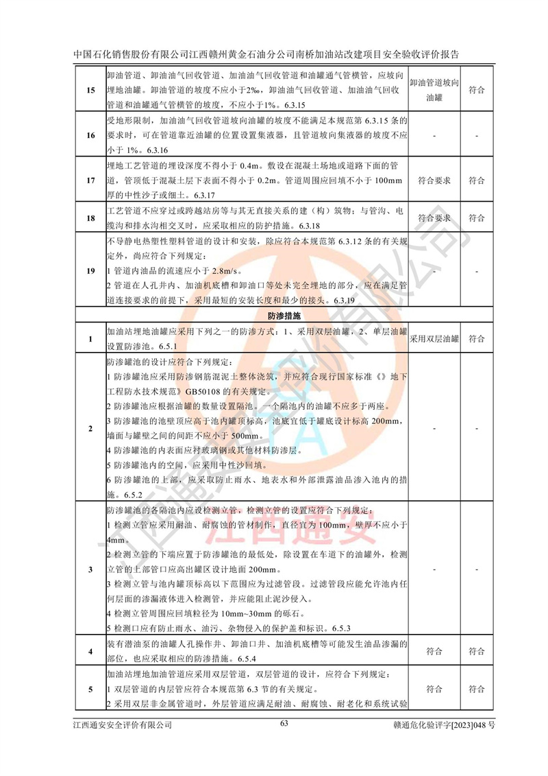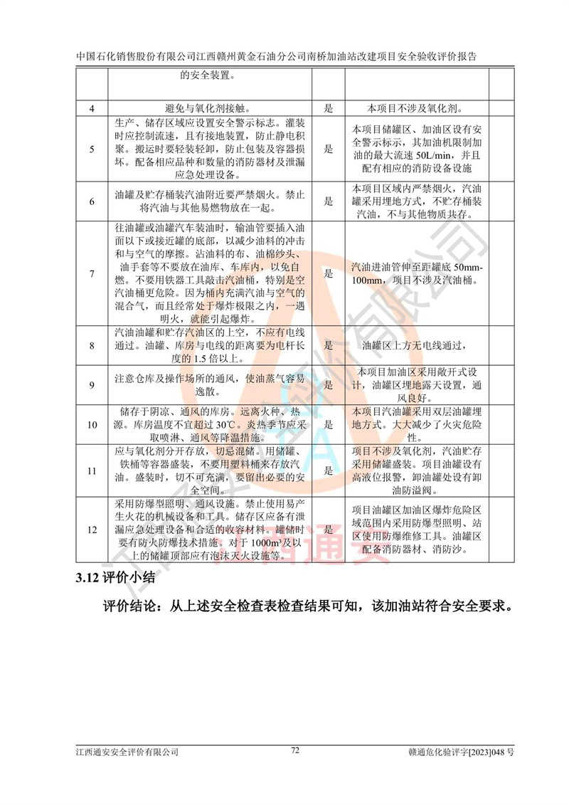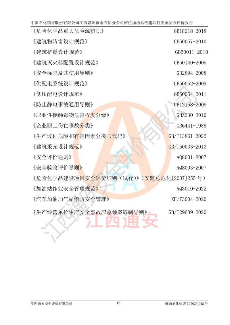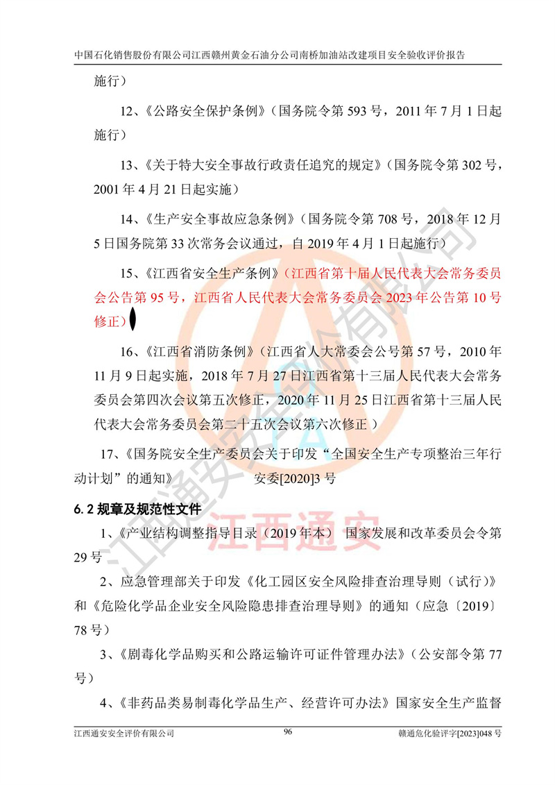 主要任務(wù) | 受中國石化銷售股份有限公司江西贛州黃金石油分公司南橋加油站改建項目的委托,江西通安安全評價有限公司承擔(dān)其項目安全驗收評價工作,于2023年7月組成評價小組,對所提供的資料、文件進(jìn)行了審核,對現(xiàn)場進(jìn)行了實地檢測,根據(jù)《汽車加油加氣加氫站技術(shù)標(biāo)準(zhǔn)》(GB50156-2021)、《安全評價通則》AQ8001-2007和《危險化學(xué)品建設(shè)項目安全評價細(xì)則(試行)》(安監(jiān)總?;痆2007]255號)要求,編寫此評價報告。 | ||||