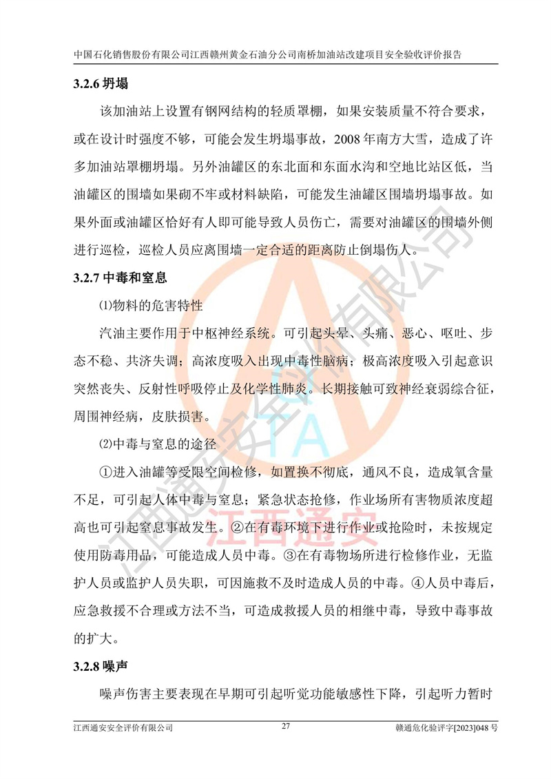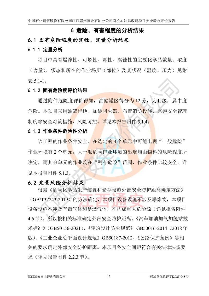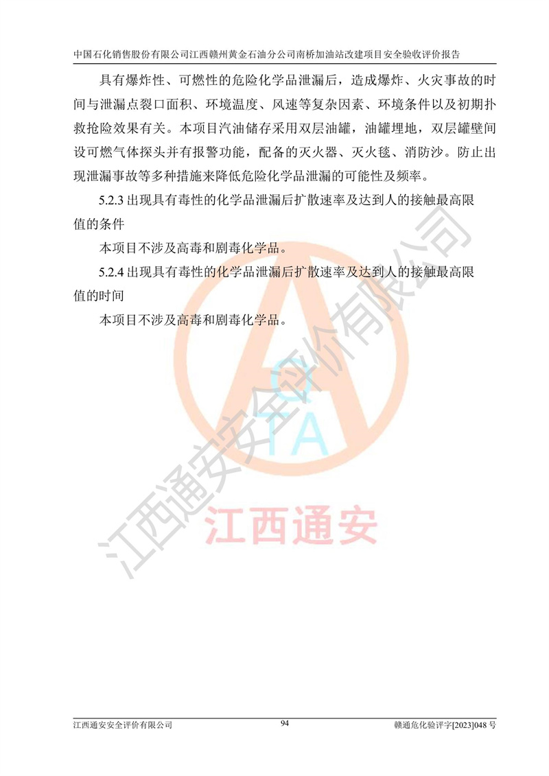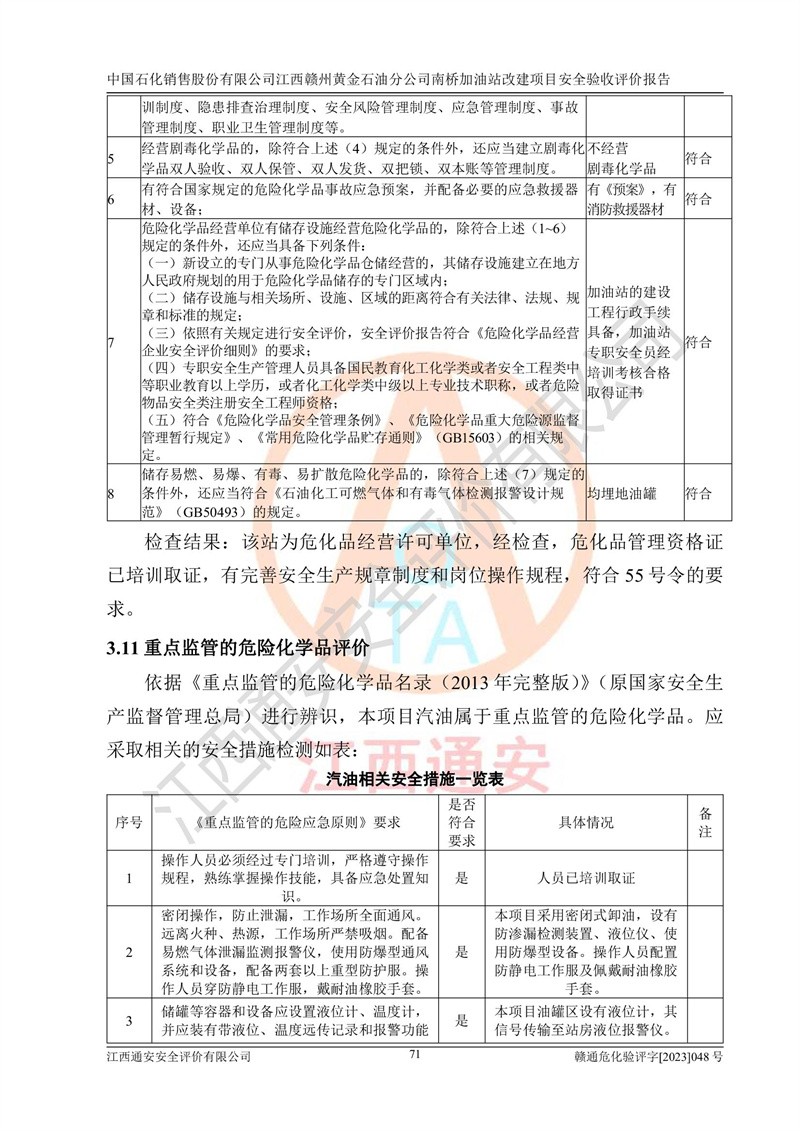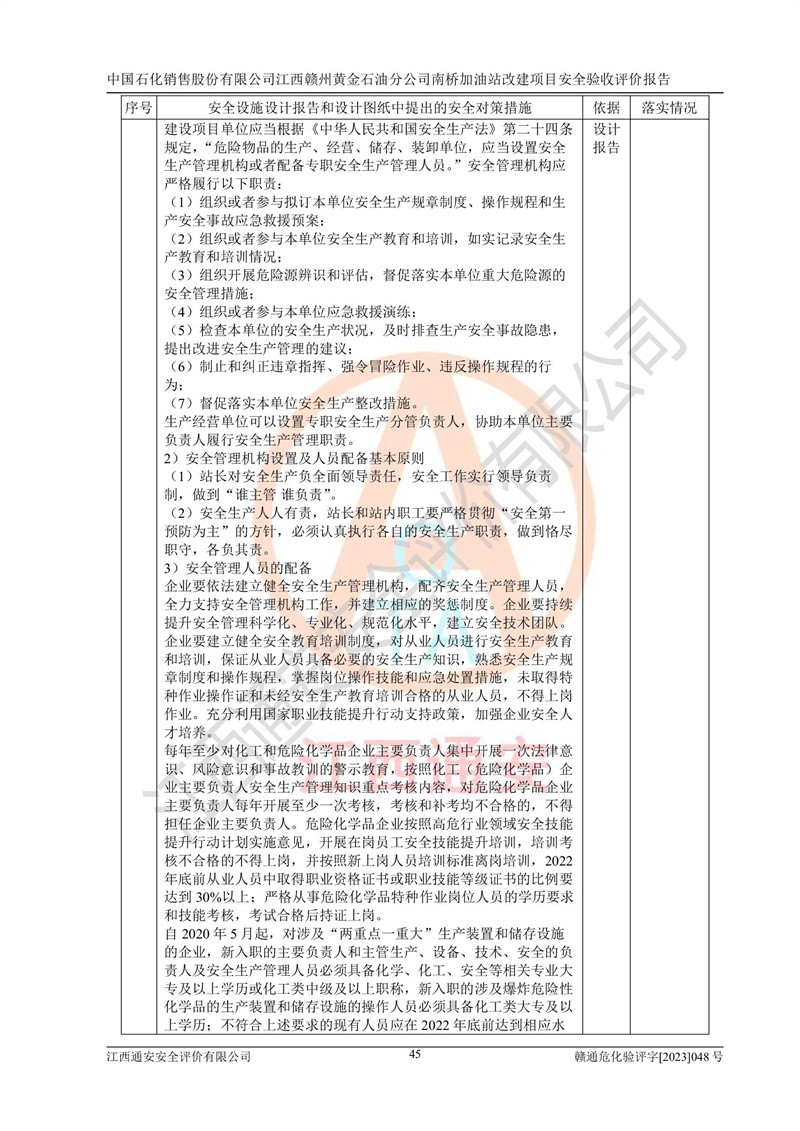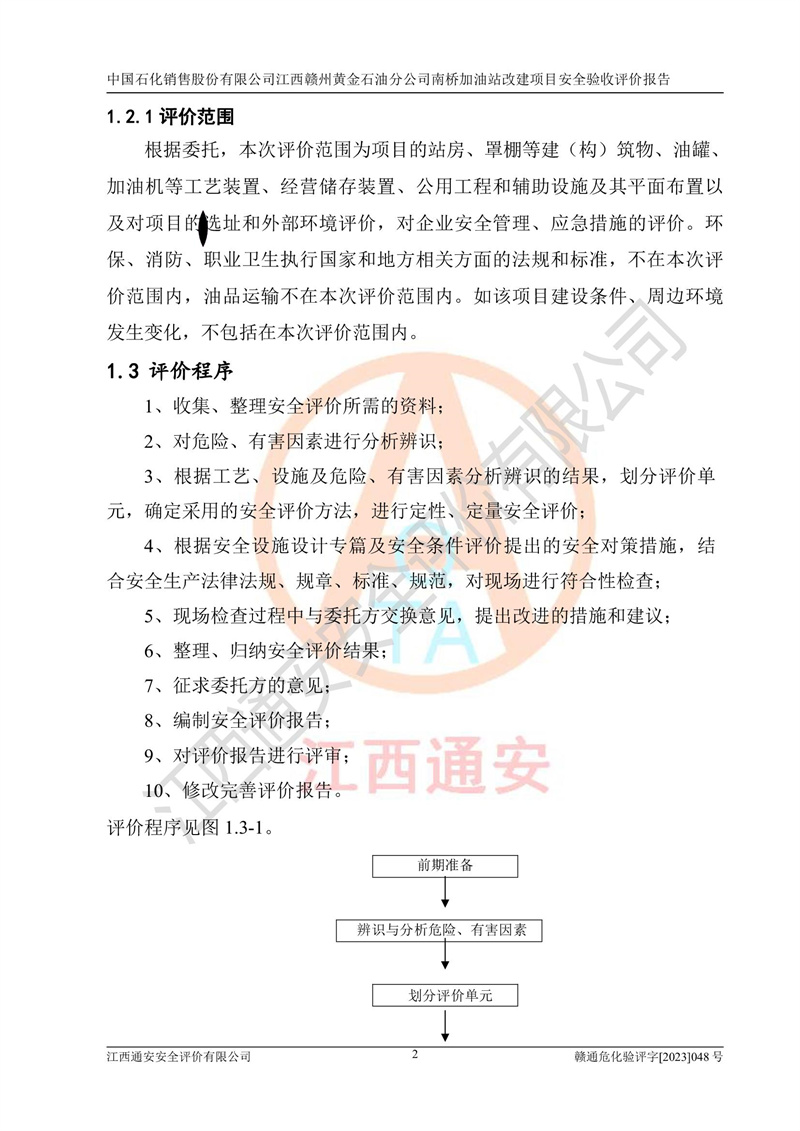 主要任務(wù) | 受中國石化銷售股份有限公司江西贛州黃金石油分公司南橋加油站改建項目的委托,江西通安安全評價有限公司承擔(dān)其項目安全驗收評價工作,于2023年7月組成評價小組,對所提供的資料、文件進(jìn)行了審核,對現(xiàn)場進(jìn)行了實地檢測,根據(jù)《汽車加油加氣加氫站技術(shù)標(biāo)準(zhǔn)》(GB50156-2021)、《安全評價通則》AQ8001-2007和《危險化學(xué)品建設(shè)項目安全評價細(xì)則(試行)》(安監(jiān)總?;痆2007]255號)要求,編寫此評價報告。 | ||||