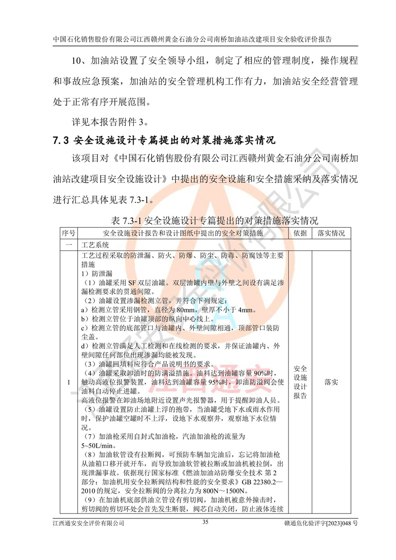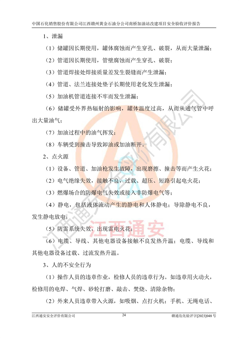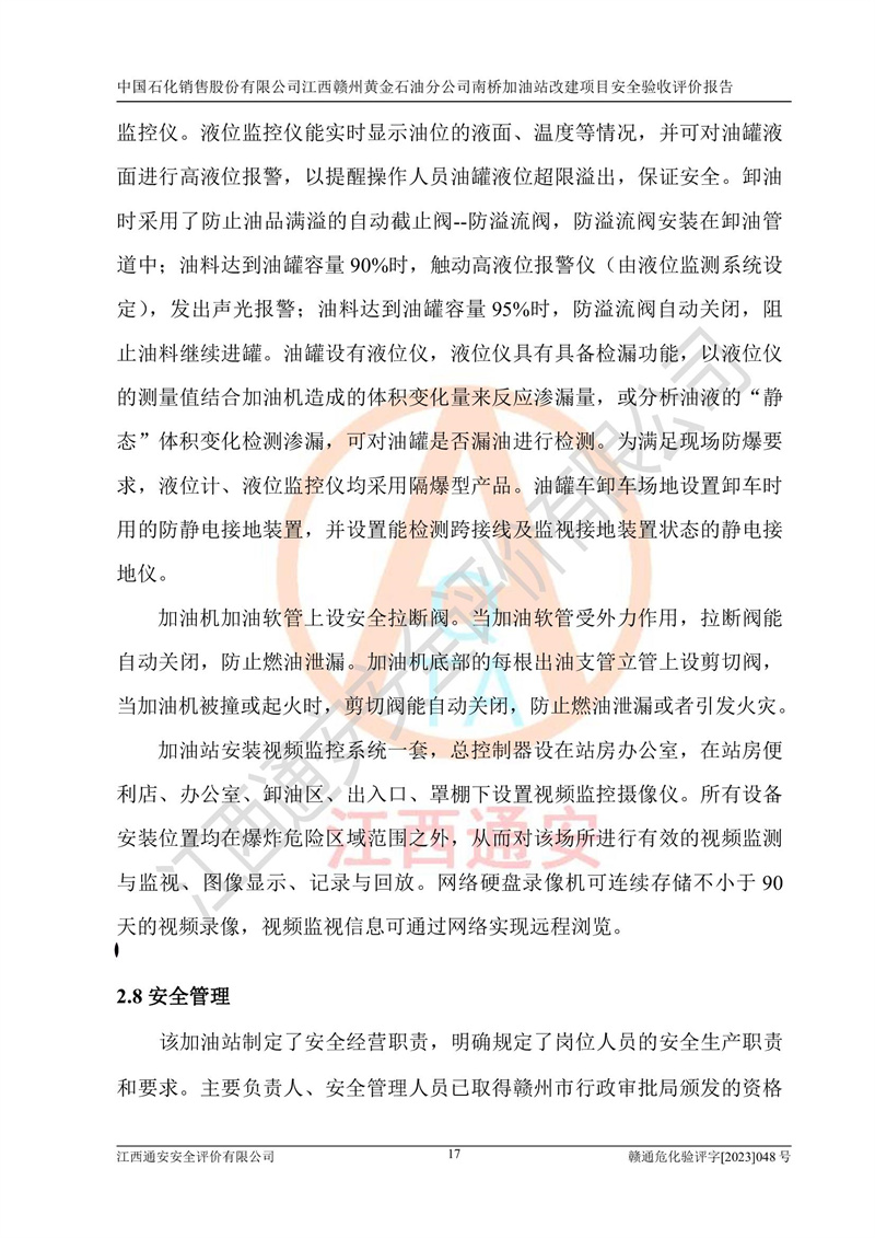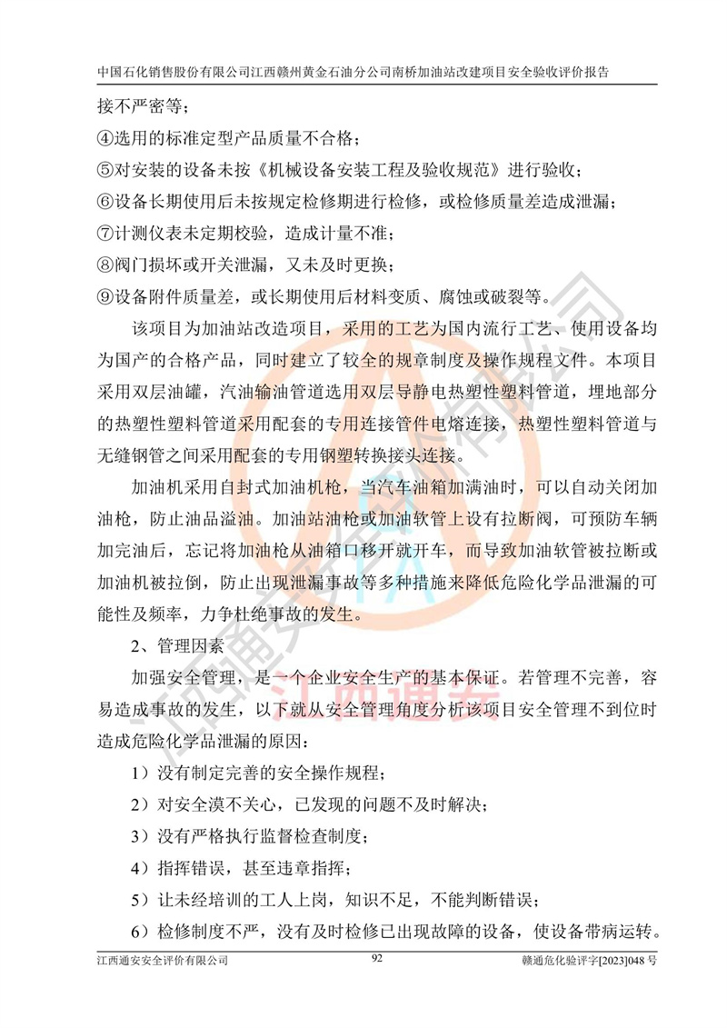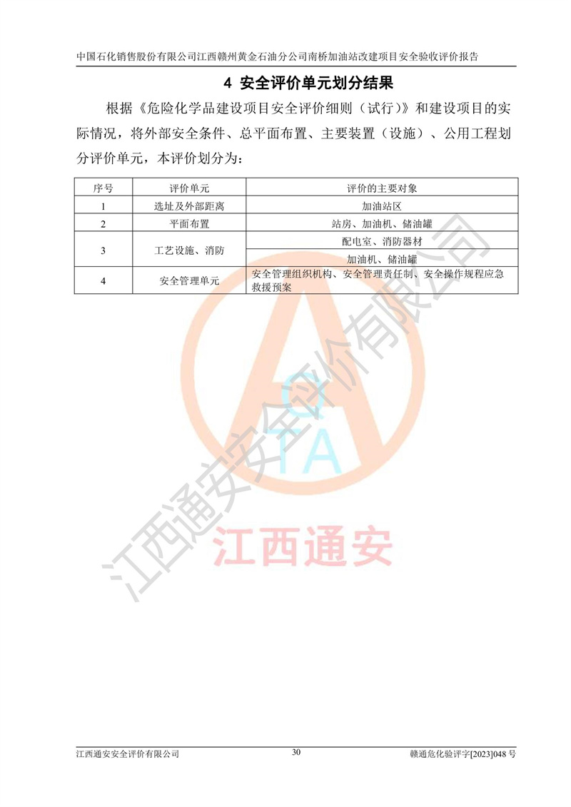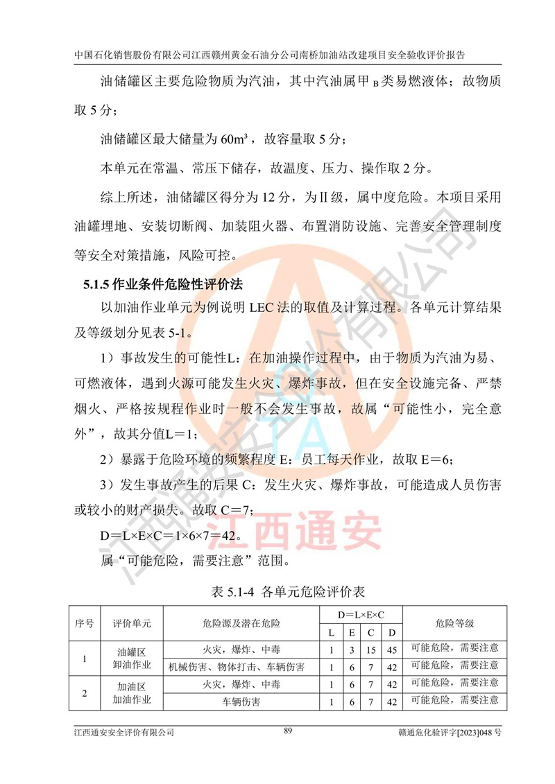 主要任務(wù) | 受中國石化銷售股份有限公司江西贛州黃金石油分公司南橋加油站改建項目的委托,江西通安安全評價有限公司承擔(dān)其項目安全驗收評價工作,于2023年7月組成評價小組,對所提供的資料、文件進(jìn)行了審核,對現(xiàn)場進(jìn)行了實地檢測,根據(jù)《汽車加油加氣加氫站技術(shù)標(biāo)準(zhǔn)》(GB50156-2021)、《安全評價通則》AQ8001-2007和《危險化學(xué)品建設(shè)項目安全評價細(xì)則(試行)》(安監(jiān)總?;痆2007]255號)要求,編寫此評價報告。 | ||||