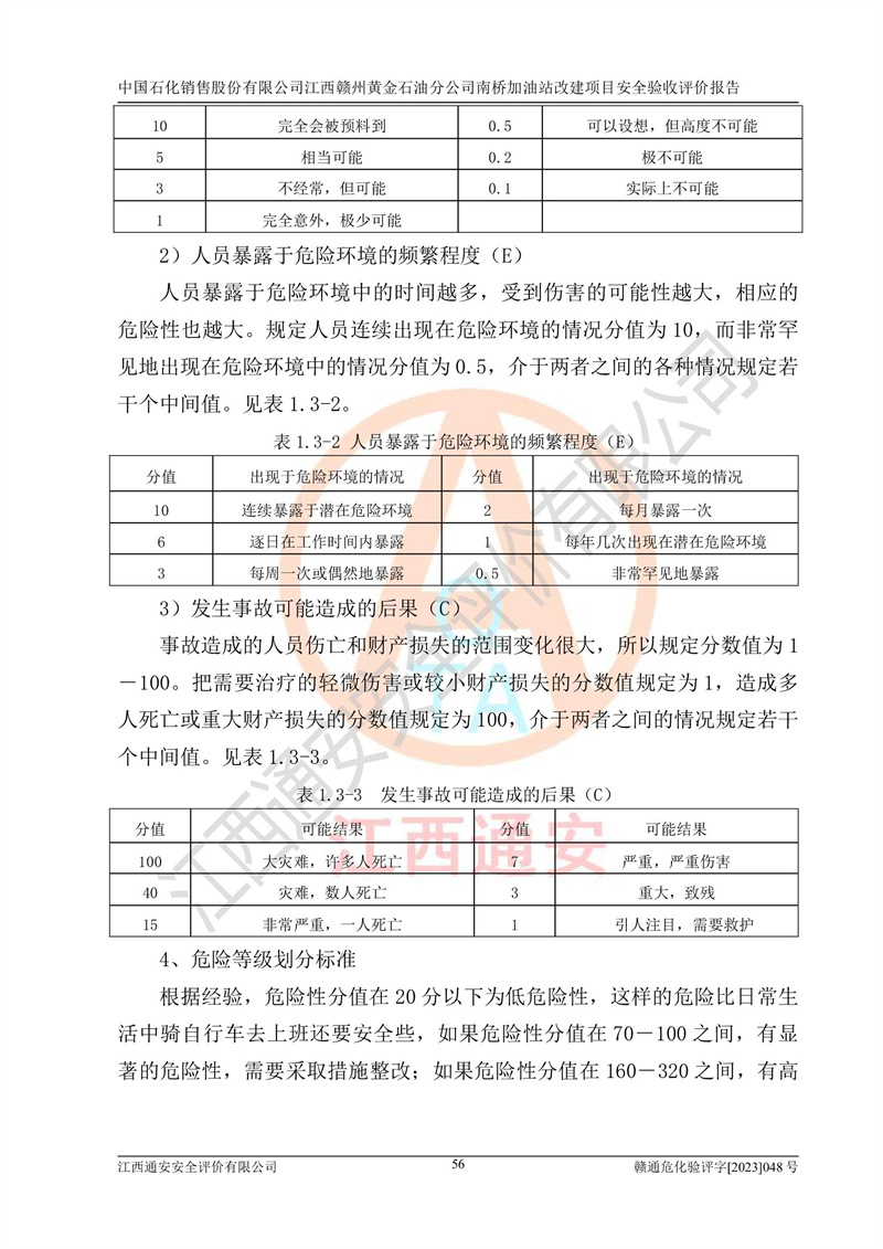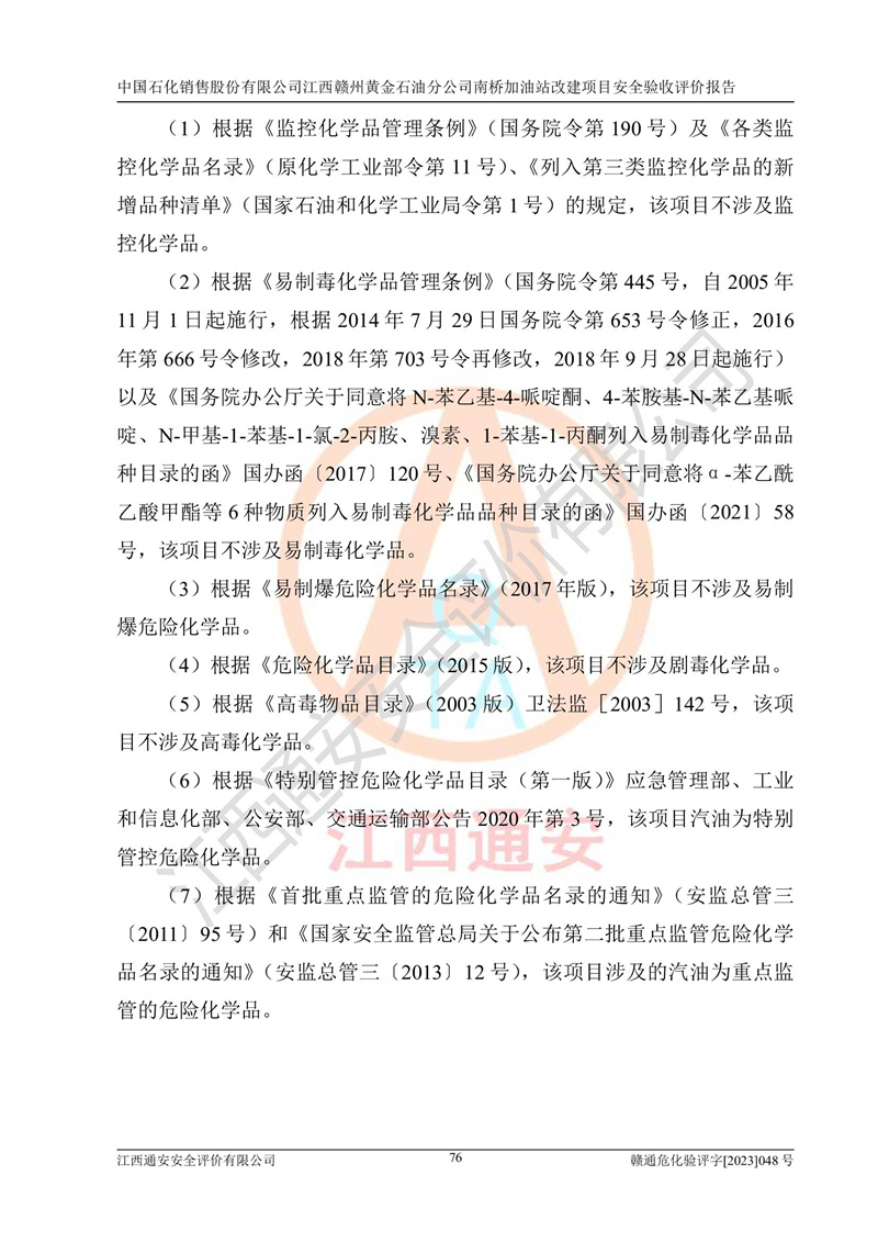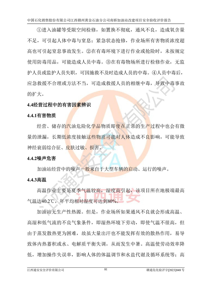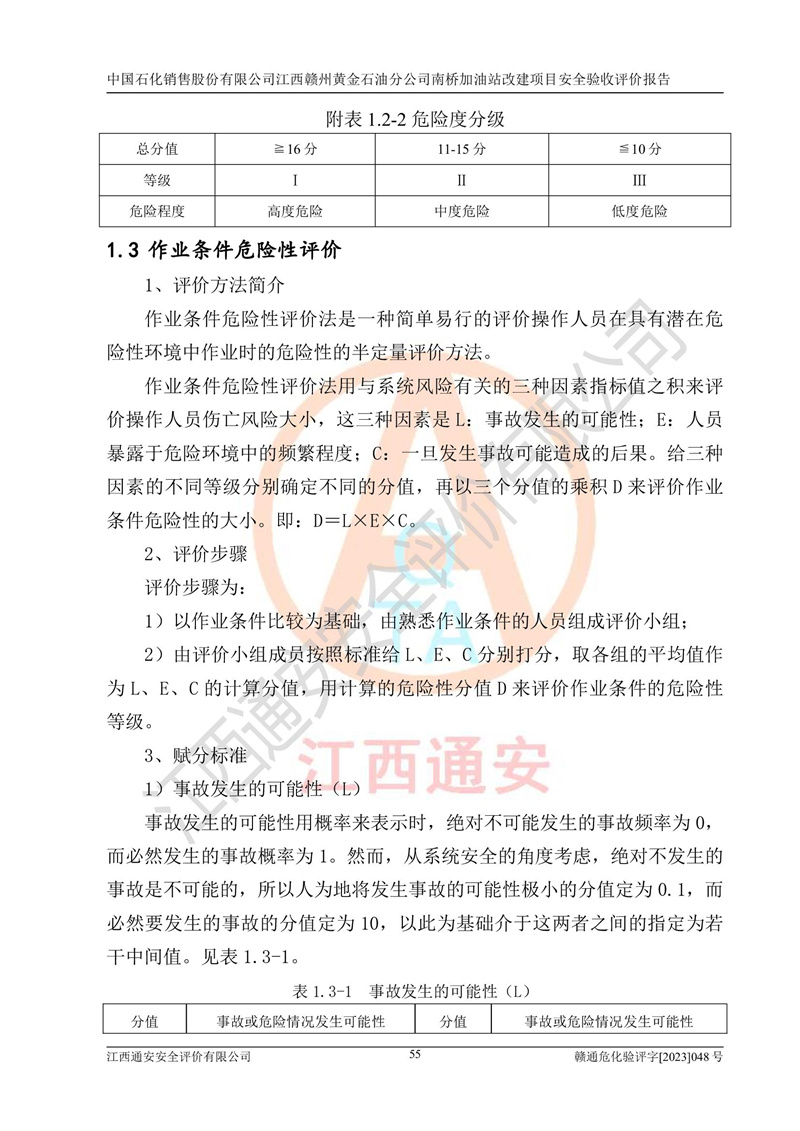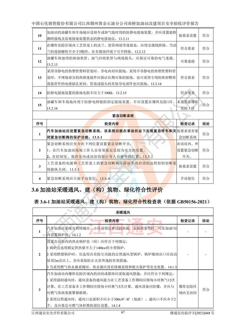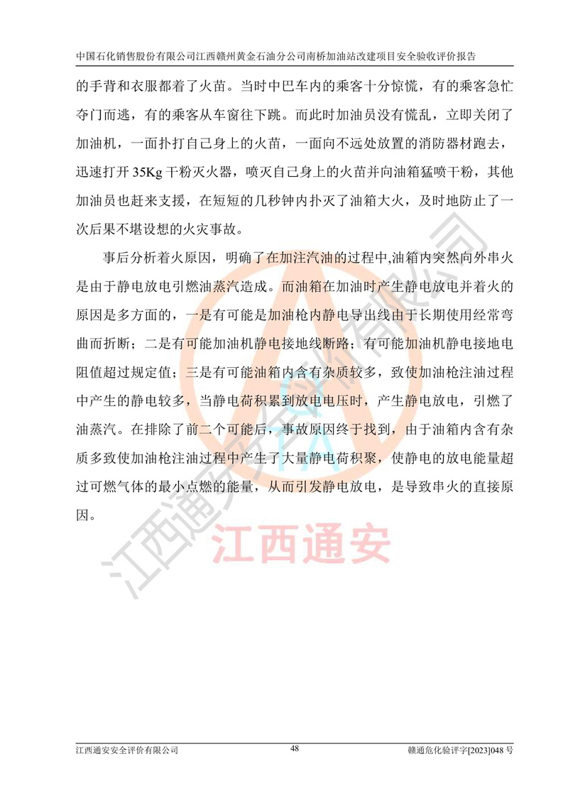 主要任務(wù) | 受中國石化銷售股份有限公司江西贛州黃金石油分公司南橋加油站改建項目的委托,江西通安安全評價有限公司承擔(dān)其項目安全驗收評價工作,于2023年7月組成評價小組,對所提供的資料、文件進(jìn)行了審核,對現(xiàn)場進(jìn)行了實地檢測,根據(jù)《汽車加油加氣加氫站技術(shù)標(biāo)準(zhǔn)》(GB50156-2021)、《安全評價通則》AQ8001-2007和《危險化學(xué)品建設(shè)項目安全評價細(xì)則(試行)》(安監(jiān)總?;痆2007]255號)要求,編寫此評價報告。 | ||||
