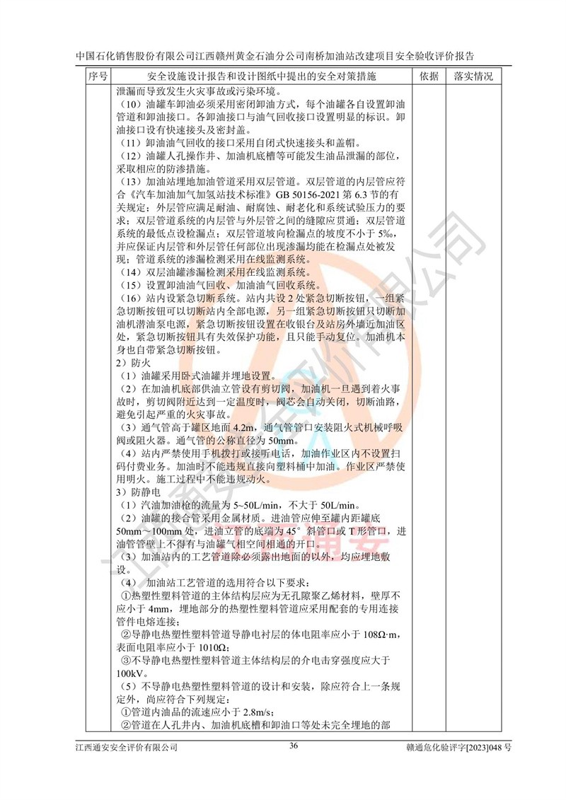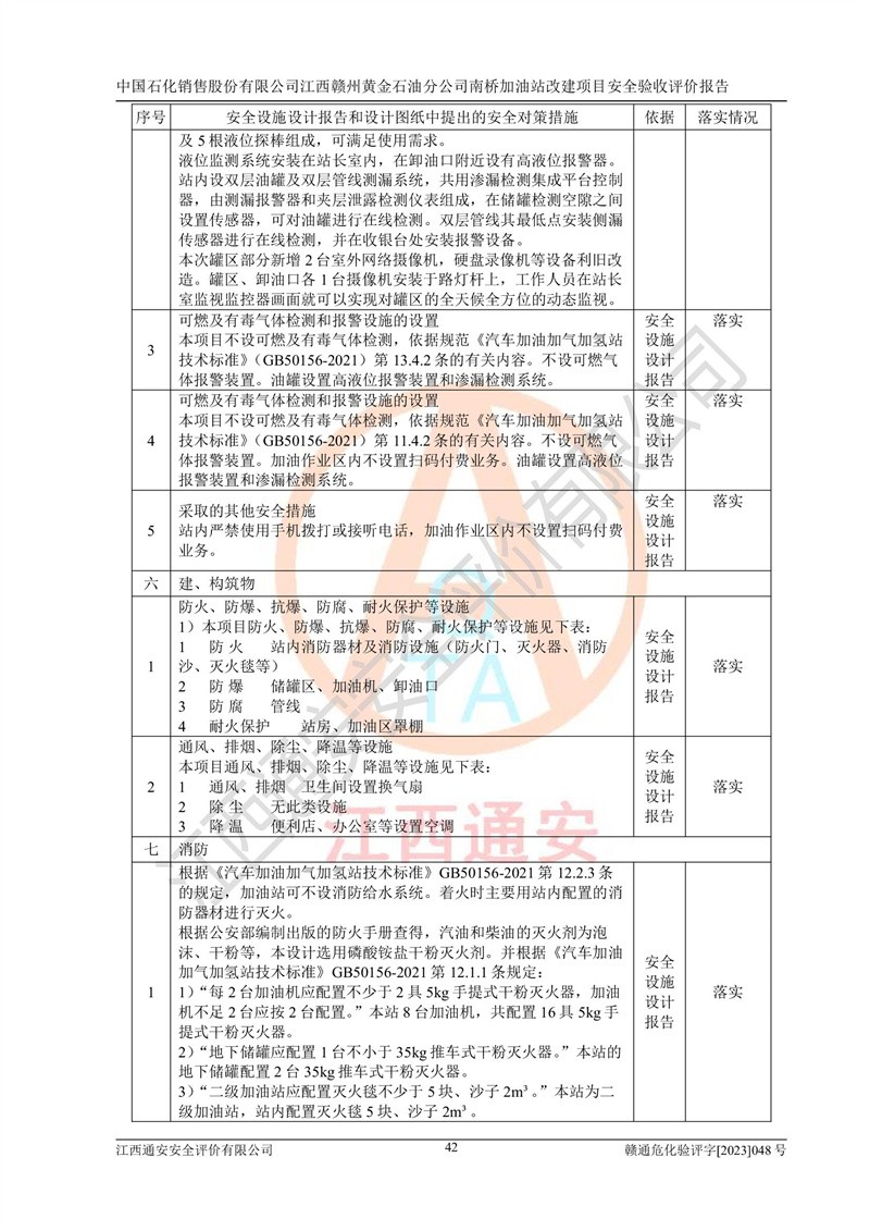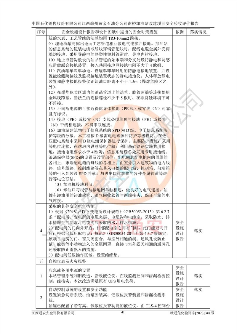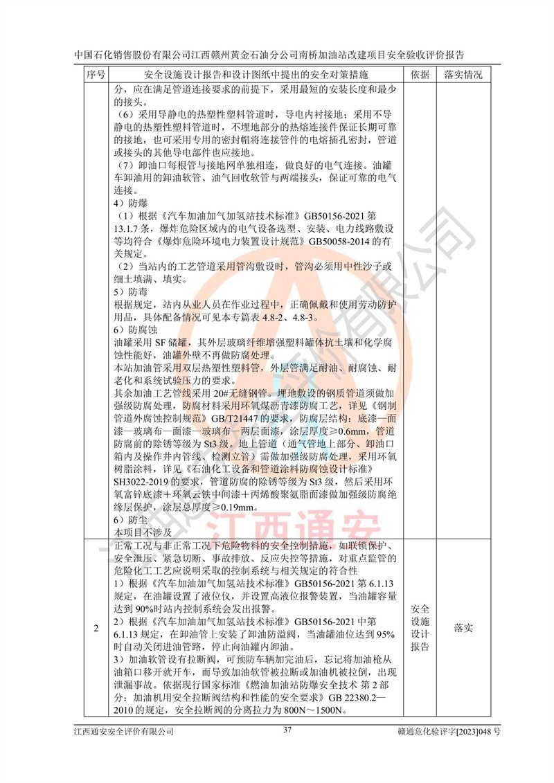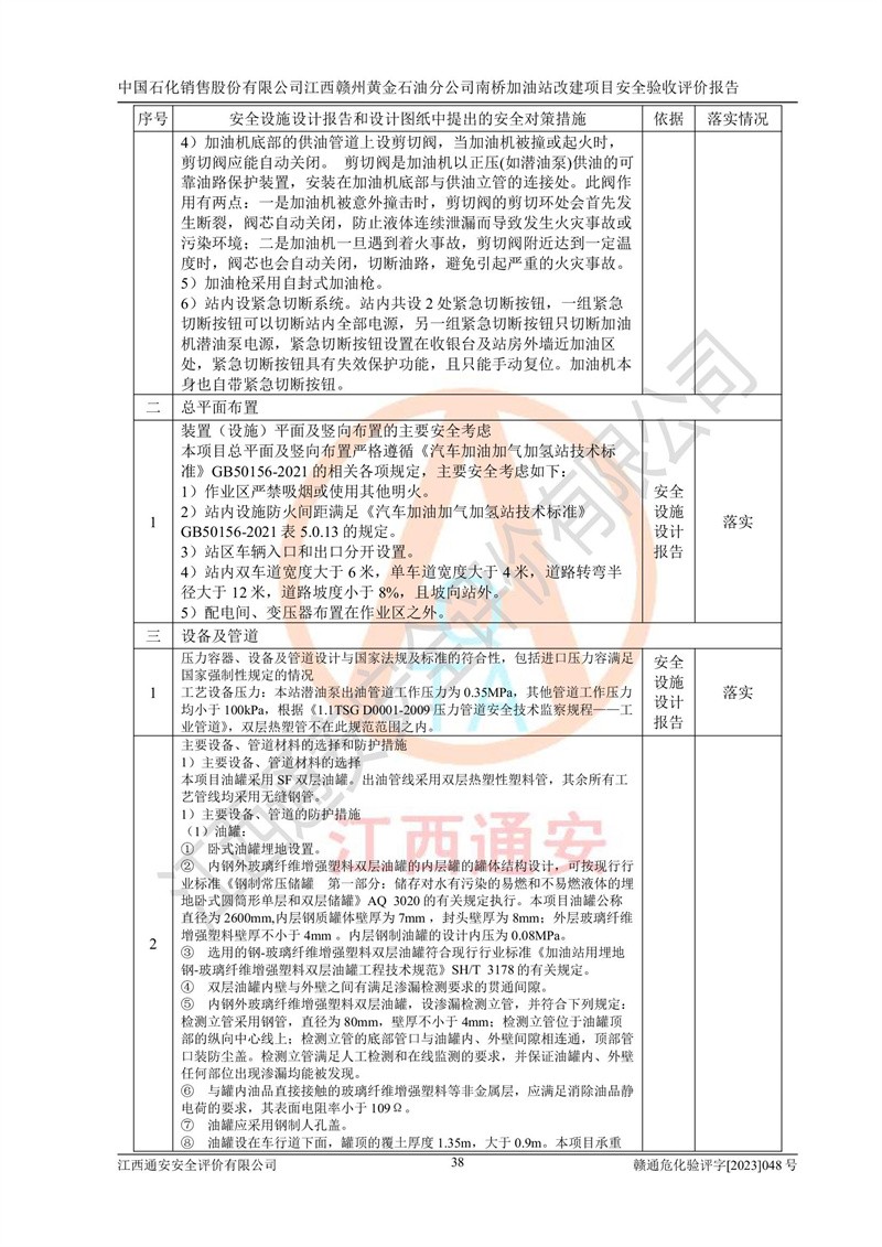 其它 | 中國石化銷售股份有限公司江西贛州黃金石油分公司南橋加油站改建項目嚴(yán)格執(zhí)行**有關(guān)安全生產(chǎn)法律、法規(guī)和有關(guān)標(biāo)準(zhǔn)、規(guī)范,認(rèn)真落實并合理采納安全條件評價報告及安全設(shè)施設(shè)計專篇設(shè)計中的安全對策、措施及建議,做到安全設(shè)施與主體工程同時設(shè)計、同時施工、同時投入生產(chǎn)和使用的“三同時”,對潛在的危險、有害因素采取了安全對策措施,工程潛在的危險、有害因素可得到**控制,風(fēng)險在**控制和可接受范圍內(nèi)?,F(xiàn)場與設(shè)計一致。 該項目安全設(shè)施設(shè)計專篇設(shè)計的安全設(shè)施得到落實符合**安全生產(chǎn)方面的法律、法規(guī)、標(biāo)準(zhǔn)、規(guī)范的要求,具備安全驗收條件,符合安全生產(chǎn)條件。 | ||||