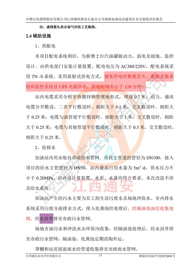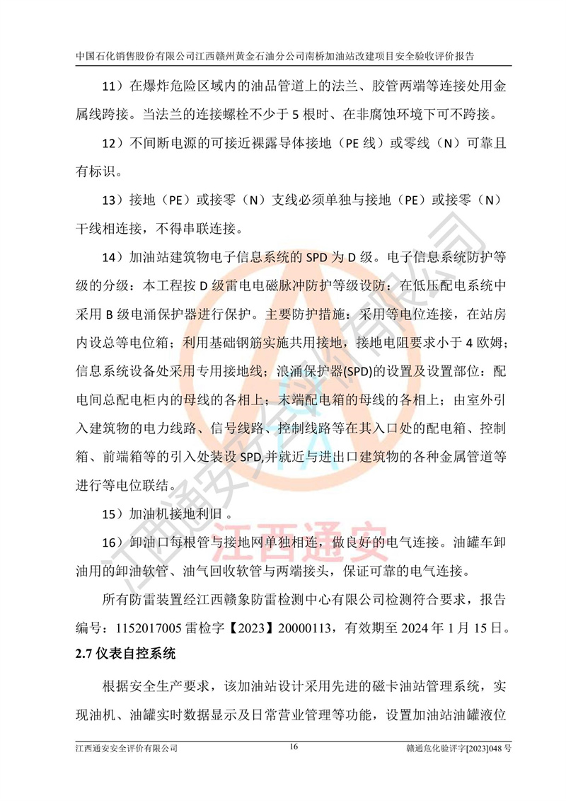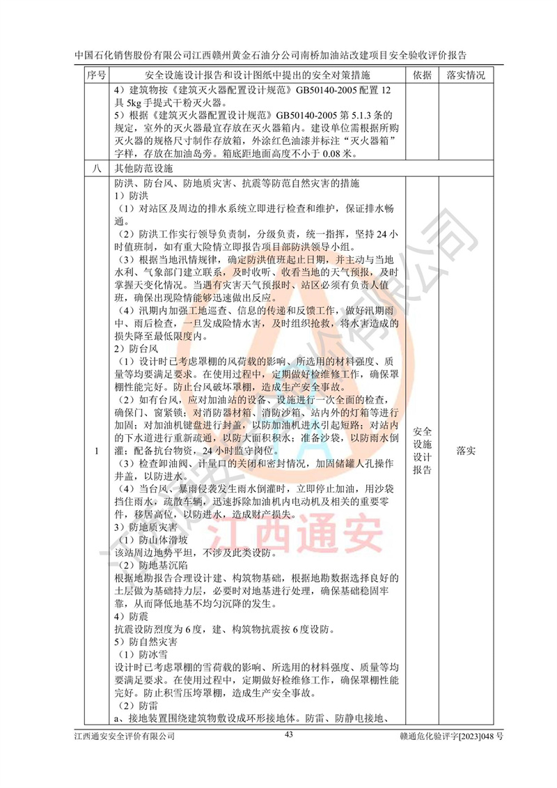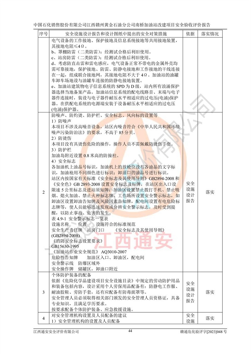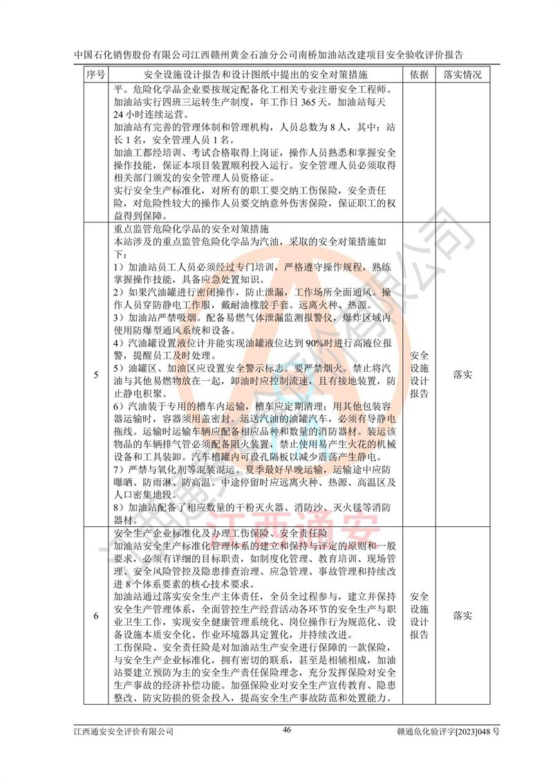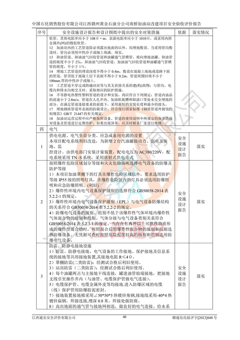 其它 | 中國石化銷售股份有限公司江西贛州黃金石油分公司南橋加油站改建項目嚴(yán)格執(zhí)行**有關(guān)安全生產(chǎn)法律、法規(guī)和有關(guān)標(biāo)準(zhǔn)、規(guī)范,認(rèn)真落實并合理采納安全條件評價報告及安全設(shè)施設(shè)計專篇設(shè)計中的安全對策、措施及建議,做到安全設(shè)施與主體工程同時設(shè)計、同時施工、同時投入生產(chǎn)和使用的“三同時”,對潛在的危險、有害因素采取了安全對策措施,工程潛在的危險、有害因素可得到**控制,風(fēng)險在**控制和可接受范圍內(nèi)?,F(xiàn)場與設(shè)計一致。 該項目安全設(shè)施設(shè)計專篇設(shè)計的安全設(shè)施得到落實符合**安全生產(chǎn)方面的法律、法規(guī)、標(biāo)準(zhǔn)、規(guī)范的要求,具備安全驗收條件,符合安全生產(chǎn)條件。 | ||||