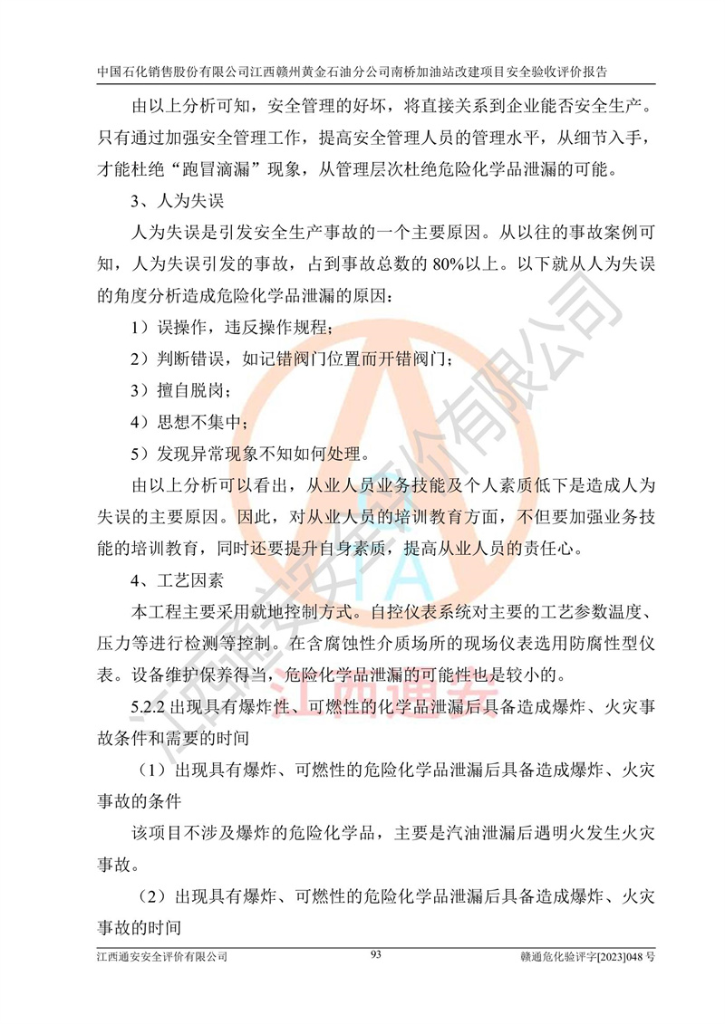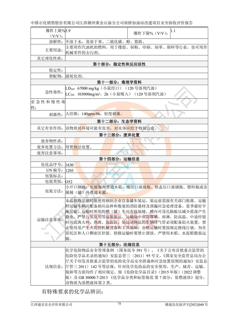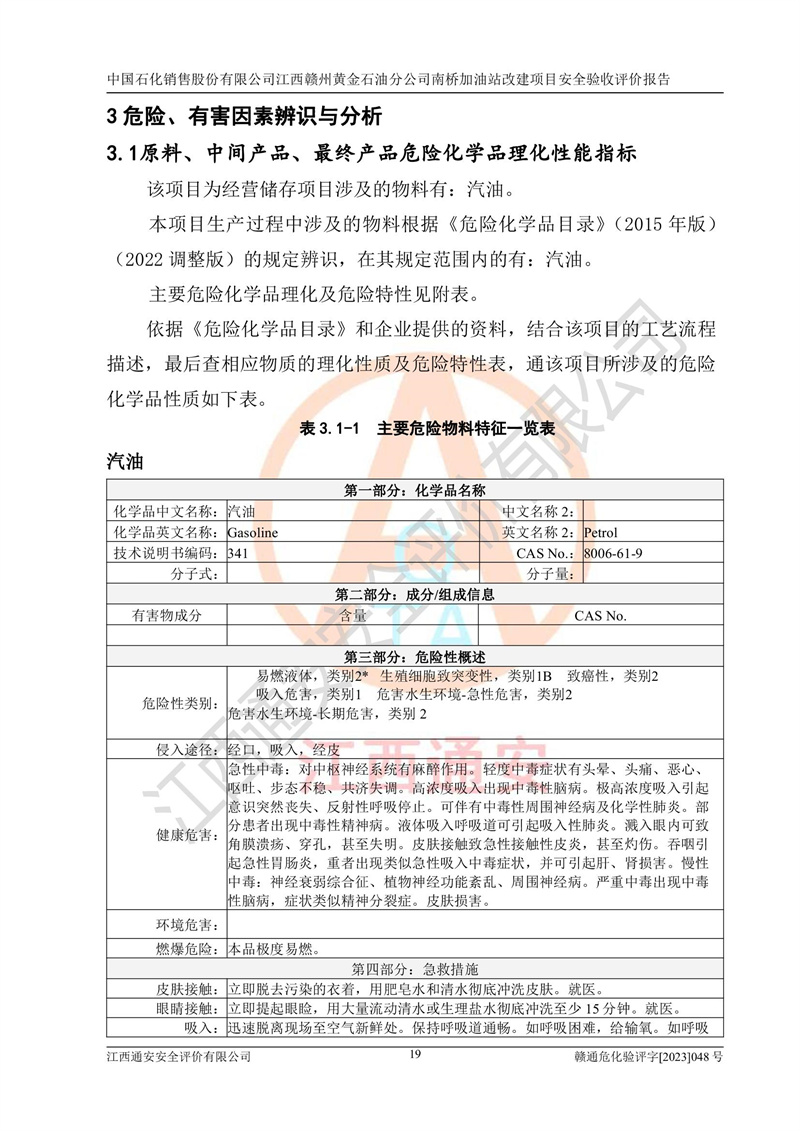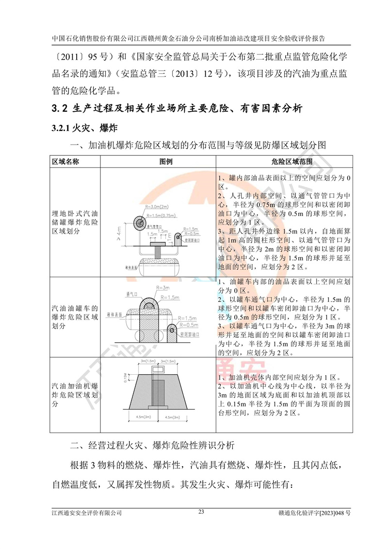 項目簡介 | 本報告為中國石化銷售股份有限公司江西贛州黃金石油分公司南橋加油站改建項目的安全驗收評價報告。中國石化銷售股份有限公司江西贛州黃金石油分公司南橋加油站(曾用名:中國石化銷售股份有限公司江西贛州黃金石油分公司南橋加油加氣站)位于江西省贛州市贛州經(jīng)濟(jì)技術(shù)開發(fā)區(qū)東江源大道東側(cè)、水南路南側(cè)、南康路北側(cè)E19-1地塊。中國石化銷售股份有限公司江西贛州黃金石油分公司法定**人為丁立柳,成立日期為2020年1月13日,統(tǒng)一社會信用代碼91360700MA3945H12C。經(jīng)營范圍包括成品油(汽油、柴油)零售。該站已取得贛州市行政審批局頒發(fā)的成品油零售經(jīng)營批準(zhǔn)證書(油零售證書第虔0021號)及危險化學(xué)品經(jīng)營許可證(登記編號:贛經(jīng)開行審危經(jīng)(甲)字【2023】00001號),于2022年5月26日取得贛州市經(jīng)濟(jì)技術(shù)開發(fā)區(qū)行政審批局出具的《江西省企業(yè)投資項目備案通知書》(項目統(tǒng)一代碼為:2205-360799-04-01-388254),由哈爾濱天源石化工程設(shè)計有限責(zé)任公司設(shè)計。2022年7月11日已取得贛州市行政審批局出具的安全條件審查批復(fù),2022年12月14日已取得贛州市行政審批局出具的安全設(shè)施設(shè)計審查批復(fù)。由江西省宏海鋼結(jié)構(gòu)有限公司進(jìn)行施工。 本次改造內(nèi)容為:增加2個30m3汽油罐以及配套工藝、土建、電氣管線等;新建潛油泵、液位儀、卸油口一處。新建配套消防設(shè)施;新建卸油油氣回收系統(tǒng),分散式加油油氣回收系統(tǒng);拆除加油島4座,新建加油島4座、油品導(dǎo)示牌4個。改造后設(shè)置有30m392#、95#各2臺和1臺30m398#,總?cè)萘繛?50m3,屬二級加油站。 汽油為危險化學(xué)品,其蒸汽與空氣形成爆炸性氣體,遇明火、高熱易燃燒爆炸,火險分級為甲B類,是重點監(jiān)管和特別管控危險化學(xué)品。因此,本項目存在的主要危險有害因素是火災(zāi)、爆炸。 | ||||