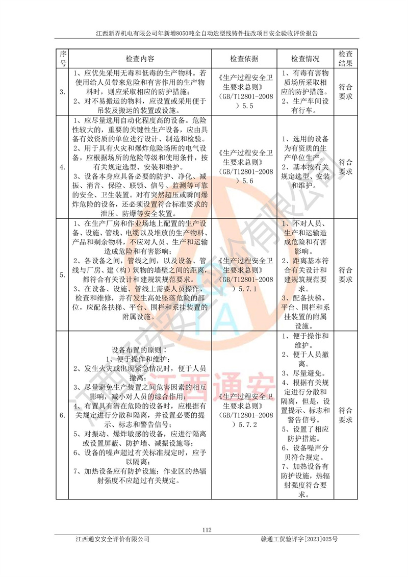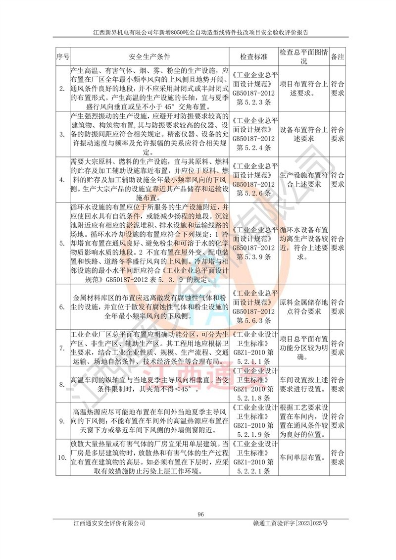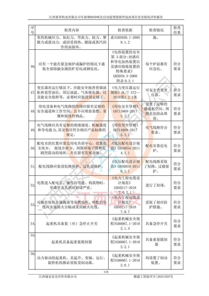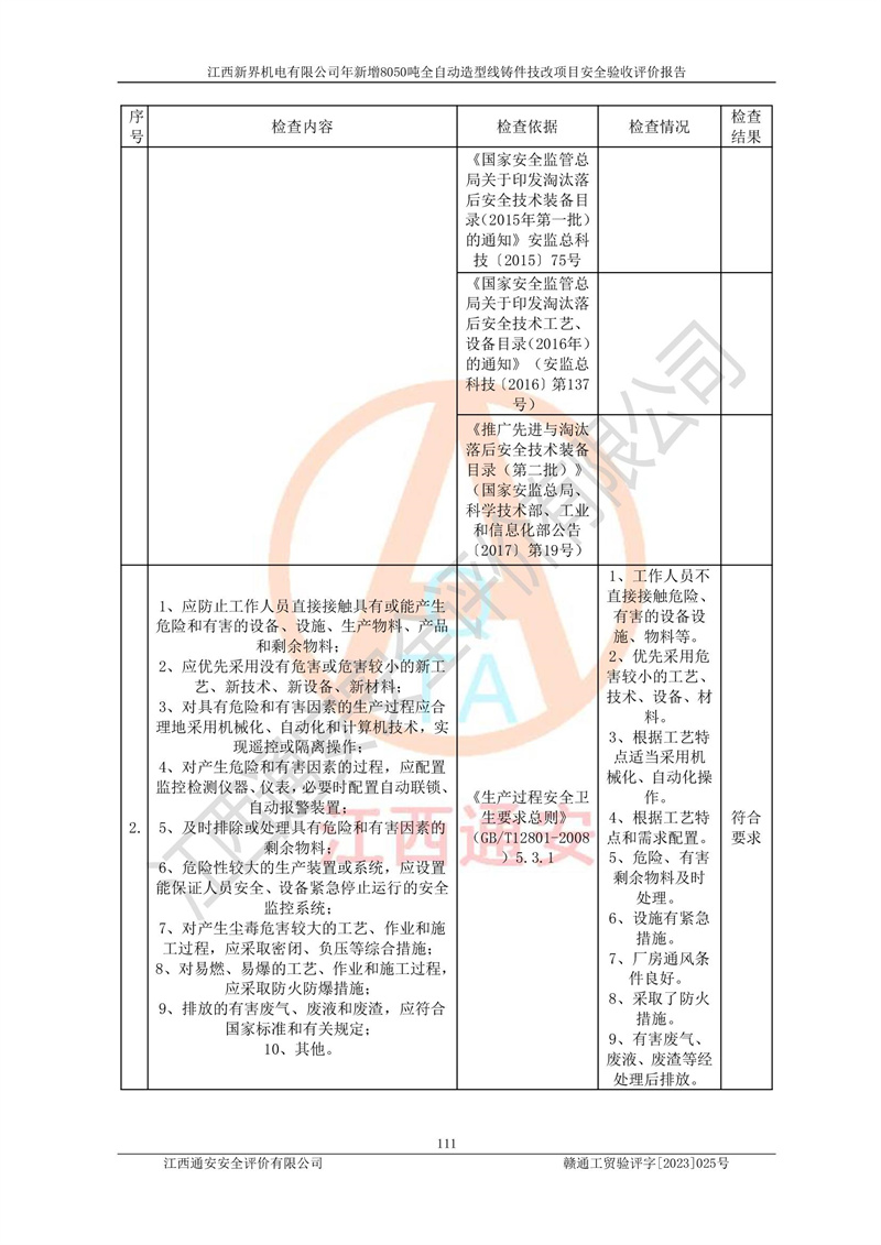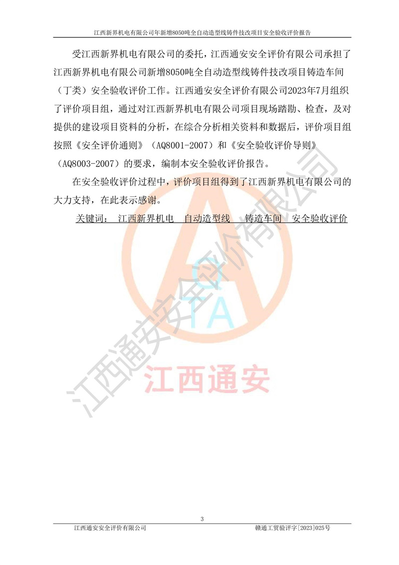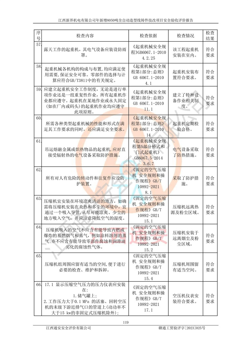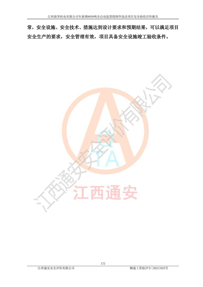 評(píng)價(jià)報(bào)告名稱 | 江西新界機(jī)電有限公司新增8050噸全自動(dòng)造型線鑄件技改項(xiàng)目安全驗(yàn)收 | |||