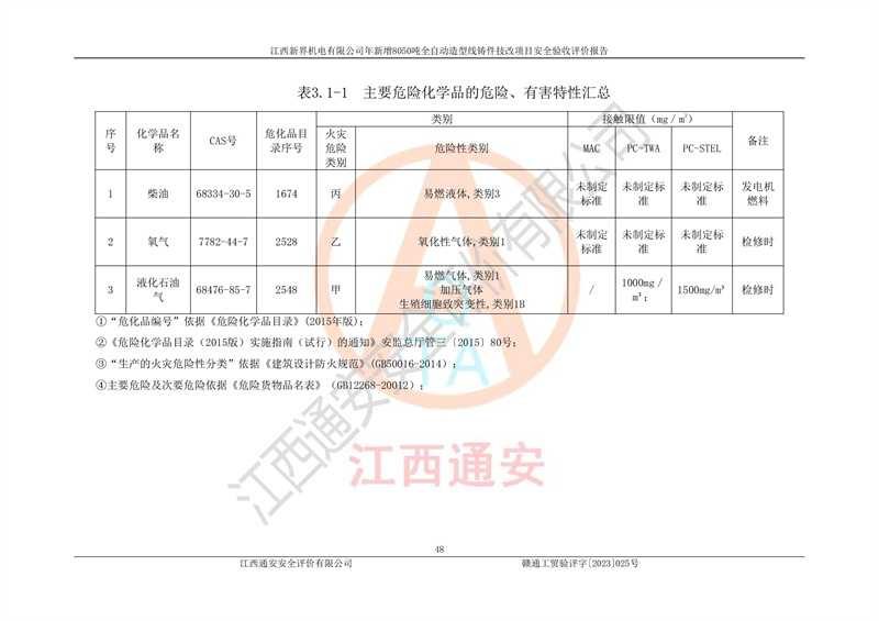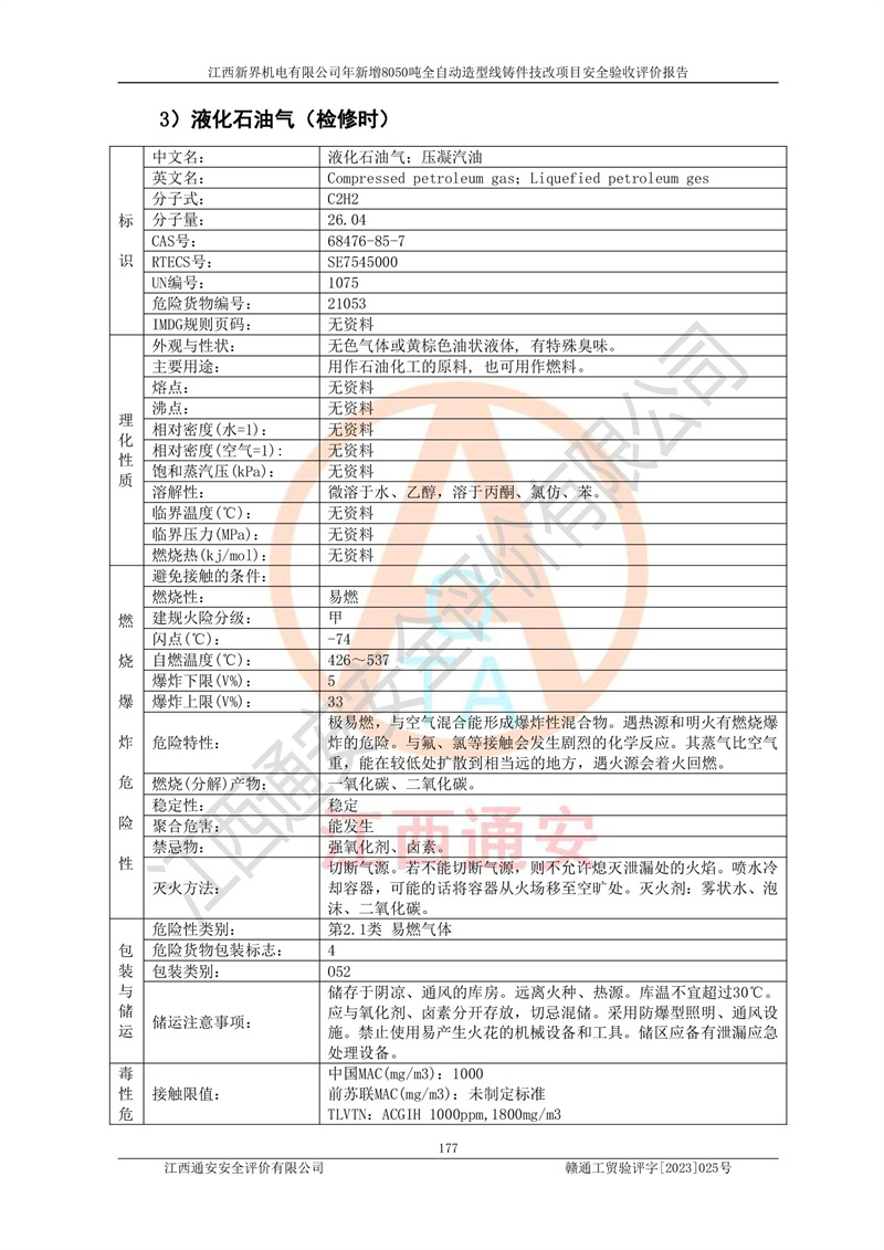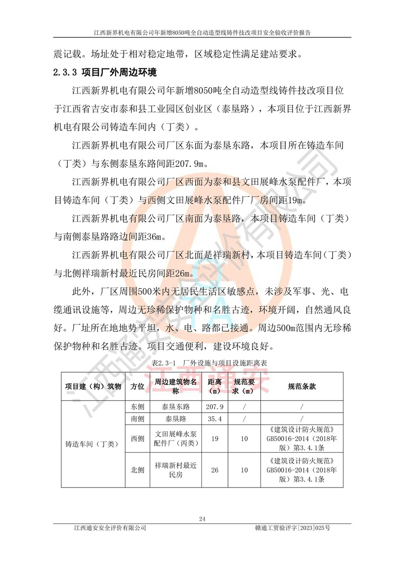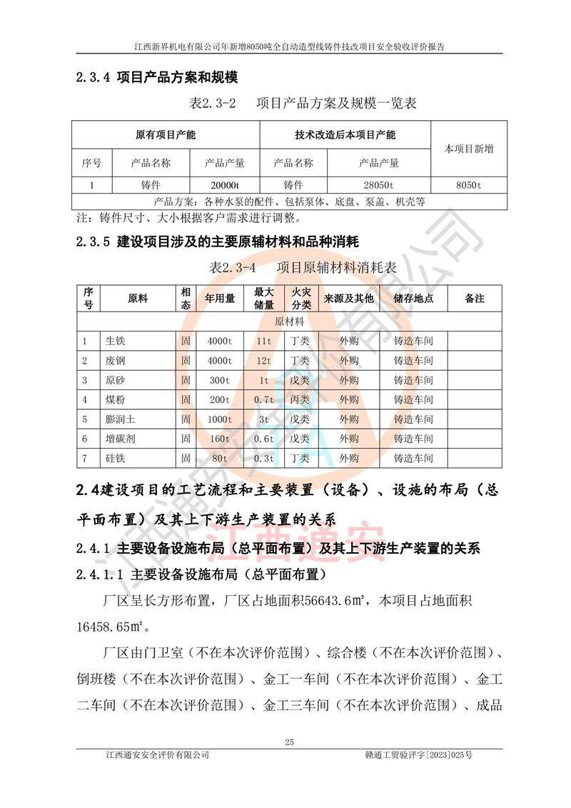 項(xiàng)目簡介 | 江西新界機(jī)電有限公司成立于2007年8月17日,注冊(cè)地址為江西省吉安市泰和縣工業(yè)園區(qū)創(chuàng)業(yè)園(泰墾路),并取得泰和縣市場監(jiān)督管理局核準(zhǔn)頒發(fā)的營業(yè)執(zhí)照,營業(yè)執(zhí)照統(tǒng)一社會(huì)信用代碼:913608266647788195。公司注冊(cè)資本肆仟捌佰萬元整,公司類型:有限責(zé)任公司(自然人投資或控股的法人獨(dú)資),法定**人:黃仁庭。營業(yè)執(zhí)照核準(zhǔn)經(jīng)營范圍:泵、電機(jī)、空壓機(jī)等機(jī)電產(chǎn)品及零部件制造、銷售;零部件鑄造加工、銷售;貨物進(jìn)出口、技術(shù)進(jìn)出口(不含國營貿(mào)易管理貨物及**經(jīng)營管理貨物)。(依法須經(jīng)批準(zhǔn)的項(xiàng)目,經(jīng)相關(guān)部門批準(zhǔn)后方可開展經(jīng)營活動(dòng))*。 2013年7月16日江西新界機(jī)電有限公司取得鑄造車間房產(chǎn)證,房產(chǎn)證號(hào):泰房字第2013-133號(hào)。建筑面積16458.65㎡?,F(xiàn)在該廠區(qū)鑄造車間內(nèi)投資2250萬元改建一條全自動(dòng)造型線。 江西新界機(jī)電有限公司于2022年1月6日取得泰和縣工業(yè)和信息化局出具的《江西省工業(yè)企業(yè)技術(shù)改造項(xiàng)目備案通知書》,統(tǒng)一項(xiàng)目代碼:2201-360826-07-02-686021。 該項(xiàng)目不屬于限制類及淘汰類產(chǎn)業(yè),因此,本項(xiàng)目屬于**鼓勵(lì)類產(chǎn)業(yè),符合**產(chǎn)業(yè)政策。 本項(xiàng)目涉及到危險(xiǎn)化學(xué)品有柴油(發(fā)電機(jī)燃料),以及在檢修時(shí)涉及的危險(xiǎn)化學(xué)品有氧氣(檢修時(shí))、液化石油氣(檢修時(shí))。 項(xiàng)目使用的液化石油氣(檢修時(shí))屬于重點(diǎn)監(jiān)管的危險(xiǎn)化學(xué)品。 項(xiàng)目不涉及重點(diǎn)監(jiān)管的危險(xiǎn)化工工藝。 江西新界機(jī)電有限公司年新增8050噸全自動(dòng)造型線鑄件技改項(xiàng)目涉及的危險(xiǎn)化學(xué)品不構(gòu)成危險(xiǎn)化學(xué)品重大危險(xiǎn)源。 江西新界機(jī)電有限公司于2022年6月自主編制了《江西新界機(jī)電有限公司年新增8050噸全自動(dòng)造型線鑄件技改項(xiàng)目安全生產(chǎn)條件和設(shè)施綜合分析報(bào)告》,經(jīng)公司內(nèi)部評(píng)審后,提交終稿報(bào)泰和縣應(yīng)急管理局備查。 江西新界機(jī)電有限公司委托黑龍江龍維化學(xué)工程設(shè)計(jì)有限公司編制了《江西新界機(jī)電有限公司年新增8050噸全自動(dòng)造型線鑄件技改項(xiàng)目安全設(shè)施設(shè)計(jì)》,并于2023年03月23日組織有關(guān)專家、單位對(duì)安全設(shè)施設(shè)計(jì)進(jìn)行了評(píng)審,設(shè)計(jì)單位按照評(píng)審專家組意見修改后,經(jīng)評(píng)審專家組組長確認(rèn)后出具備案稿,報(bào)泰和縣應(yīng)急管理局備查。 | |||
