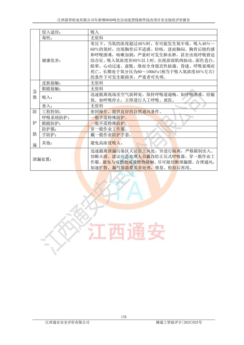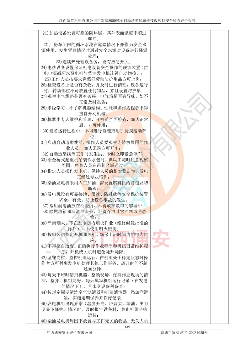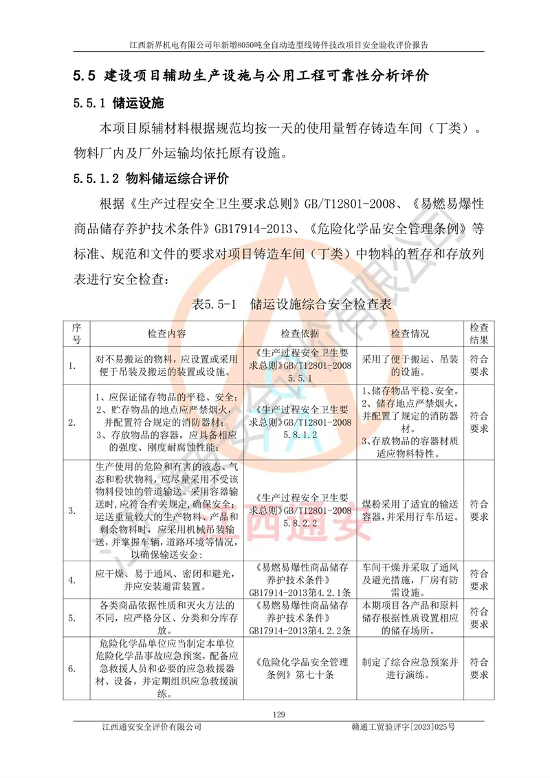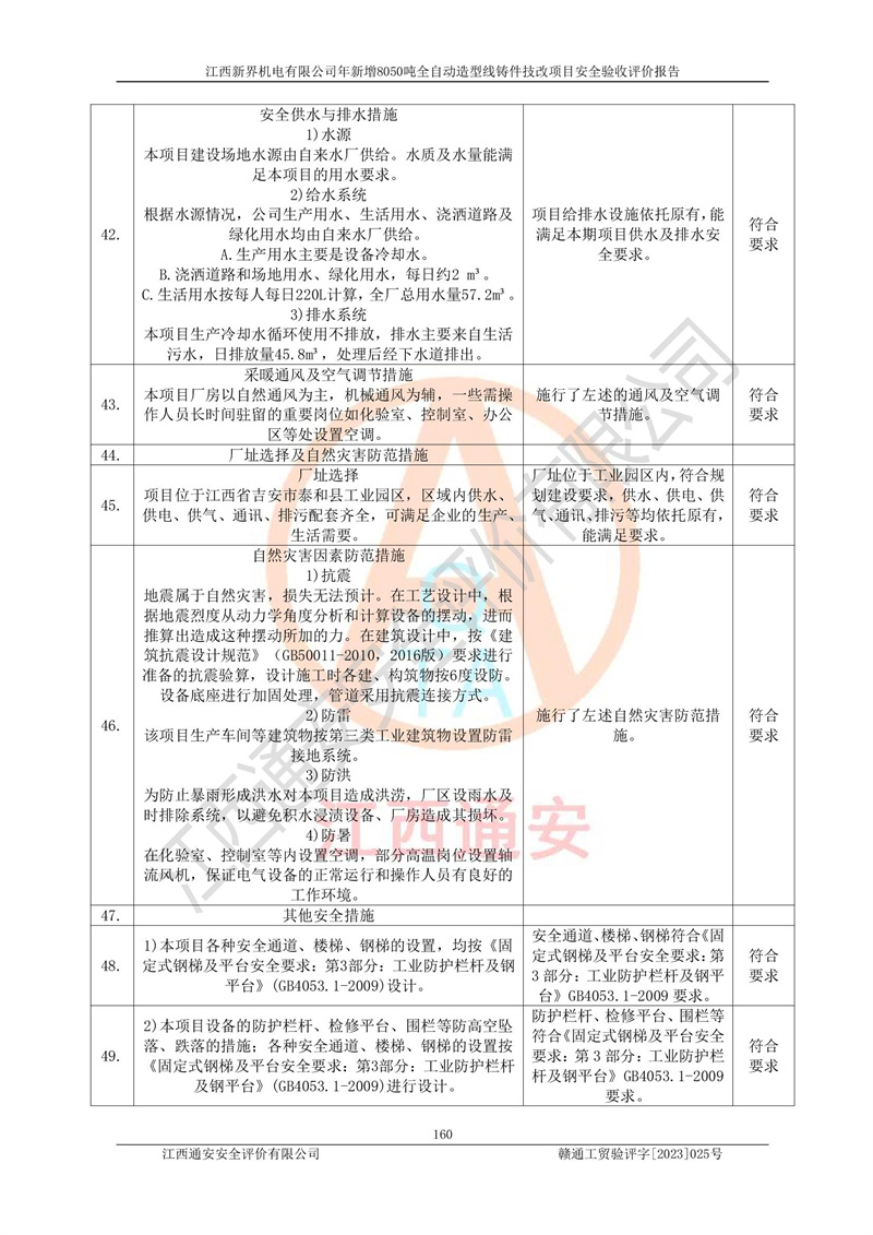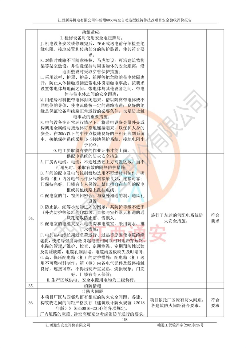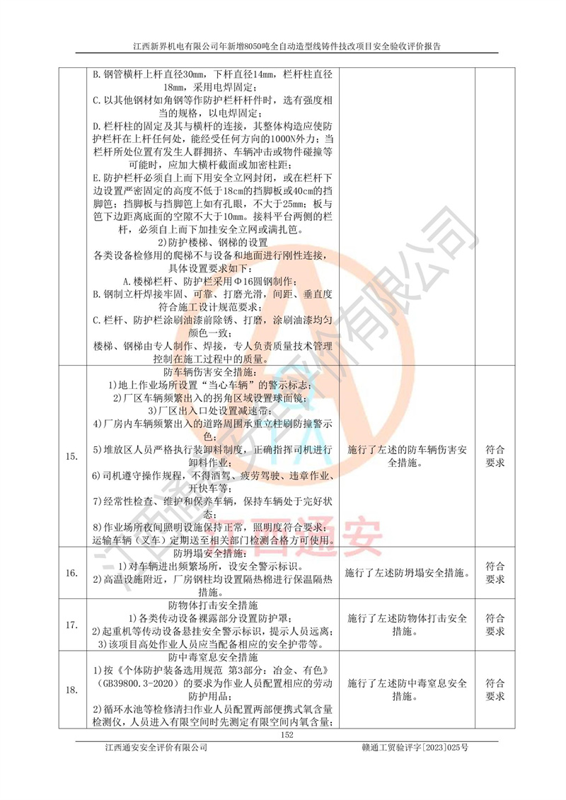 評(píng)價(jià)結(jié)論 | 1、江西新界機(jī)電有限公司年新增8050噸全自動(dòng)造型線鑄件技改項(xiàng)目的安全設(shè)施與主體工程同時(shí)設(shè)計(jì)、同時(shí)施工、同時(shí)投入生產(chǎn)和使用,安全設(shè)施運(yùn)行良好,項(xiàng)目現(xiàn)場與總圖及工藝平面布置圖一致。符合**有關(guān)建設(shè)項(xiàng)目“三同時(shí)”的規(guī)定和要求。 2、江西新界機(jī)電有限公司年新增8050噸全自動(dòng)造型線鑄件技改項(xiàng)目主體工程安全設(shè)施、安全措施基本符合法律法規(guī)的規(guī)定和要求,并運(yùn)行**;公用工程及輔助設(shè)施滿足主體工程生產(chǎn)安全的需要;企業(yè)安全管理體系滿足生產(chǎn)安全的要求。 3、江西新界機(jī)電有限公司已針對(duì)本報(bào)告提出的安全隱患整改意見組織人員進(jìn)行整,已落實(shí)到位,企業(yè)安全生產(chǎn)的風(fēng)險(xiǎn)控制在可以接受的范圍內(nèi)。 綜上所述,江西新界機(jī)電有限公司年新增8050噸全自動(dòng)造型線鑄件技改項(xiàng)目相關(guān)配套的設(shè)備和安全設(shè)施運(yùn)行正常,企業(yè)安全管理機(jī)制運(yùn)行正常,安全設(shè)施、安全技術(shù)、措施達(dá)到設(shè)計(jì)要求和預(yù)期結(jié)果,可以滿足項(xiàng)目安全生產(chǎn)的要求,安全管理**,項(xiàng)目具備安全設(shè)施竣工驗(yàn)收條件。 | |||