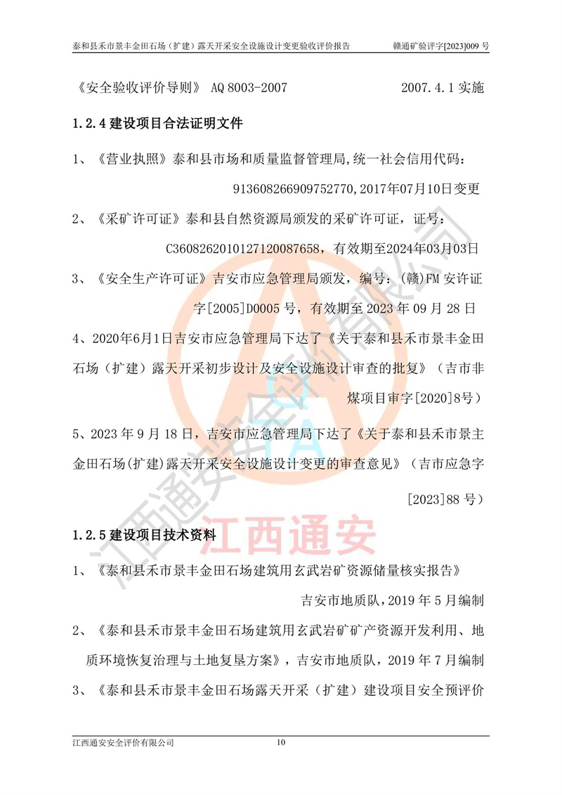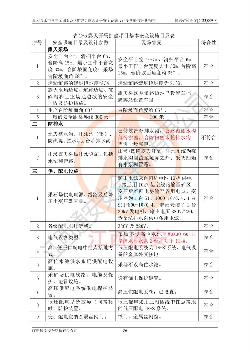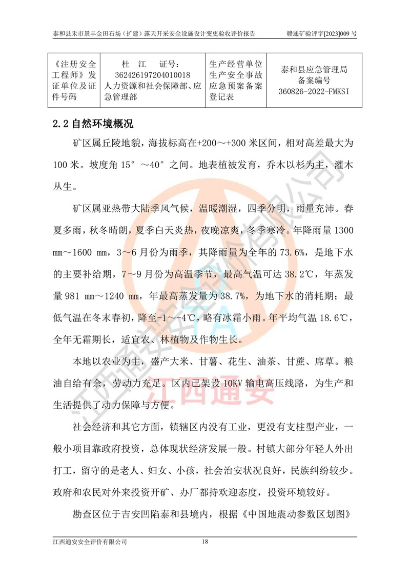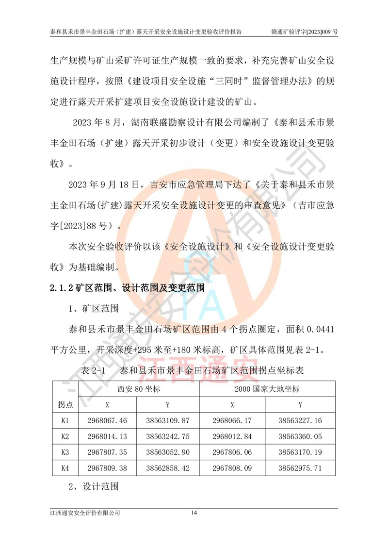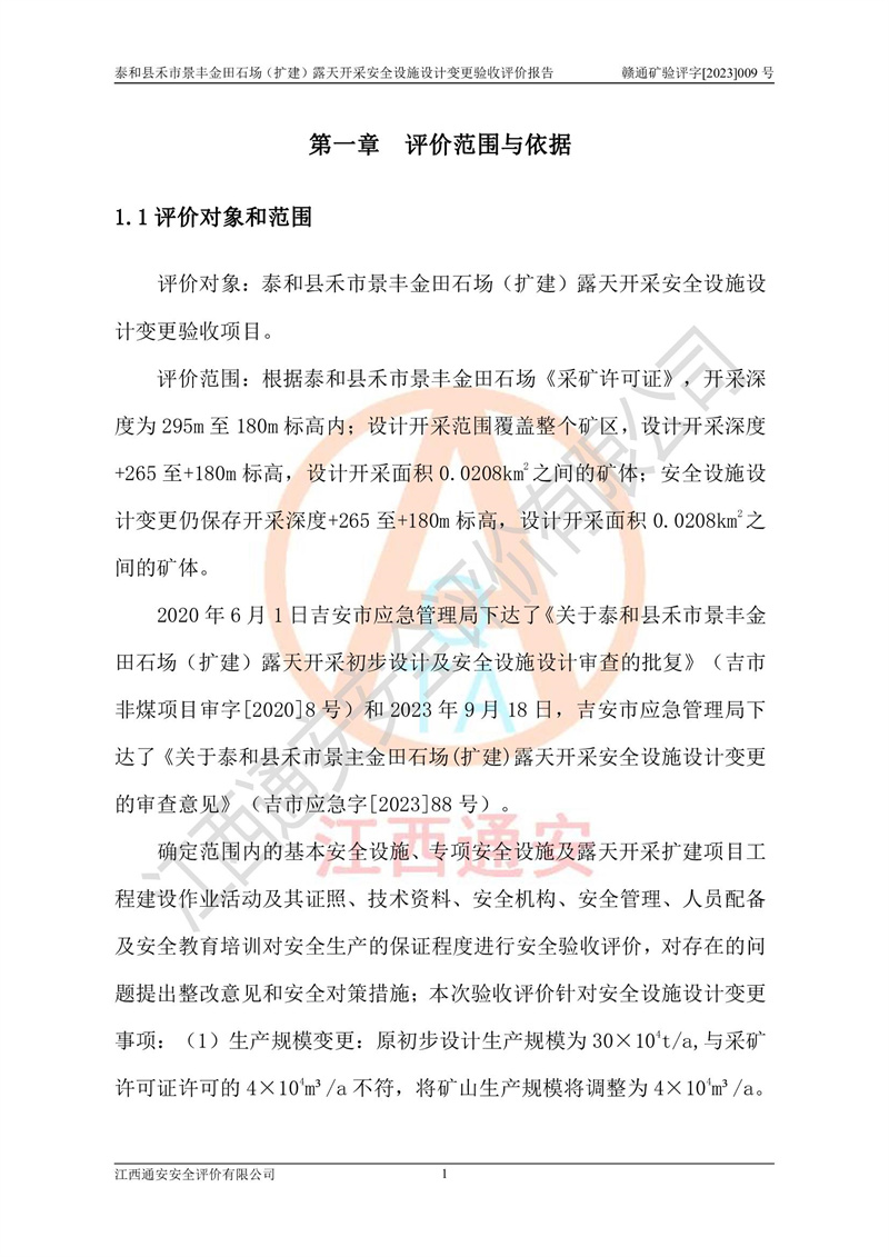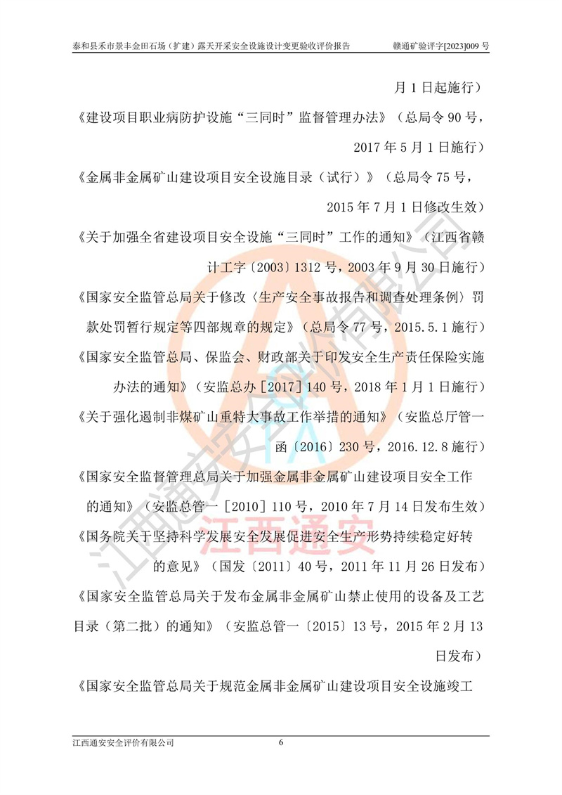 項目名稱 | 泰和縣禾市景豐金田石場(擴(kuò)建)露天開采安全設(shè)施設(shè)計變更驗收評價報告 | ||||