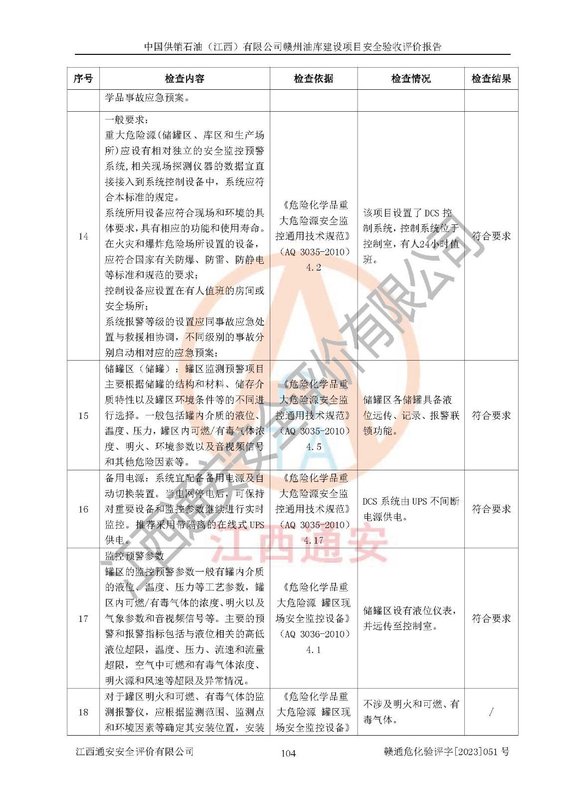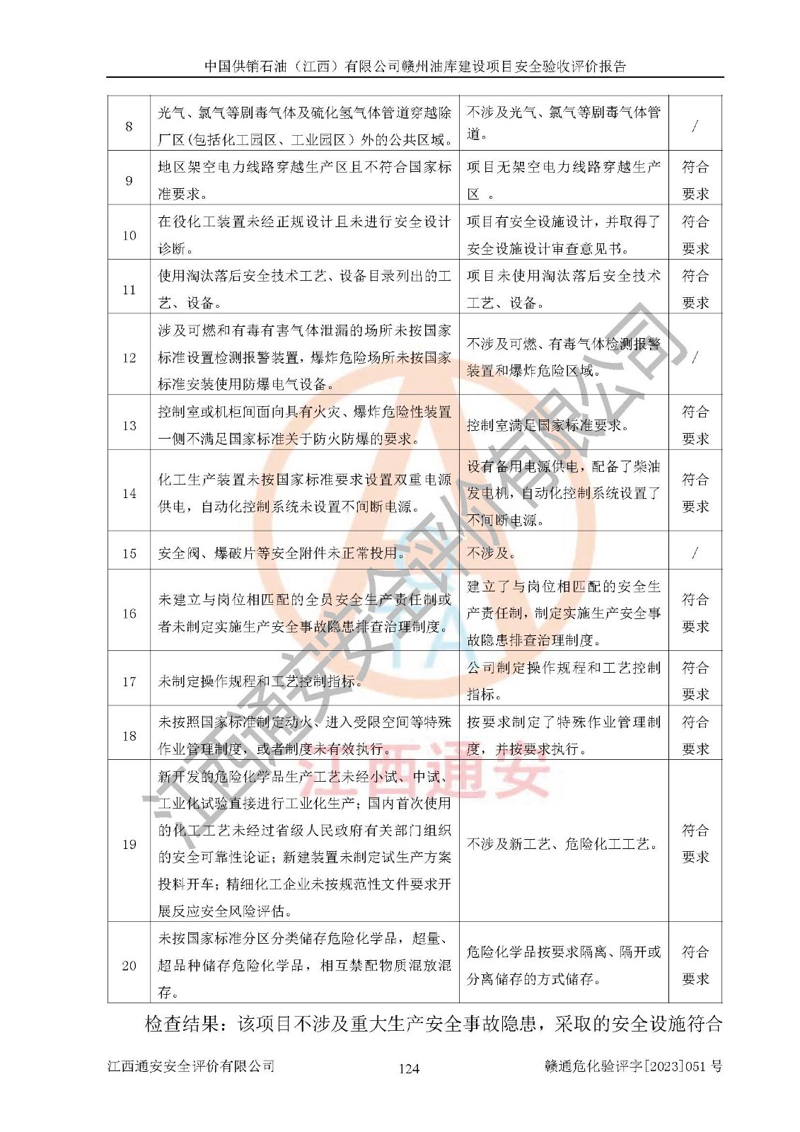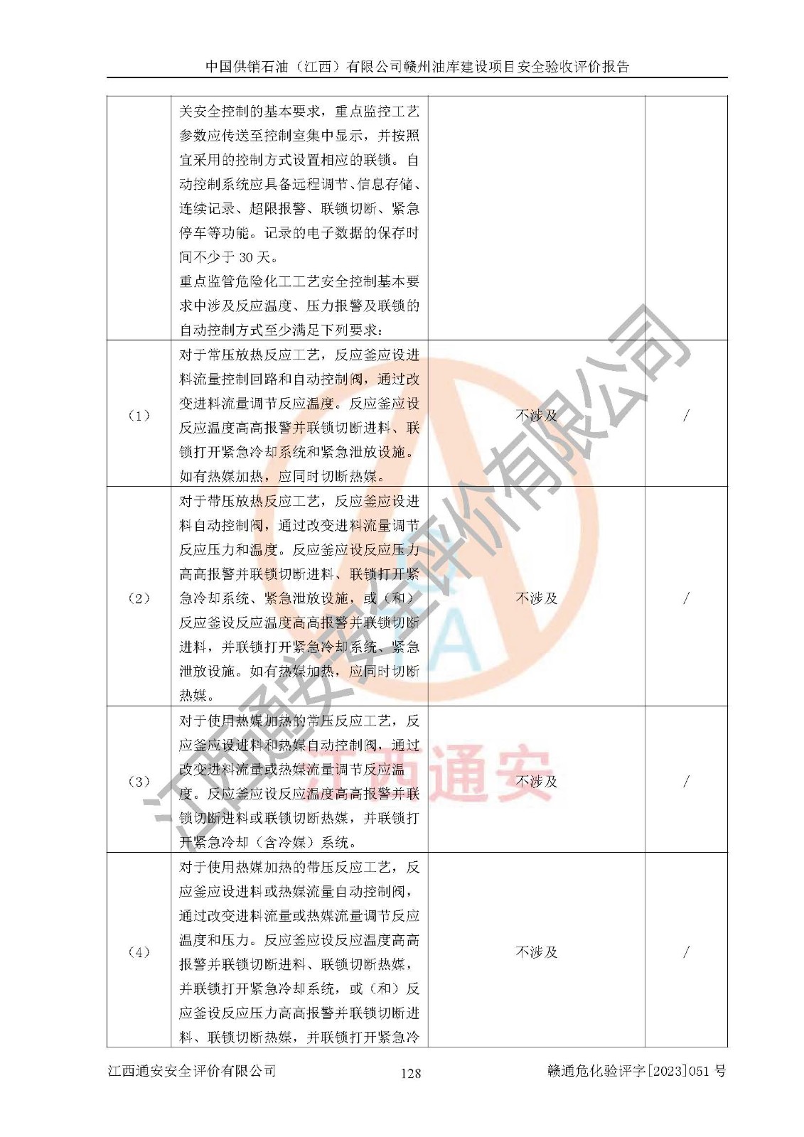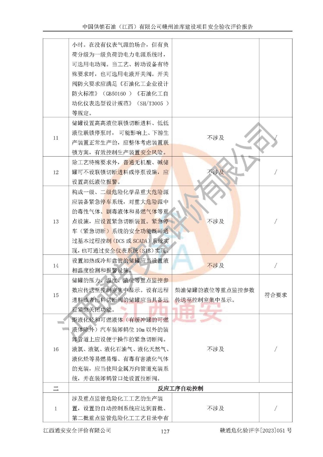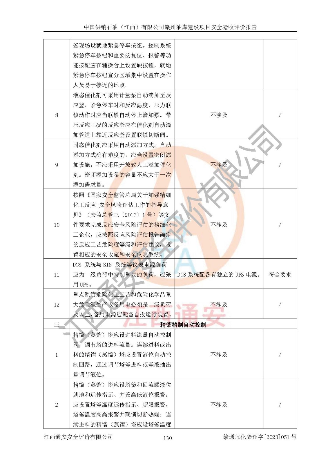 評(píng)價(jià)結(jié)論 | 中國供銷石油(江西)有限公司贛州油庫建設(shè)項(xiàng)目現(xiàn)場情況與設(shè)計(jì)圖紙一致,DCS系統(tǒng)設(shè)計(jì)符合要求、運(yùn)行正常,安全設(shè)施及安全管理符合**及有關(guān)部門關(guān)于安全生產(chǎn)法律、法規(guī)、標(biāo)準(zhǔn)的要求,該項(xiàng)目試生產(chǎn)以來,工藝設(shè)備運(yùn)行正常,安全設(shè)施和采取的安全技術(shù)措施符合設(shè)計(jì)要求并達(dá)到預(yù)期結(jié)果,可以滿足建設(shè)項(xiàng)目安全生產(chǎn)的要求,安全生產(chǎn)管理**,具備了安全設(shè)施竣工驗(yàn)收條件。 | ||||||