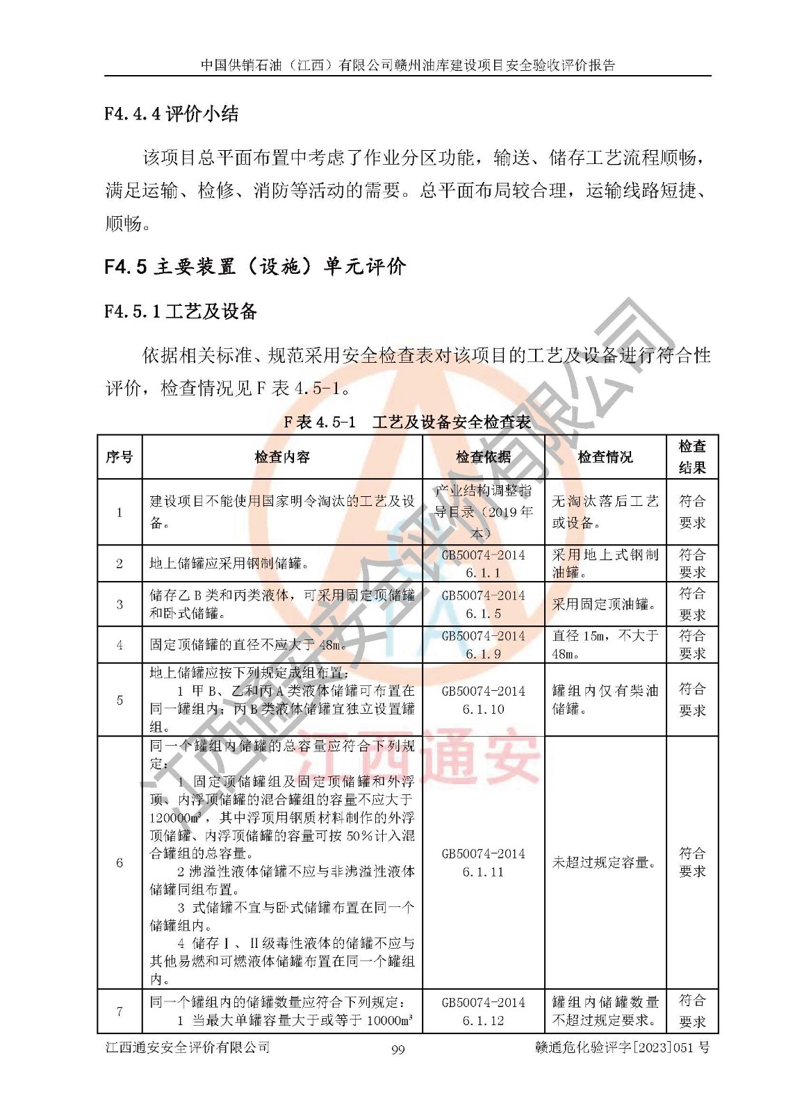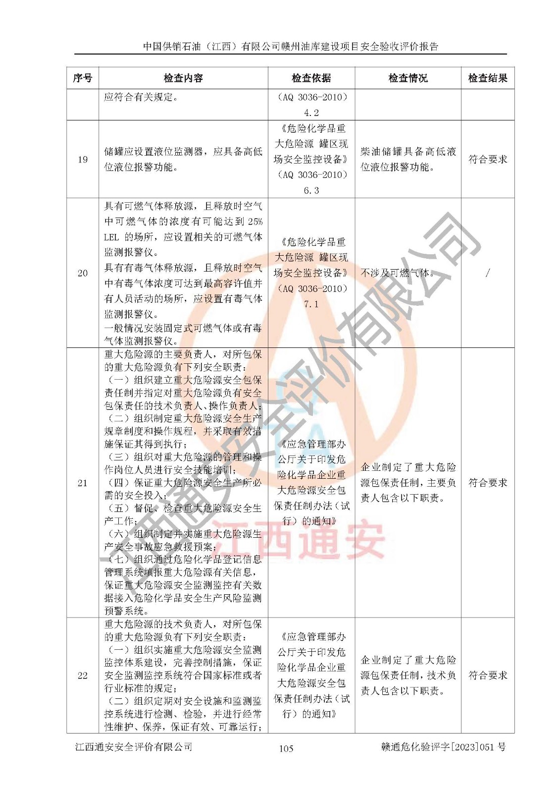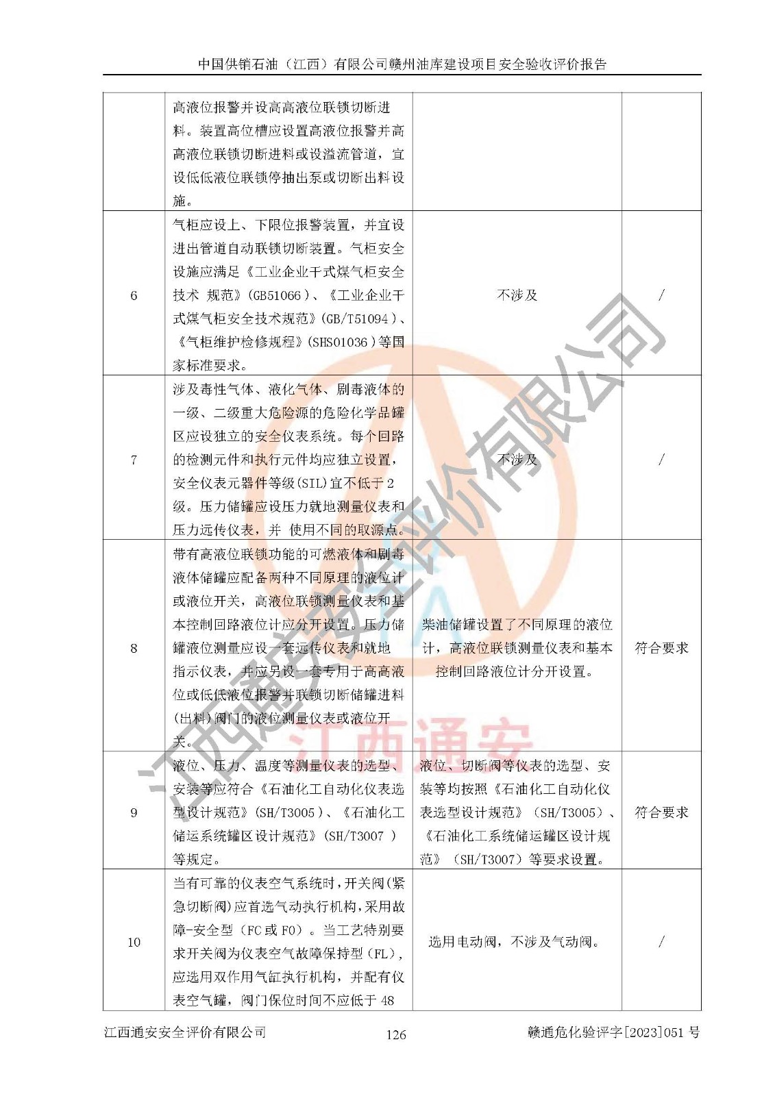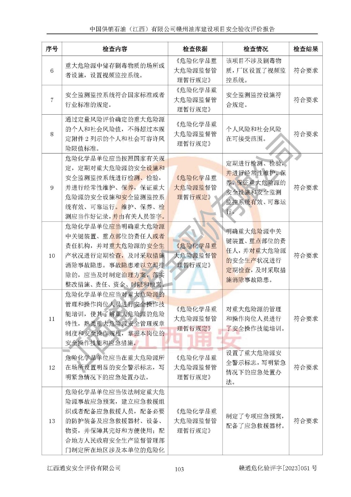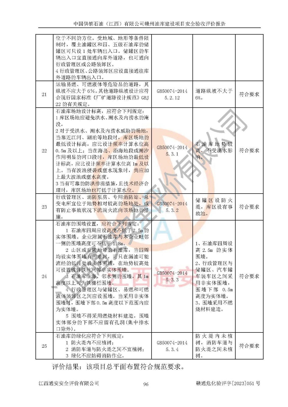 評(píng)價(jià)結(jié)論 | 中國供銷石油(江西)有限公司贛州油庫建設(shè)項(xiàng)目現(xiàn)場情況與設(shè)計(jì)圖紙一致,DCS系統(tǒng)設(shè)計(jì)符合要求、運(yùn)行正常,安全設(shè)施及安全管理符合**及有關(guān)部門關(guān)于安全生產(chǎn)法律、法規(guī)、標(biāo)準(zhǔn)的要求,該項(xiàng)目試生產(chǎn)以來,工藝設(shè)備運(yùn)行正常,安全設(shè)施和采取的安全技術(shù)措施符合設(shè)計(jì)要求并達(dá)到預(yù)期結(jié)果,可以滿足建設(shè)項(xiàng)目安全生產(chǎn)的要求,安全生產(chǎn)管理**,具備了安全設(shè)施竣工驗(yàn)收條件。 | ||||||