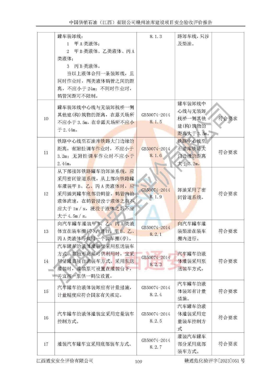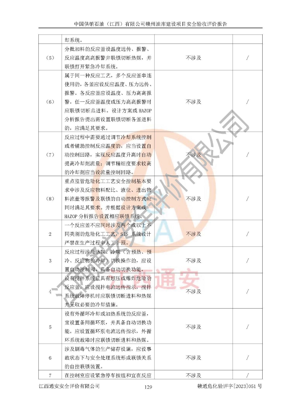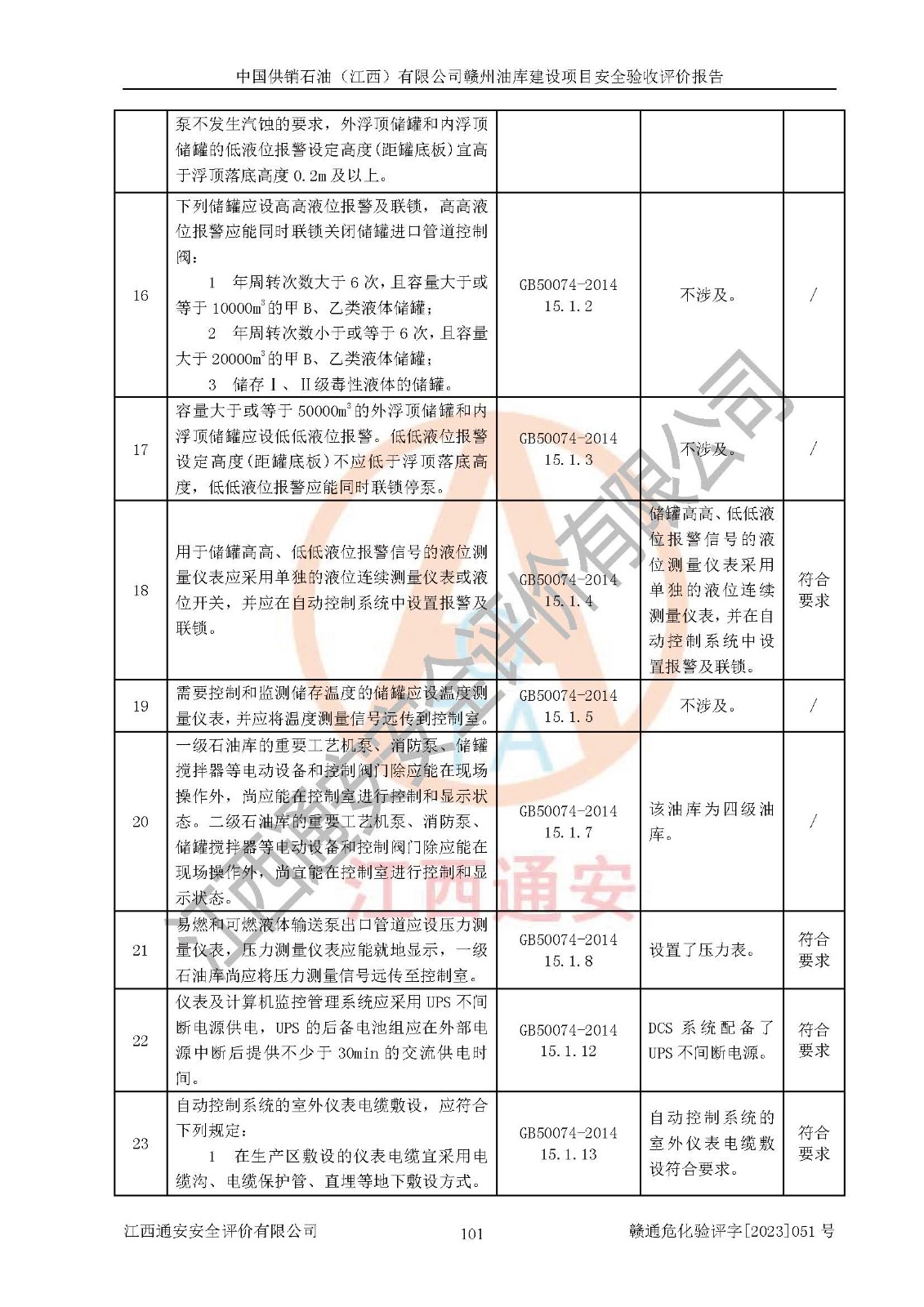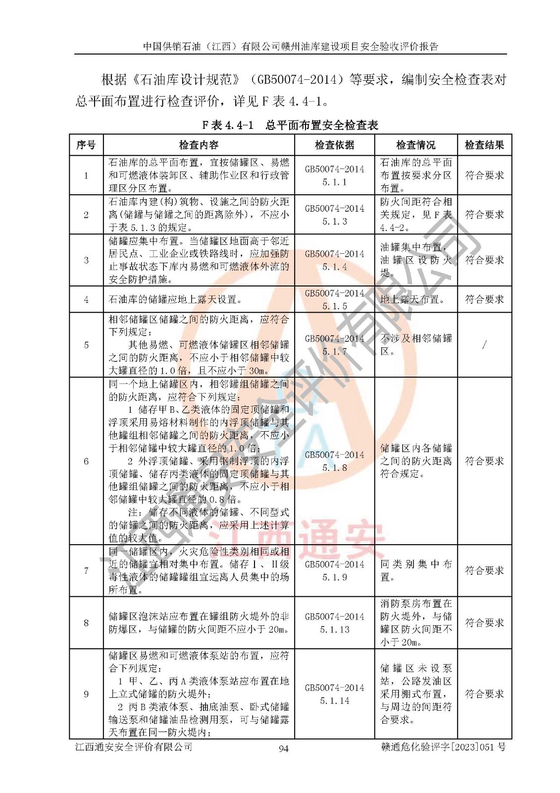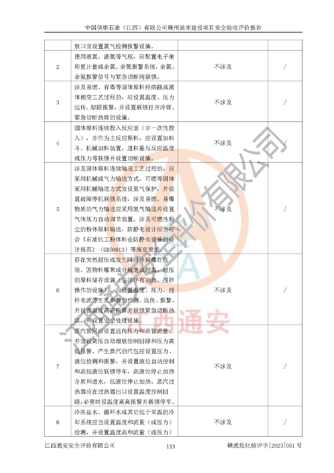 評(píng)價(jià)結(jié)論 | 中國供銷石油(江西)有限公司贛州油庫建設(shè)項(xiàng)目現(xiàn)場情況與設(shè)計(jì)圖紙一致,DCS系統(tǒng)設(shè)計(jì)符合要求、運(yùn)行正常,安全設(shè)施及安全管理符合**及有關(guān)部門關(guān)于安全生產(chǎn)法律、法規(guī)、標(biāo)準(zhǔn)的要求,該項(xiàng)目試生產(chǎn)以來,工藝設(shè)備運(yùn)行正常,安全設(shè)施和采取的安全技術(shù)措施符合設(shè)計(jì)要求并達(dá)到預(yù)期結(jié)果,可以滿足建設(shè)項(xiàng)目安全生產(chǎn)的要求,安全生產(chǎn)管理**,具備了安全設(shè)施竣工驗(yàn)收條件。 | ||||||