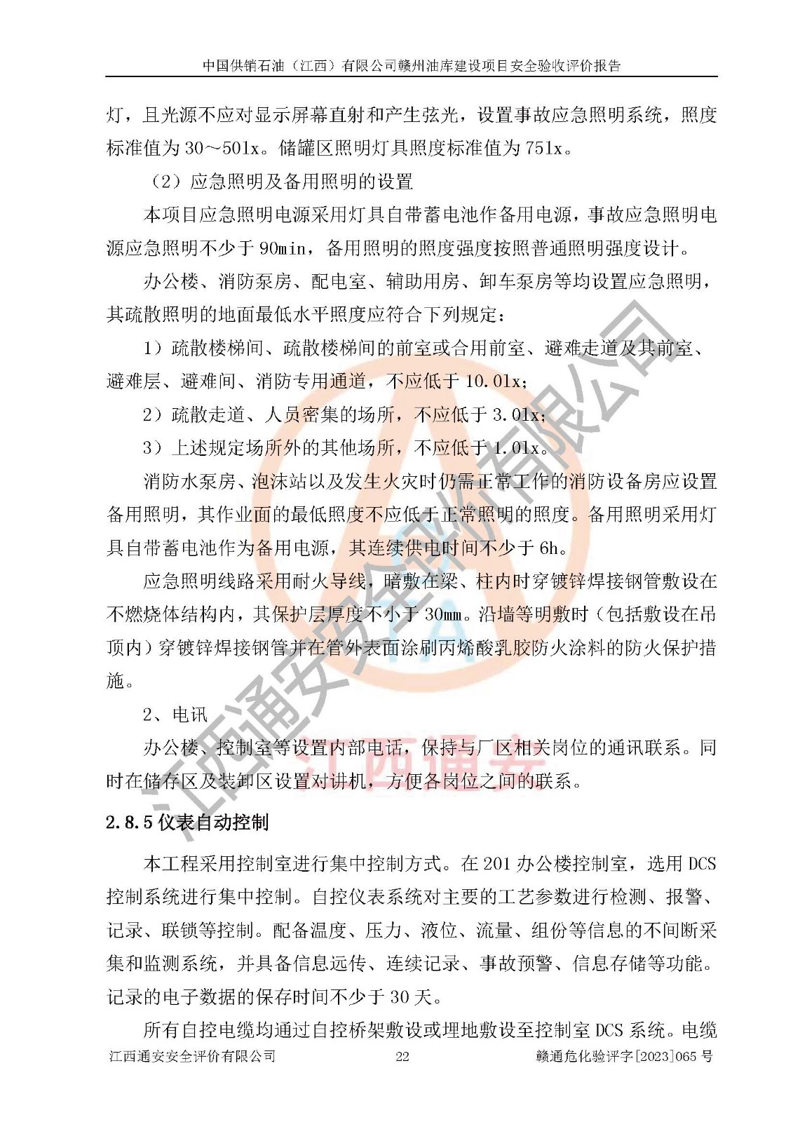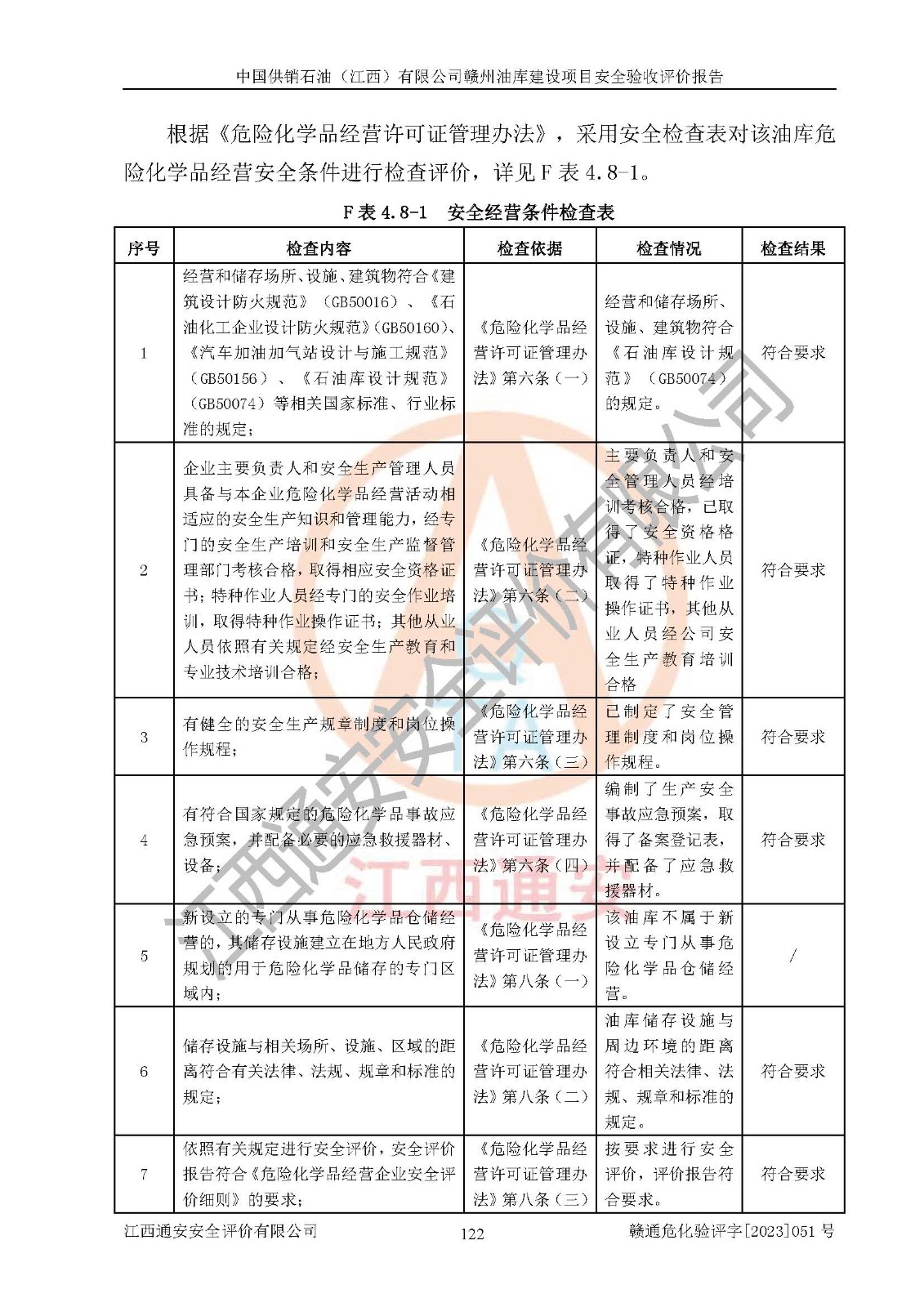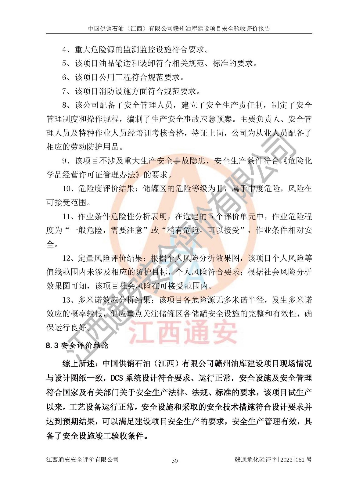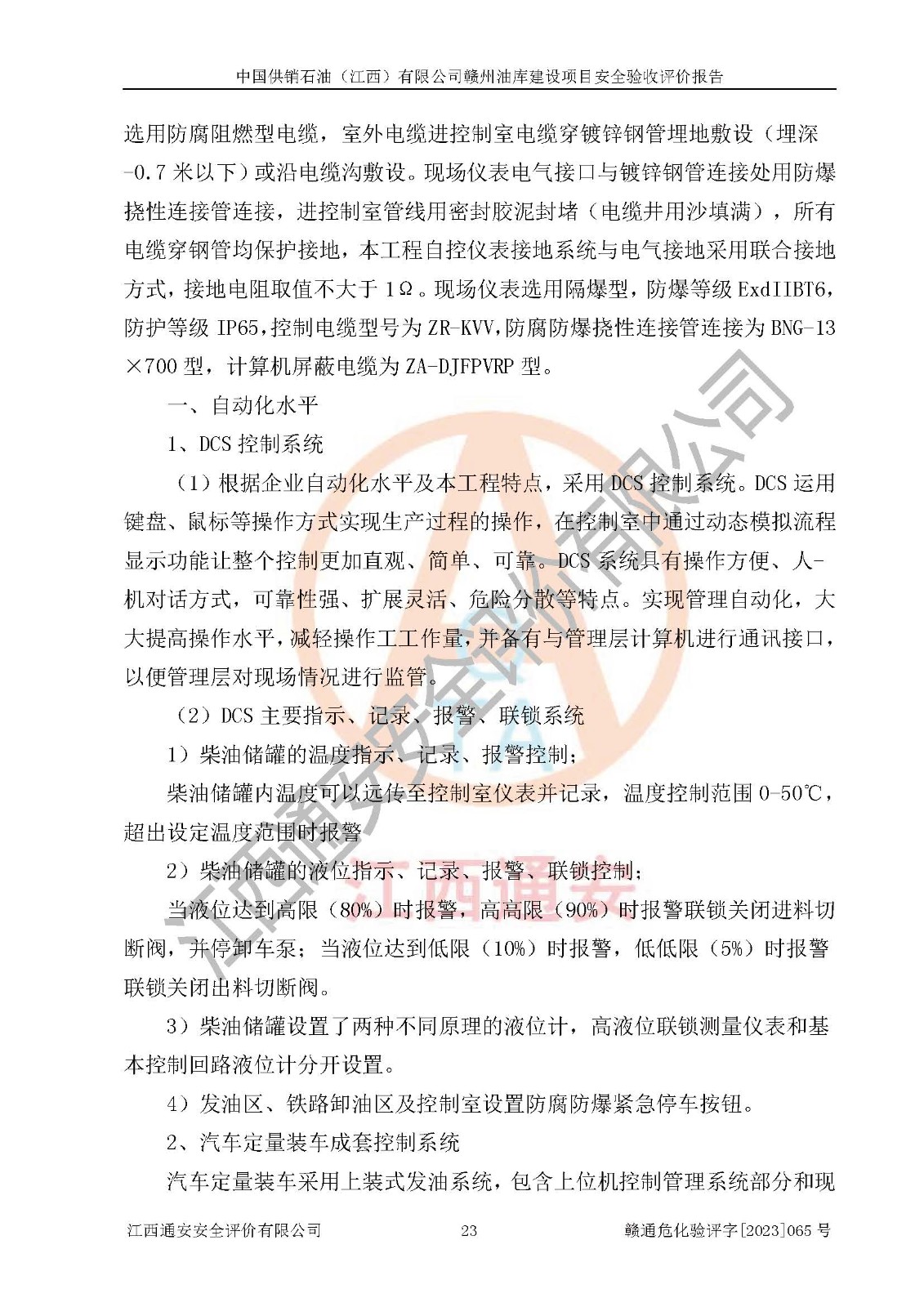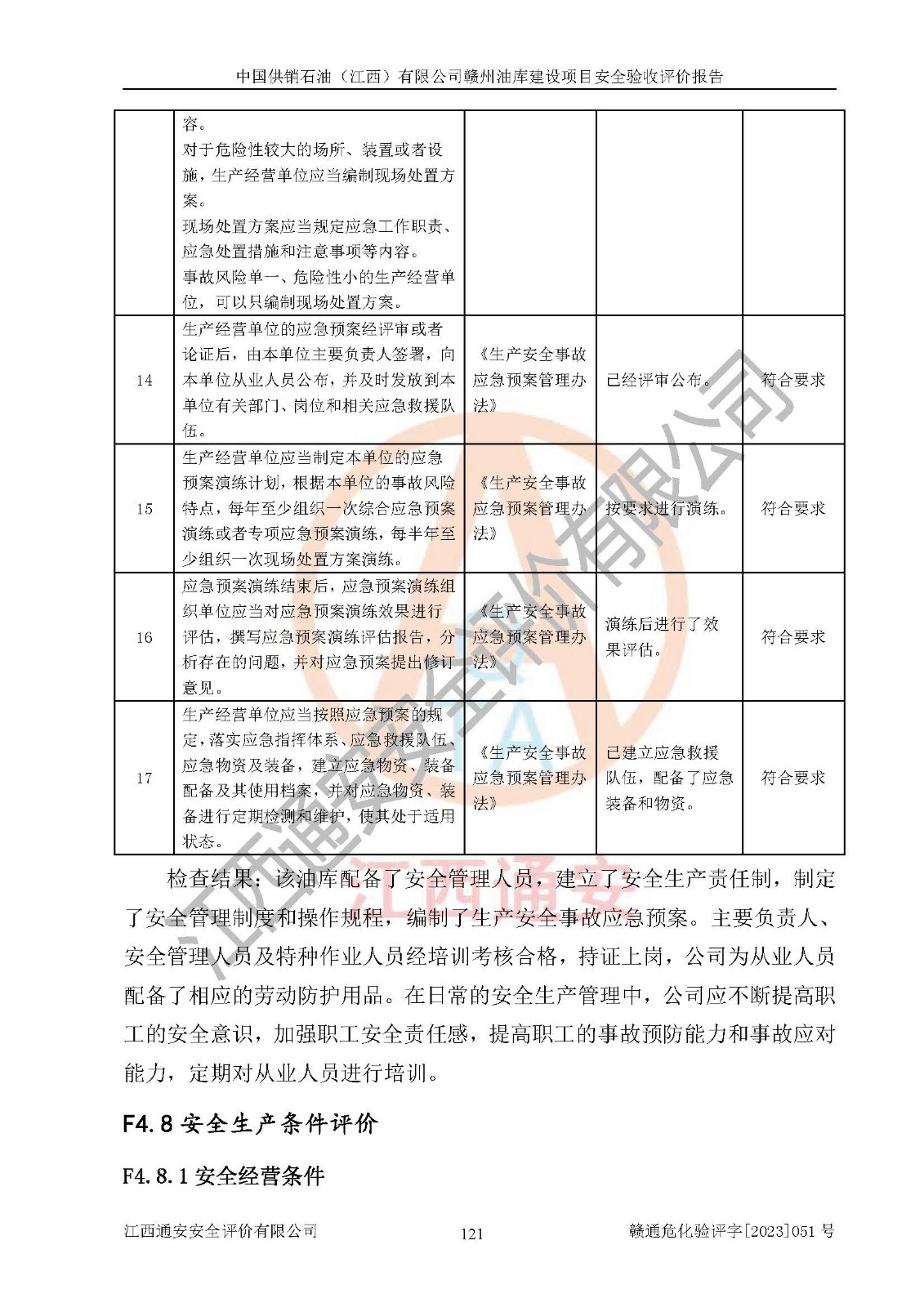 評(píng)價(jià)結(jié)論 | 中國供銷石油(江西)有限公司贛州油庫建設(shè)項(xiàng)目現(xiàn)場情況與設(shè)計(jì)圖紙一致,DCS系統(tǒng)設(shè)計(jì)符合要求、運(yùn)行正常,安全設(shè)施及安全管理符合**及有關(guān)部門關(guān)于安全生產(chǎn)法律、法規(guī)、標(biāo)準(zhǔn)的要求,該項(xiàng)目試生產(chǎn)以來,工藝設(shè)備運(yùn)行正常,安全設(shè)施和采取的安全技術(shù)措施符合設(shè)計(jì)要求并達(dá)到預(yù)期結(jié)果,可以滿足建設(shè)項(xiàng)目安全生產(chǎn)的要求,安全生產(chǎn)管理**,具備了安全設(shè)施竣工驗(yàn)收條件。 | ||||||