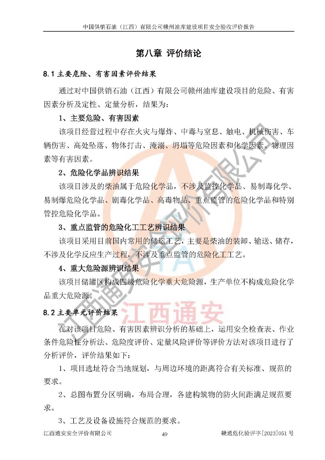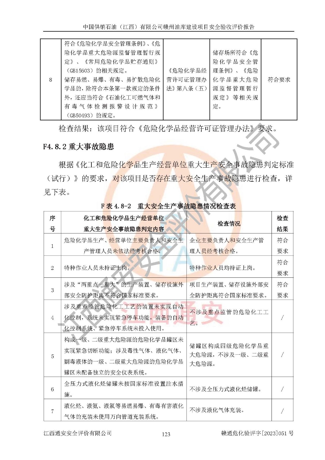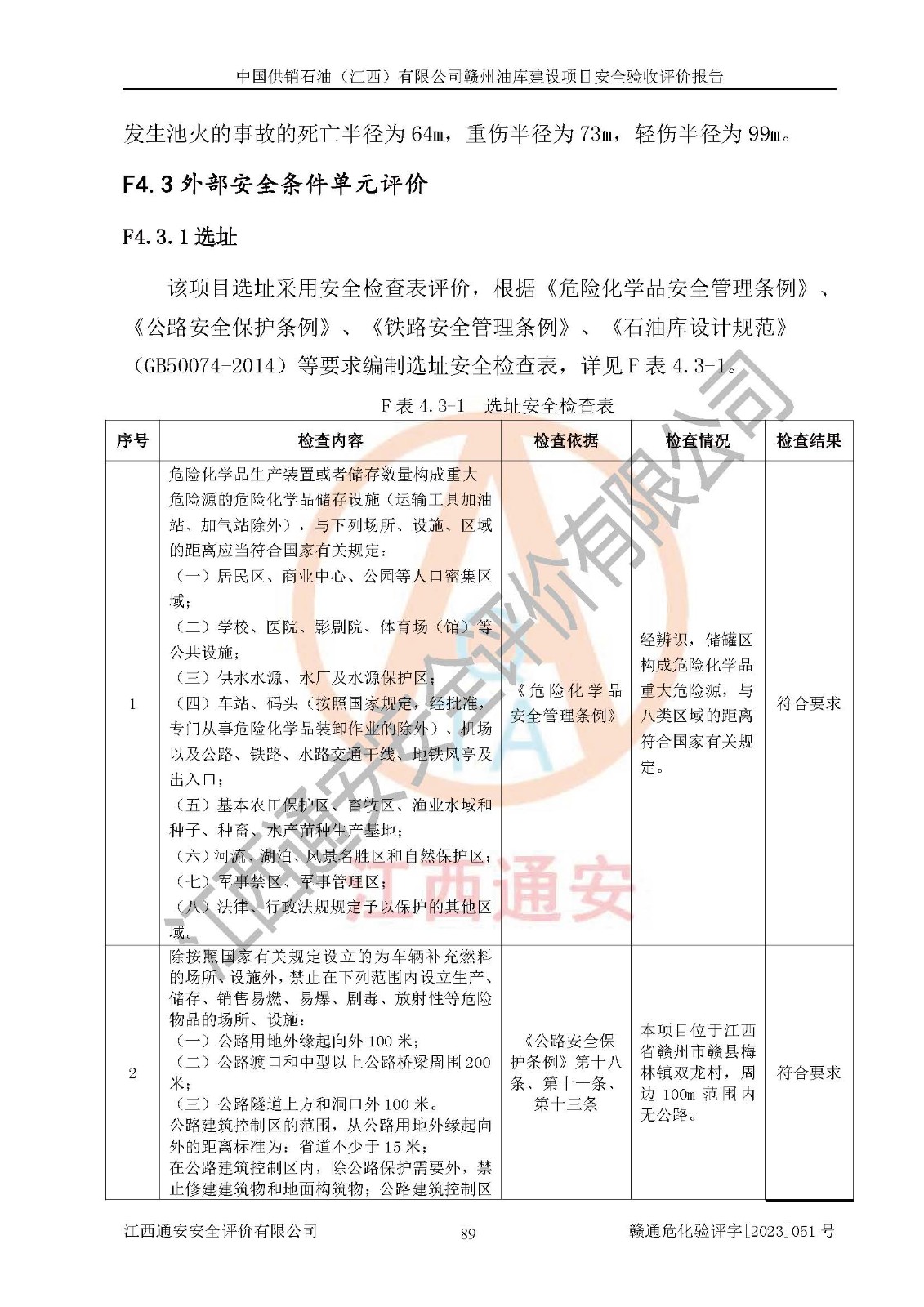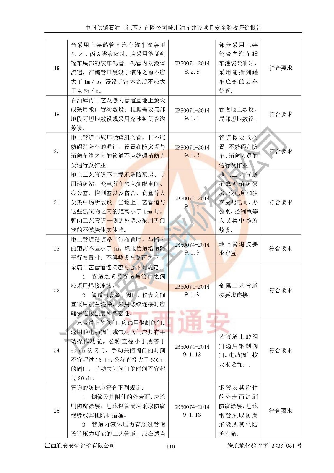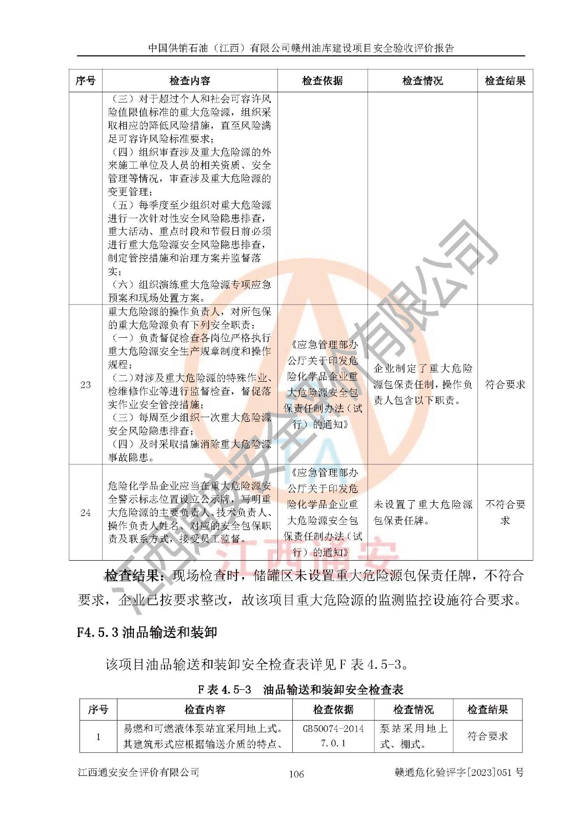 評(píng)價(jià)結(jié)論 | 中國供銷石油(江西)有限公司贛州油庫建設(shè)項(xiàng)目現(xiàn)場情況與設(shè)計(jì)圖紙一致,DCS系統(tǒng)設(shè)計(jì)符合要求、運(yùn)行正常,安全設(shè)施及安全管理符合**及有關(guān)部門關(guān)于安全生產(chǎn)法律、法規(guī)、標(biāo)準(zhǔn)的要求,該項(xiàng)目試生產(chǎn)以來,工藝設(shè)備運(yùn)行正常,安全設(shè)施和采取的安全技術(shù)措施符合設(shè)計(jì)要求并達(dá)到預(yù)期結(jié)果,可以滿足建設(shè)項(xiàng)目安全生產(chǎn)的要求,安全生產(chǎn)管理**,具備了安全設(shè)施竣工驗(yàn)收條件。 | ||||||