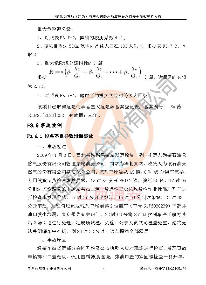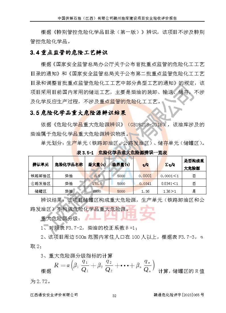 項(xiàng)目簡介 | 中國供銷石油(江西)有限公司贛州油庫成立于2023年5月24日,位于江西省贛州市贛縣區(qū)梅林鎮(zhèn),主要從事成品油批發(fā)。本項(xiàng)目油庫由中國供銷石油(江西)有限公司贛州油庫承租,并負(fù)責(zé)油庫后期運(yùn)營及管理。 根據(jù)2023年5月30日贛州市自然資源局出具的《關(guān)于南昌鐵路局贛縣運(yùn)用車間鐵路油庫用地現(xiàn)狀的回復(fù)》,經(jīng)核實(shí),該項(xiàng)目用地類型均為鐵路用地。經(jīng)查詢不動(dòng)產(chǎn)登記中心直屬三所,該項(xiàng)目用地紅線范圍內(nèi)權(quán)屬為中國鐵路南昌局集團(tuán)有限公司。江西京九物流有限公司(專門負(fù)責(zé)南昌局集團(tuán)公司資產(chǎn)租賃業(yè)務(wù)的全資子公司)與中國供銷石油(江西)有限公司簽定了《鐵路油庫場地及配套設(shè)施租賃協(xié)議》并進(jìn)行了說明,說明中明確:中國供銷石油(江西)有限公司具備贛州鐵路油庫場地使用權(quán)。 本項(xiàng)目油庫為早期建設(shè)項(xiàng)目,現(xiàn)由中國供銷石油(江西)有限公司贛州油庫租賃并運(yùn)營。根據(jù)《危險(xiǎn)化學(xué)品目錄》(2022調(diào)整版),本項(xiàng)目經(jīng)營儲(chǔ)存的主要物料柴油屬于危險(xiǎn)化學(xué)品,需要申請(qǐng)辦理危險(xiǎn)化學(xué)品經(jīng)營許可證。因經(jīng)營主體發(fā)生變化,根據(jù)有關(guān)規(guī)定,新的經(jīng)營者需要重新對(duì)本項(xiàng)目以新項(xiàng)目進(jìn)行立項(xiàng)并進(jìn)行安全三同時(shí)。中國供銷石油江西有限公司贛州油庫建設(shè)項(xiàng)目2023年5月31日取得了項(xiàng)目備案通知書,委托江西贛安安全生產(chǎn)科學(xué)技術(shù)咨詢服務(wù)中心編制了項(xiàng)目安全條件評(píng)價(jià)報(bào)告,并取得了安全條件審查的批復(fù),委托海灣工程有限公司編制了項(xiàng)目安全設(shè)施設(shè)計(jì),并取得了安全設(shè)施設(shè)計(jì)審查的批復(fù)。 本項(xiàng)目位于江西省贛州市贛縣梅林鎮(zhèn)雙龍村贛州東機(jī)務(wù)折返段內(nèi)。該油庫占地面積約20000m2,油庫儲(chǔ)運(yùn)油品為柴油,卸油方式為鐵路進(jìn)油,內(nèi)設(shè)2000m2地上立式固定頂油罐4座,總?cè)萘?000m3,出油通過管道供給公路發(fā)油區(qū)裝卸設(shè)施。該油庫西北面設(shè)有卸油**線(設(shè)兩條卸車線),1處卸油棧橋,棧橋上設(shè)有卸油鶴管6個(gè)。根據(jù)《石油庫設(shè)計(jì)規(guī)范》(GB 50074-2014)第3.0.1條,柴油為丙A類液體,容量乘以系數(shù)0.5計(jì)入儲(chǔ)罐計(jì)算總?cè)萘?;該油庫?chǔ)罐計(jì)算總?cè)萘縏V為4000m3,為四級(jí)石油庫,庫內(nèi)設(shè)有公路發(fā)油區(qū)。 該項(xiàng)目經(jīng)營過程中涉及的物料為柴油屬于危險(xiǎn)化學(xué)品。經(jīng)辨識(shí),該項(xiàng)目不涉及監(jiān)控化學(xué)品、易制毒化學(xué)品、易制爆危險(xiǎn)化學(xué)品、劇毒化學(xué)品、高毒物品、重點(diǎn)監(jiān)管的危險(xiǎn)化學(xué)品和特別管控危險(xiǎn)化學(xué)品,不涉及重點(diǎn)監(jiān)管的危險(xiǎn)化工工藝,儲(chǔ)罐區(qū)構(gòu)成四級(jí)危險(xiǎn)化學(xué)品重大危險(xiǎn)源。根據(jù)生產(chǎn)工藝特點(diǎn)及物料的理化特性可知,該項(xiàng)目生產(chǎn)過程中存在火災(zāi)、爆炸、中毒與窒息、觸電、機(jī)械傷害等危險(xiǎn)因素。 | ||||||