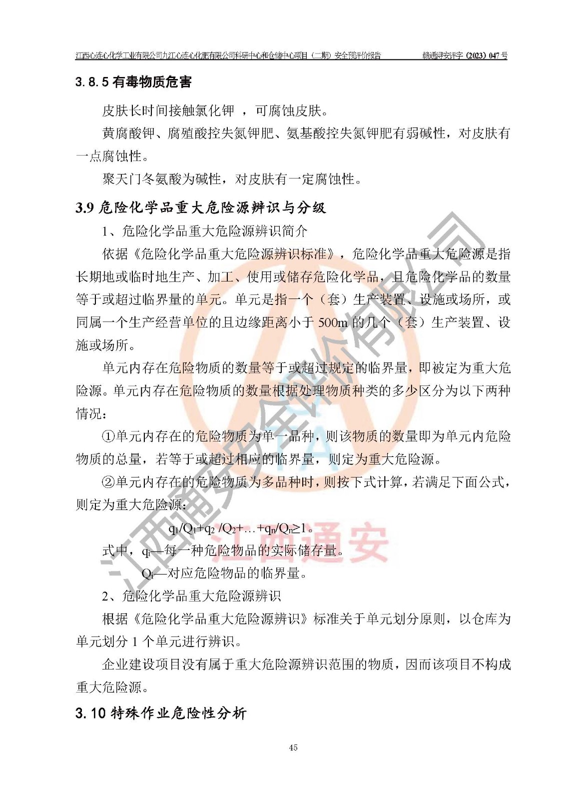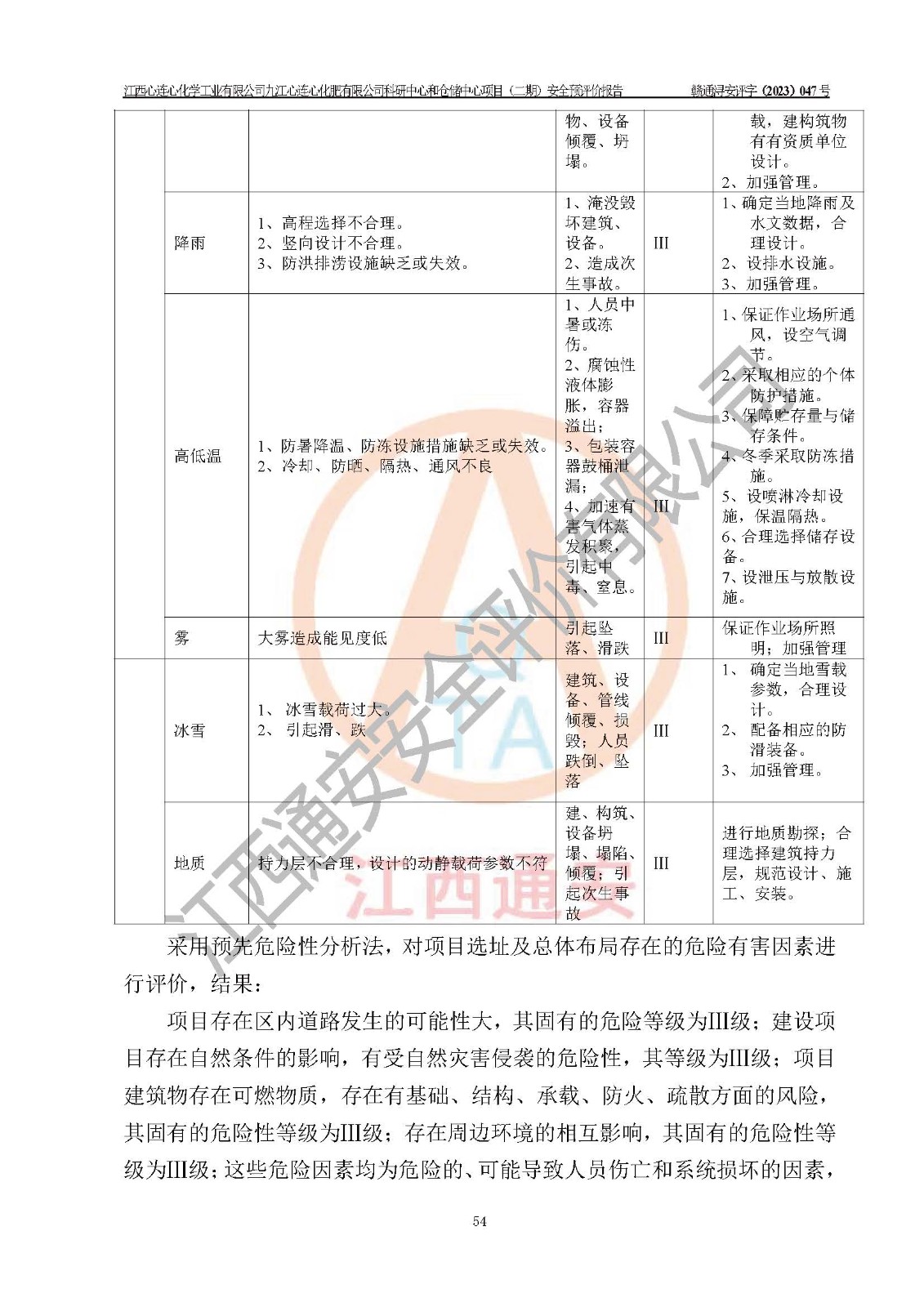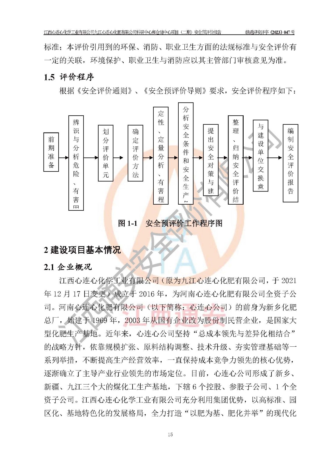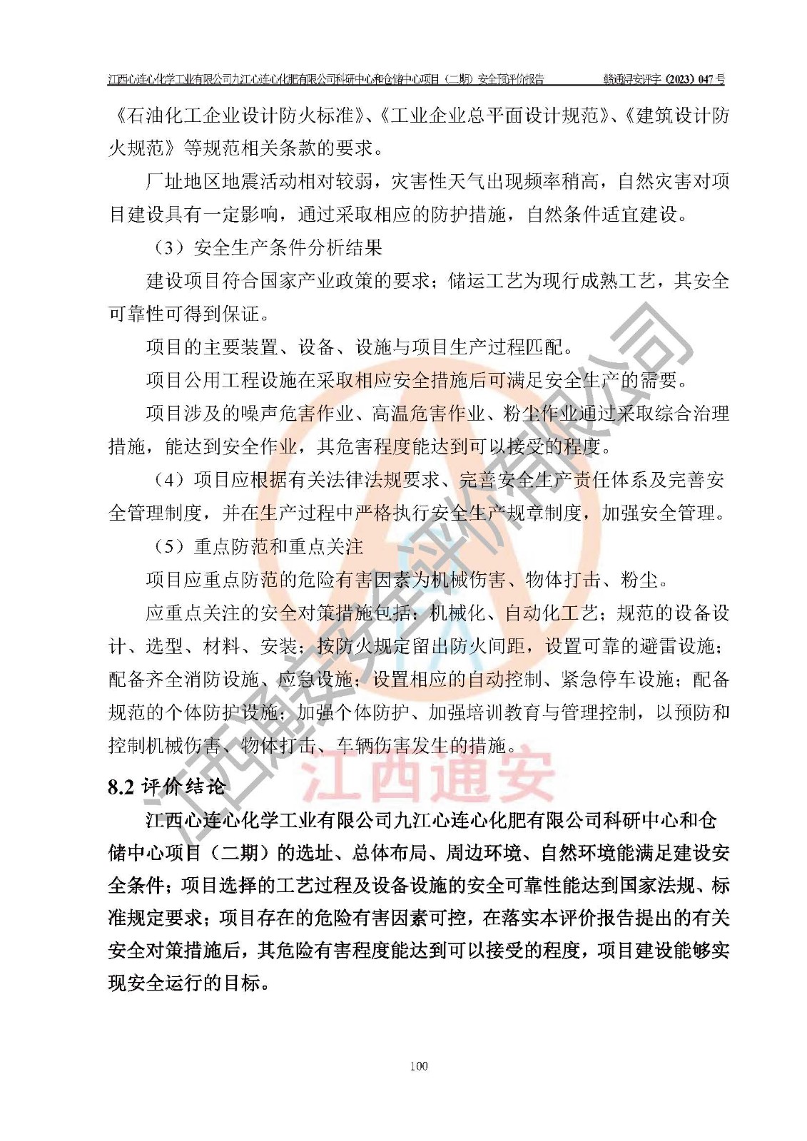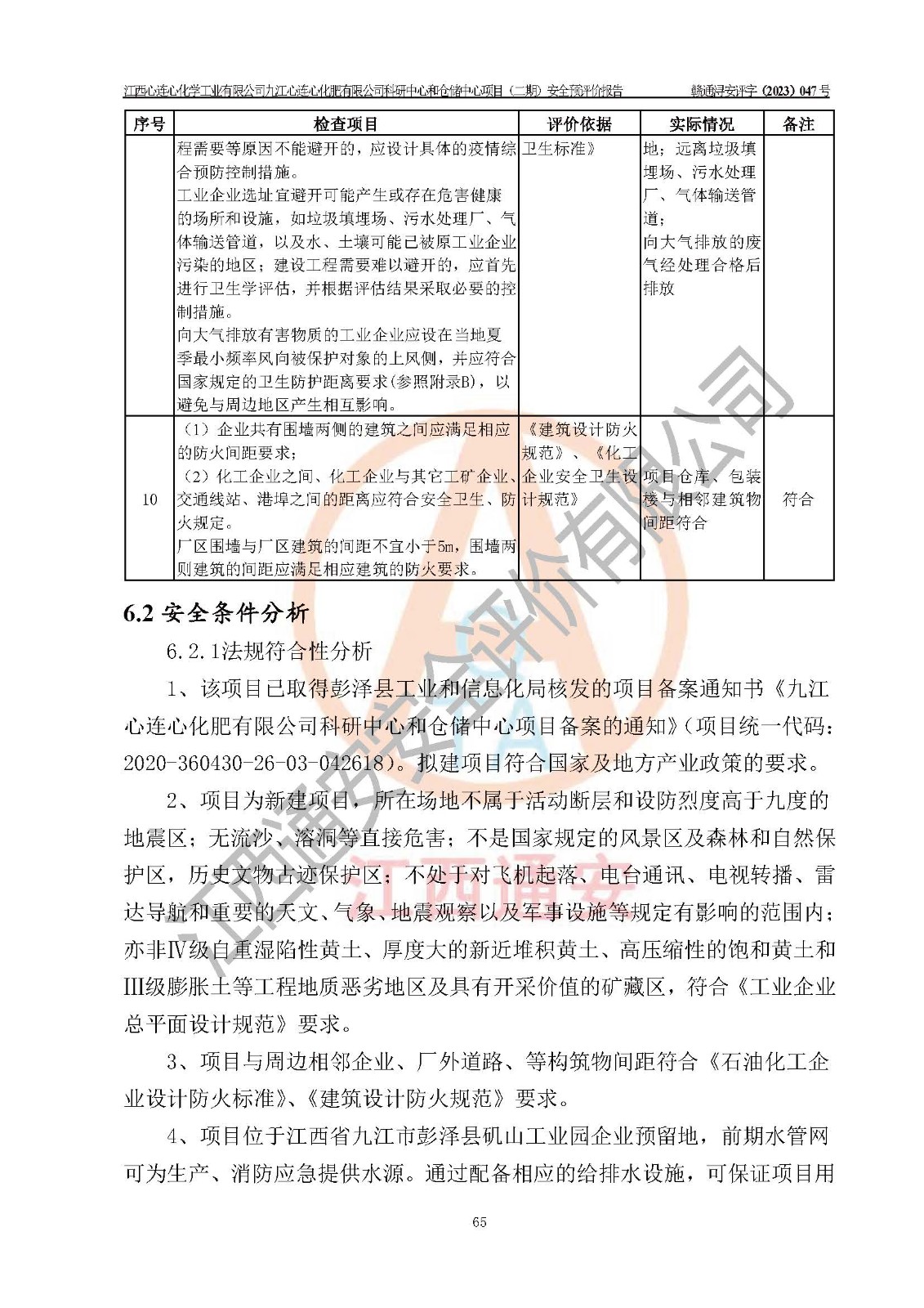 評價結(jié)論 | 江西心連心化學(xué)工業(yè)有限公司九江心連心化肥有限公司科研中心和倉儲中心項目(二期)的選址、總體布局、周邊環(huán)境、自然環(huán)境能滿足建設(shè)安全條件;項目選擇的工藝過程及設(shè)備設(shè)施的安全可靠性能達(dá)到**法規(guī)、標(biāo)準(zhǔn)規(guī)定要求;項目存在的危險有害因素可控,在落實本評價報告提出的有關(guān)安全對策措施后,其危險有害程度能達(dá)到可以接受的程度,項目建設(shè)能夠?qū)崿F(xiàn) 安全運行的目標(biāo)。 | ||||
