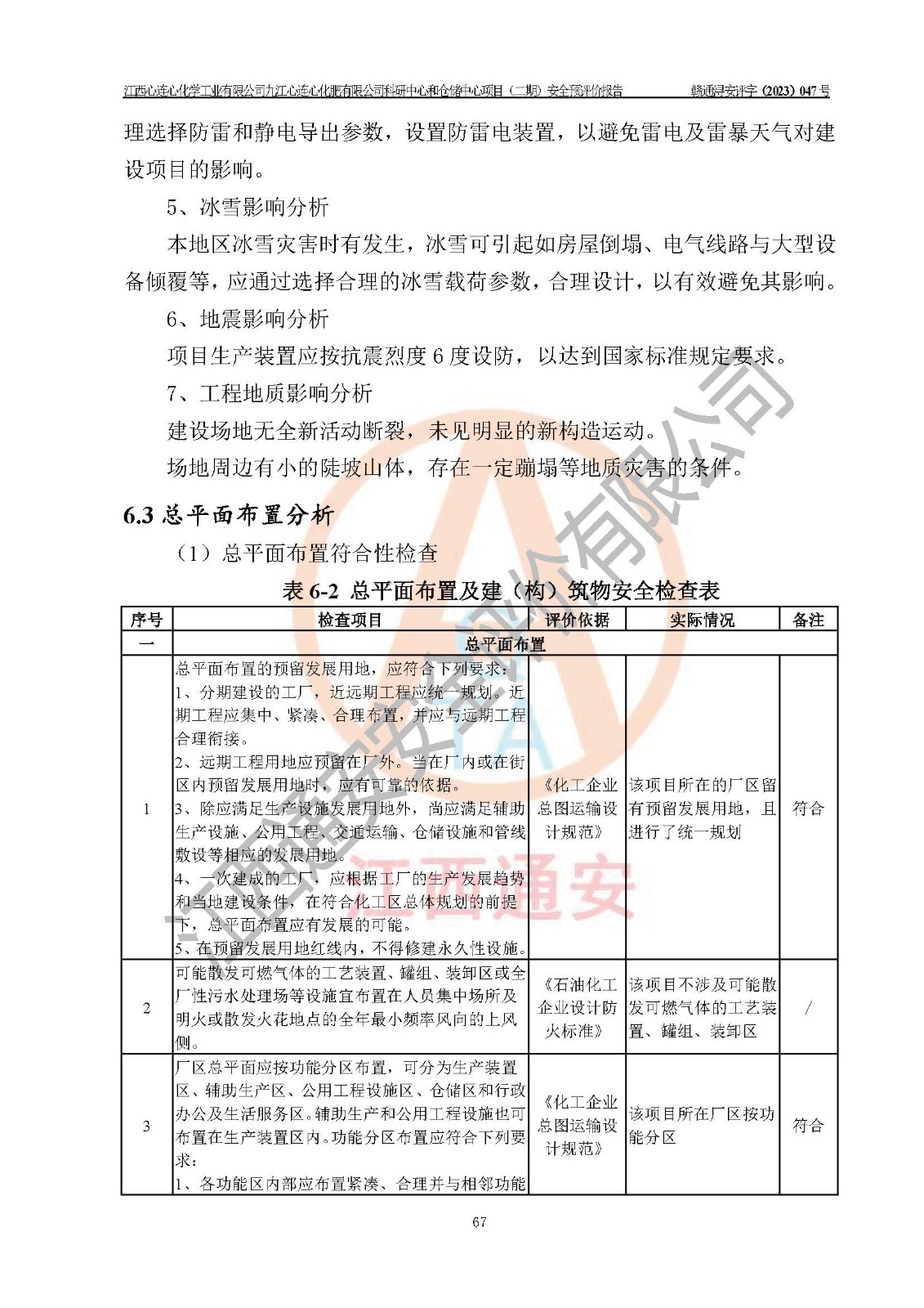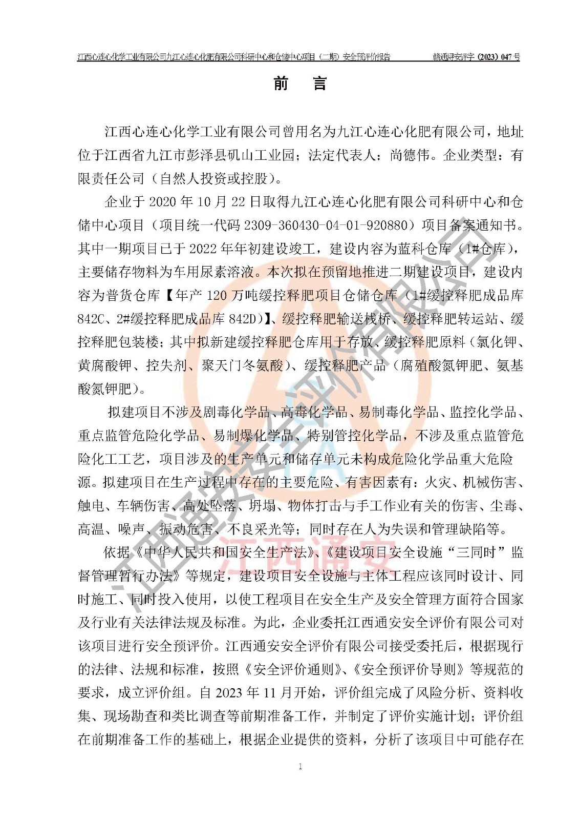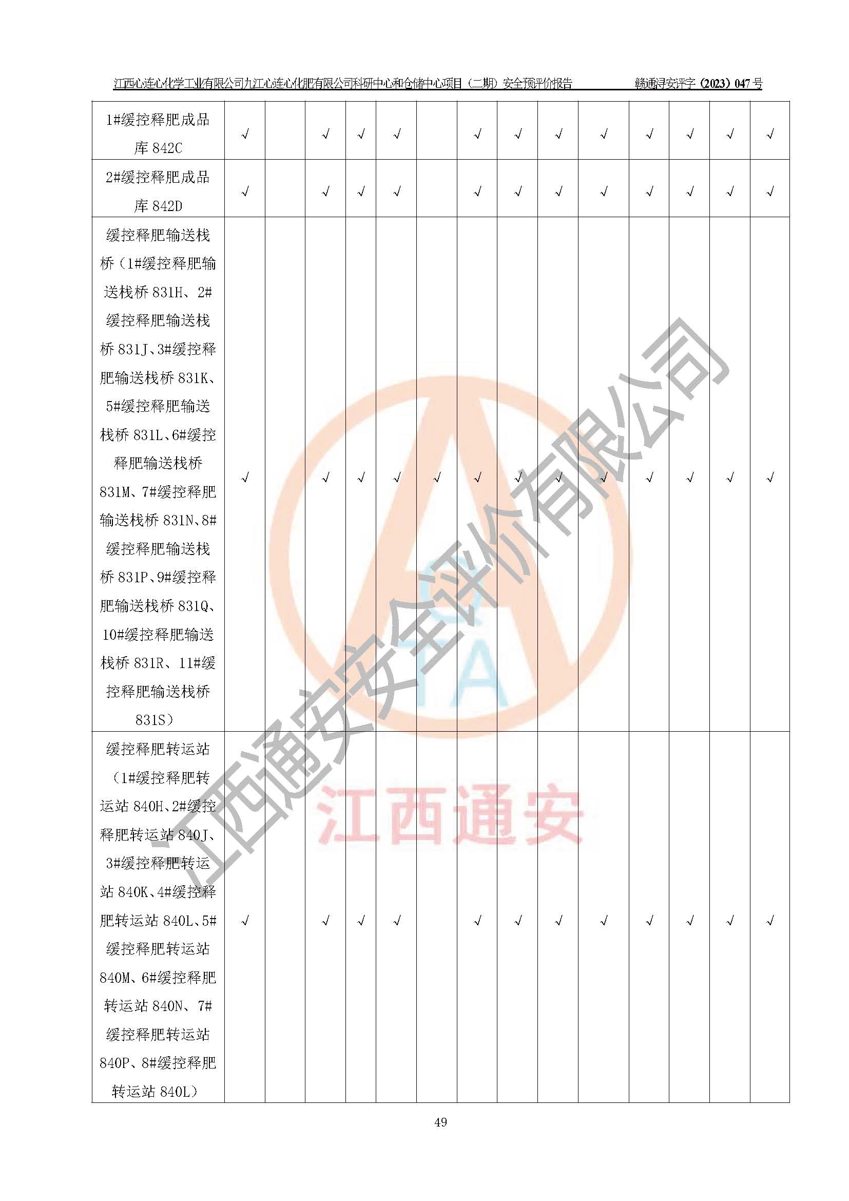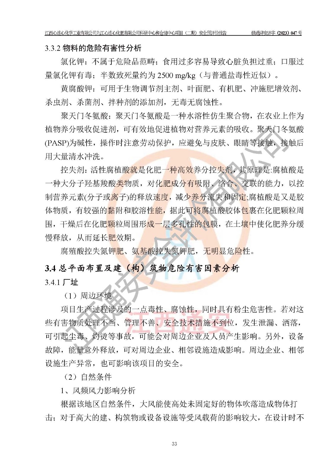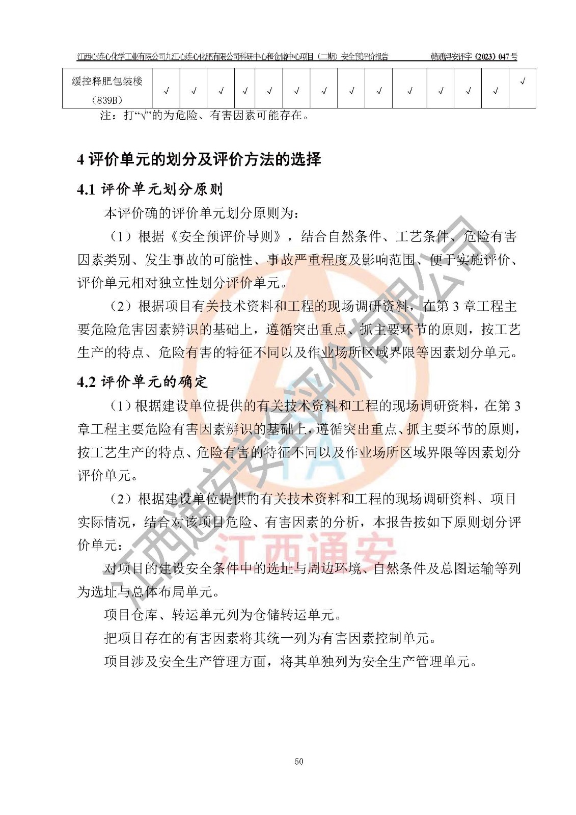 評價結(jié)論 | 江西心連心化學(xué)工業(yè)有限公司九江心連心化肥有限公司科研中心和倉儲中心項目(二期)的選址、總體布局、周邊環(huán)境、自然環(huán)境能滿足建設(shè)安全條件;項目選擇的工藝過程及設(shè)備設(shè)施的安全可靠性能達(dá)到**法規(guī)、標(biāo)準(zhǔn)規(guī)定要求;項目存在的危險有害因素可控,在落實本評價報告提出的有關(guān)安全對策措施后,其危險有害程度能達(dá)到可以接受的程度,項目建設(shè)能夠?qū)崿F(xiàn) 安全運行的目標(biāo)。 | ||||