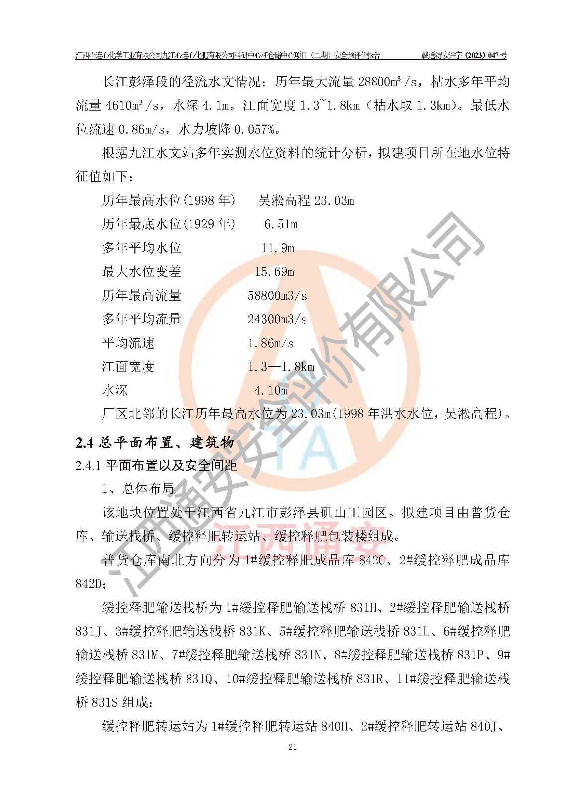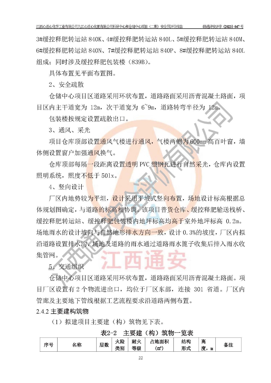項目簡介 | 項目名稱:九江心連心化肥有限公司科研中心和倉儲中心項目(二期) 項目選址:江西省九江市彭澤縣磯山工業(yè)園 建設(shè)單位:江西心連心化學(xué)工業(yè)有限公司 建設(shè)性質(zhì):新建 項目投資:45000萬元 項目占地及用地指標(biāo):該項目規(guī)劃總用地面積約81.7畝,該項目建筑物占地面積26135.14***;項目規(guī)劃總建筑面積58383.72*** 建設(shè)規(guī)模及內(nèi)容: 新建普貨倉庫【年產(chǎn)120萬噸緩控釋肥項目儲存?zhèn)}庫(1#緩控釋肥成品庫842C、2#緩控釋肥成品庫842D)】; 緩控釋肥輸送棧橋;緩控釋肥轉(zhuǎn)運站;緩控釋肥包裝樓(839B)等。 | ||||