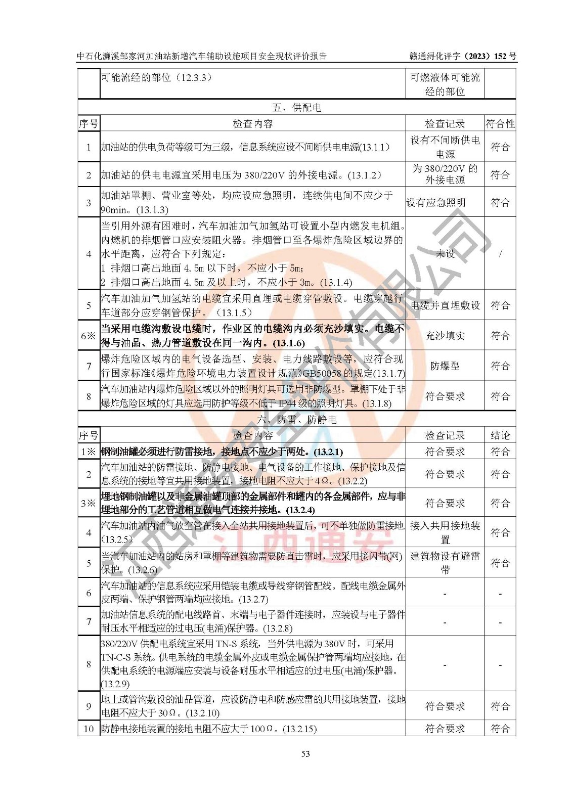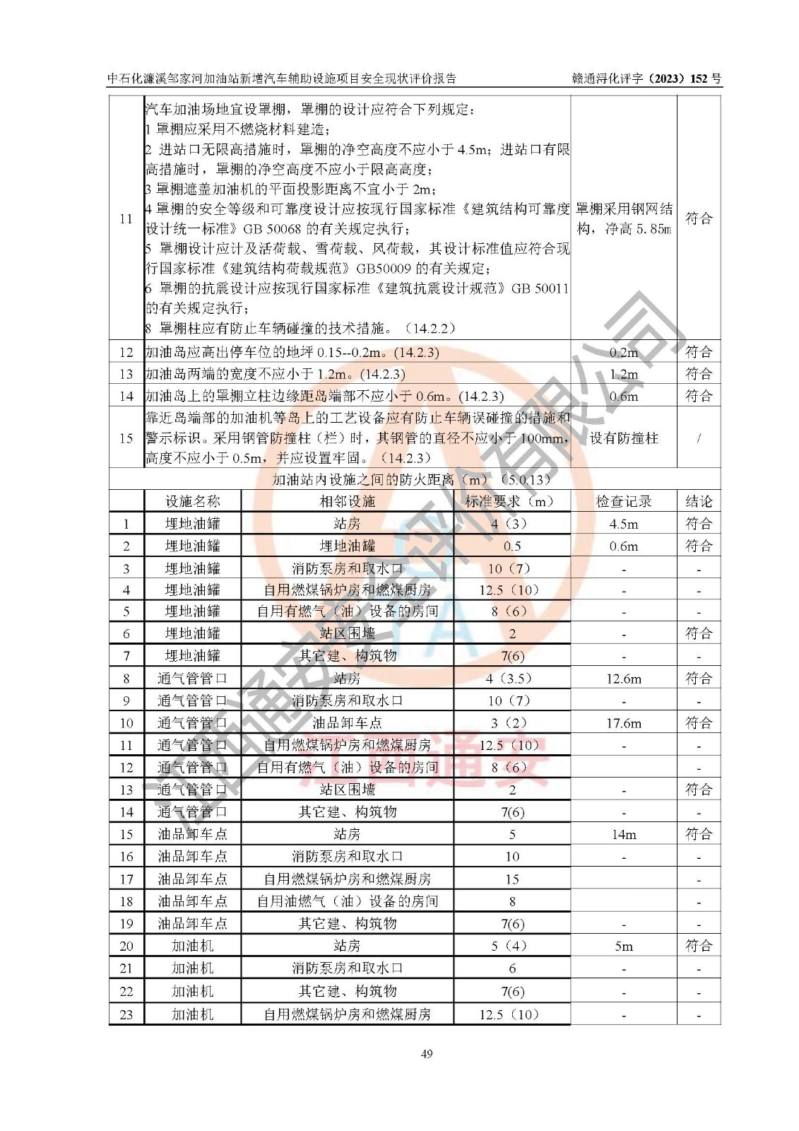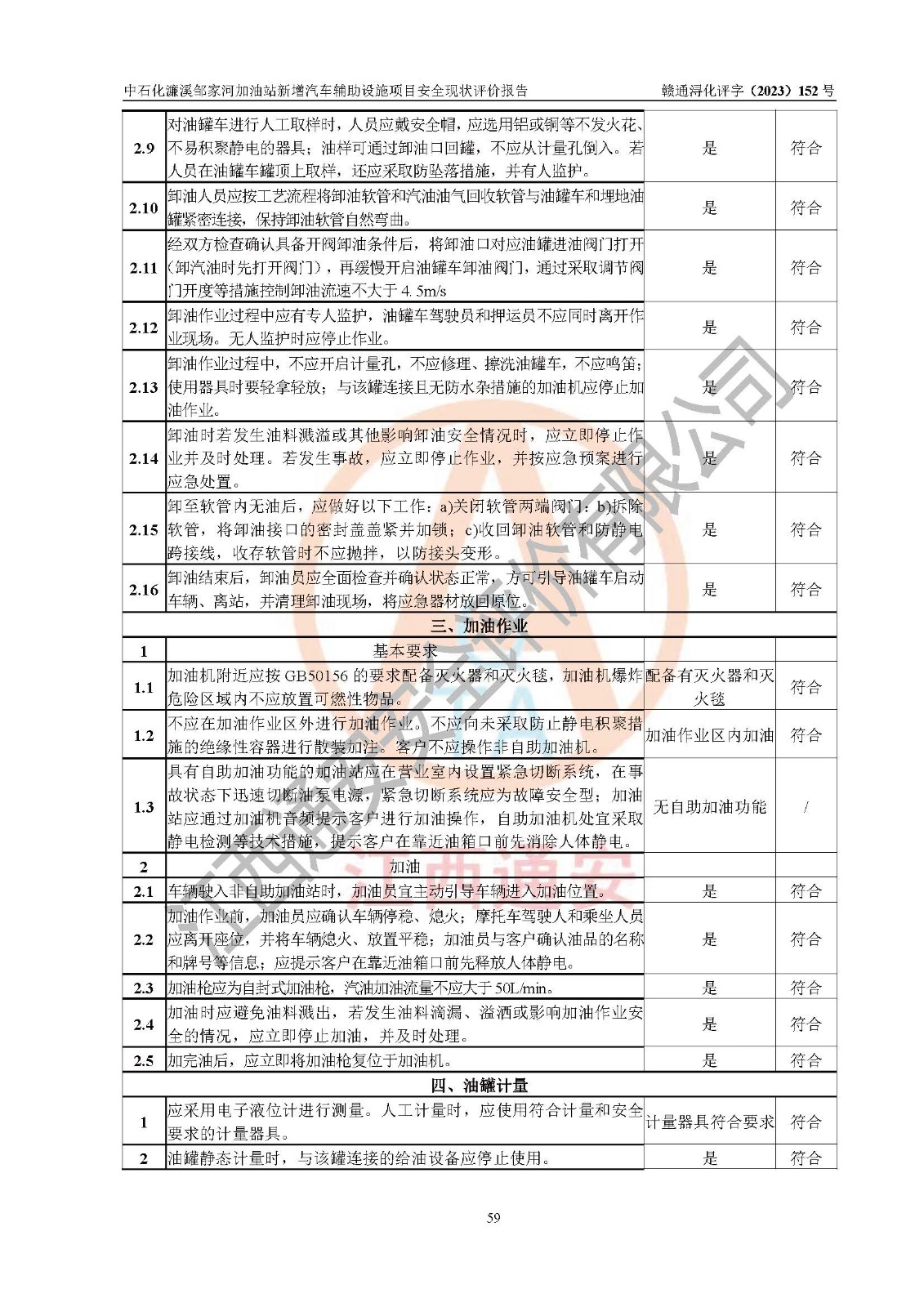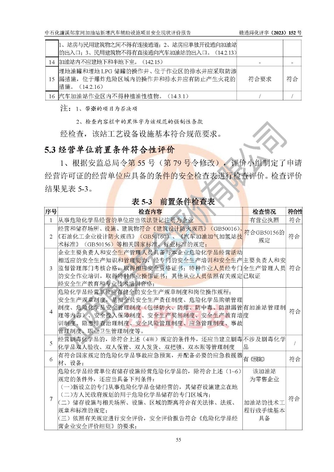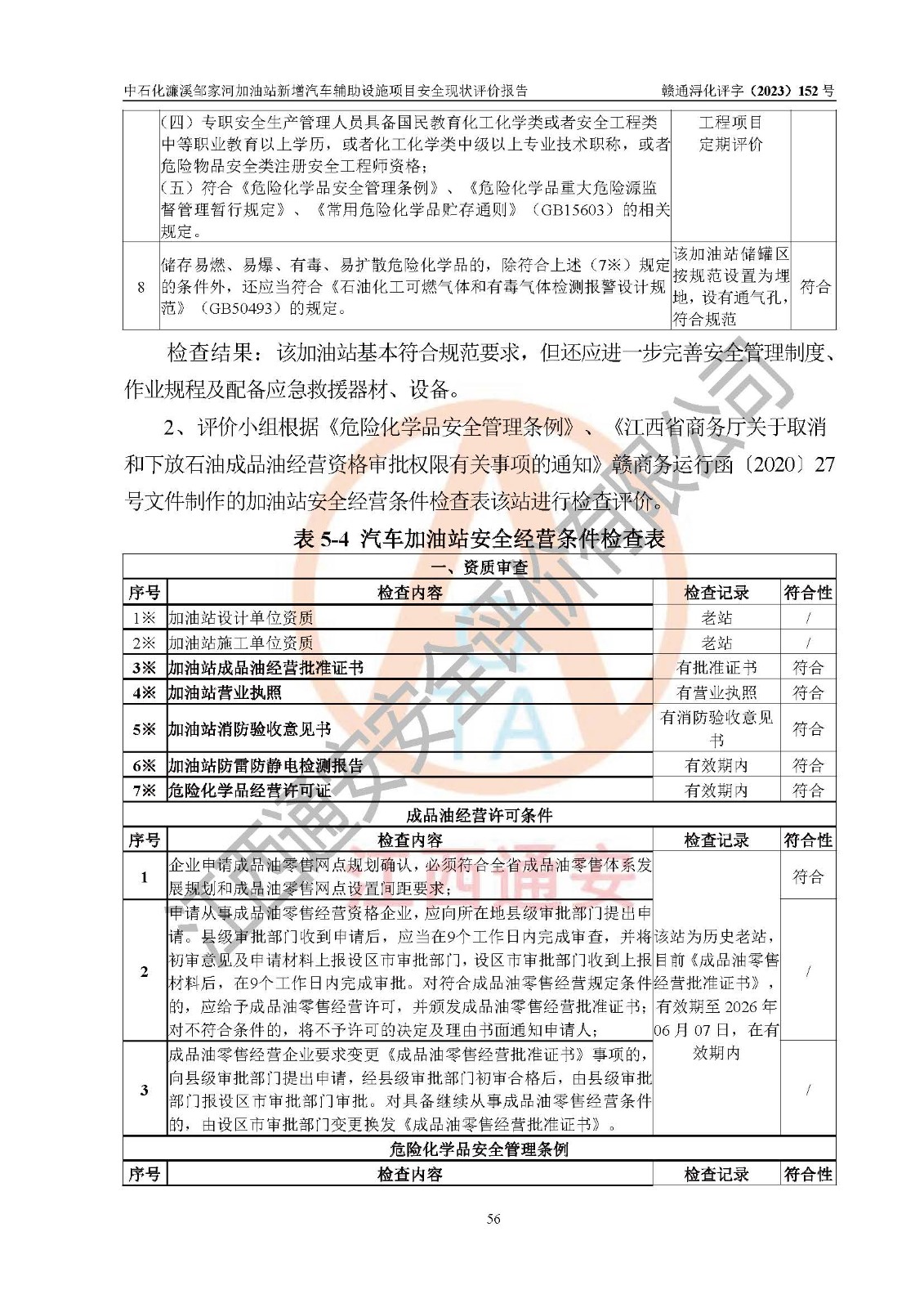 評價結(jié)論 | 中國石化銷售股份有限公司江西九江濂溪石油分公司鄒家河加油站新增汽車輔助設(shè)施項目涉及的安全條件、安全經(jīng)營條件、安全生產(chǎn)管理符合《危險化學(xué)品經(jīng)營許可證管理辦法》、《汽車加油加氣加氫站技術(shù)標(biāo)準(zhǔn)》等**有關(guān)法規(guī)、標(biāo)準(zhǔn)、規(guī)范要求,能滿足危險化學(xué)品經(jīng)營安全條件。 | |||