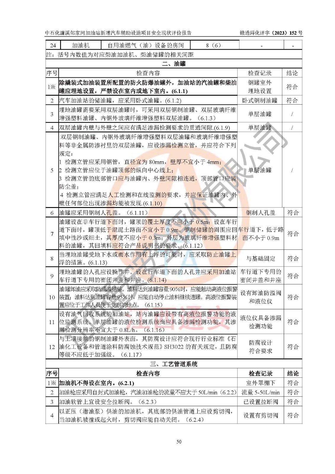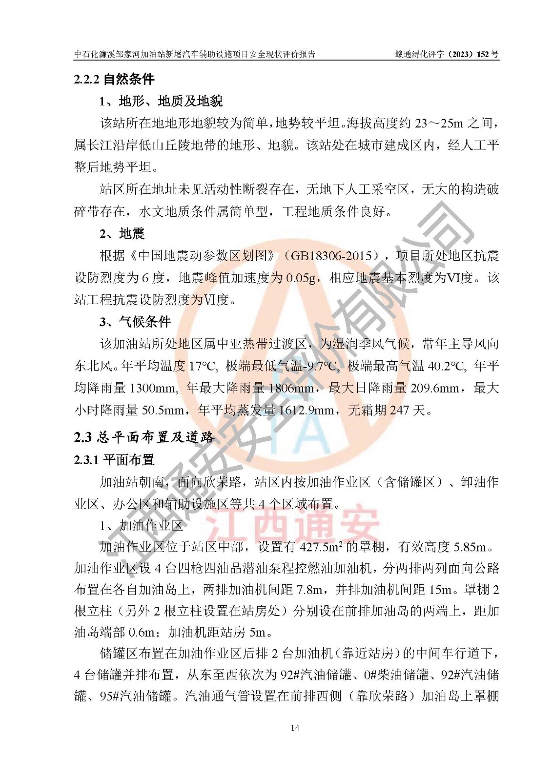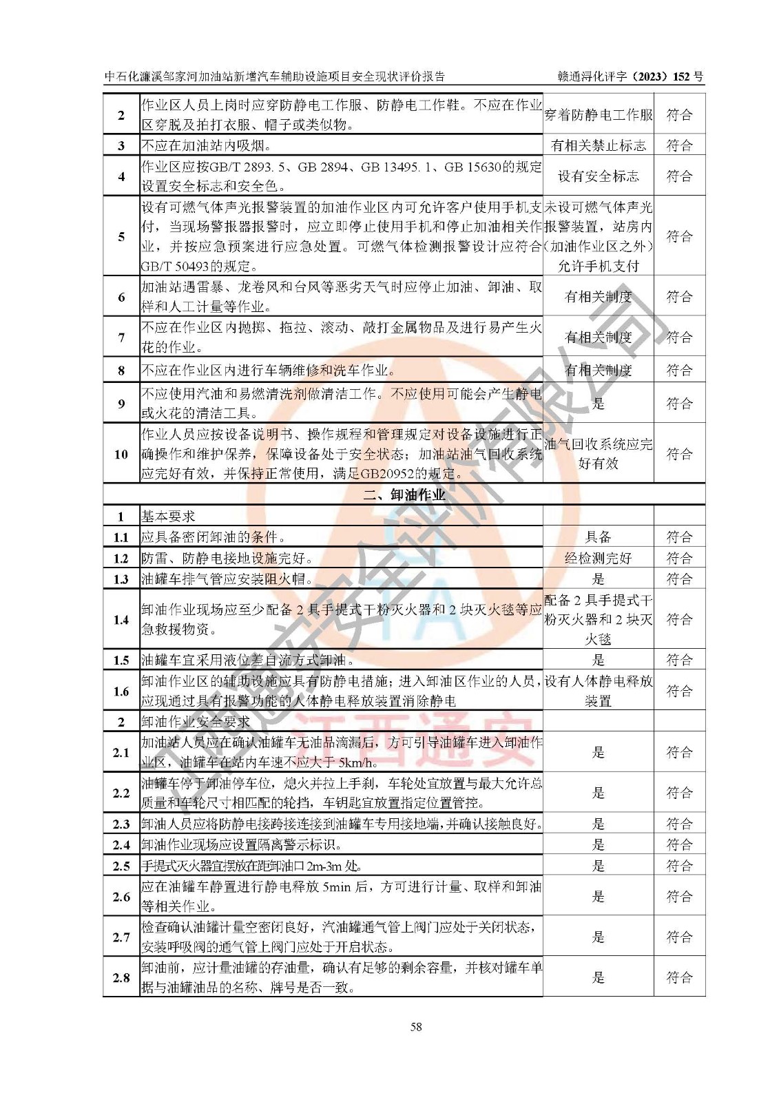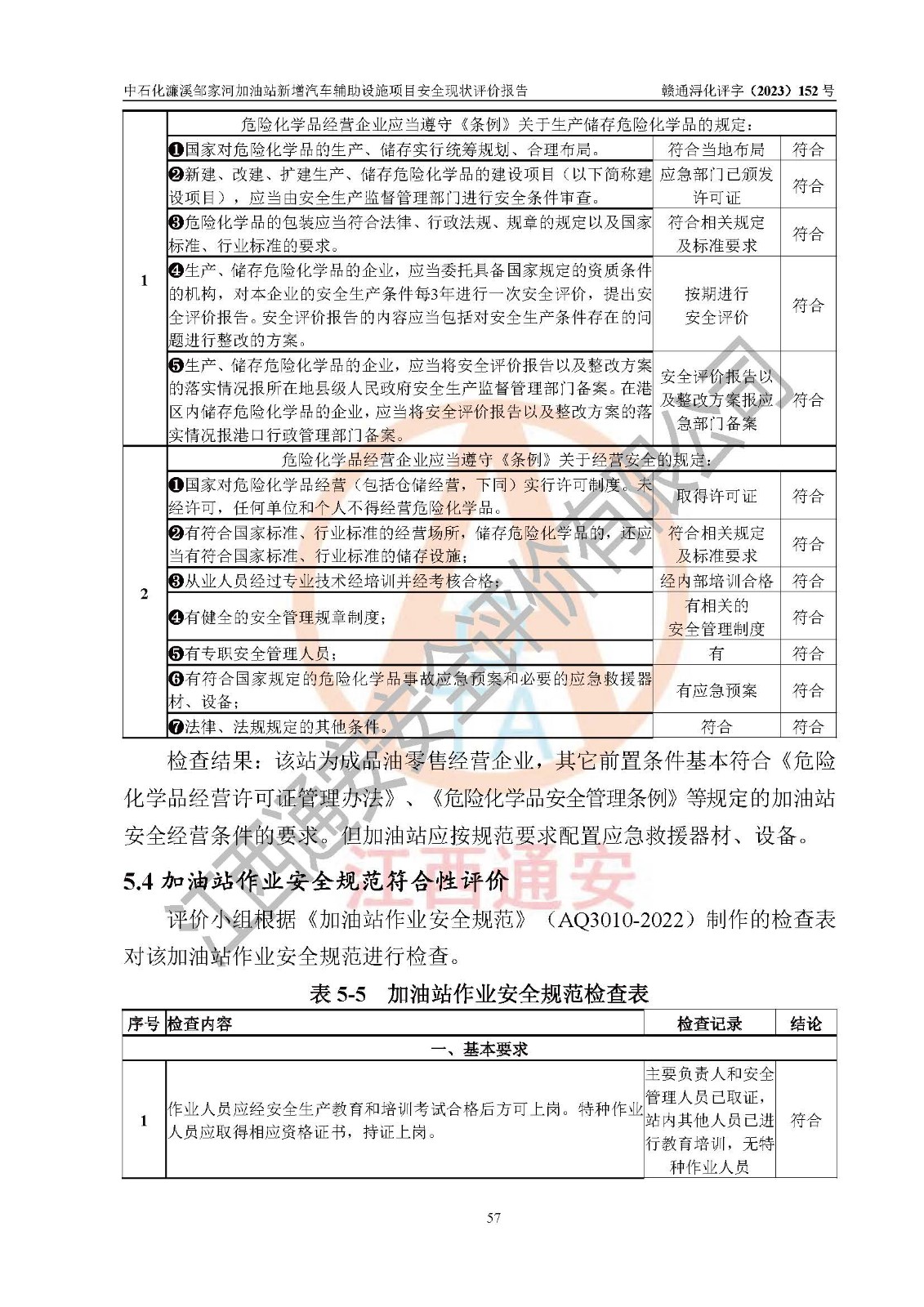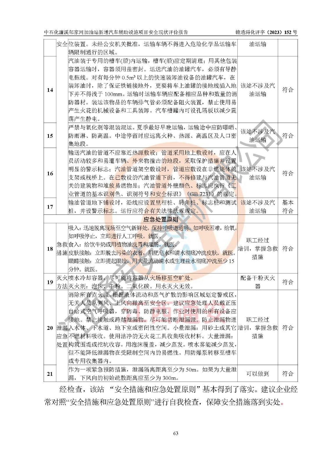 評價結(jié)論 | 中國石化銷售股份有限公司江西九江濂溪石油分公司鄒家河加油站新增汽車輔助設(shè)施項目涉及的安全條件、安全經(jīng)營條件、安全生產(chǎn)管理符合《危險化學(xué)品經(jīng)營許可證管理辦法》、《汽車加油加氣加氫站技術(shù)標(biāo)準(zhǔn)》等**有關(guān)法規(guī)、標(biāo)準(zhǔn)、規(guī)范要求,能滿足危險化學(xué)品經(jīng)營安全條件。 | |||