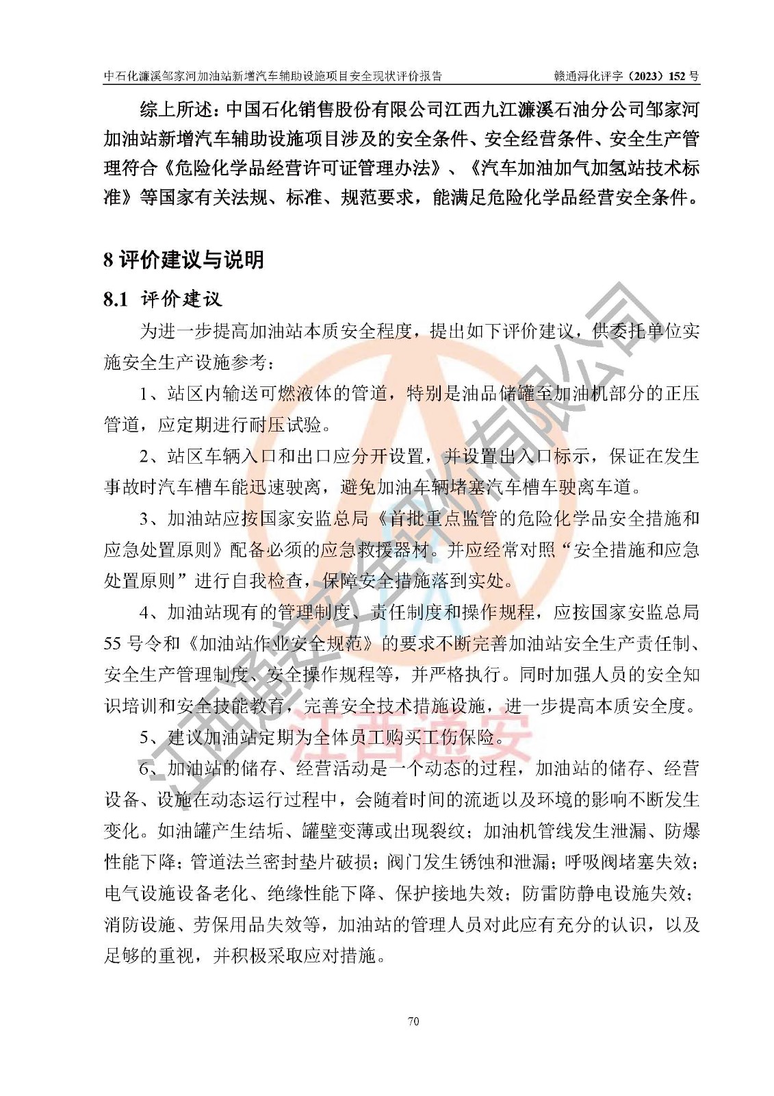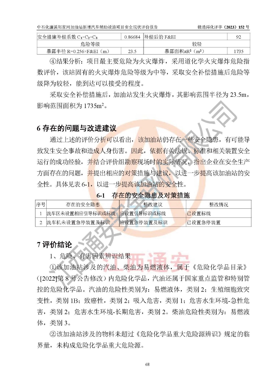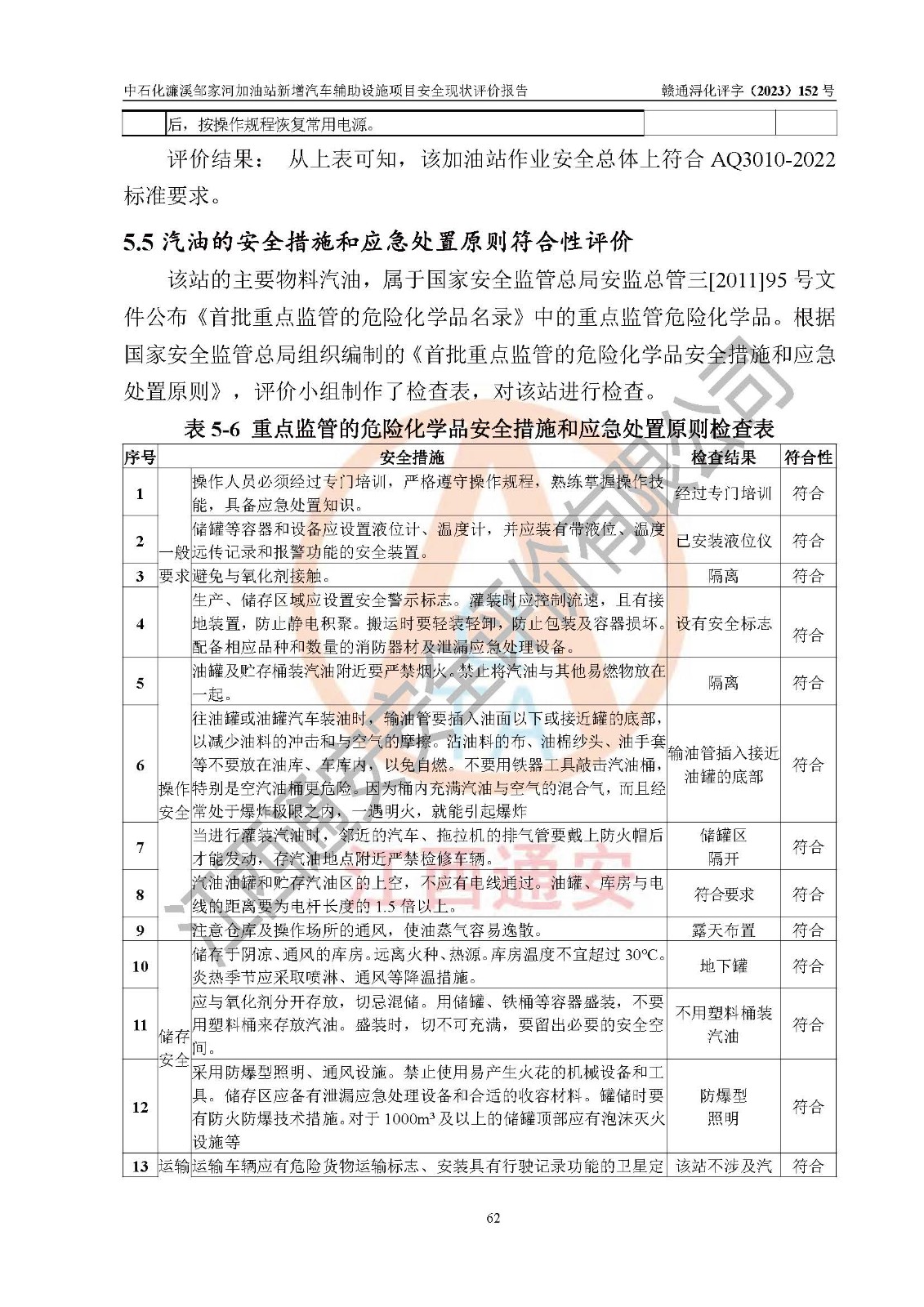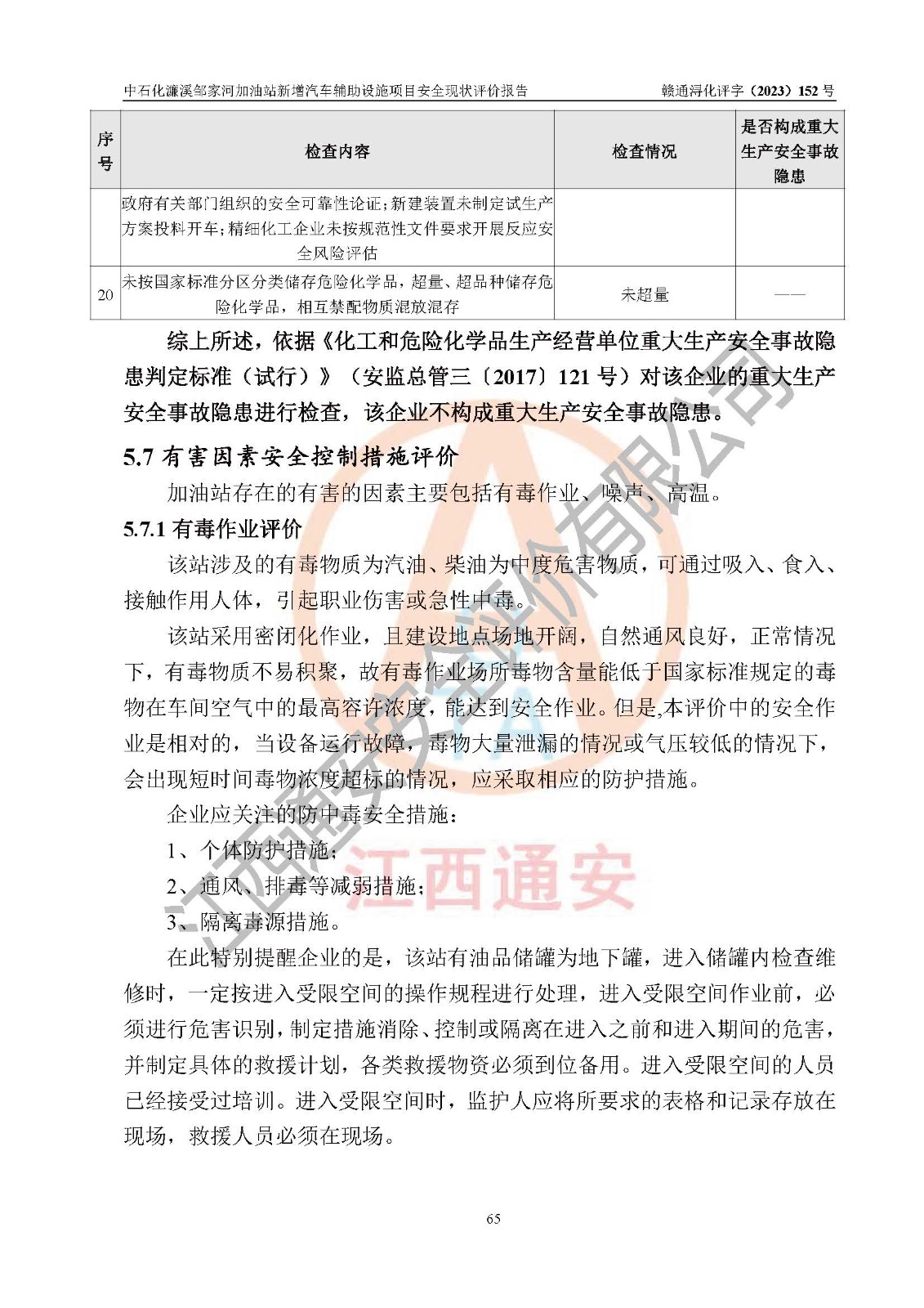 評價結(jié)論 | 中國石化銷售股份有限公司江西九江濂溪石油分公司鄒家河加油站新增汽車輔助設(shè)施項目涉及的安全條件、安全經(jīng)營條件、安全生產(chǎn)管理符合《危險化學(xué)品經(jīng)營許可證管理辦法》、《汽車加油加氣加氫站技術(shù)標(biāo)準(zhǔn)》等**有關(guān)法規(guī)、標(biāo)準(zhǔn)、規(guī)范要求,能滿足危險化學(xué)品經(jīng)營安全條件。 | |||
