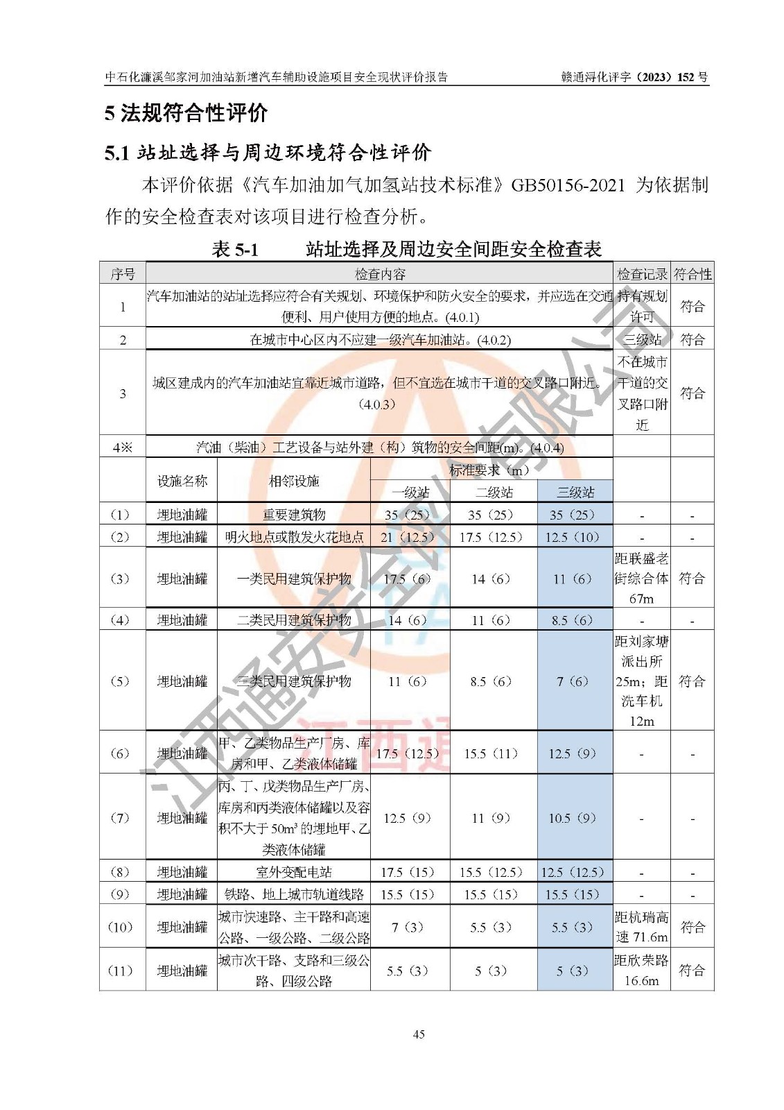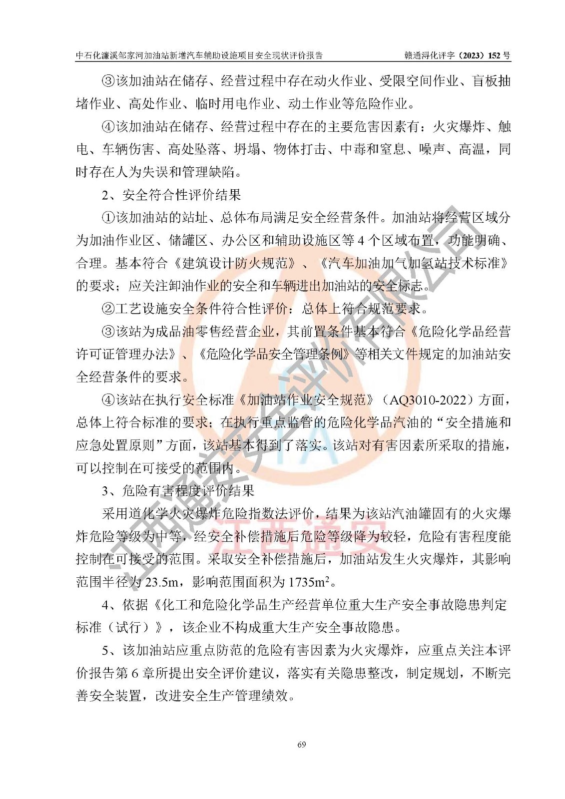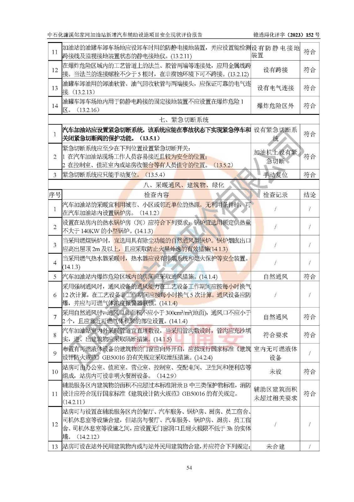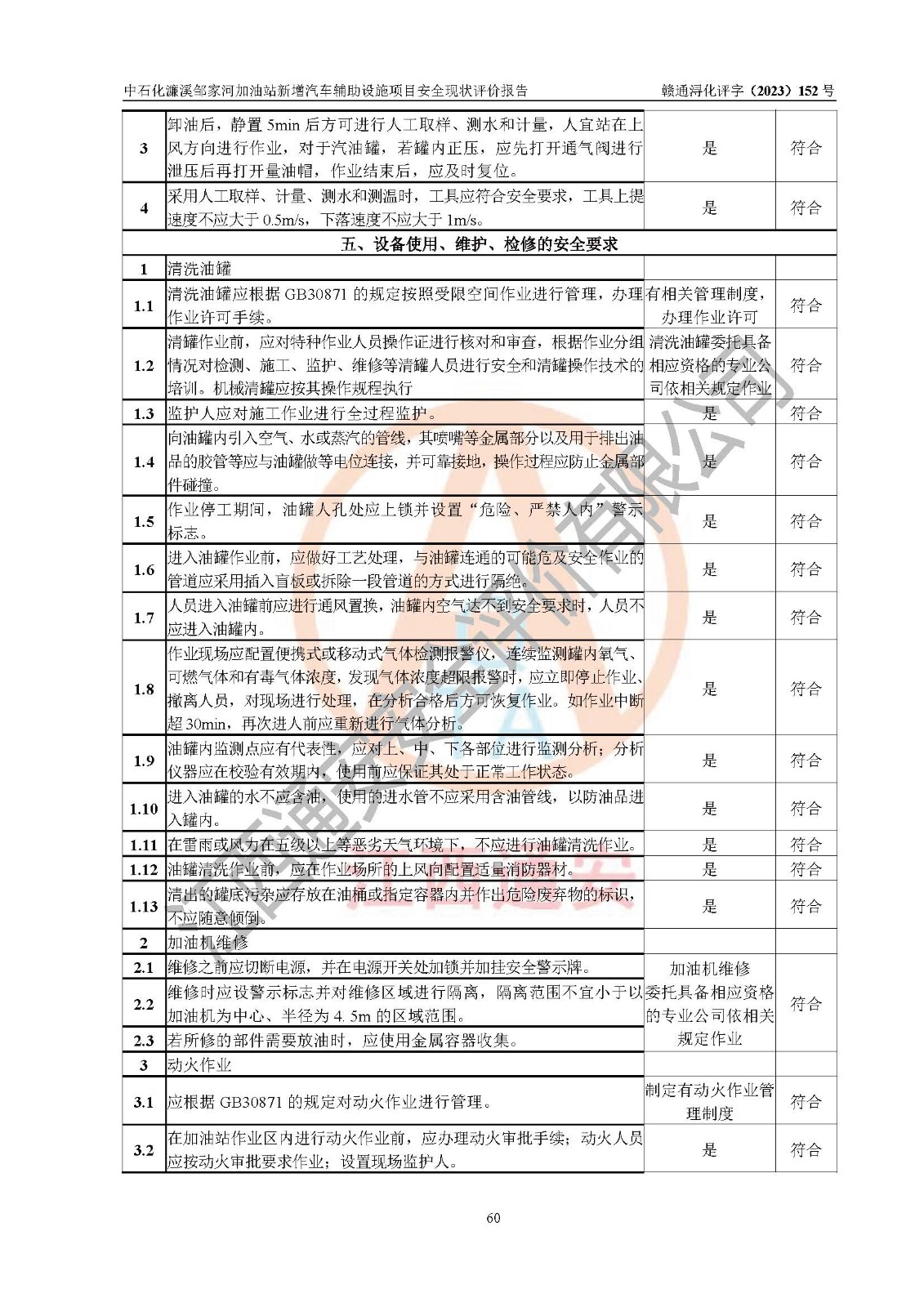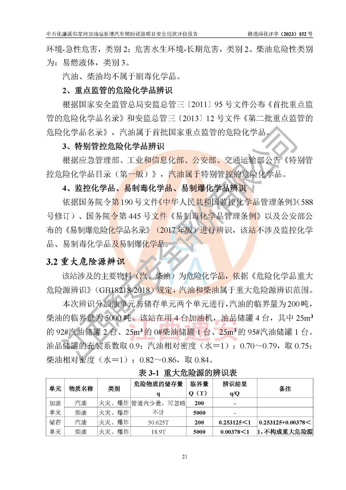 評價結(jié)論 | 中國石化銷售股份有限公司江西九江濂溪石油分公司鄒家河加油站新增汽車輔助設(shè)施項目涉及的安全條件、安全經(jīng)營條件、安全生產(chǎn)管理符合《危險化學(xué)品經(jīng)營許可證管理辦法》、《汽車加油加氣加氫站技術(shù)標(biāo)準(zhǔn)》等**有關(guān)法規(guī)、標(biāo)準(zhǔn)、規(guī)范要求,能滿足危險化學(xué)品經(jīng)營安全條件。 | |||