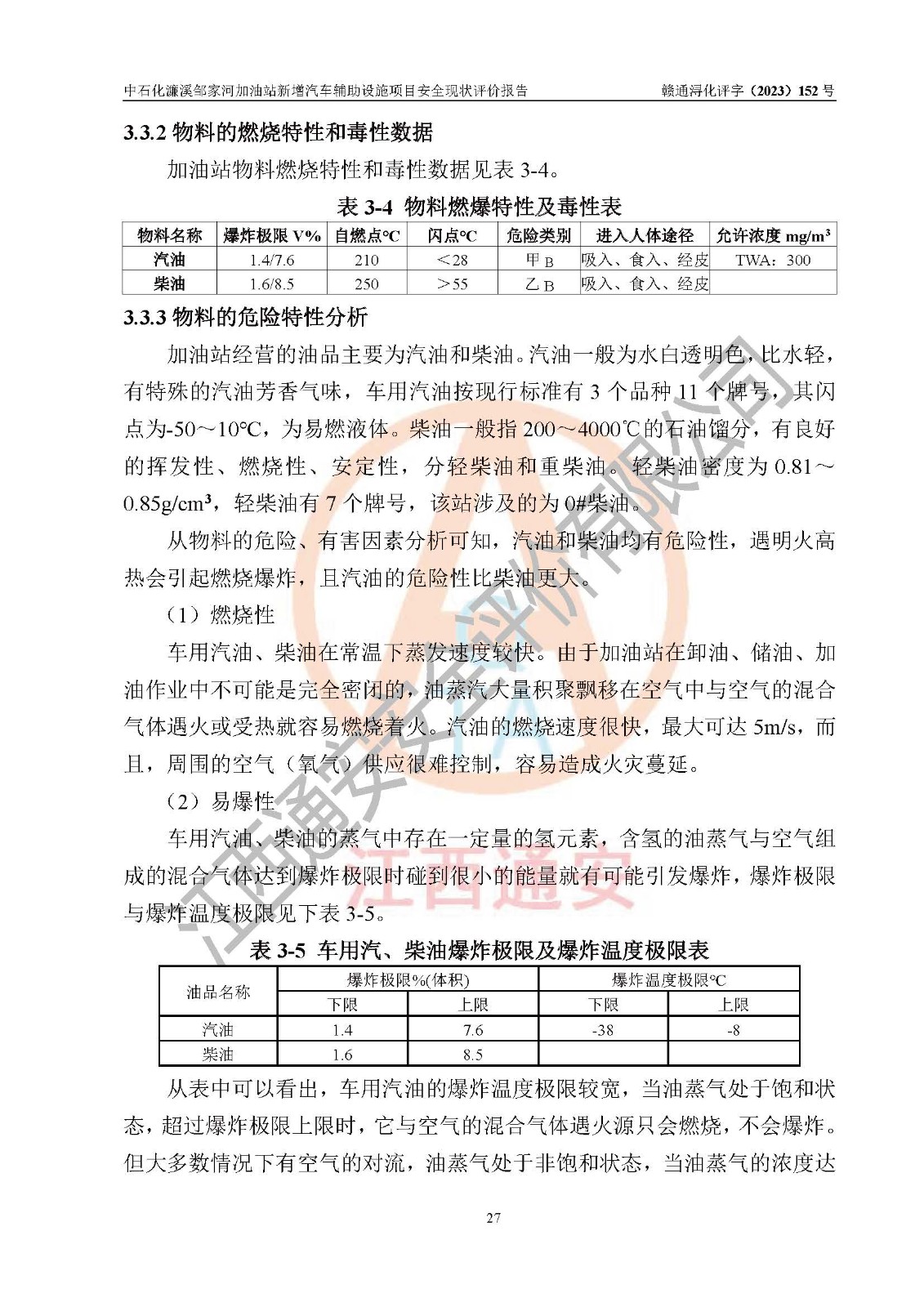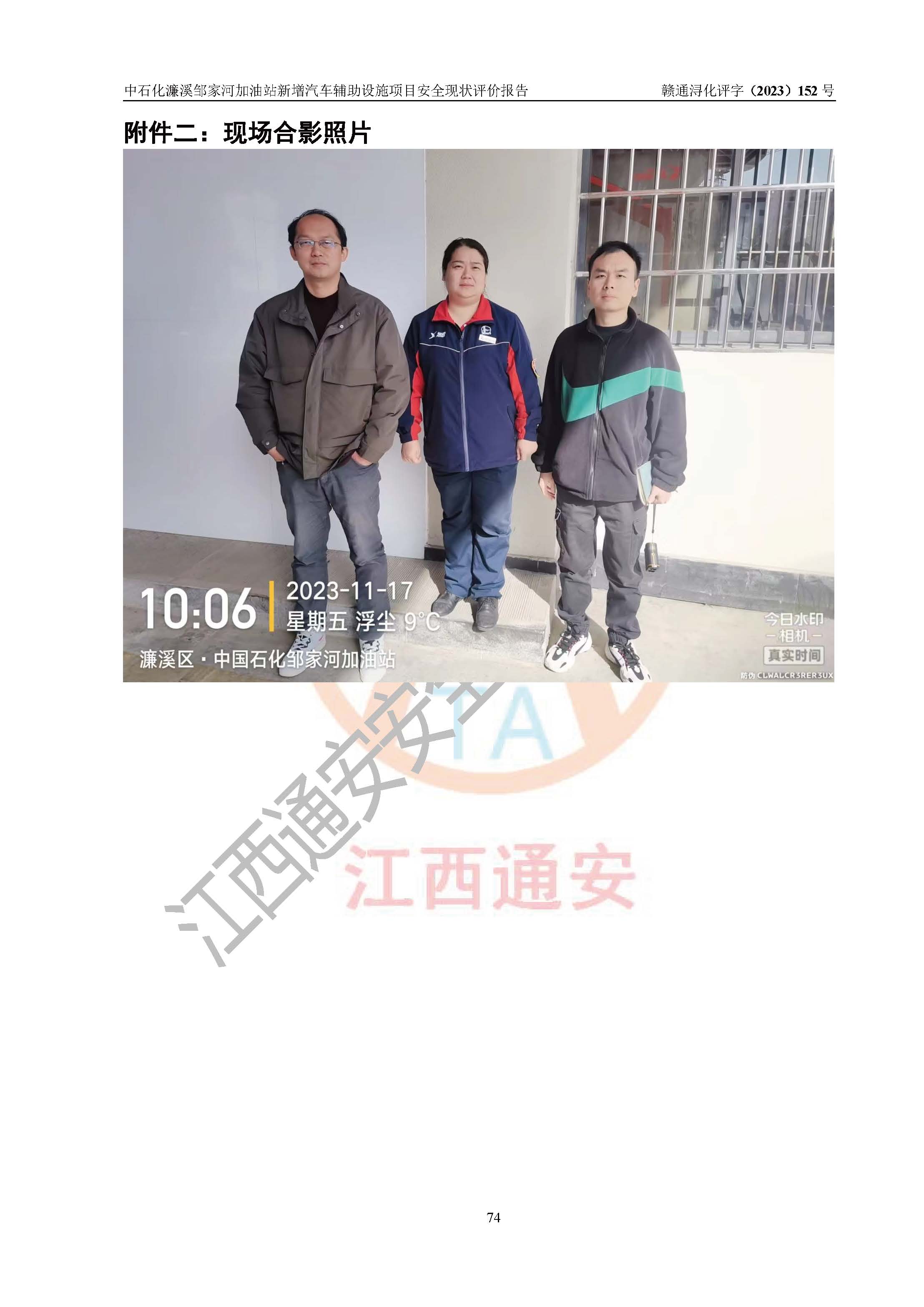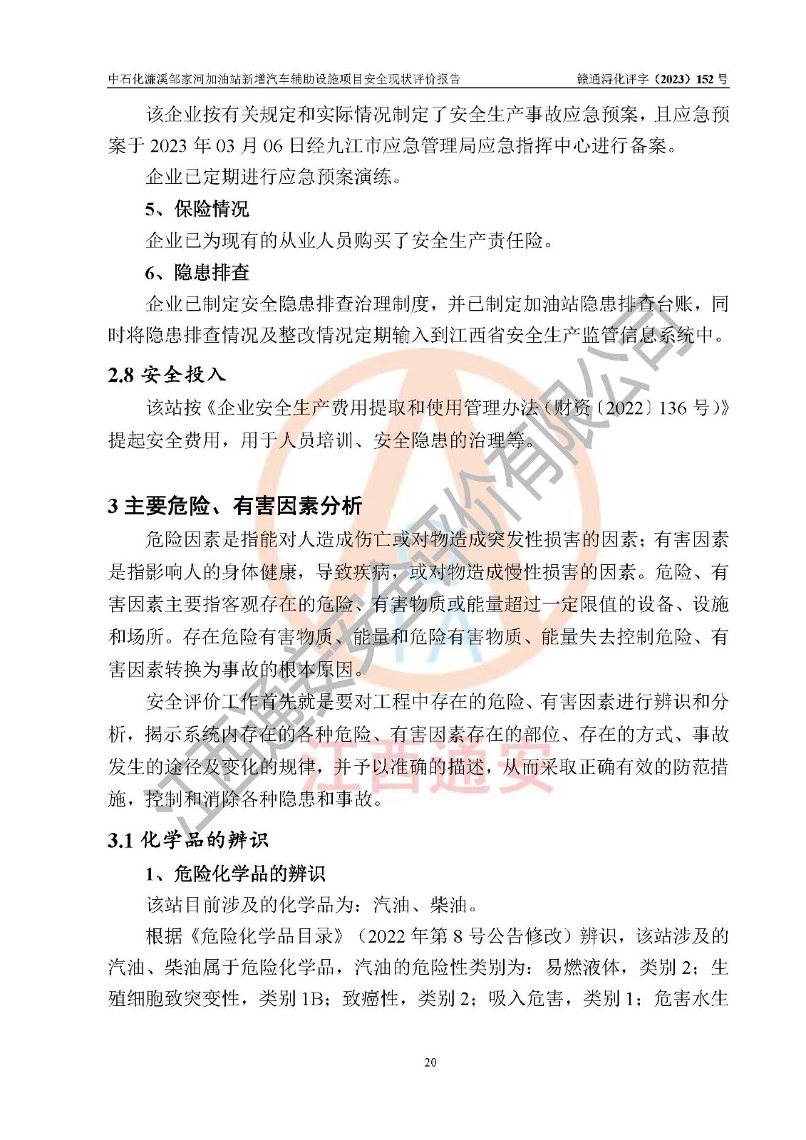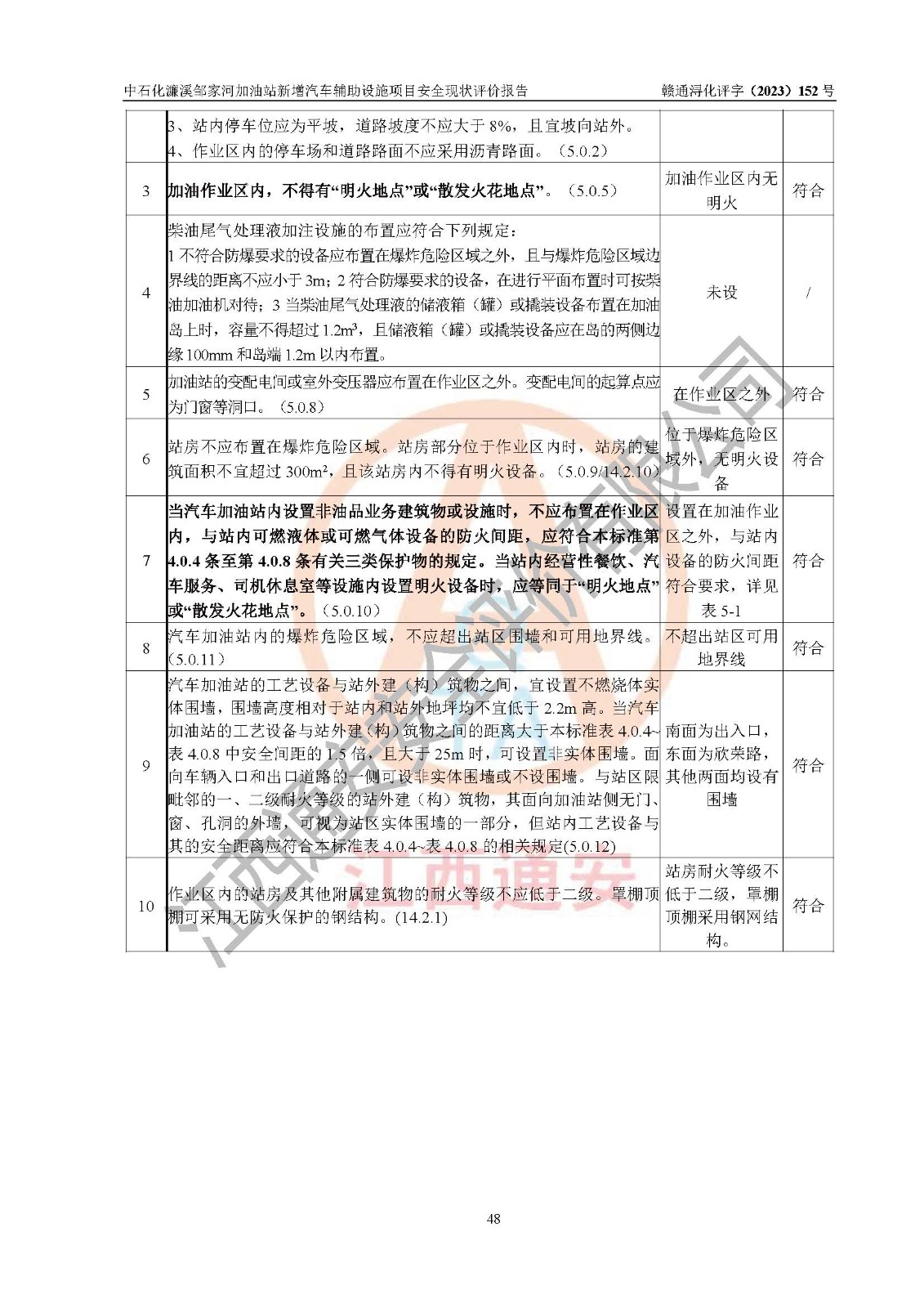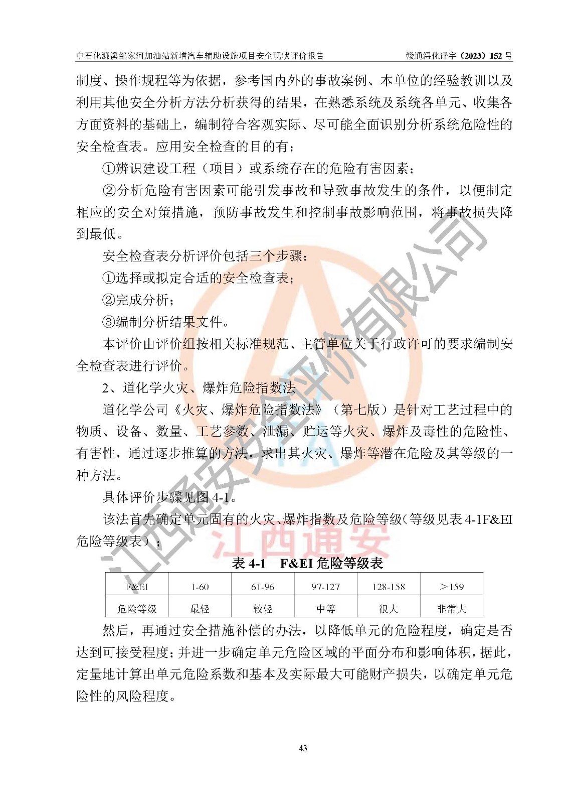 評價結(jié)論 | 中國石化銷售股份有限公司江西九江濂溪石油分公司鄒家河加油站新增汽車輔助設(shè)施項目涉及的安全條件、安全經(jīng)營條件、安全生產(chǎn)管理符合《危險化學(xué)品經(jīng)營許可證管理辦法》、《汽車加油加氣加氫站技術(shù)標(biāo)準(zhǔn)》等**有關(guān)法規(guī)、標(biāo)準(zhǔn)、規(guī)范要求,能滿足危險化學(xué)品經(jīng)營安全條件。 | |||