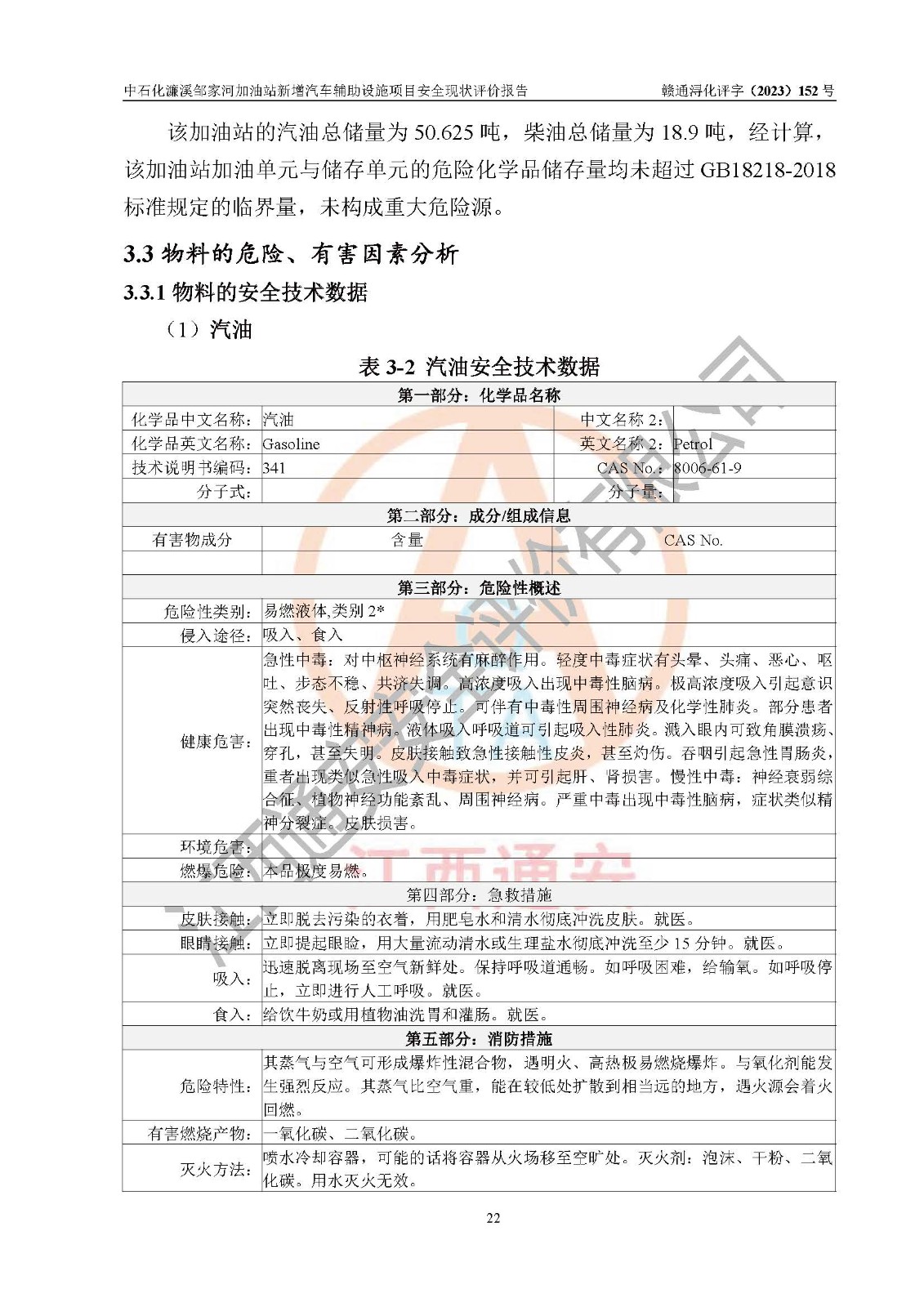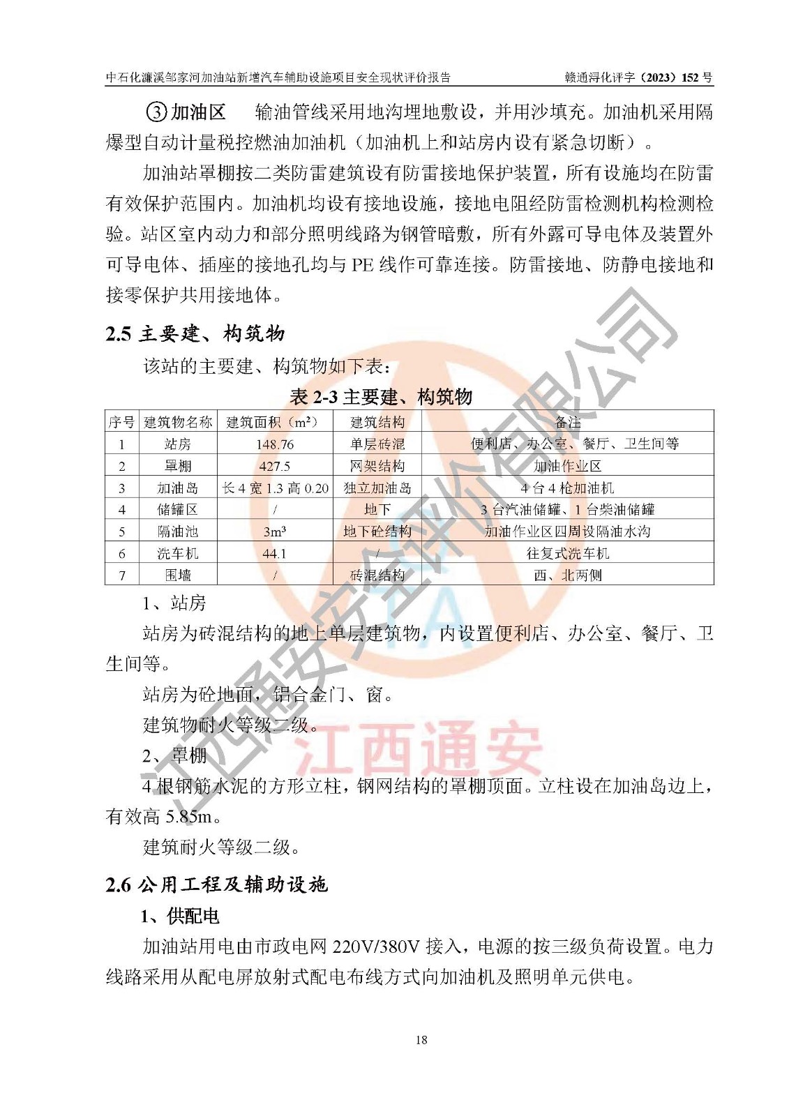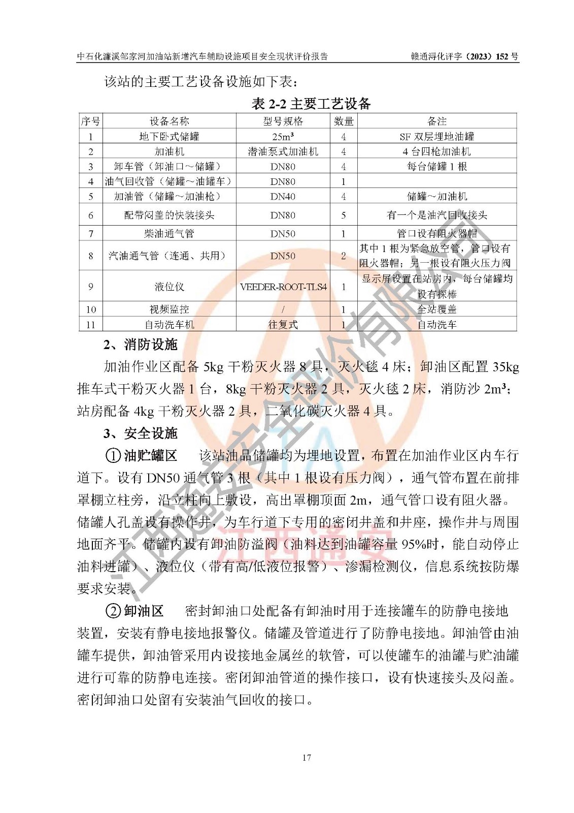 項目簡介 | 中國石化銷售股份有限公司江西九江濂溪石油分公司鄒家河加油站是一家專門從事成品油零售經(jīng)營的有限公司分公司(外商投資企業(yè)分公司),經(jīng)營場所位于江西省九江市濂溪區(qū)十里鄉(xiāng)十里村昌九路口。現(xiàn)有從業(yè)人員5名,其中安全管理人員1人,加油站負責(zé)人杜建國。 該加油站占地面積約1640.6m2,站區(qū)內(nèi)設(shè)置有4臺4槍程控燃油加油機及配套的工藝管線,設(shè)置單層儲罐4臺(設(shè)有防滲罐池),其中25m3的92#汽油儲罐2臺、25m3的95#汽油儲罐1臺、25m3的0#柴油儲罐1臺,油品儲罐總?cè)莘e為100m3(折算汽油總量87.5m3),按現(xiàn)行《汽車加油加氣加氫站技術(shù)標(biāo)準(zhǔn)》對加油站的等級劃分原則,屬三級加油站。 該站由九江市行政審批局換發(fā)《危險化學(xué)品經(jīng)營許可證》(證號:贛九行審經(jīng)(甲)字[2022]000122號),**期限2022年08月26日至2025年08月25日。 該站因市場經(jīng)營需求,在加油站東側(cè)(加油站入口處)新增1臺自動洗車裝置,總平面布置發(fā)生變動,為保障加油站的安全經(jīng)營條件,故對加油站經(jīng)營成品油安全條件現(xiàn)狀進行重新評價。 | |||
