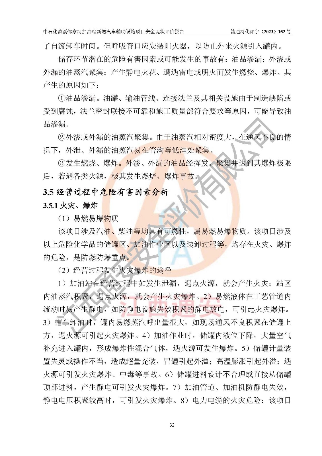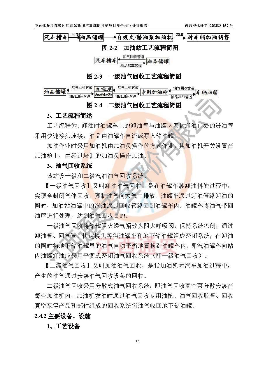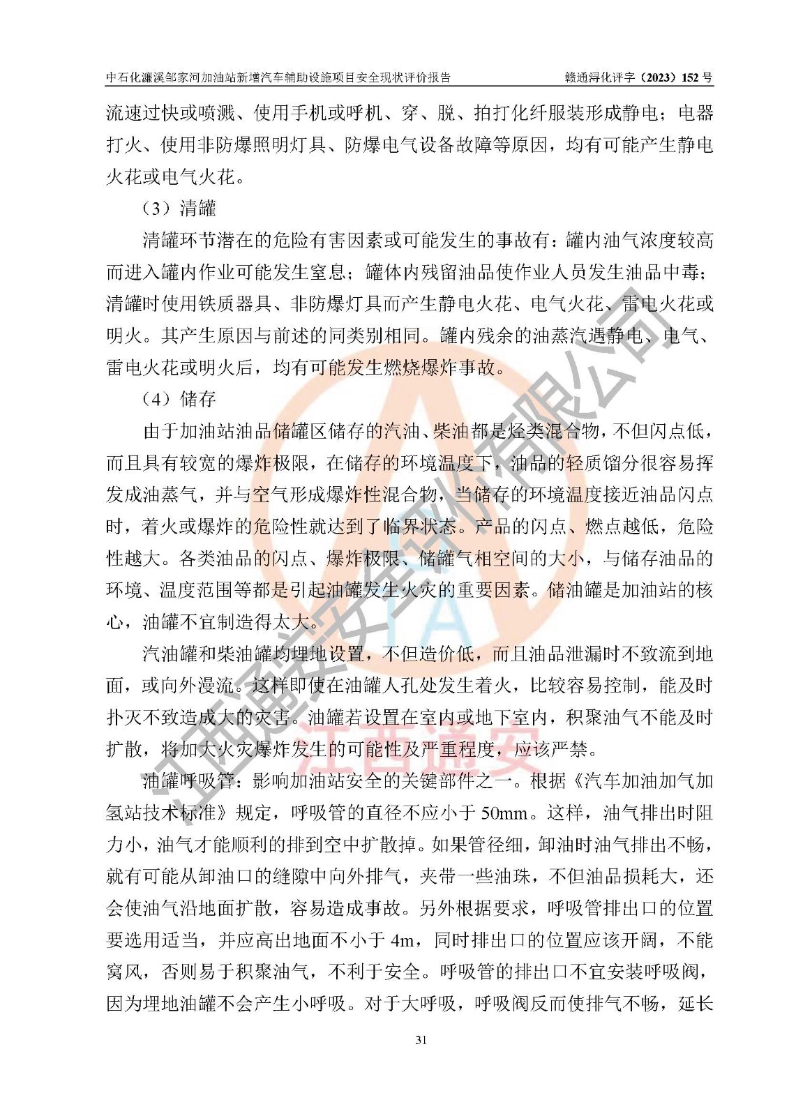 項目簡介 | 中國石化銷售股份有限公司江西九江濂溪石油分公司鄒家河加油站是一家專門從事成品油零售經(jīng)營的有限公司分公司(外商投資企業(yè)分公司),經(jīng)營場所位于江西省九江市濂溪區(qū)十里鄉(xiāng)十里村昌九路口。現(xiàn)有從業(yè)人員5名,其中安全管理人員1人,加油站負責(zé)人杜建國。 該加油站占地面積約1640.6m2,站區(qū)內(nèi)設(shè)置有4臺4槍程控燃油加油機及配套的工藝管線,設(shè)置單層儲罐4臺(設(shè)有防滲罐池),其中25m3的92#汽油儲罐2臺、25m3的95#汽油儲罐1臺、25m3的0#柴油儲罐1臺,油品儲罐總?cè)莘e為100m3(折算汽油總量87.5m3),按現(xiàn)行《汽車加油加氣加氫站技術(shù)標(biāo)準(zhǔn)》對加油站的等級劃分原則,屬三級加油站。 該站由九江市行政審批局換發(fā)《危險化學(xué)品經(jīng)營許可證》(證號:贛九行審經(jīng)(甲)字[2022]000122號),**期限2022年08月26日至2025年08月25日。 該站因市場經(jīng)營需求,在加油站東側(cè)(加油站入口處)新增1臺自動洗車裝置,總平面布置發(fā)生變動,為保障加油站的安全經(jīng)營條件,故對加油站經(jīng)營成品油安全條件現(xiàn)狀進行重新評價。 | |||