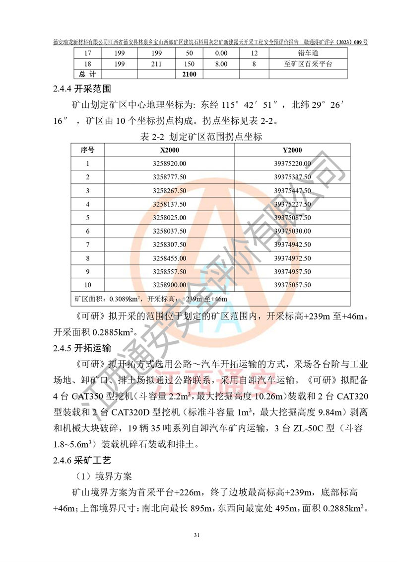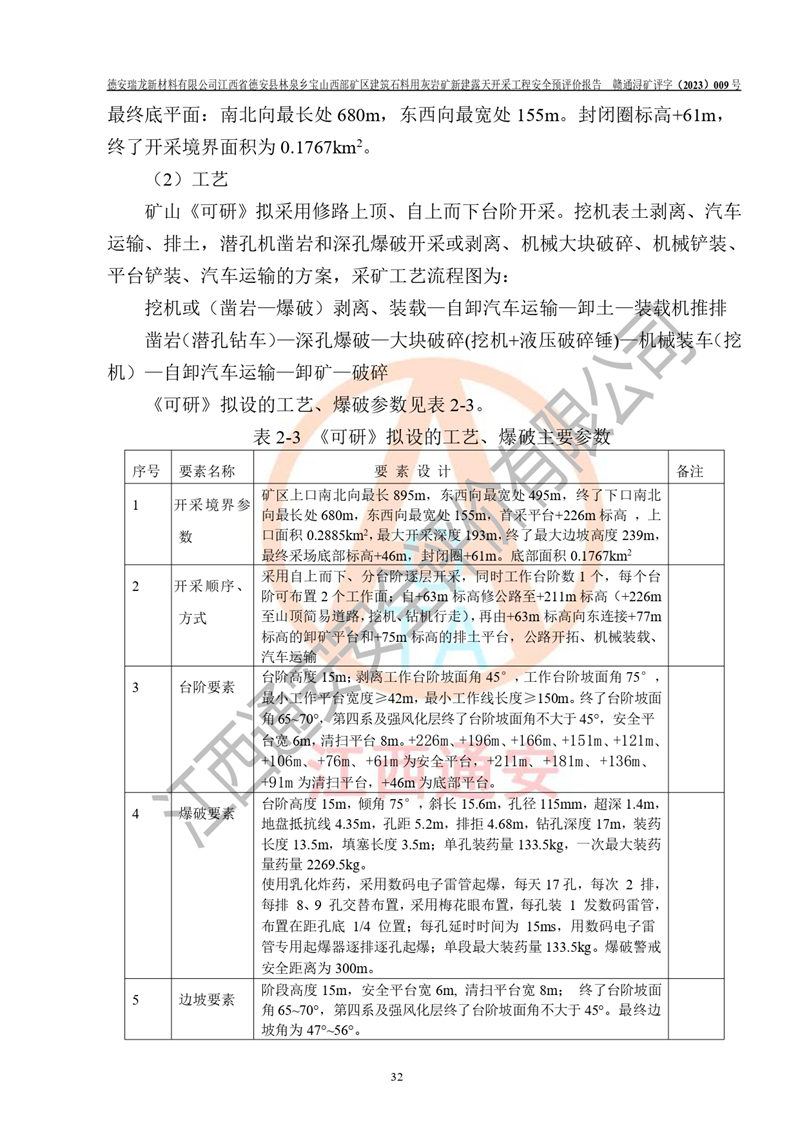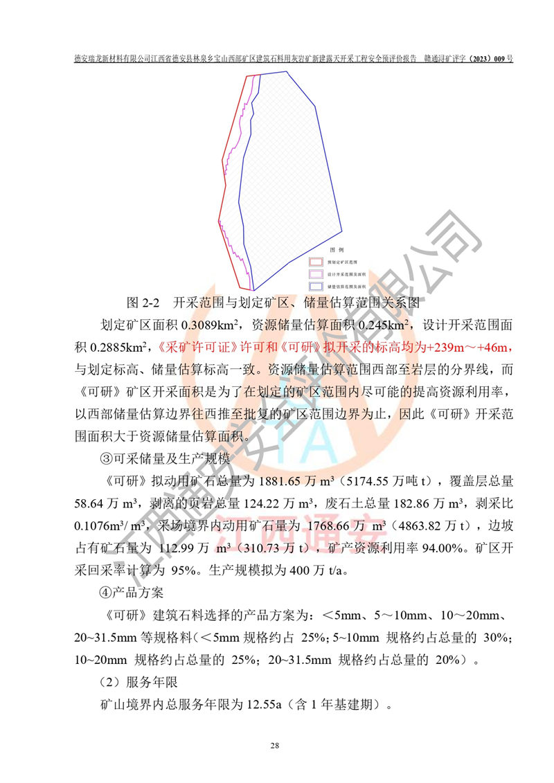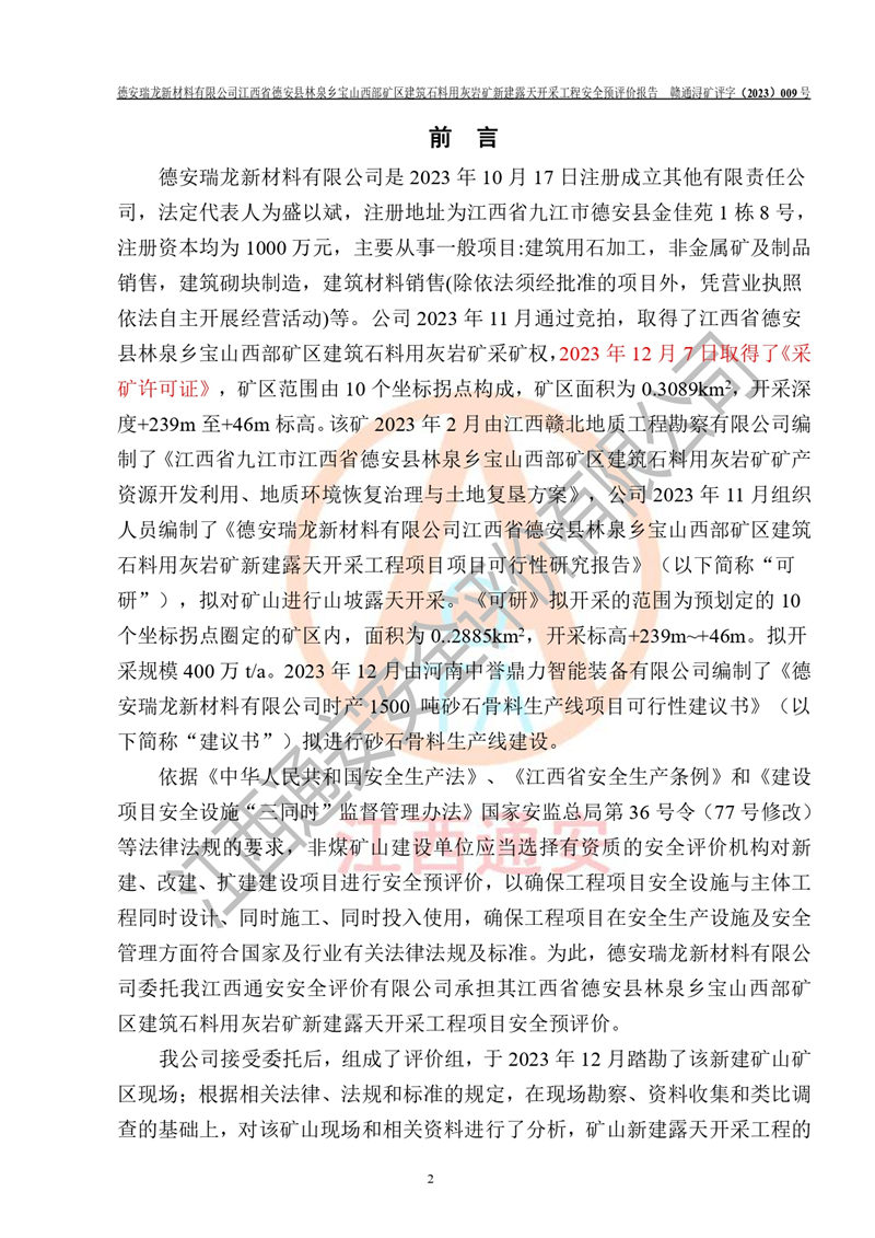 項目簡介 | 德安瑞龍新材料有限公司是2023年10月17日注冊成立其他有限責任公司,法定**人為盛以斌,注冊地址為江西省九江市德安縣金佳苑1棟8號,注冊資本均為1000萬元,主要從事一般項目:建筑用石加工,非金屬礦及制品銷售,建筑砌塊制造,建筑材料銷售(除依法須經(jīng)批準的項目外,憑營業(yè)執(zhí)照依法自主開展經(jīng)營活動)等。公司2023年11月通過競拍,取得了江西省德安縣林泉鄉(xiāng)寶山西部礦區(qū)建筑石料用灰?guī)r礦采礦權(quán),2023年12月7日取得了《采礦許可證》,礦區(qū)范圍由10個坐標拐點構(gòu)成,礦區(qū)面積為0.3089km2,開采深度+239m至+46m標高。該礦2023年2月由江西贛北地質(zhì)工程勘察有限公司編制了《江西省九江市江西省德安縣林泉鄉(xiāng)寶山西部礦區(qū)建筑石料用灰?guī)r礦礦產(chǎn)資源開發(fā)利用、地質(zhì)環(huán)境恢復治理與土地復墾方案》,公司2023年11月組織人員編制了《德安瑞龍新材料有限公司江西省德安縣林泉鄉(xiāng)寶山西部礦區(qū)建筑石料用灰?guī)r礦新建露天開采工程項目項目可行性研究報告》(以下簡稱“可研”),擬對礦山進行山坡露天開采?!犊裳小窋M開采的范圍為預劃定的10個坐標拐點圈定的礦區(qū)內(nèi),面積為0..2885km2,開采標高+239m~+46m。擬開采規(guī)模400萬t/a。2023年12月由河南中譽鼎力智能裝備有限公司編制了《德安瑞龍新材料有限公司時產(chǎn)1500 噸砂石骨料生產(chǎn)線項目可行性建議書》(以下簡稱“建議書”)擬進行砂石骨料生產(chǎn)線建設 | |||||