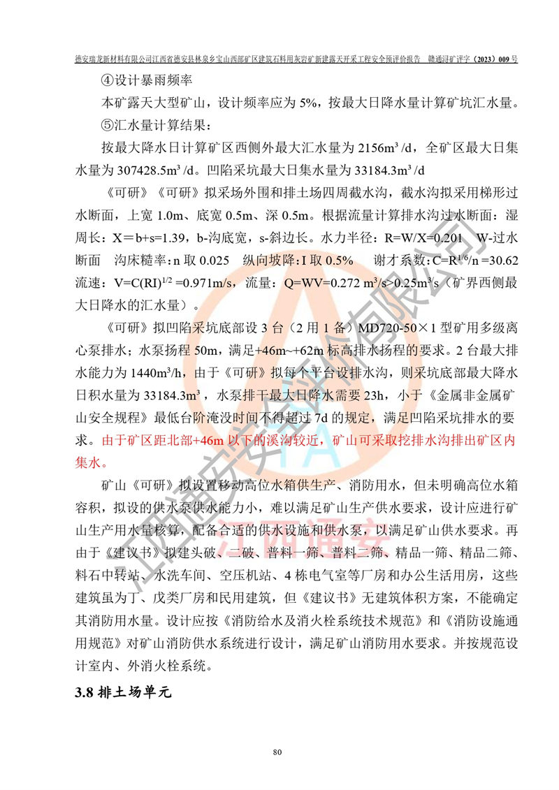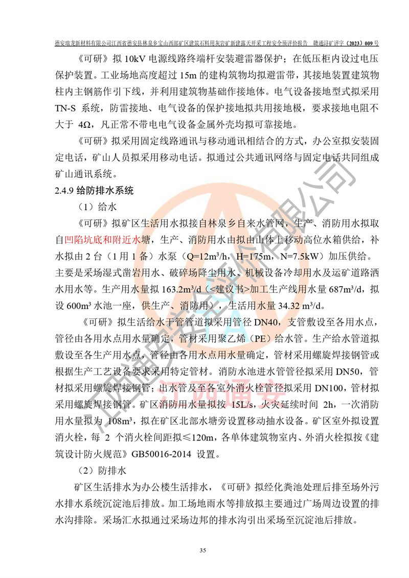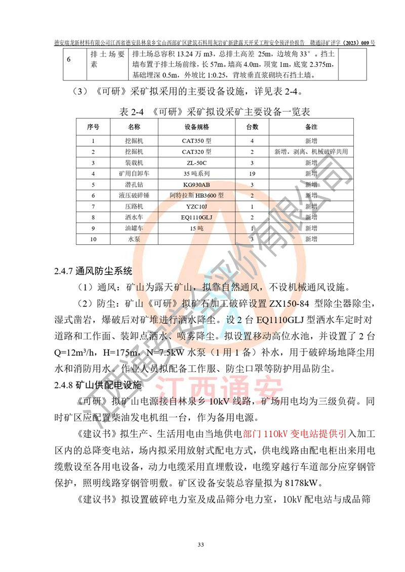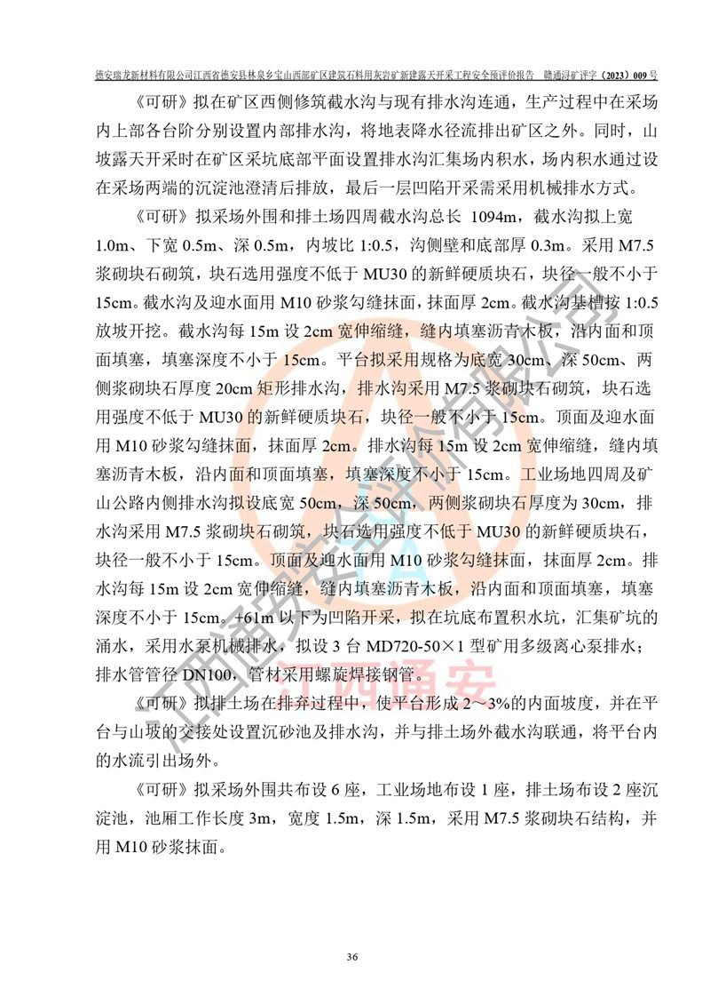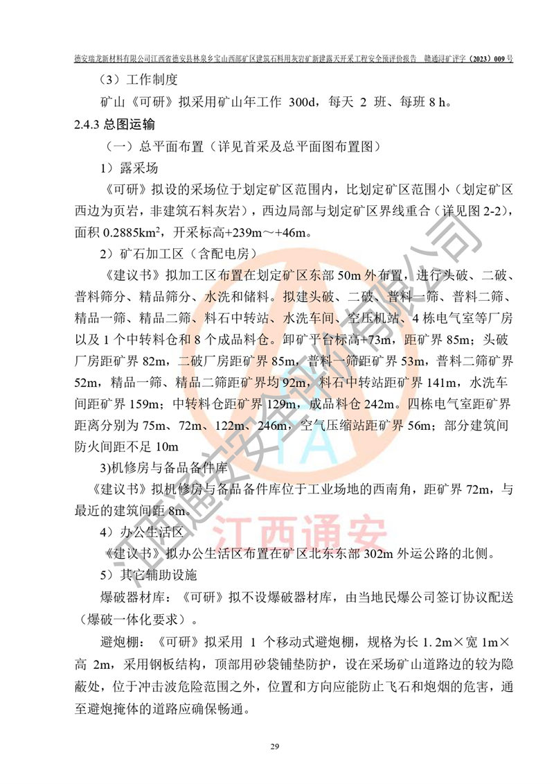 項目簡介 | 德安瑞龍新材料有限公司是2023年10月17日注冊成立其他有限責任公司,法定**人為盛以斌,注冊地址為江西省九江市德安縣金佳苑1棟8號,注冊資本均為1000萬元,主要從事一般項目:建筑用石加工,非金屬礦及制品銷售,建筑砌塊制造,建筑材料銷售(除依法須經(jīng)批準的項目外,憑營業(yè)執(zhí)照依法自主開展經(jīng)營活動)等。公司2023年11月通過競拍,取得了江西省德安縣林泉鄉(xiāng)寶山西部礦區(qū)建筑石料用灰?guī)r礦采礦權(quán),2023年12月7日取得了《采礦許可證》,礦區(qū)范圍由10個坐標拐點構(gòu)成,礦區(qū)面積為0.3089km2,開采深度+239m至+46m標高。該礦2023年2月由江西贛北地質(zhì)工程勘察有限公司編制了《江西省九江市江西省德安縣林泉鄉(xiāng)寶山西部礦區(qū)建筑石料用灰?guī)r礦礦產(chǎn)資源開發(fā)利用、地質(zhì)環(huán)境恢復治理與土地復墾方案》,公司2023年11月組織人員編制了《德安瑞龍新材料有限公司江西省德安縣林泉鄉(xiāng)寶山西部礦區(qū)建筑石料用灰?guī)r礦新建露天開采工程項目項目可行性研究報告》(以下簡稱“可研”),擬對礦山進行山坡露天開采?!犊裳小窋M開采的范圍為預劃定的10個坐標拐點圈定的礦區(qū)內(nèi),面積為0..2885km2,開采標高+239m~+46m。擬開采規(guī)模400萬t/a。2023年12月由河南中譽鼎力智能裝備有限公司編制了《德安瑞龍新材料有限公司時產(chǎn)1500 噸砂石骨料生產(chǎn)線項目可行性建議書》(以下簡稱“建議書”)擬進行砂石骨料生產(chǎn)線建設 | |||||