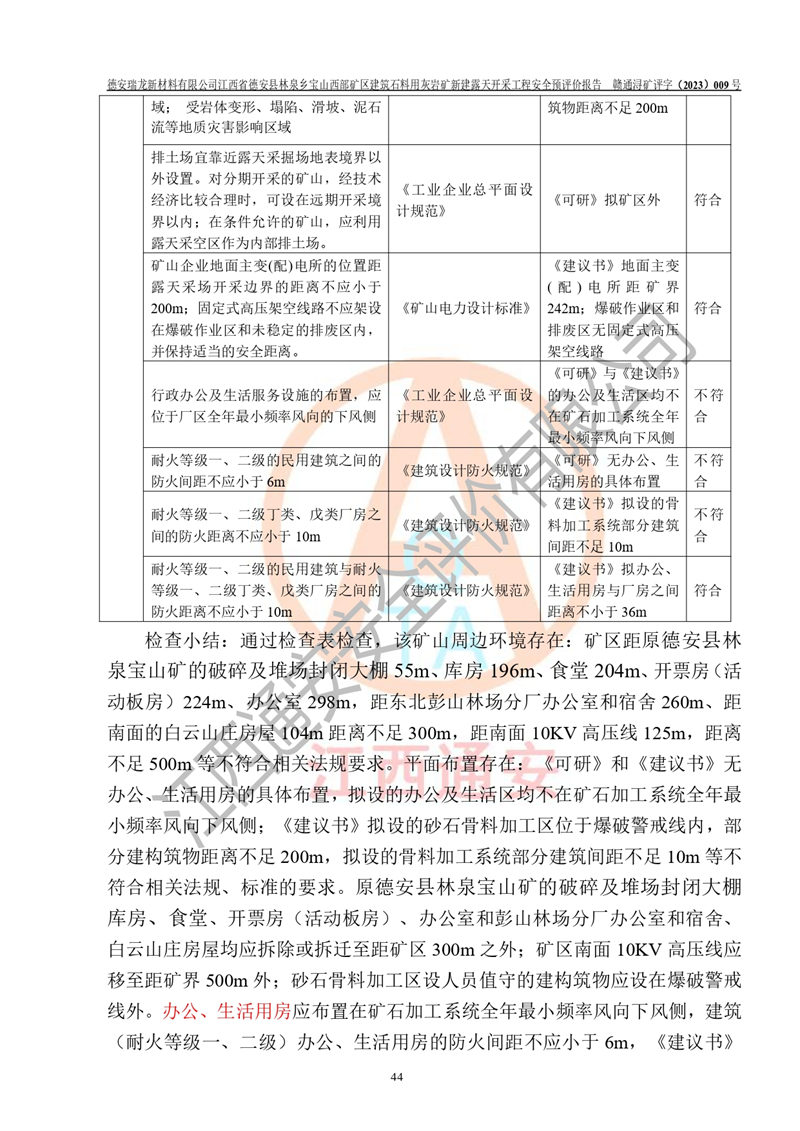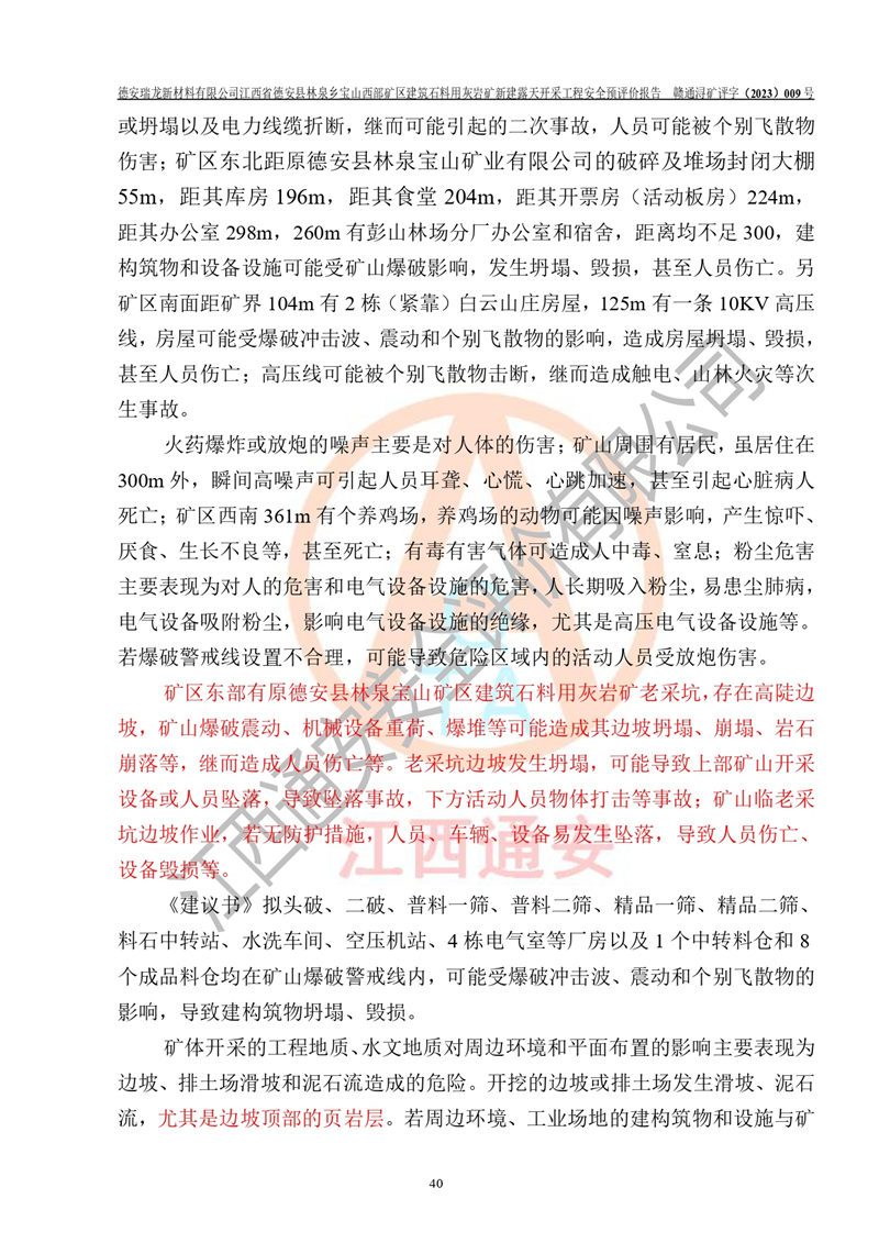 勘察現(xiàn)場發(fā)現(xiàn)的問題及安全對策措施 | 序號問題對策1原德安縣林泉寶山礦的破碎及堆場封閉大棚庫房、食堂、開票房(活動板房)、辦公室,距礦界不足300m拆遷至300m之外2彭山林場分廠辦公室和宿舍距礦界不足300m拆遷至300m之外3白云山莊房屋距礦界不足300m拆遷至300m之外4礦區(qū)南面125m有一條10KV高壓線拆遷至500m之外