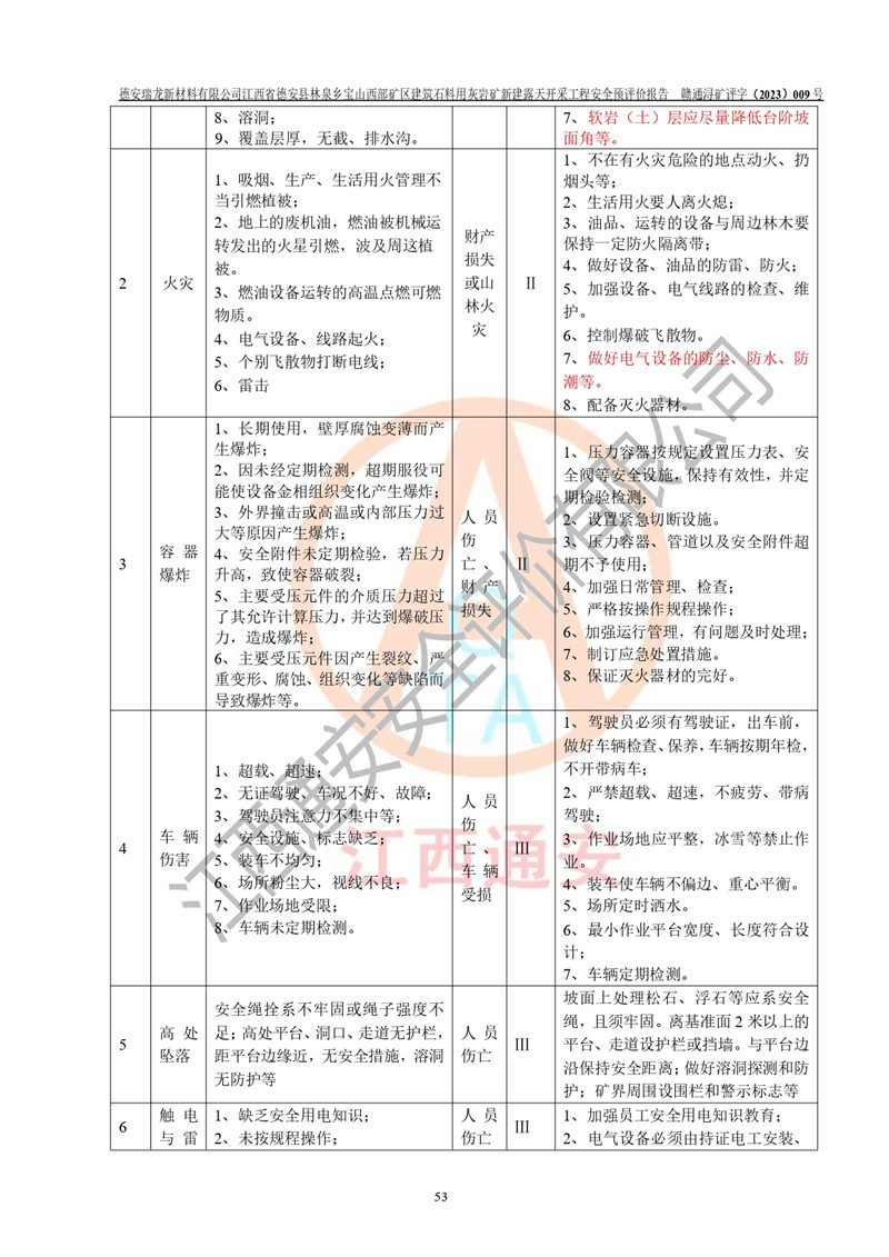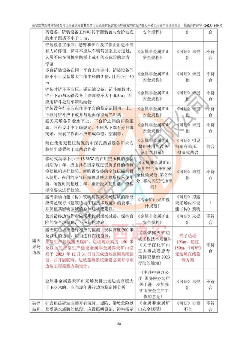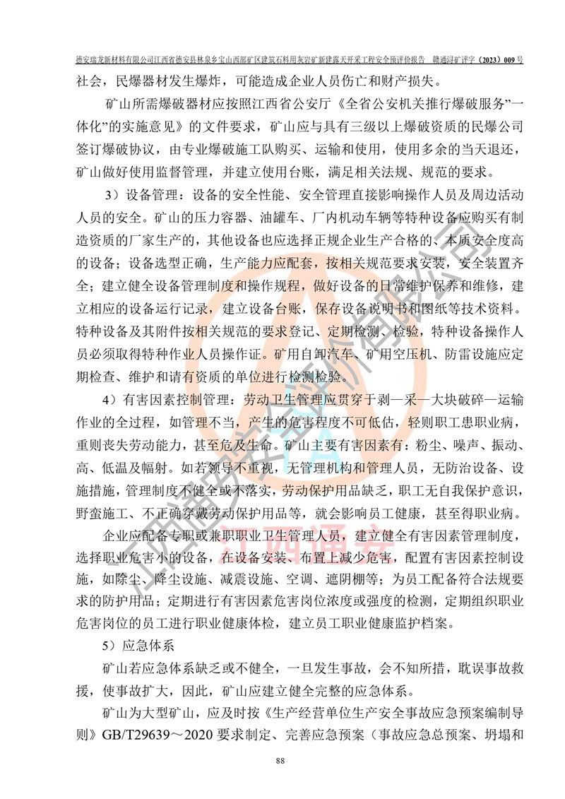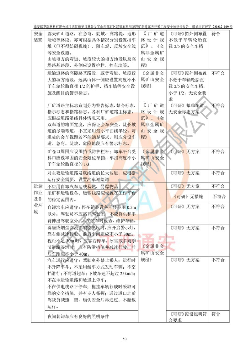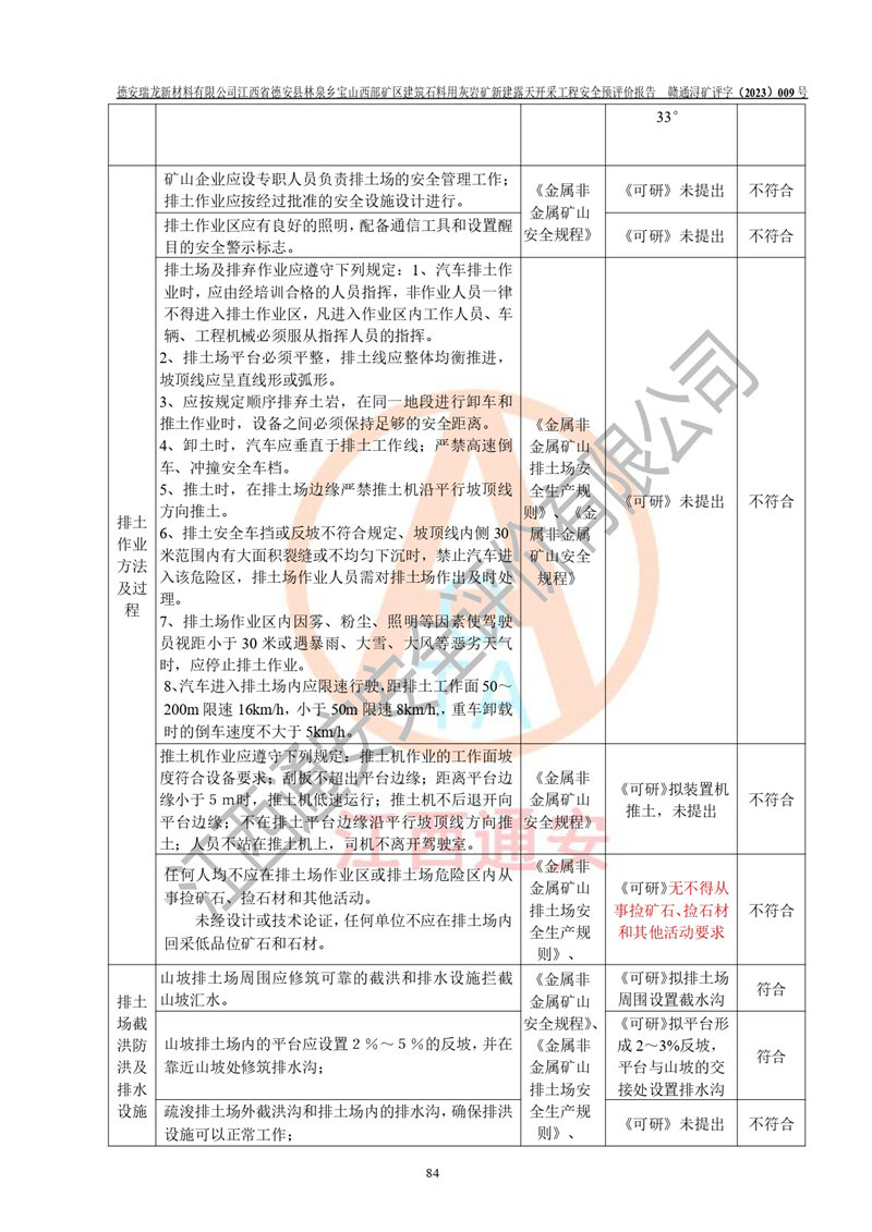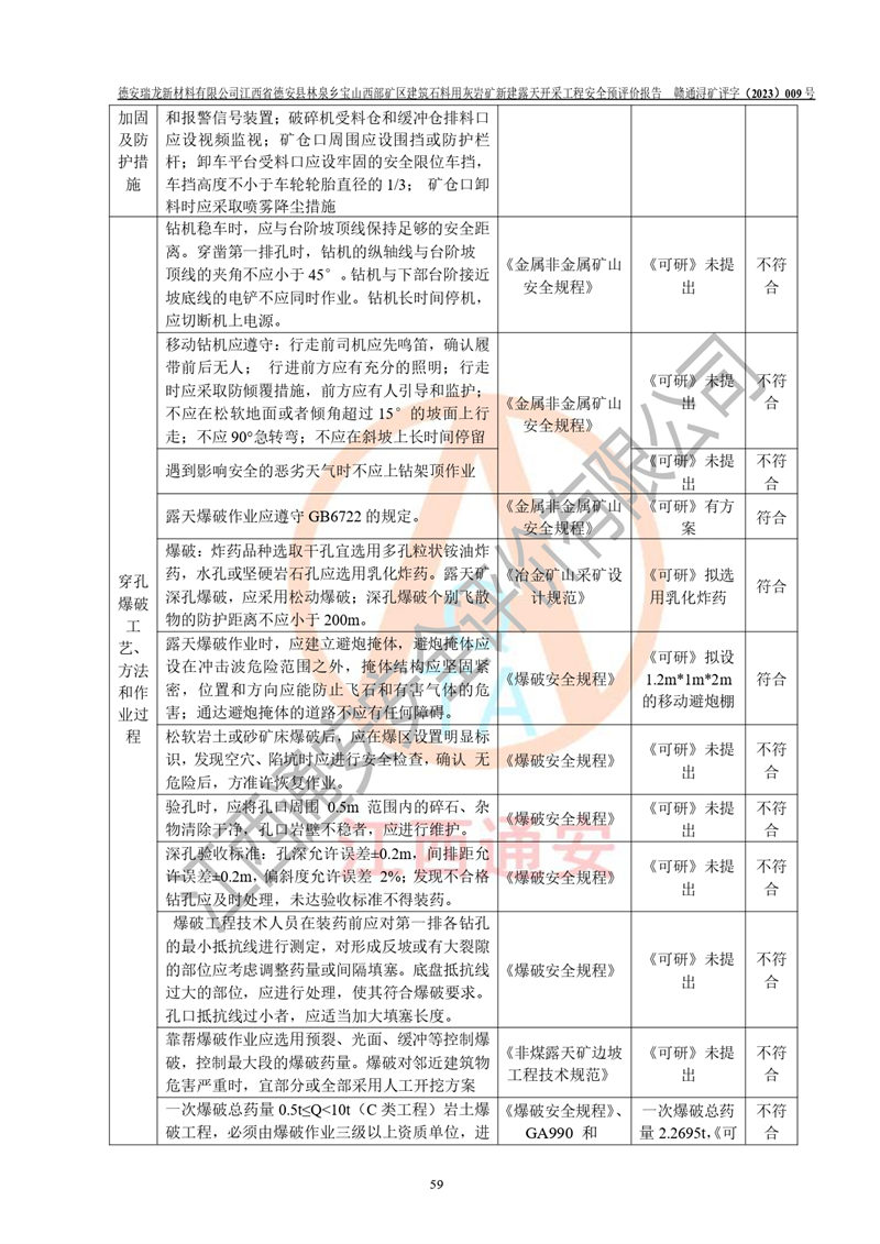 評價結(jié)論 | 總體結(jié)論:德安瑞龍新材料有限公司江西省德安縣林泉鄉(xiāng)寶山西部礦區(qū)建筑石料用灰?guī)r礦新建露天開采工程項目潛在火藥與雷管爆炸、放炮、坍塌(滑坡)、泥石流、觸電、火災、**傷害、高處墜落、物體打擊、容器爆炸、機械傷害、中毒與窒息、淹溺、粉塵、高低溫、噪聲、振動等危險、有害因素,落實《可研》、《建議書》和本報告提出的安全措施和對策,風險可控,能達到可接受范圍。 江西省德安縣林泉鄉(xiāng)寶山西部礦區(qū)建筑石料用灰?guī)r礦新建露天開采工程項目露天開采工程落實《可研》、《建議書》和本報告提出的安全措施和對策,能夠滿足**有關(guān)法律、法規(guī)、規(guī)章、標準和規(guī)范的要求,可以進行建設。 | |||||