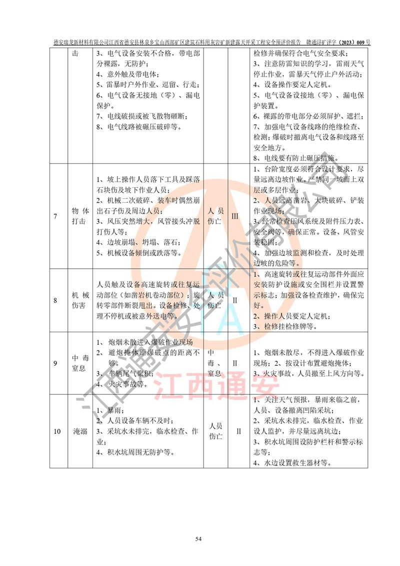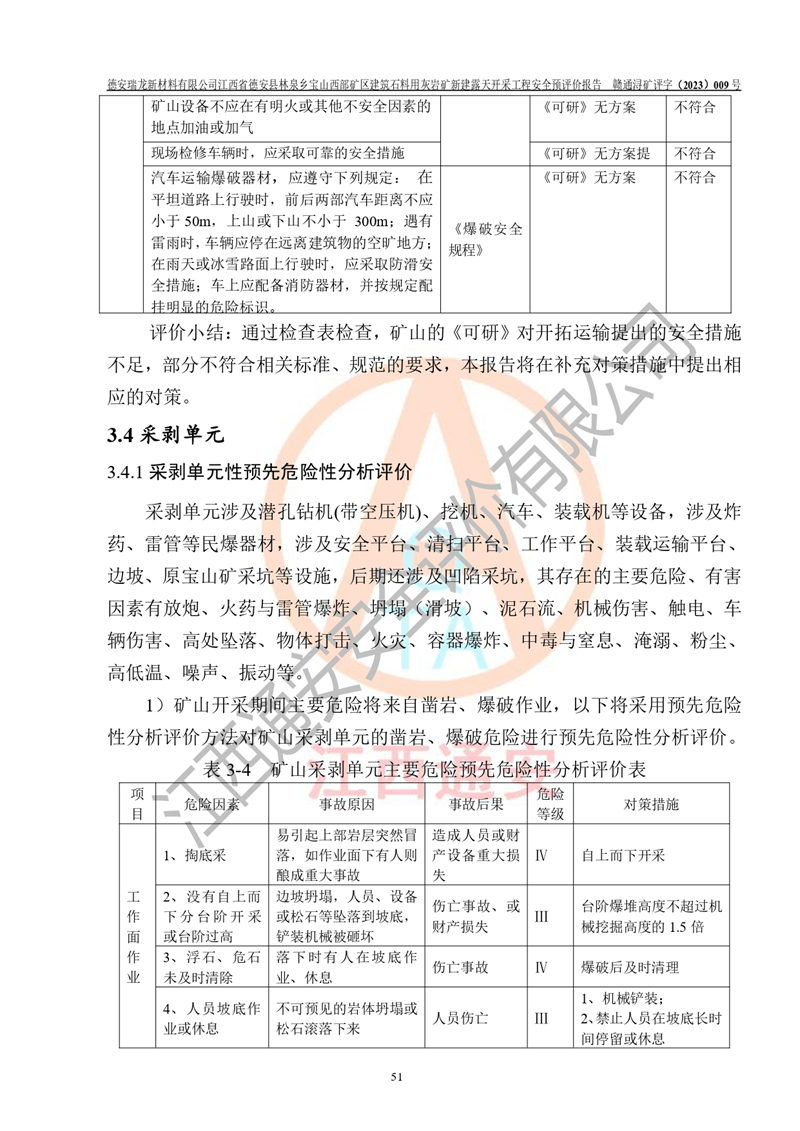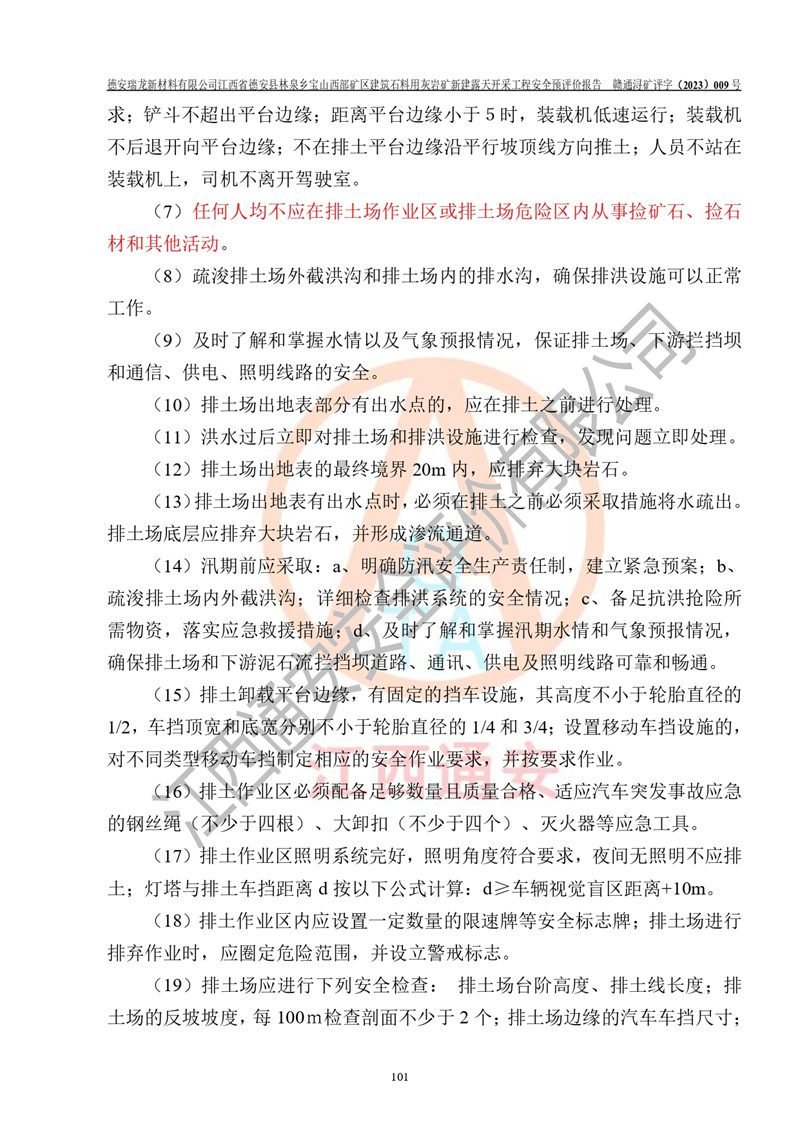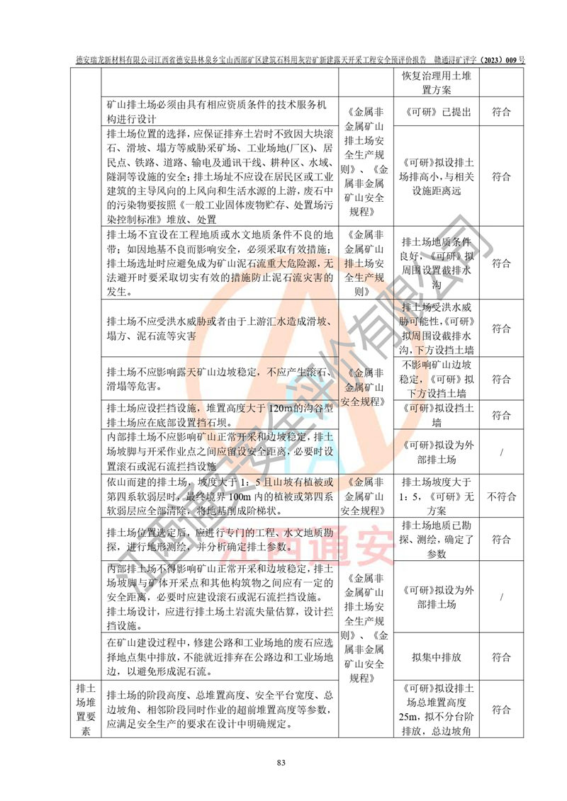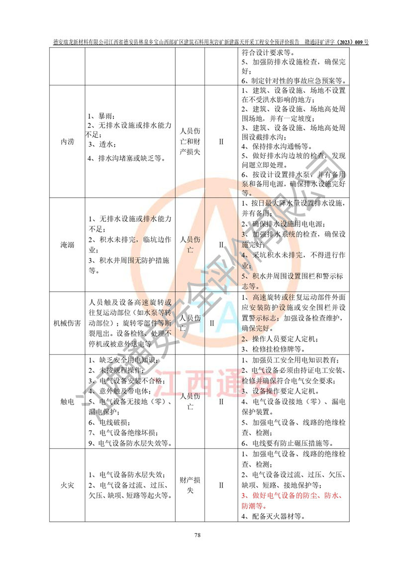 評價結(jié)論 | 總體結(jié)論:德安瑞龍新材料有限公司江西省德安縣林泉鄉(xiāng)寶山西部礦區(qū)建筑石料用灰?guī)r礦新建露天開采工程項目潛在火藥與雷管爆炸、放炮、坍塌(滑坡)、泥石流、觸電、火災、**傷害、高處墜落、物體打擊、容器爆炸、機械傷害、中毒與窒息、淹溺、粉塵、高低溫、噪聲、振動等危險、有害因素,落實《可研》、《建議書》和本報告提出的安全措施和對策,風險可控,能達到可接受范圍。 江西省德安縣林泉鄉(xiāng)寶山西部礦區(qū)建筑石料用灰?guī)r礦新建露天開采工程項目露天開采工程落實《可研》、《建議書》和本報告提出的安全措施和對策,能夠滿足**有關(guān)法律、法規(guī)、規(guī)章、標準和規(guī)范的要求,可以進行建設。 | |||||