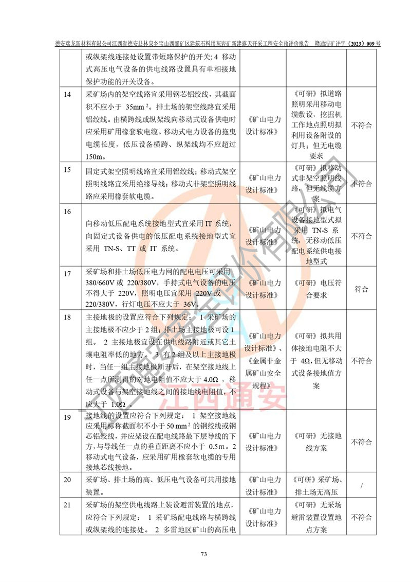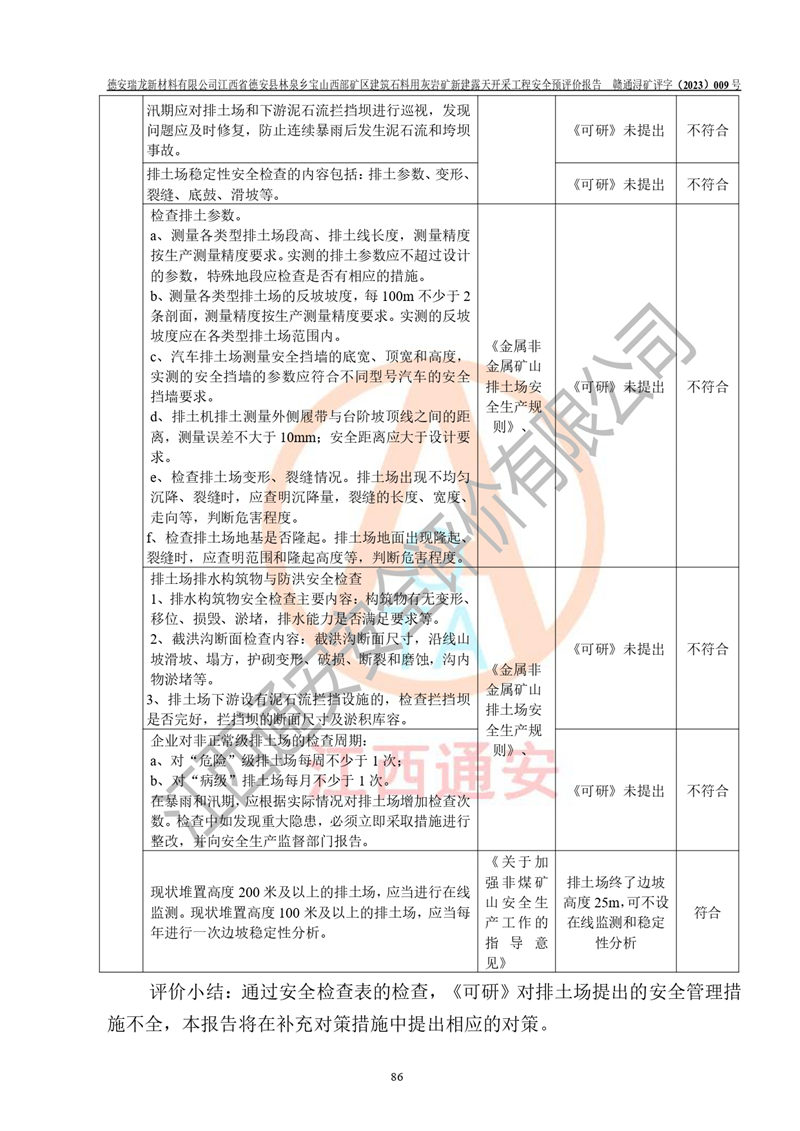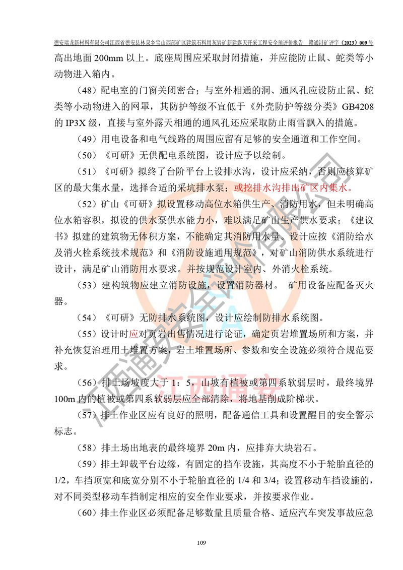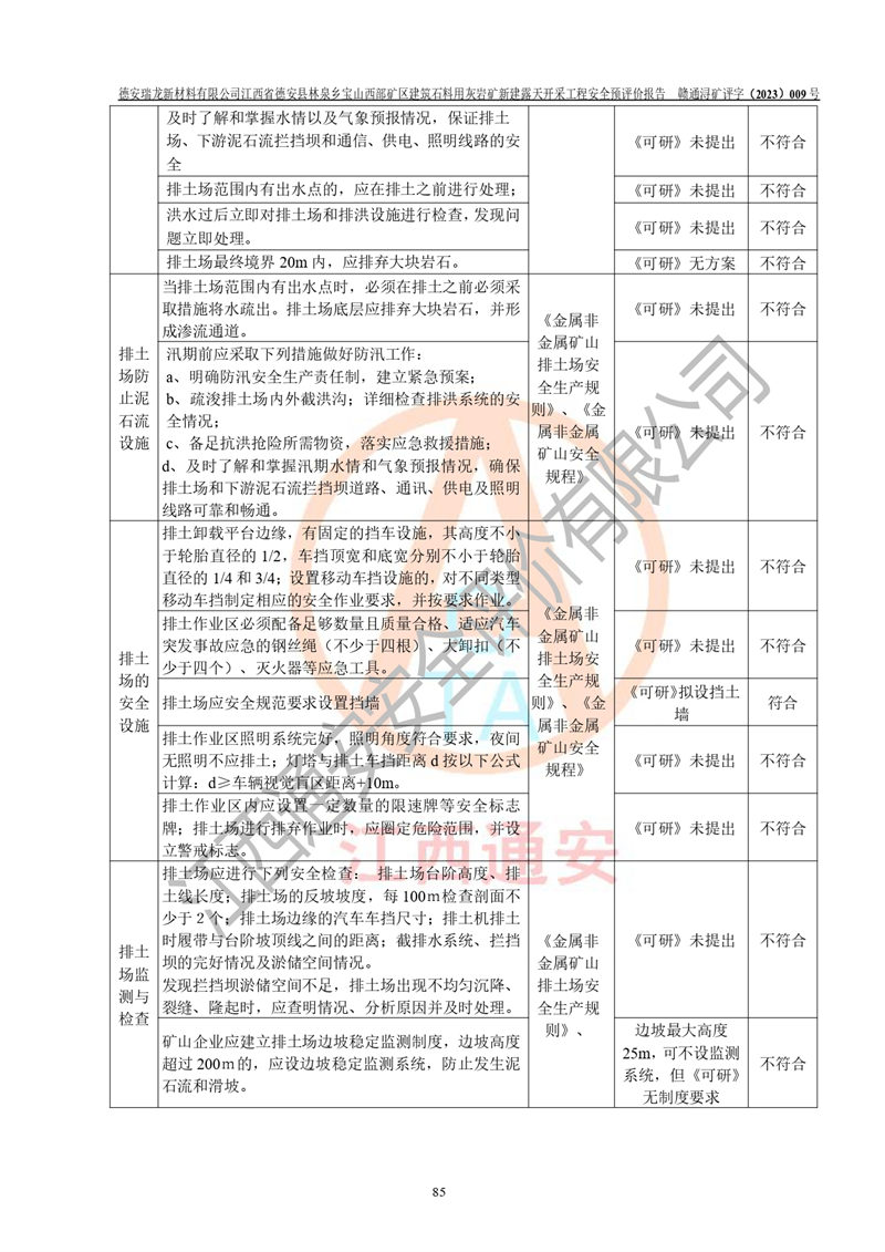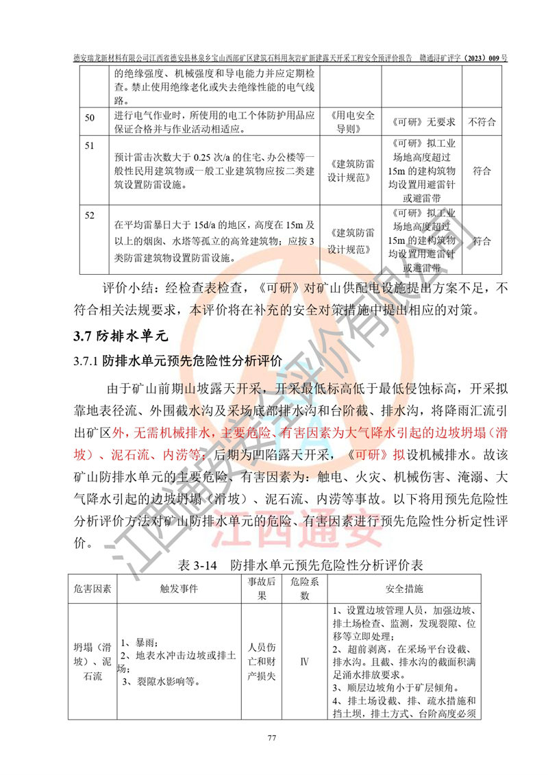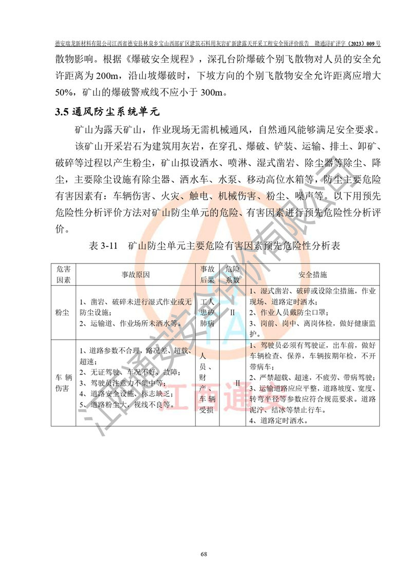 評價結(jié)論 | 總體結(jié)論:德安瑞龍新材料有限公司江西省德安縣林泉鄉(xiāng)寶山西部礦區(qū)建筑石料用灰?guī)r礦新建露天開采工程項目潛在火藥與雷管爆炸、放炮、坍塌(滑坡)、泥石流、觸電、火災、**傷害、高處墜落、物體打擊、容器爆炸、機械傷害、中毒與窒息、淹溺、粉塵、高低溫、噪聲、振動等危險、有害因素,落實《可研》、《建議書》和本報告提出的安全措施和對策,風險可控,能達到可接受范圍。 江西省德安縣林泉鄉(xiāng)寶山西部礦區(qū)建筑石料用灰?guī)r礦新建露天開采工程項目露天開采工程落實《可研》、《建議書》和本報告提出的安全措施和對策,能夠滿足**有關(guān)法律、法規(guī)、規(guī)章、標準和規(guī)范的要求,可以進行建設。 | |||||