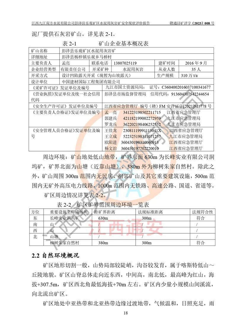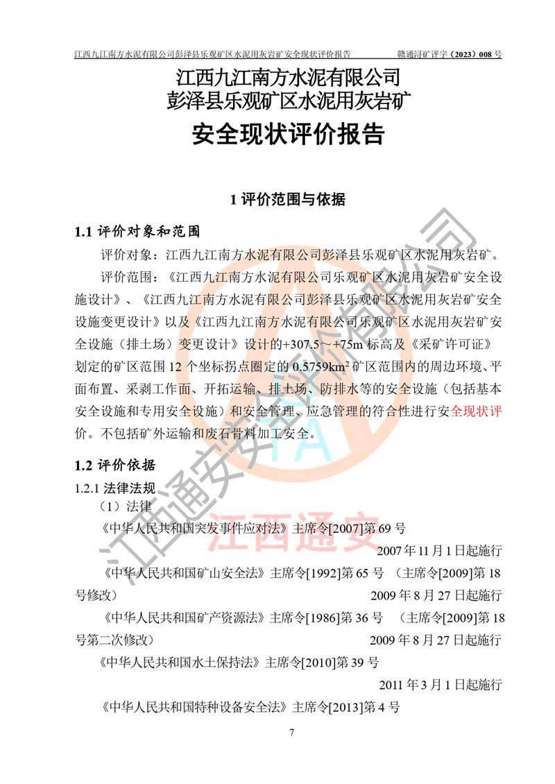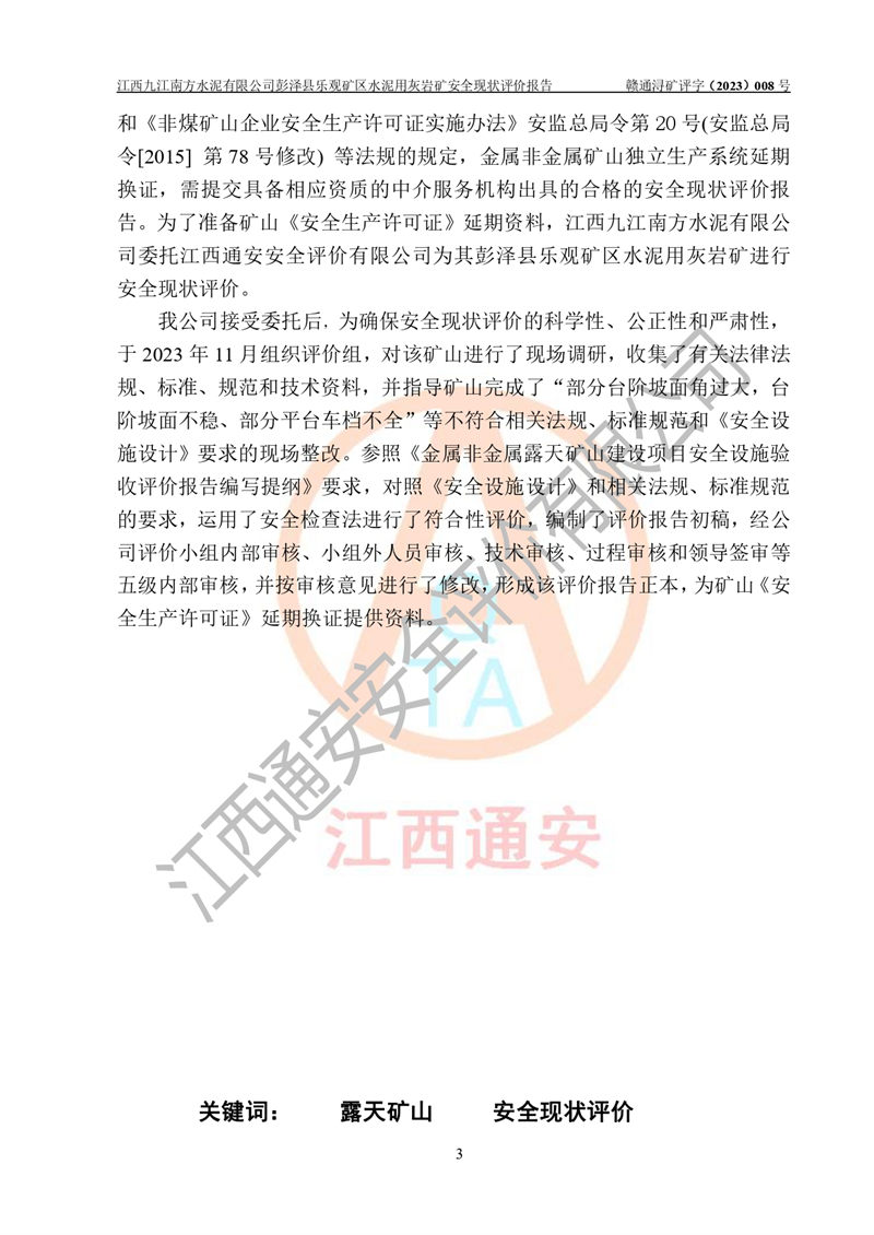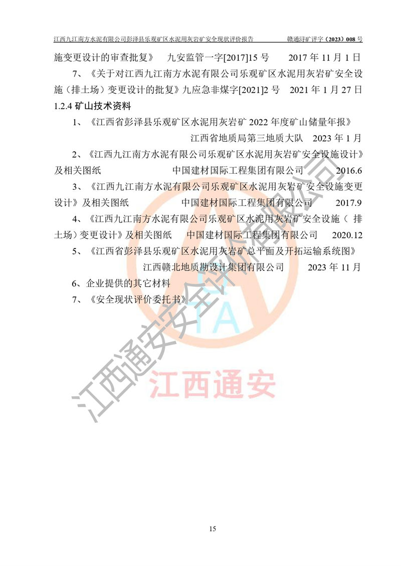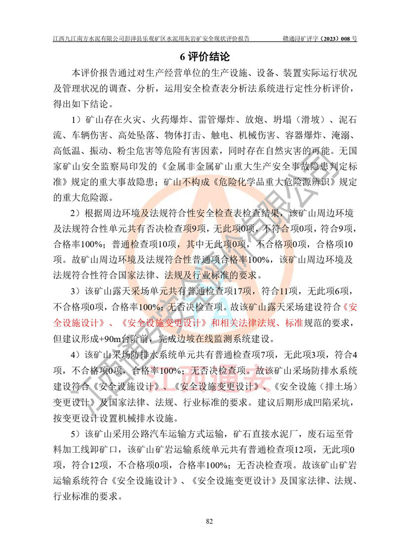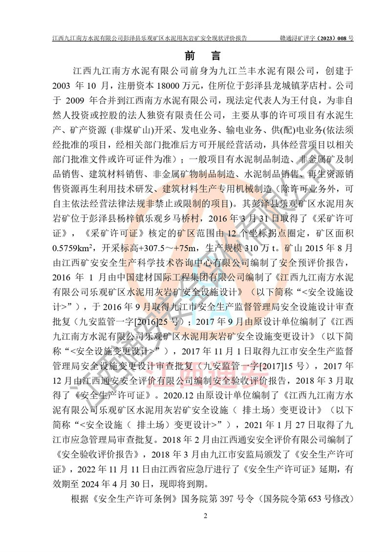報(bào)告名稱 | 江西九江南方水泥有限公司彭澤縣樂觀礦區(qū)水泥用灰?guī)r礦安全現(xiàn)狀評價(jià)報(bào)告 | |||||