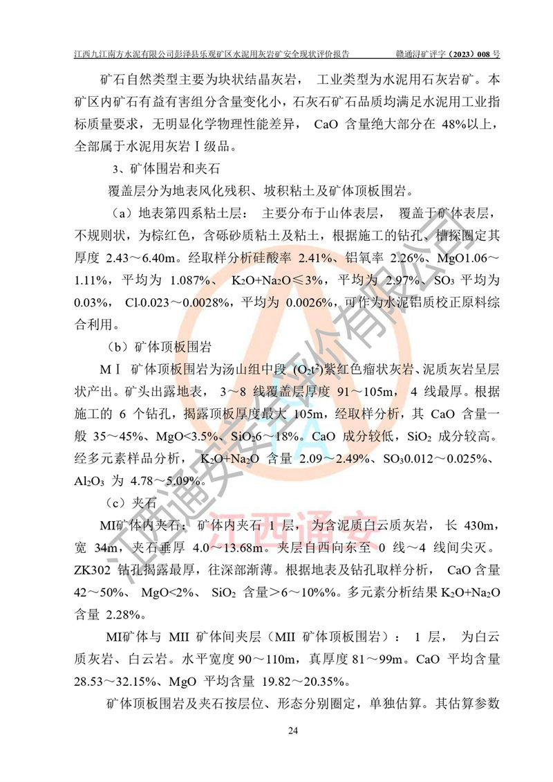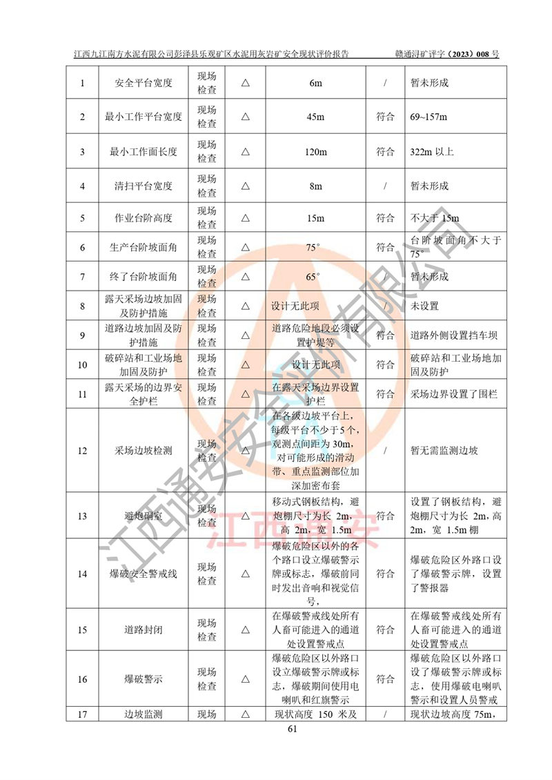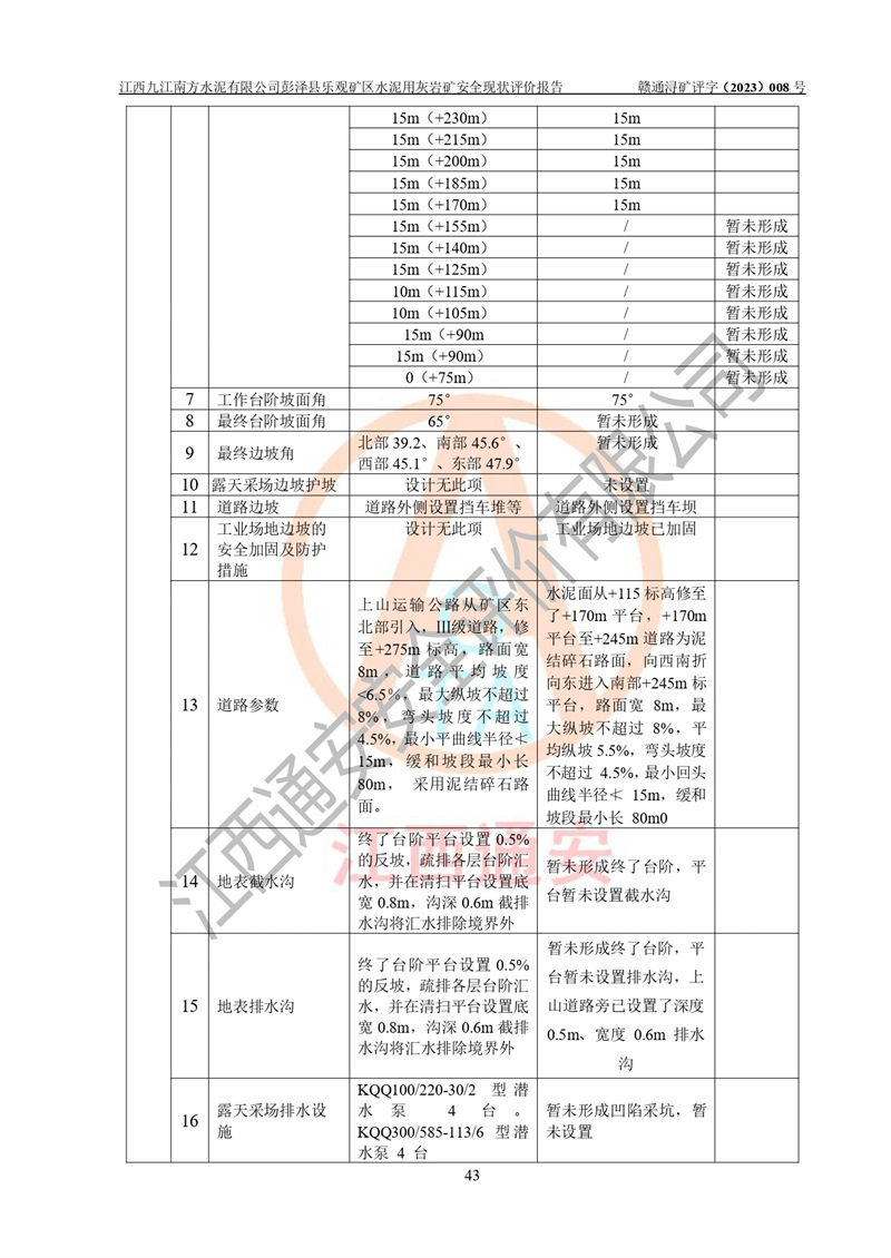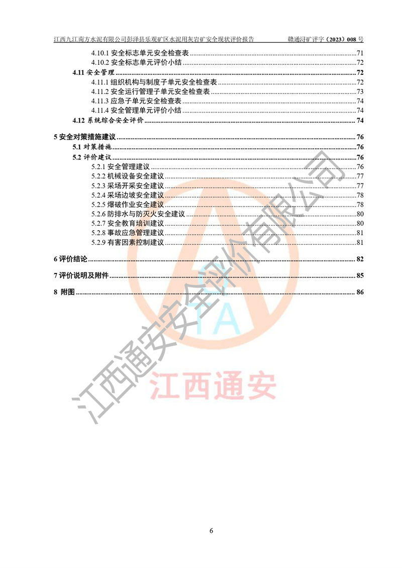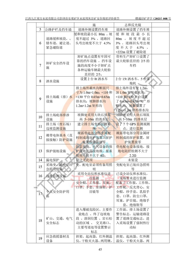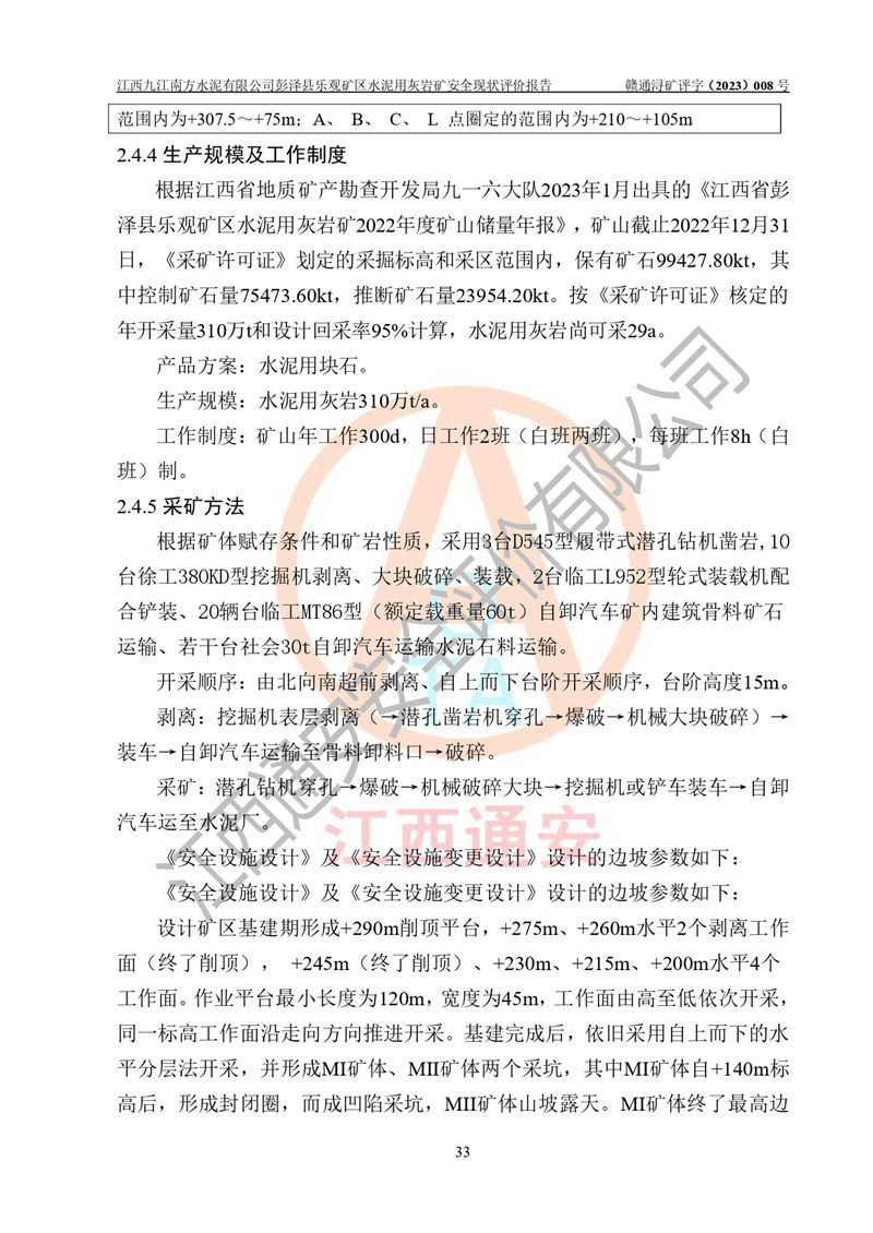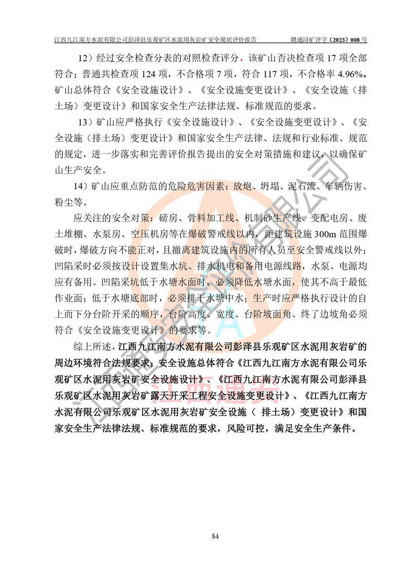 報(bào)告名稱 | 江西九江南方水泥有限公司彭澤縣樂觀礦區(qū)水泥用灰?guī)r礦安全現(xiàn)狀評價(jià)報(bào)告 | |||||