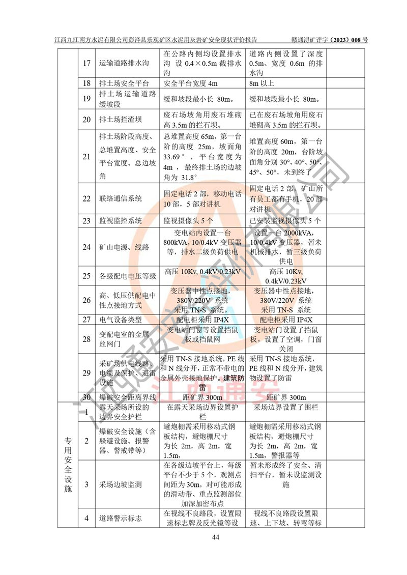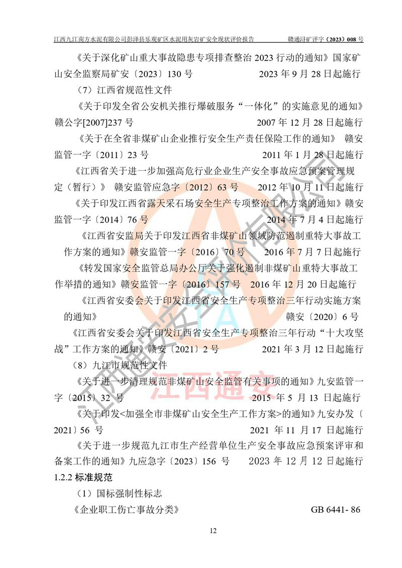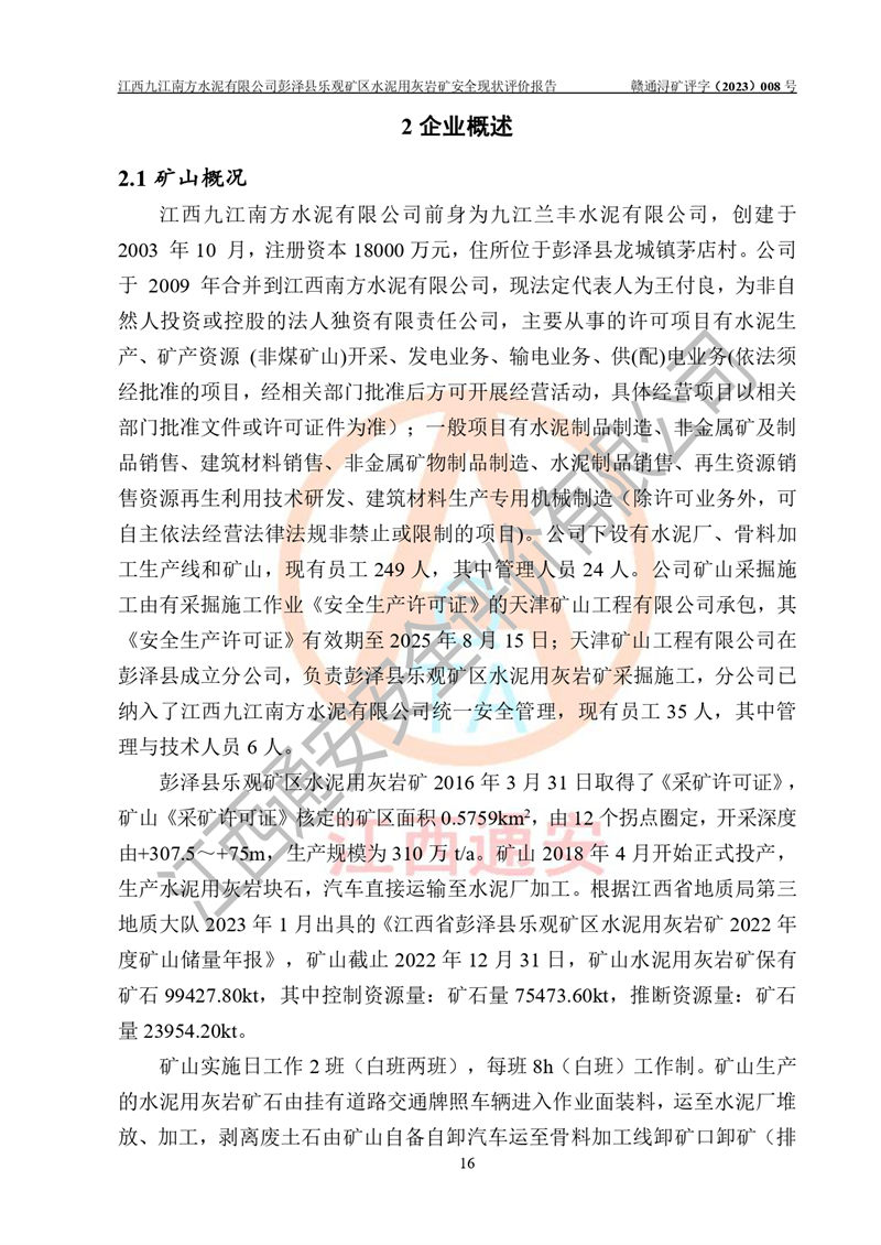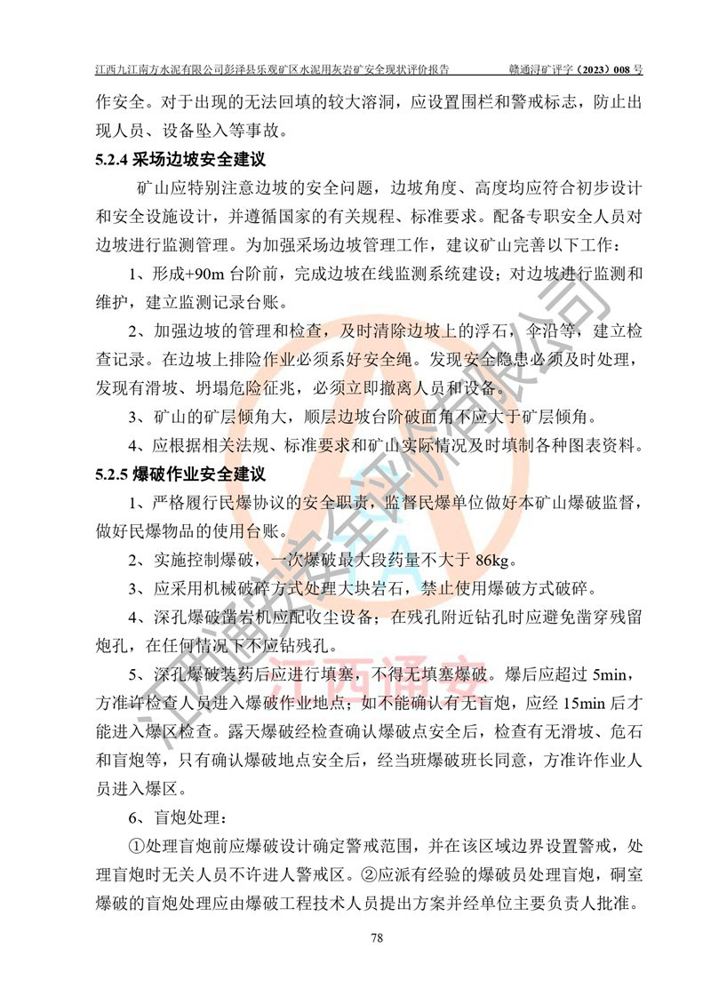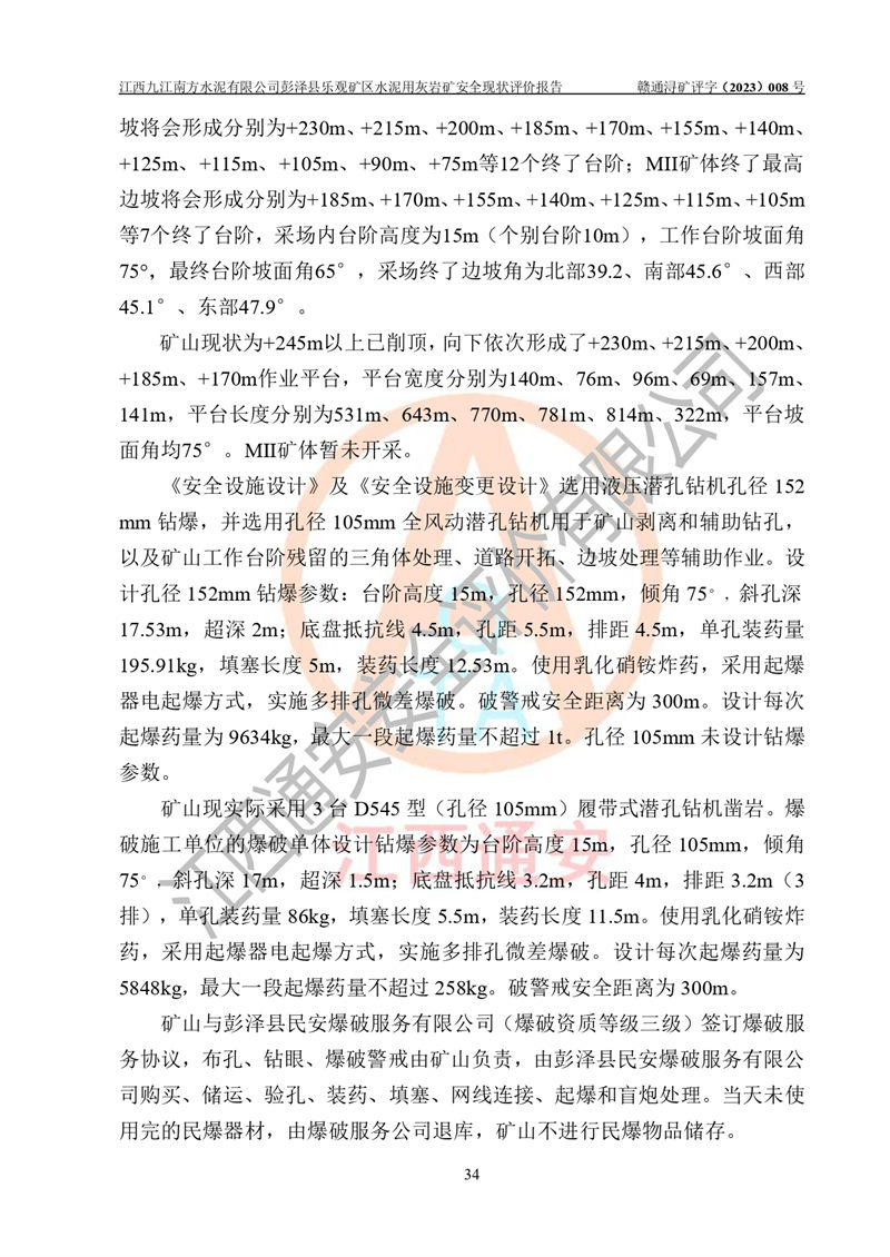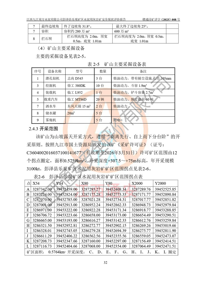 報(bào)告名稱 | 江西九江南方水泥有限公司彭澤縣樂觀礦區(qū)水泥用灰?guī)r礦安全現(xiàn)狀評價(jià)報(bào)告 | |||||