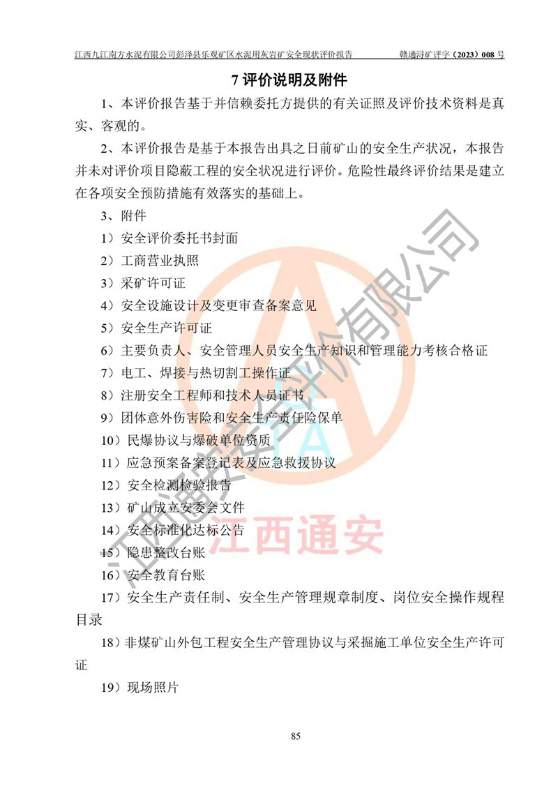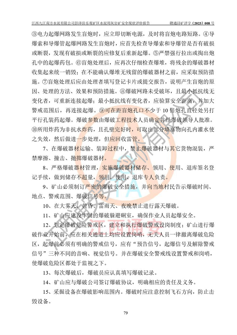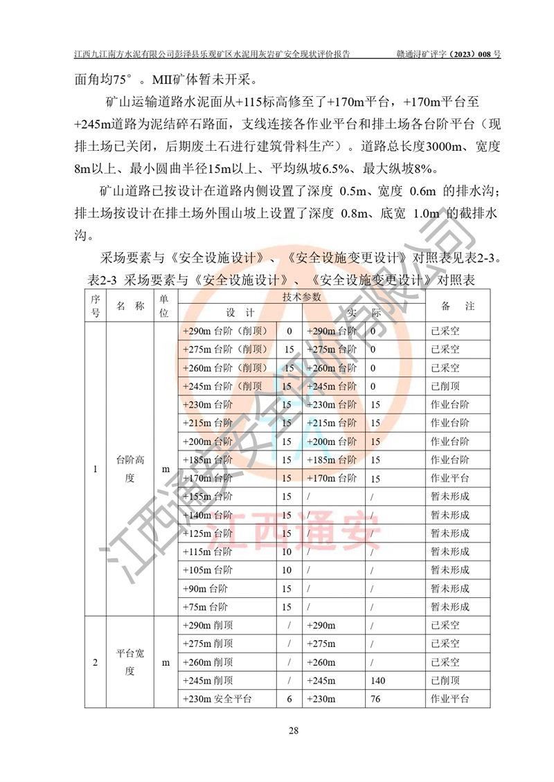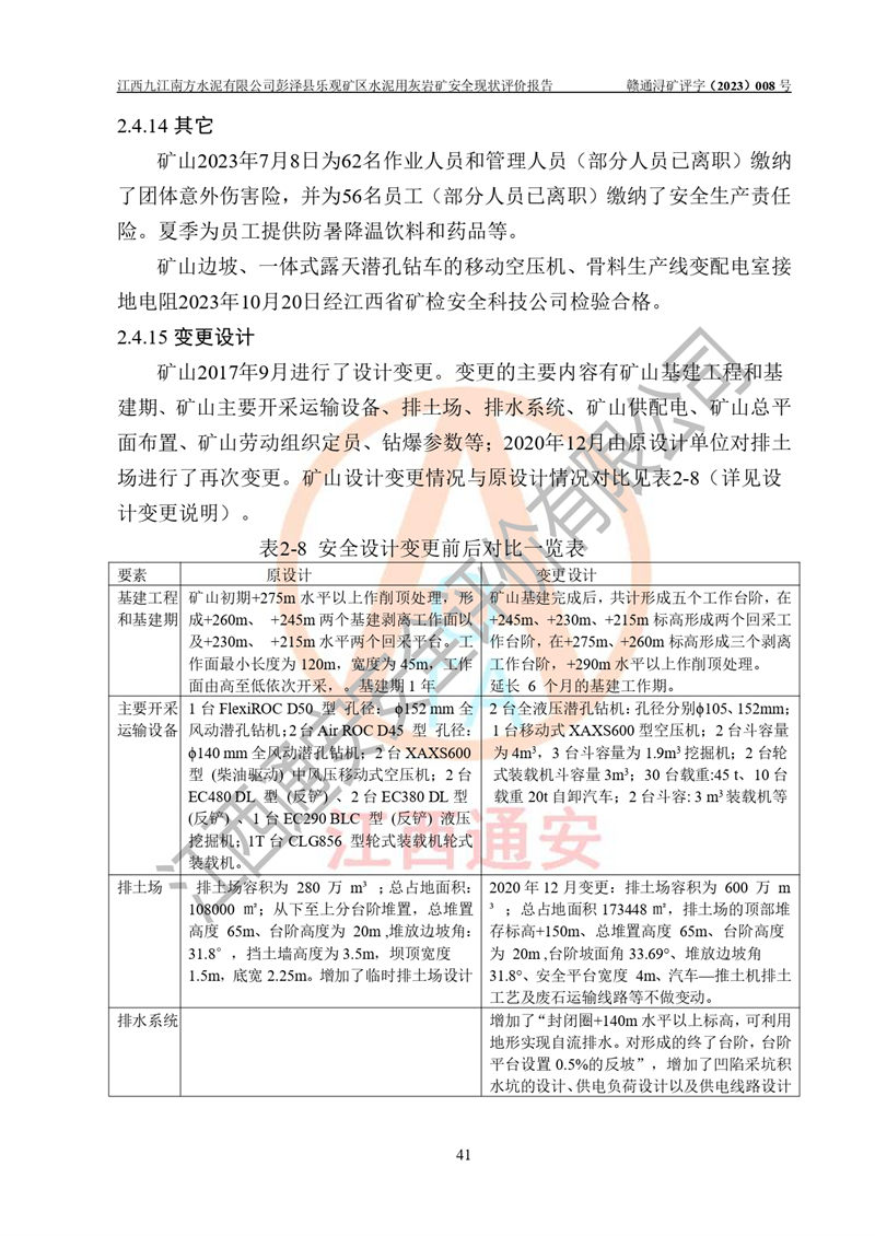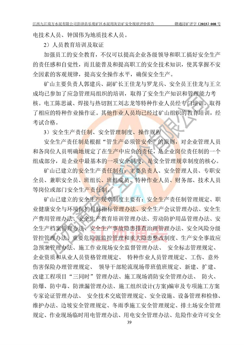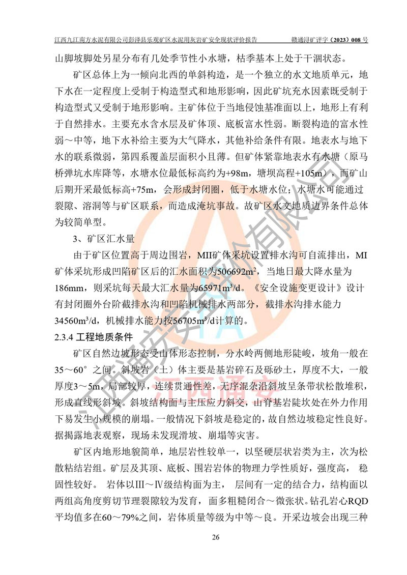 報(bào)告名稱 | 江西九江南方水泥有限公司彭澤縣樂觀礦區(qū)水泥用灰?guī)r礦安全現(xiàn)狀評價(jià)報(bào)告 | |||||