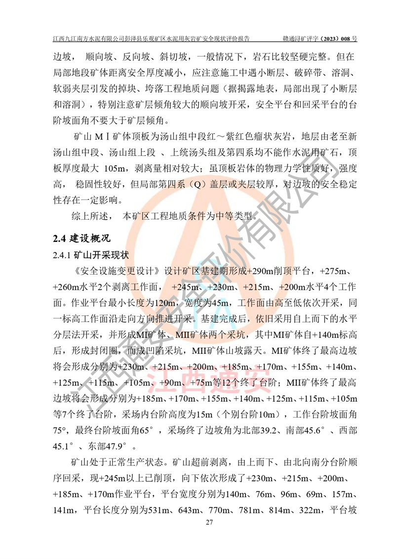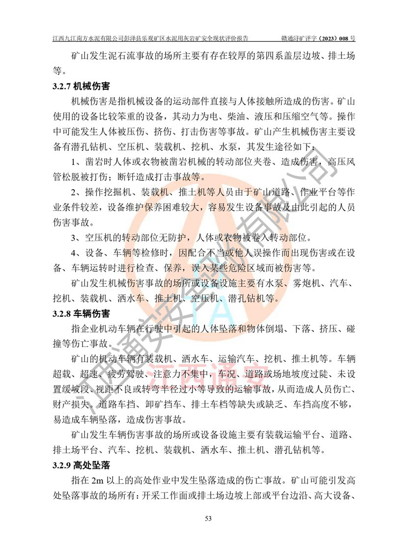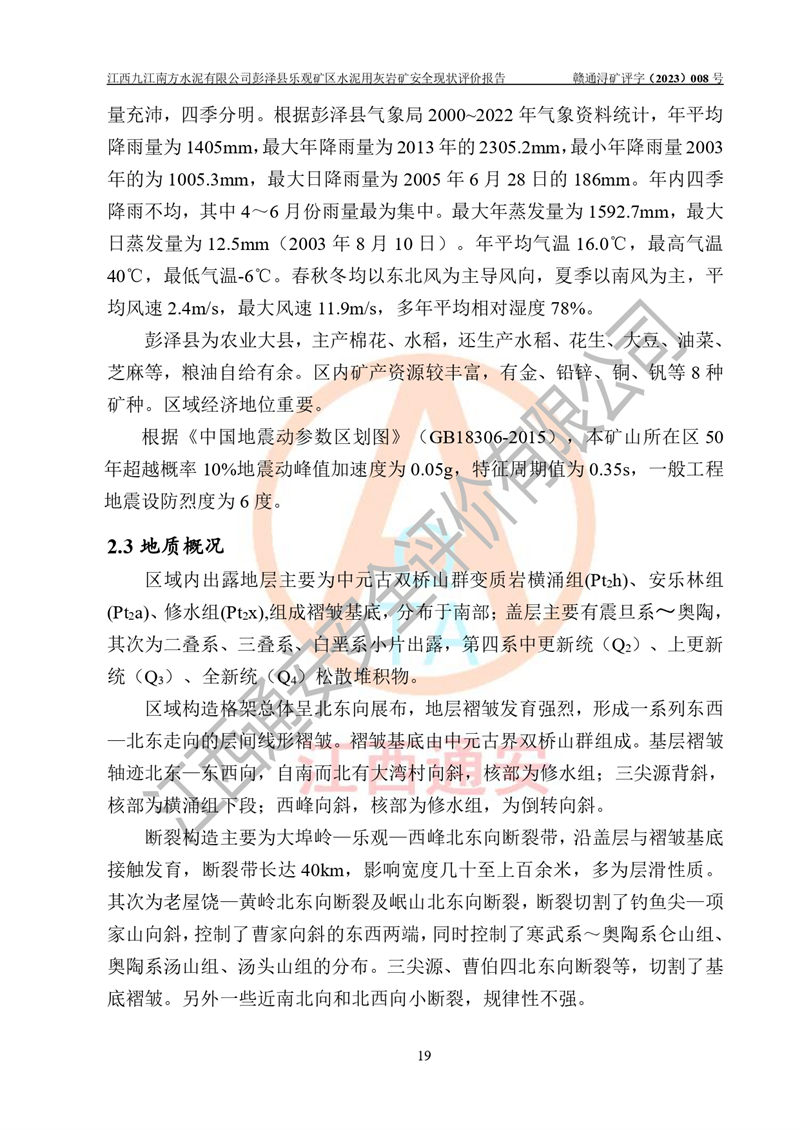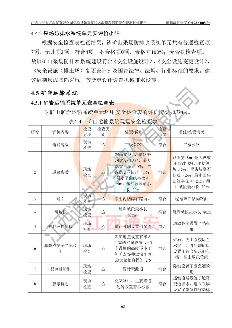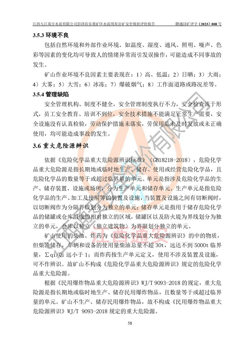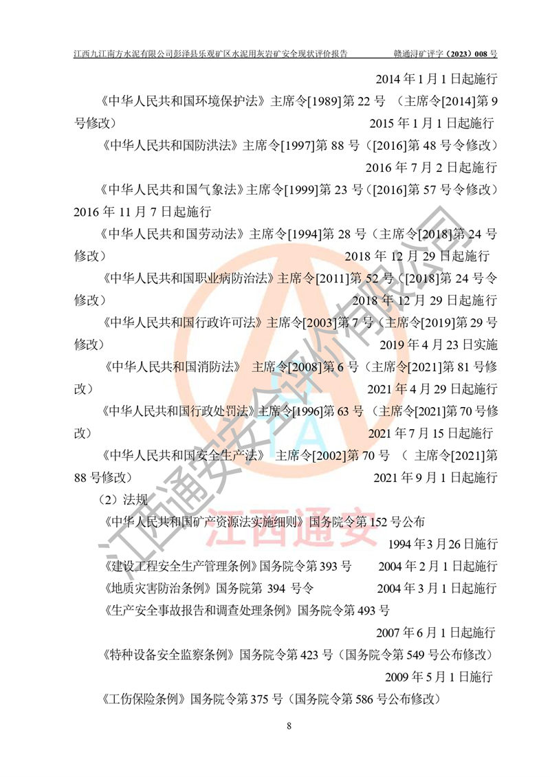 報(bào)告名稱 | 江西九江南方水泥有限公司彭澤縣樂觀礦區(qū)水泥用灰?guī)r礦安全現(xiàn)狀評價(jià)報(bào)告 | |||||