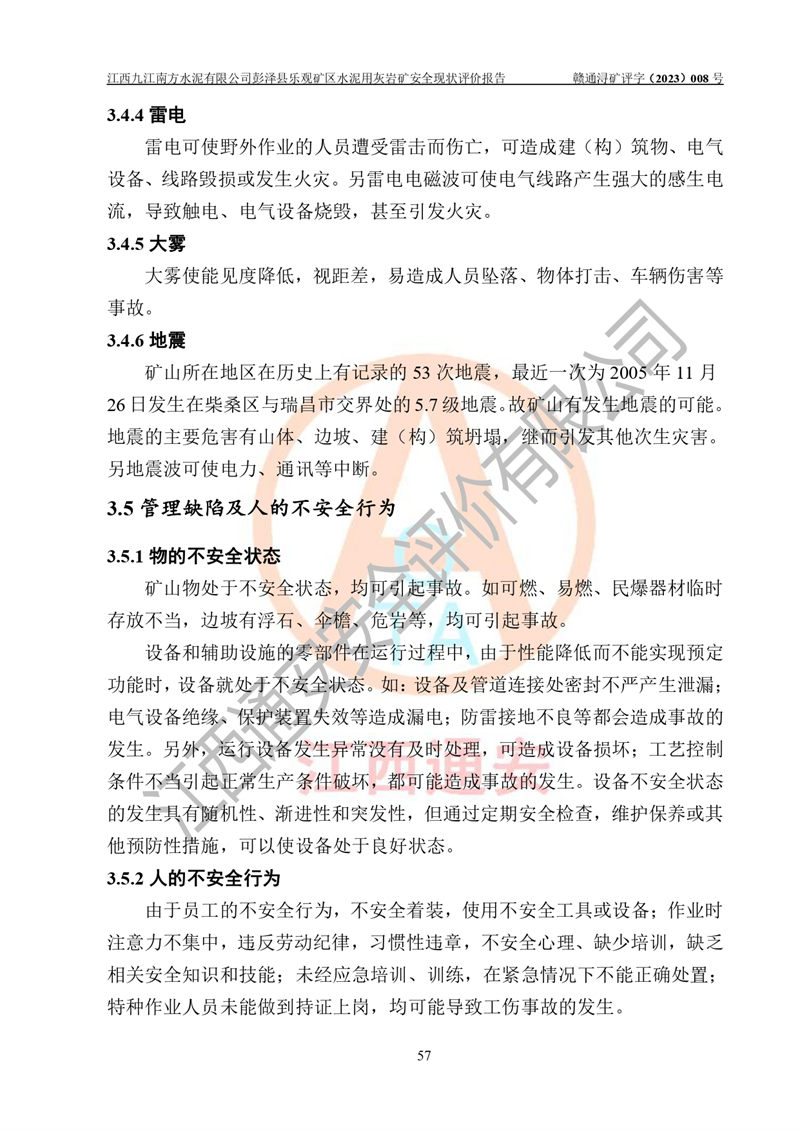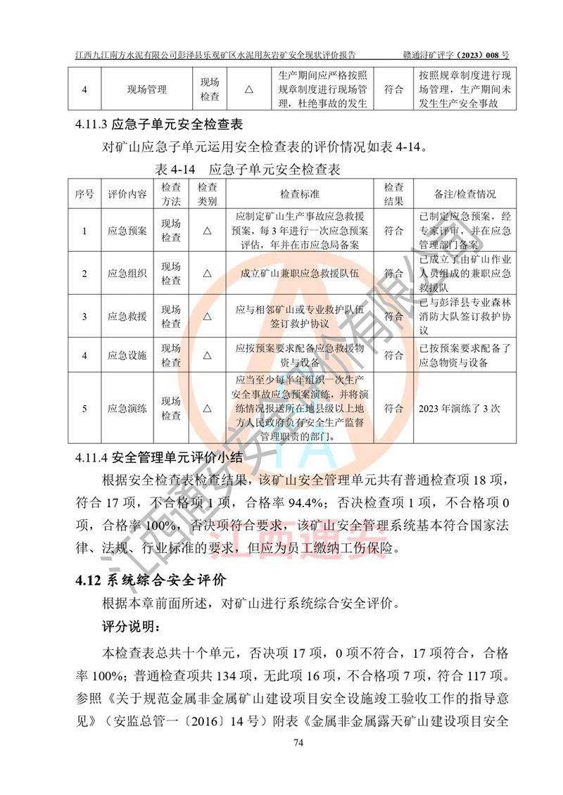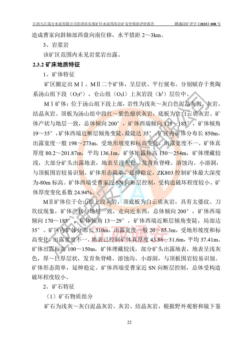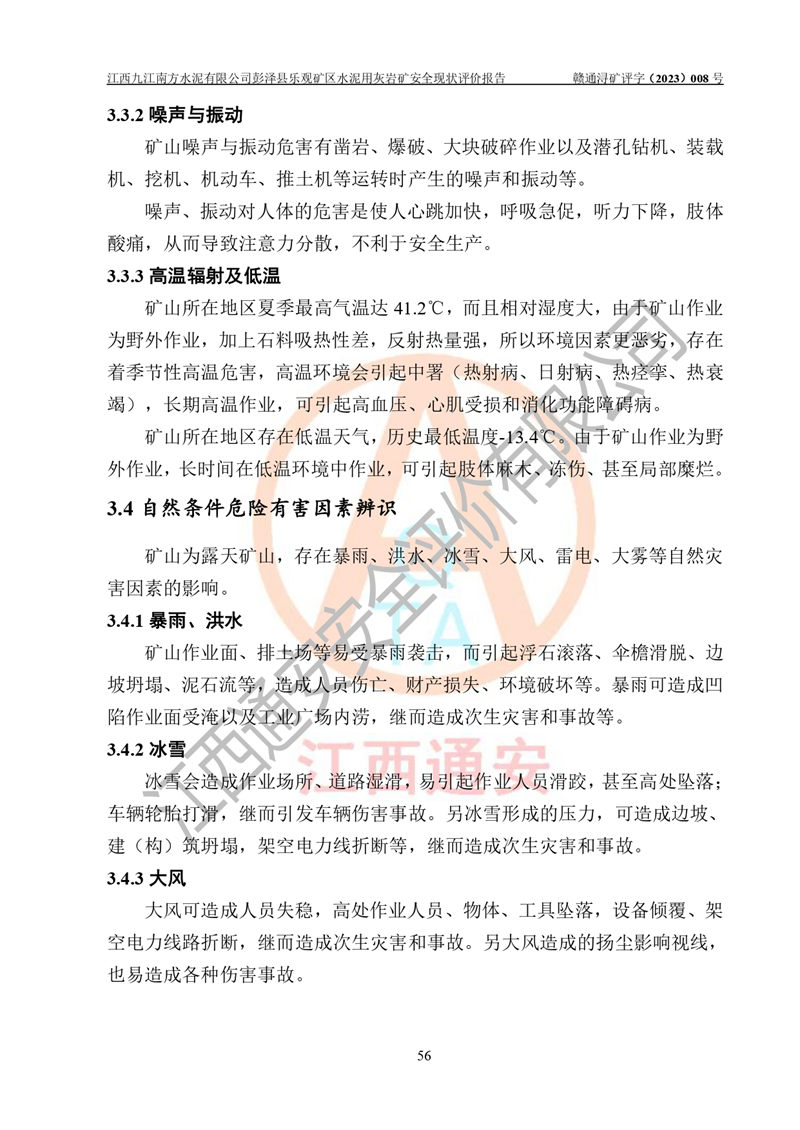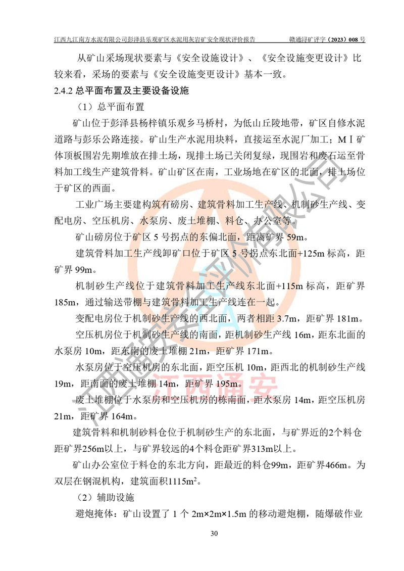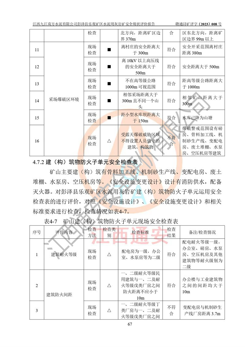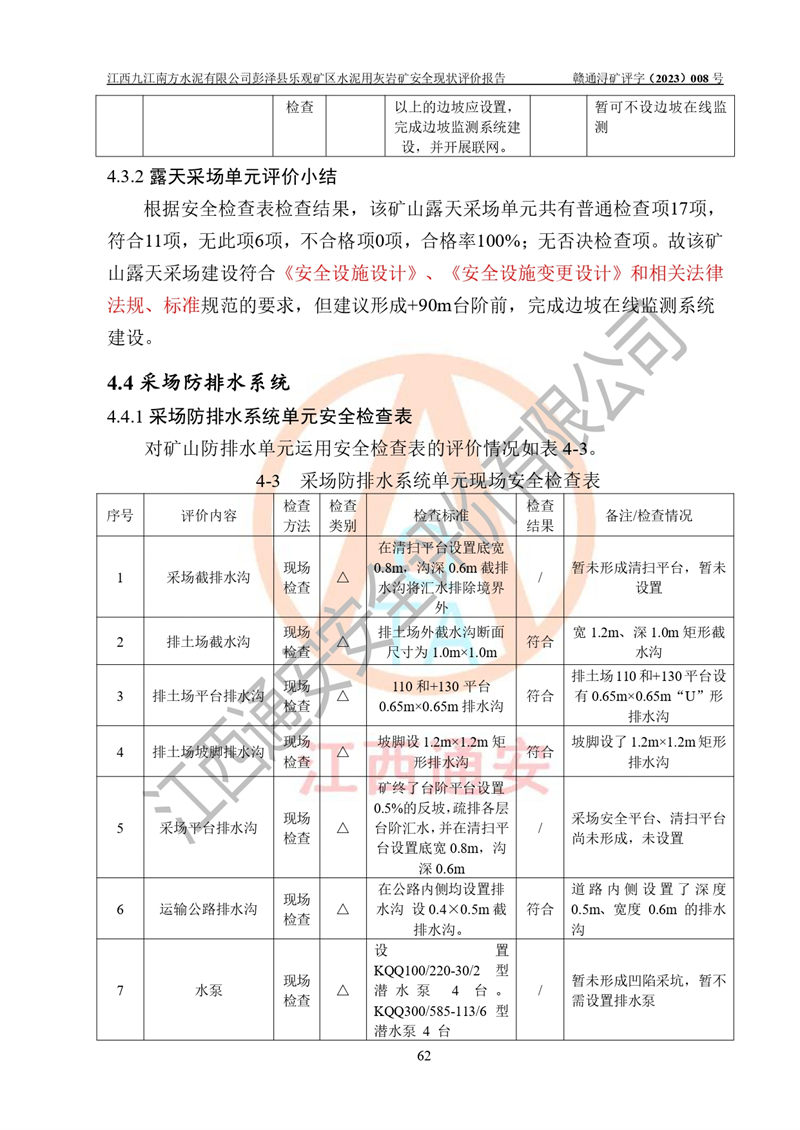 報(bào)告名稱 | 江西九江南方水泥有限公司彭澤縣樂觀礦區(qū)水泥用灰?guī)r礦安全現(xiàn)狀評價(jià)報(bào)告 | |||||