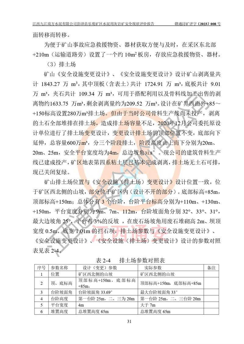 項(xiàng)目簡介 | 江西九江南方水泥有限公司前身為九江蘭豐水泥有限公司,創(chuàng)建于 2003 年10 月,注冊資本18000萬元,住所位于彭澤縣龍城鎮(zhèn)茅店村。公司于 2009 年合并到江西南方水泥有限公司,現(xiàn)法定**人為王付良,為非自然人投資或控股的法人獨(dú)資有限責(zé)任公司,主要從事的許可項(xiàng)目有水泥生產(chǎn)、礦產(chǎn)資源 (非煤礦山)開采、發(fā)電業(yè)務(wù)、輸電業(yè)務(wù)、供(配)電業(yè)務(wù)(依法須經(jīng)批準(zhǔn)的項(xiàng)目,經(jīng)相關(guān)部門批準(zhǔn)后方可開展經(jīng)營活動(dòng),具體經(jīng)營項(xiàng)目以相關(guān)部門批準(zhǔn)文件或許可證件為準(zhǔn));一般項(xiàng)目有水泥制品制造、非金屬礦及制品銷售、建筑材料銷售、非金屬礦物制品制造、水泥制品銷售、再生資源銷售資源再生利用技術(shù)研發(fā)、建筑材料生產(chǎn)**機(jī)械制造(除許可業(yè)務(wù)外,可自主依法經(jīng)營法律法規(guī)非禁止或限制的項(xiàng)目)。其彭澤縣樂觀礦區(qū)水泥用灰?guī)r礦位于彭澤縣楊梓鎮(zhèn)樂觀鄉(xiāng)馬橋村,2016年3月31日取得了《采礦許可證》,《采礦許可證》核定的礦區(qū)范圍由12個(gè)坐標(biāo)拐點(diǎn)圈定,礦區(qū)面積0.5759km2,開采標(biāo)高+307.5~+75m,生產(chǎn)規(guī)模310萬t。礦山2015年8月由江西礦安安全生產(chǎn)科學(xué)技術(shù)咨詢中心有限公司編制了安全預(yù)評價(jià)報(bào)告,2016 年 1 月由中國建材**工程集團(tuán)有限公司編制了《江西九江南方水泥有限公司樂觀礦區(qū)水泥用灰?guī)r礦安全設(shè)施設(shè)計(jì)》(以下簡稱“<安全設(shè)施設(shè)計(jì)>”),于2016年9月取得九江市安全生產(chǎn)監(jiān)督管理局安全設(shè)施設(shè)計(jì)審查批復(fù)(九安監(jiān)管一字[2016]25號);2017年9月由原設(shè)計(jì)單位編制了《江西九江南方水泥有限公司樂觀礦區(qū)水泥用灰?guī)r礦安全設(shè)施變更設(shè)計(jì)》(以下簡稱“<安全設(shè)施變更設(shè)計(jì)>”),2017年11月1日取得九江市安全生產(chǎn)監(jiān)督管理局安全設(shè)施變更設(shè)計(jì)審查批復(fù)(九安監(jiān)管一字[2017]15號),2017年12月由江西通安安全評價(jià)有限公司編制安全驗(yàn)收評價(jià)報(bào)告,2018年3月取得了《安全生產(chǎn)許可證》。2020.12由原設(shè)計(jì)單位編制了《江西九江南方水泥有限公司樂觀礦區(qū)水泥用灰?guī)r礦安全設(shè)施( 排土場)變更設(shè)計(jì)》(以下簡稱“<安全設(shè)施( 排土場)變更設(shè)計(jì)>”),2021年1月27日取得了九江市應(yīng)急管理局審查批復(fù)。2018年2月由江西通安安全評價(jià)有限公司編制了《安全驗(yàn)收評價(jià)報(bào)告》,2018年3月由九江市安監(jiān)局頒發(fā)了《安全生產(chǎn)許可證》,2022年11月11日由江西省應(yīng)急廳進(jìn)行了《安全生產(chǎn)許可證》延期,**期至2024年4月30日,現(xiàn)即將到期。 | |||||