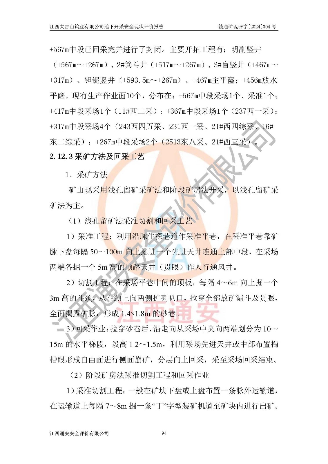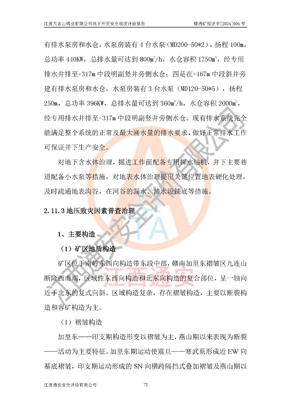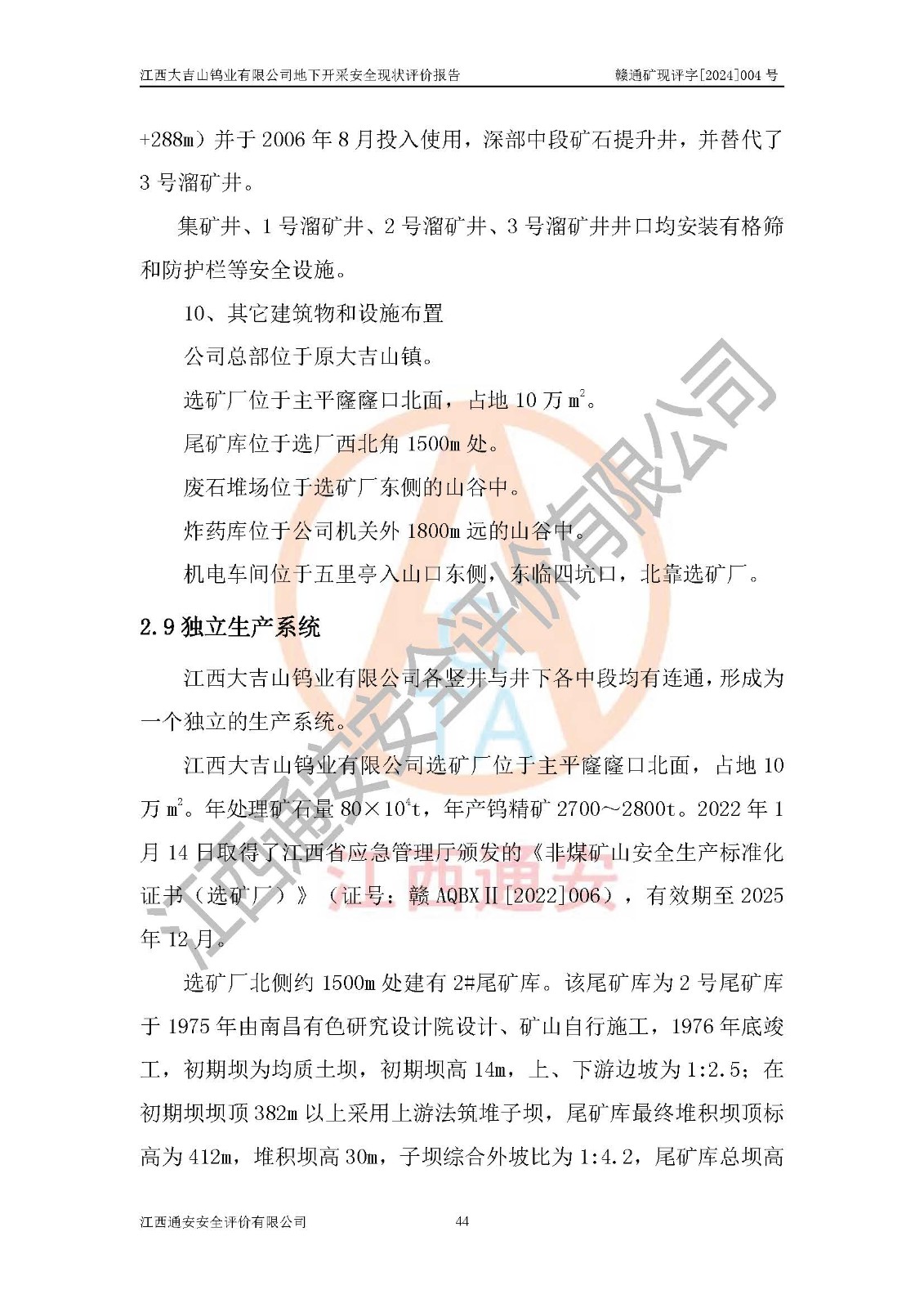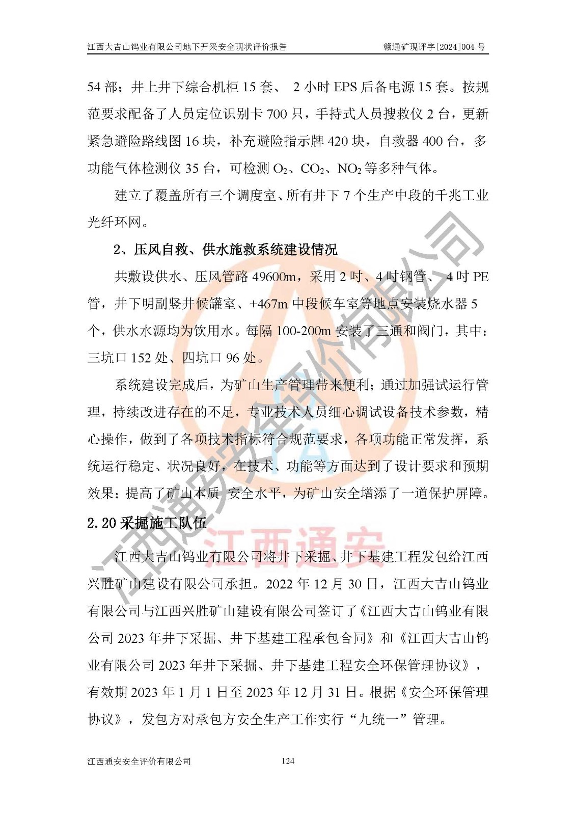 項(xiàng)目簡介 | 江西大吉山鎢業(yè)有限公司大吉山礦區(qū)位于全南縣城255°方位,直距25**處,屬于南嶺九連山脈中部,地處江西南端贛粵交界處,行政區(qū)劃屬江西省全南縣大吉山鎮(zhèn),地理坐標(biāo)為東經(jīng)114°21′30″,北緯24°31′40″,距江西省贛州市233**,另礦區(qū)內(nèi)有水泥公路到各生產(chǎn)區(qū)及輔助生產(chǎn)點(diǎn),交通便利。 礦井開拓情況現(xiàn)狀為:平硐+豎井聯(lián)合開拓,共開拓了+567m、+517m、+467m三個(gè)平硐中段和+417m、+367m、+317m、+267m中段及南組上部+732m、+666m、+625m三中段,中北組西部+729m、+662m、+625m三中段,中北組東部+680m、+632m兩中段等十四個(gè)中段。前期形成的中段**為37~67m,+567m以下中段**50m;主平窿標(biāo)高為+467m。目前作業(yè)中段有6個(gè),分別為+517m 、+467m、+367m、+317m 、+267m。+567m中段已回采完并進(jìn)行了封閉。主要開拓工程有:明副豎井(+567m~+267m)、2#箕斗井(+517m~+267m)、3#盲豎井(+467m~+317m)、鉭鈮豎井(+593.5m~+267m)、+467m主平窿;+456m放水平窿?,F(xiàn)有生產(chǎn)作業(yè)面10個(gè),分布在:+567m中段采場1個(gè)、采準(zhǔn)1個(gè);+417m中段采場1個(gè)(11#西二采);+367m中段采場1個(gè)(237西一采);+317m中段采場4個(gè)(243西四五采、231西一采、21#西四綜采、16#東二綜采);+267m中段采場2個(gè)(2513東八采、21#西三采)。 礦山取得安全生產(chǎn)許可證后,嚴(yán)格按照設(shè)計(jì)回采順序(中段按從上到下的順序開采)要求進(jìn)行開采。礦山現(xiàn)采用平窿+盲箕斗豎井+明罐籠豎井聯(lián)合開拓方式,共開拓+567m、+517m、+467m、+417m、+367m、+317m、+267m中段七個(gè)中段,目前+567m中段已回采完并進(jìn)行了封閉。 礦山隱蔽致災(zāi)因素普查治理工作由江西大吉山鎢業(yè)有限公司組織開展,贛州有色冶金研究所有限公司、江西省物化探地質(zhì)工程有限公司和贛州鑫宇礦冶有限公司提供物探和水文地質(zhì)調(diào)查等技術(shù)服務(wù)。2023年12月提交了《江西大吉山鎢業(yè)有限公司礦山隱蔽致災(zāi)因素普查治理報(bào)告》。報(bào)告基于礦山現(xiàn)有技術(shù)資料,從采空區(qū)致災(zāi)因素、水文地質(zhì)致災(zāi)因素、地壓致災(zāi)因素、火災(zāi)致災(zāi)因素等方面對(duì)大吉山鎢業(yè)礦山隱蔽致災(zāi)因素進(jìn)行了全面排查,并結(jié)合礦山實(shí)際情況對(duì)各類典型的隱蔽致災(zāi)因素進(jìn)行了風(fēng)險(xiǎn)分析與評(píng)估,在工程、技術(shù)、管理、應(yīng)急、個(gè)體防護(hù)等方面提出了相應(yīng)的防控措施。2024年1月8日企業(yè)組織專家對(duì)報(bào)告進(jìn)行了評(píng)審并通過評(píng)審。 礦山設(shè)有礦長游峰(采礦本科),總工程師吳慶吉(采礦本科,注安師),生產(chǎn)副礦長朱毅(采礦本科,采礦工程師),安全副礦長2人寧穎(采礦大專)和范小唐(測(cè)量大專),機(jī)電副礦長陳少衛(wèi)(電氣工程師)。配有采礦、地質(zhì)、測(cè)量、機(jī)電、通風(fēng)等專業(yè)技術(shù)人員18名。 根據(jù)《安全生產(chǎn)法》、《礦山安全法》、《安全生產(chǎn)許可證條例》等有關(guān)法律、法規(guī)的規(guī)定以及江西省安全生產(chǎn)監(jiān)督管理局《關(guān)于進(jìn)一步加強(qiáng)我省非煤地下礦山安全生產(chǎn)許可工作的通知》(贛安監(jiān)管一字〔2012〕253號(hào))要求,2023年10月26日,礦山委托我公司(江西通安安全評(píng)價(jià)有限公司)對(duì)江西大吉山鎢業(yè)有限公司地下開采進(jìn)行安全現(xiàn)狀評(píng)價(jià)。 | ||||
