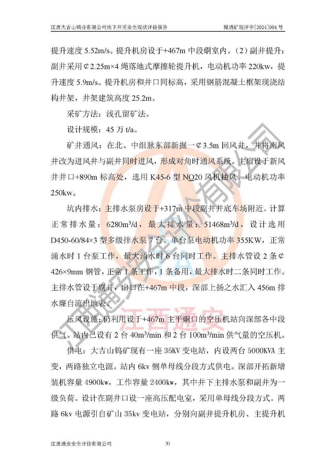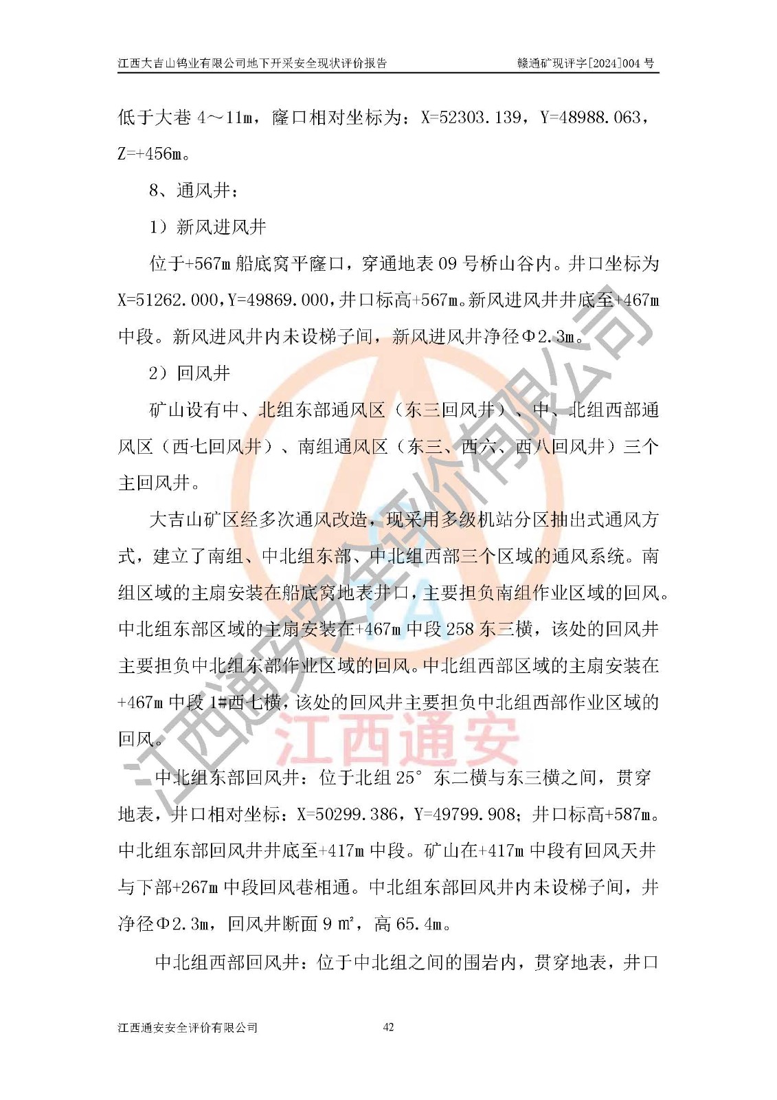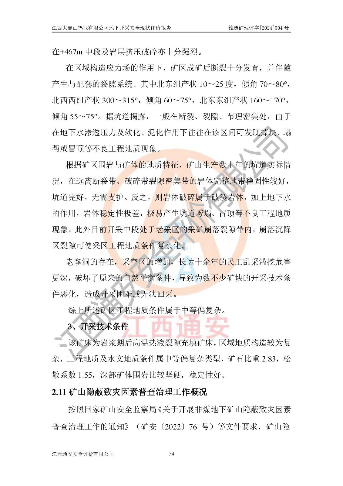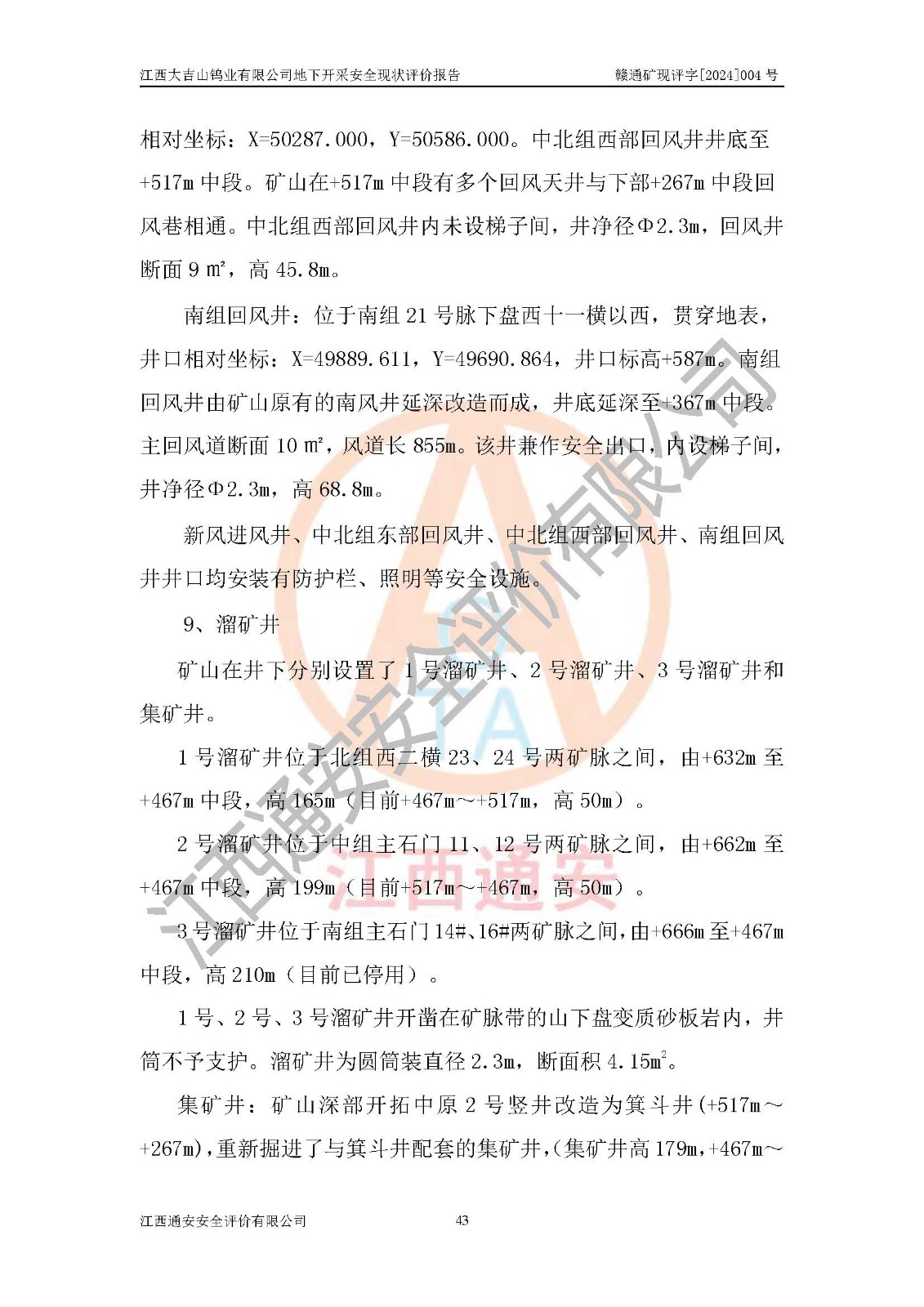 項(xiàng)目簡介 | 江西大吉山鎢業(yè)有限公司大吉山礦區(qū)位于全南縣城255°方位,直距25**處,屬于南嶺九連山脈中部,地處江西南端贛粵交界處,行政區(qū)劃屬江西省全南縣大吉山鎮(zhèn),地理坐標(biāo)為東經(jīng)114°21′30″,北緯24°31′40″,距江西省贛州市233**,另礦區(qū)內(nèi)有水泥公路到各生產(chǎn)區(qū)及輔助生產(chǎn)點(diǎn),交通便利。 礦井開拓情況現(xiàn)狀為:平硐+豎井聯(lián)合開拓,共開拓了+567m、+517m、+467m三個(gè)平硐中段和+417m、+367m、+317m、+267m中段及南組上部+732m、+666m、+625m三中段,中北組西部+729m、+662m、+625m三中段,中北組東部+680m、+632m兩中段等十四個(gè)中段。前期形成的中段**為37~67m,+567m以下中段**50m;主平窿標(biāo)高為+467m。目前作業(yè)中段有6個(gè),分別為+517m 、+467m、+367m、+317m 、+267m。+567m中段已回采完并進(jìn)行了封閉。主要開拓工程有:明副豎井(+567m~+267m)、2#箕斗井(+517m~+267m)、3#盲豎井(+467m~+317m)、鉭鈮豎井(+593.5m~+267m)、+467m主平窿;+456m放水平窿?,F(xiàn)有生產(chǎn)作業(yè)面10個(gè),分布在:+567m中段采場1個(gè)、采準(zhǔn)1個(gè);+417m中段采場1個(gè)(11#西二采);+367m中段采場1個(gè)(237西一采);+317m中段采場4個(gè)(243西四五采、231西一采、21#西四綜采、16#東二綜采);+267m中段采場2個(gè)(2513東八采、21#西三采)。 礦山取得安全生產(chǎn)許可證后,嚴(yán)格按照設(shè)計(jì)回采順序(中段按從上到下的順序開采)要求進(jìn)行開采。礦山現(xiàn)采用平窿+盲箕斗豎井+明罐籠豎井聯(lián)合開拓方式,共開拓+567m、+517m、+467m、+417m、+367m、+317m、+267m中段七個(gè)中段,目前+567m中段已回采完并進(jìn)行了封閉。 礦山隱蔽致災(zāi)因素普查治理工作由江西大吉山鎢業(yè)有限公司組織開展,贛州有色冶金研究所有限公司、江西省物化探地質(zhì)工程有限公司和贛州鑫宇礦冶有限公司提供物探和水文地質(zhì)調(diào)查等技術(shù)服務(wù)。2023年12月提交了《江西大吉山鎢業(yè)有限公司礦山隱蔽致災(zāi)因素普查治理報(bào)告》。報(bào)告基于礦山現(xiàn)有技術(shù)資料,從采空區(qū)致災(zāi)因素、水文地質(zhì)致災(zāi)因素、地壓致災(zāi)因素、火災(zāi)致災(zāi)因素等方面對(duì)大吉山鎢業(yè)礦山隱蔽致災(zāi)因素進(jìn)行了全面排查,并結(jié)合礦山實(shí)際情況對(duì)各類典型的隱蔽致災(zāi)因素進(jìn)行了風(fēng)險(xiǎn)分析與評(píng)估,在工程、技術(shù)、管理、應(yīng)急、個(gè)體防護(hù)等方面提出了相應(yīng)的防控措施。2024年1月8日企業(yè)組織專家對(duì)報(bào)告進(jìn)行了評(píng)審并通過評(píng)審。 礦山設(shè)有礦長游峰(采礦本科),總工程師吳慶吉(采礦本科,注安師),生產(chǎn)副礦長朱毅(采礦本科,采礦工程師),安全副礦長2人寧穎(采礦大專)和范小唐(測(cè)量大專),機(jī)電副礦長陳少衛(wèi)(電氣工程師)。配有采礦、地質(zhì)、測(cè)量、機(jī)電、通風(fēng)等專業(yè)技術(shù)人員18名。 根據(jù)《安全生產(chǎn)法》、《礦山安全法》、《安全生產(chǎn)許可證條例》等有關(guān)法律、法規(guī)的規(guī)定以及江西省安全生產(chǎn)監(jiān)督管理局《關(guān)于進(jìn)一步加強(qiáng)我省非煤地下礦山安全生產(chǎn)許可工作的通知》(贛安監(jiān)管一字〔2012〕253號(hào))要求,2023年10月26日,礦山委托我公司(江西通安安全評(píng)價(jià)有限公司)對(duì)江西大吉山鎢業(yè)有限公司地下開采進(jìn)行安全現(xiàn)狀評(píng)價(jià)。 | ||||