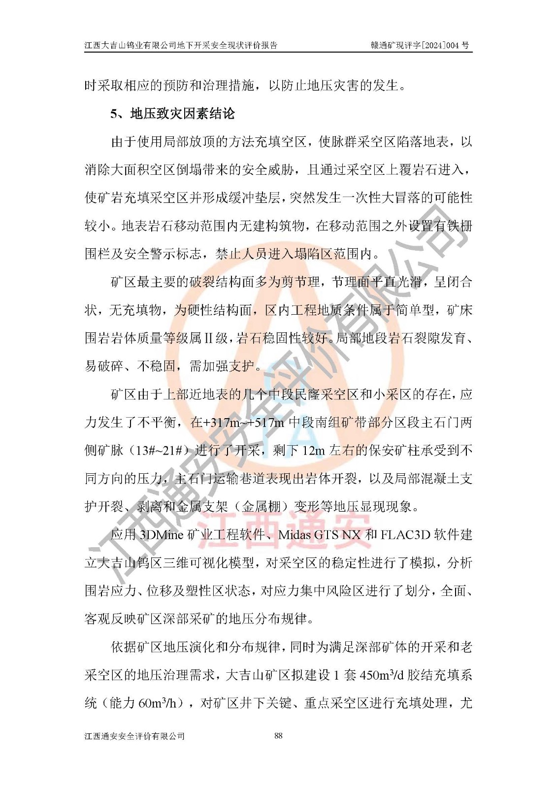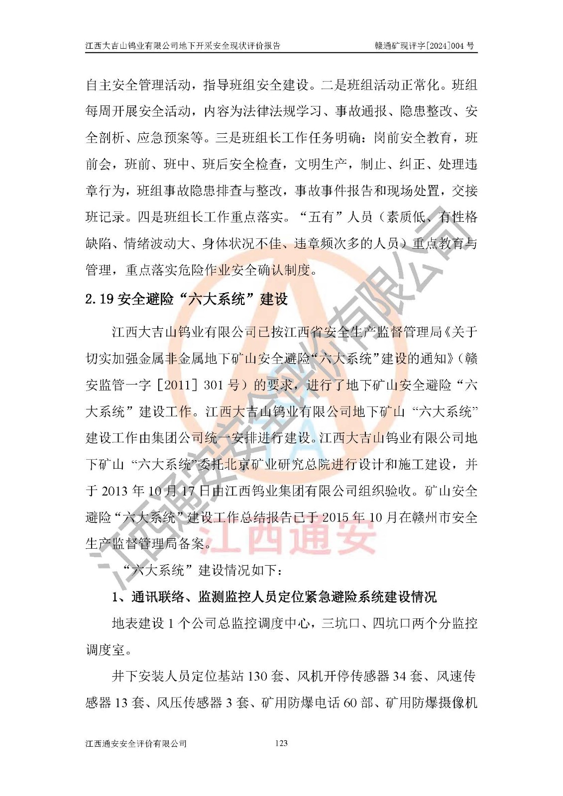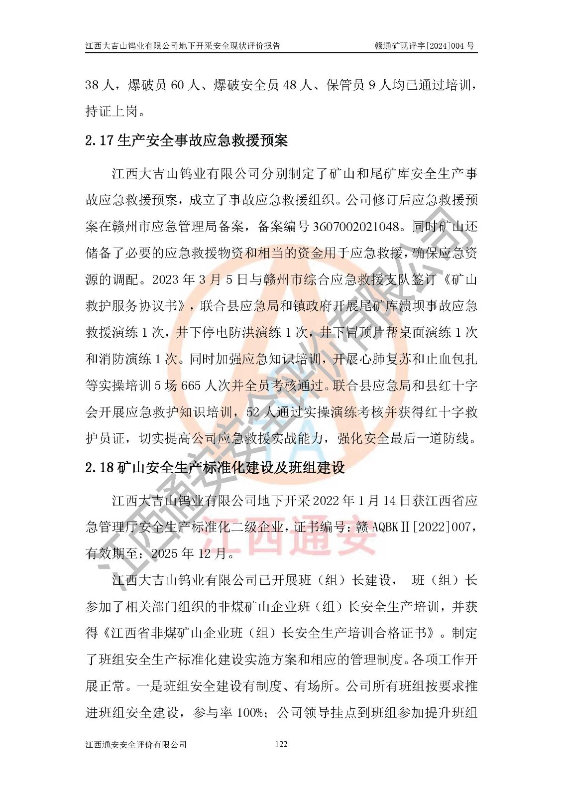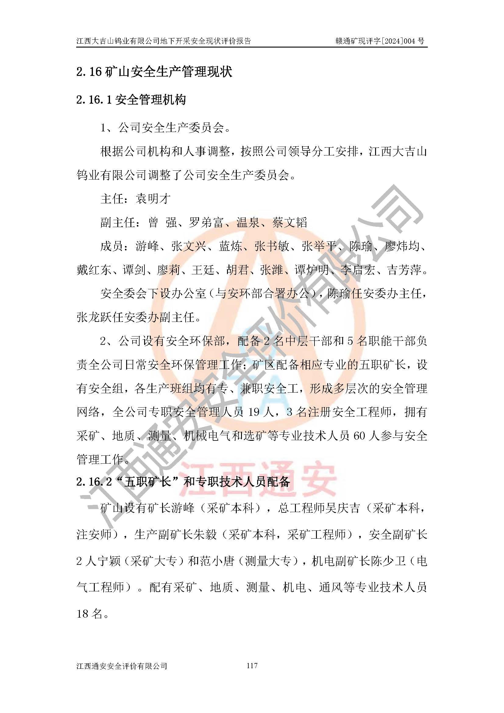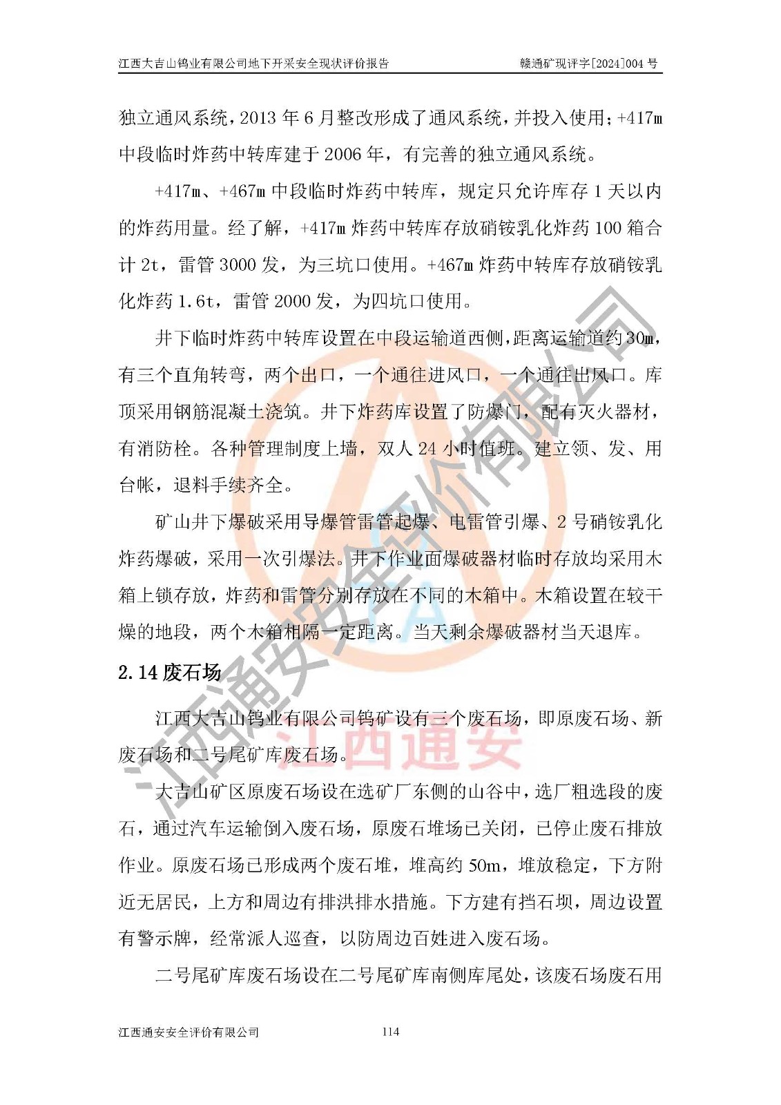 項(xiàng)目簡介 | 江西大吉山鎢業(yè)有限公司大吉山礦區(qū)位于全南縣城255°方位,直距25**處,屬于南嶺九連山脈中部,地處江西南端贛粵交界處,行政區(qū)劃屬江西省全南縣大吉山鎮(zhèn),地理坐標(biāo)為東經(jīng)114°21′30″,北緯24°31′40″,距江西省贛州市233**,另礦區(qū)內(nèi)有水泥公路到各生產(chǎn)區(qū)及輔助生產(chǎn)點(diǎn),交通便利。 礦井開拓情況現(xiàn)狀為:平硐+豎井聯(lián)合開拓,共開拓了+567m、+517m、+467m三個(gè)平硐中段和+417m、+367m、+317m、+267m中段及南組上部+732m、+666m、+625m三中段,中北組西部+729m、+662m、+625m三中段,中北組東部+680m、+632m兩中段等十四個(gè)中段。前期形成的中段**為37~67m,+567m以下中段**50m;主平窿標(biāo)高為+467m。目前作業(yè)中段有6個(gè),分別為+517m 、+467m、+367m、+317m 、+267m。+567m中段已回采完并進(jìn)行了封閉。主要開拓工程有:明副豎井(+567m~+267m)、2#箕斗井(+517m~+267m)、3#盲豎井(+467m~+317m)、鉭鈮豎井(+593.5m~+267m)、+467m主平窿;+456m放水平窿?,F(xiàn)有生產(chǎn)作業(yè)面10個(gè),分布在:+567m中段采場1個(gè)、采準(zhǔn)1個(gè);+417m中段采場1個(gè)(11#西二采);+367m中段采場1個(gè)(237西一采);+317m中段采場4個(gè)(243西四五采、231西一采、21#西四綜采、16#東二綜采);+267m中段采場2個(gè)(2513東八采、21#西三采)。 礦山取得安全生產(chǎn)許可證后,嚴(yán)格按照設(shè)計(jì)回采順序(中段按從上到下的順序開采)要求進(jìn)行開采。礦山現(xiàn)采用平窿+盲箕斗豎井+明罐籠豎井聯(lián)合開拓方式,共開拓+567m、+517m、+467m、+417m、+367m、+317m、+267m中段七個(gè)中段,目前+567m中段已回采完并進(jìn)行了封閉。 礦山隱蔽致災(zāi)因素普查治理工作由江西大吉山鎢業(yè)有限公司組織開展,贛州有色冶金研究所有限公司、江西省物化探地質(zhì)工程有限公司和贛州鑫宇礦冶有限公司提供物探和水文地質(zhì)調(diào)查等技術(shù)服務(wù)。2023年12月提交了《江西大吉山鎢業(yè)有限公司礦山隱蔽致災(zāi)因素普查治理報(bào)告》。報(bào)告基于礦山現(xiàn)有技術(shù)資料,從采空區(qū)致災(zāi)因素、水文地質(zhì)致災(zāi)因素、地壓致災(zāi)因素、火災(zāi)致災(zāi)因素等方面對(duì)大吉山鎢業(yè)礦山隱蔽致災(zāi)因素進(jìn)行了全面排查,并結(jié)合礦山實(shí)際情況對(duì)各類典型的隱蔽致災(zāi)因素進(jìn)行了風(fēng)險(xiǎn)分析與評(píng)估,在工程、技術(shù)、管理、應(yīng)急、個(gè)體防護(hù)等方面提出了相應(yīng)的防控措施。2024年1月8日企業(yè)組織專家對(duì)報(bào)告進(jìn)行了評(píng)審并通過評(píng)審。 礦山設(shè)有礦長游峰(采礦本科),總工程師吳慶吉(采礦本科,注安師),生產(chǎn)副礦長朱毅(采礦本科,采礦工程師),安全副礦長2人寧穎(采礦大專)和范小唐(測(cè)量大專),機(jī)電副礦長陳少衛(wèi)(電氣工程師)。配有采礦、地質(zhì)、測(cè)量、機(jī)電、通風(fēng)等專業(yè)技術(shù)人員18名。 根據(jù)《安全生產(chǎn)法》、《礦山安全法》、《安全生產(chǎn)許可證條例》等有關(guān)法律、法規(guī)的規(guī)定以及江西省安全生產(chǎn)監(jiān)督管理局《關(guān)于進(jìn)一步加強(qiáng)我省非煤地下礦山安全生產(chǎn)許可工作的通知》(贛安監(jiān)管一字〔2012〕253號(hào))要求,2023年10月26日,礦山委托我公司(江西通安安全評(píng)價(jià)有限公司)對(duì)江西大吉山鎢業(yè)有限公司地下開采進(jìn)行安全現(xiàn)狀評(píng)價(jià)。 | ||||