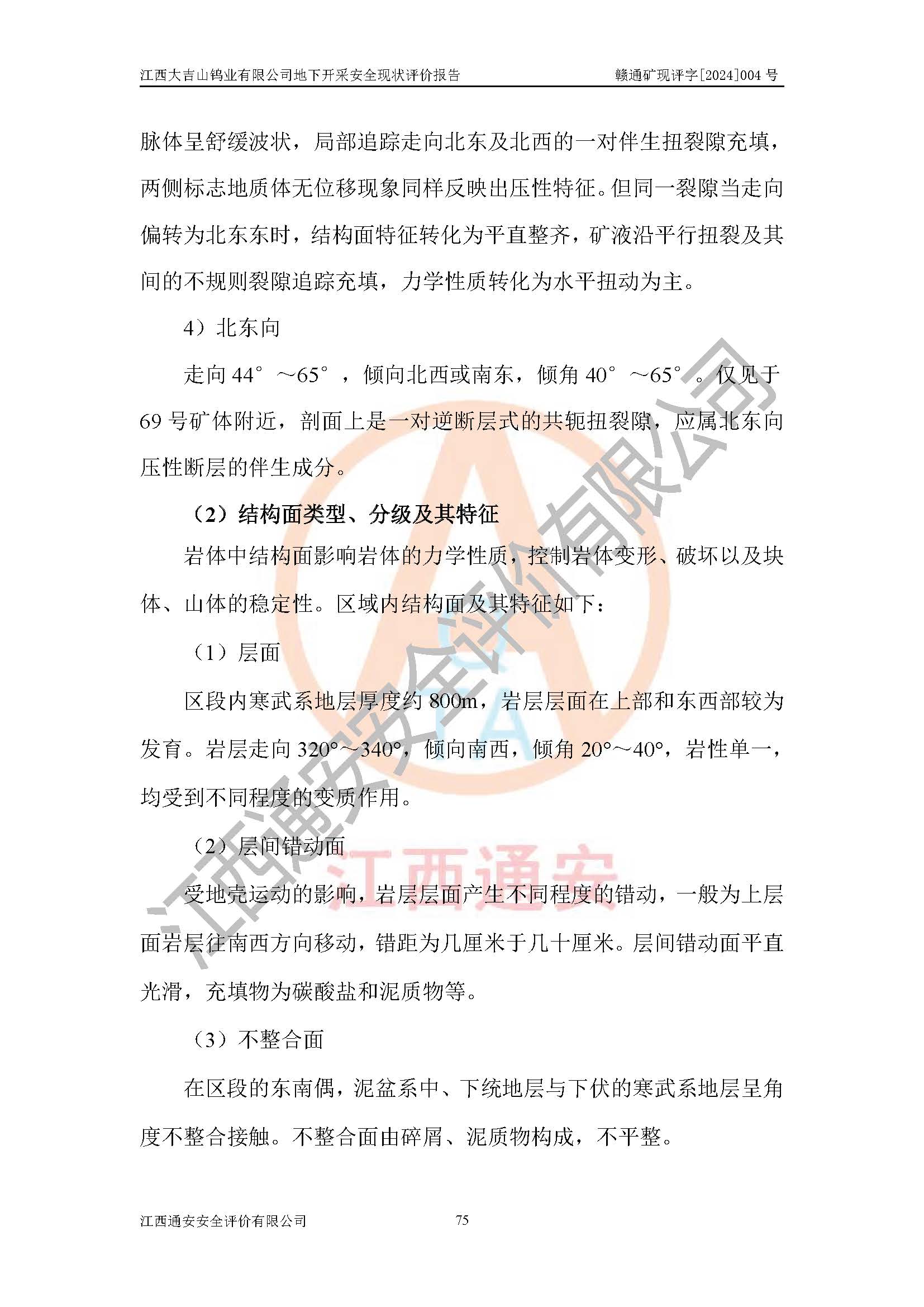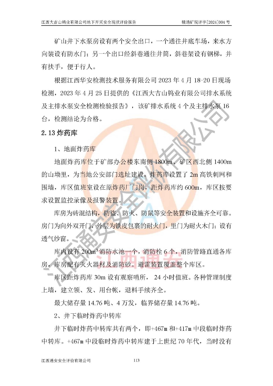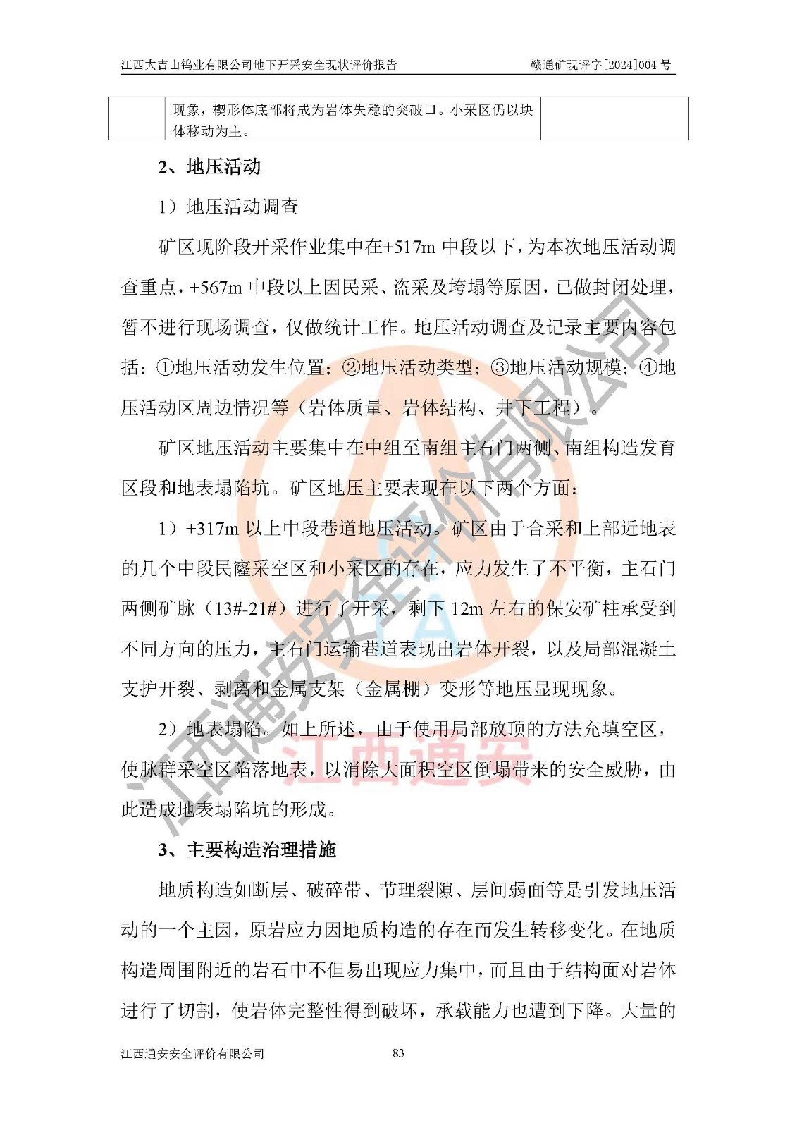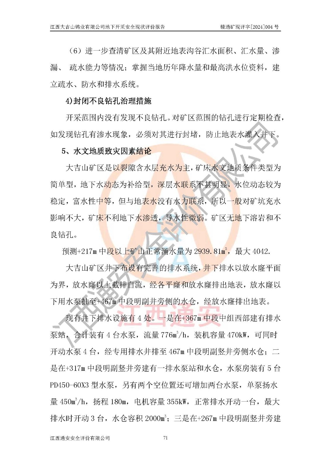 項(xiàng)目簡介 | 江西大吉山鎢業(yè)有限公司大吉山礦區(qū)位于全南縣城255°方位,直距25**處,屬于南嶺九連山脈中部,地處江西南端贛粵交界處,行政區(qū)劃屬江西省全南縣大吉山鎮(zhèn),地理坐標(biāo)為東經(jīng)114°21′30″,北緯24°31′40″,距江西省贛州市233**,另礦區(qū)內(nèi)有水泥公路到各生產(chǎn)區(qū)及輔助生產(chǎn)點(diǎn),交通便利。 礦井開拓情況現(xiàn)狀為:平硐+豎井聯(lián)合開拓,共開拓了+567m、+517m、+467m三個(gè)平硐中段和+417m、+367m、+317m、+267m中段及南組上部+732m、+666m、+625m三中段,中北組西部+729m、+662m、+625m三中段,中北組東部+680m、+632m兩中段等十四個(gè)中段。前期形成的中段**為37~67m,+567m以下中段**50m;主平窿標(biāo)高為+467m。目前作業(yè)中段有6個(gè),分別為+517m 、+467m、+367m、+317m 、+267m。+567m中段已回采完并進(jìn)行了封閉。主要開拓工程有:明副豎井(+567m~+267m)、2#箕斗井(+517m~+267m)、3#盲豎井(+467m~+317m)、鉭鈮豎井(+593.5m~+267m)、+467m主平窿;+456m放水平窿?,F(xiàn)有生產(chǎn)作業(yè)面10個(gè),分布在:+567m中段采場1個(gè)、采準(zhǔn)1個(gè);+417m中段采場1個(gè)(11#西二采);+367m中段采場1個(gè)(237西一采);+317m中段采場4個(gè)(243西四五采、231西一采、21#西四綜采、16#東二綜采);+267m中段采場2個(gè)(2513東八采、21#西三采)。 礦山取得安全生產(chǎn)許可證后,嚴(yán)格按照設(shè)計(jì)回采順序(中段按從上到下的順序開采)要求進(jìn)行開采。礦山現(xiàn)采用平窿+盲箕斗豎井+明罐籠豎井聯(lián)合開拓方式,共開拓+567m、+517m、+467m、+417m、+367m、+317m、+267m中段七個(gè)中段,目前+567m中段已回采完并進(jìn)行了封閉。 礦山隱蔽致災(zāi)因素普查治理工作由江西大吉山鎢業(yè)有限公司組織開展,贛州有色冶金研究所有限公司、江西省物化探地質(zhì)工程有限公司和贛州鑫宇礦冶有限公司提供物探和水文地質(zhì)調(diào)查等技術(shù)服務(wù)。2023年12月提交了《江西大吉山鎢業(yè)有限公司礦山隱蔽致災(zāi)因素普查治理報(bào)告》。報(bào)告基于礦山現(xiàn)有技術(shù)資料,從采空區(qū)致災(zāi)因素、水文地質(zhì)致災(zāi)因素、地壓致災(zāi)因素、火災(zāi)致災(zāi)因素等方面對(duì)大吉山鎢業(yè)礦山隱蔽致災(zāi)因素進(jìn)行了全面排查,并結(jié)合礦山實(shí)際情況對(duì)各類典型的隱蔽致災(zāi)因素進(jìn)行了風(fēng)險(xiǎn)分析與評(píng)估,在工程、技術(shù)、管理、應(yīng)急、個(gè)體防護(hù)等方面提出了相應(yīng)的防控措施。2024年1月8日企業(yè)組織專家對(duì)報(bào)告進(jìn)行了評(píng)審并通過評(píng)審。 礦山設(shè)有礦長游峰(采礦本科),總工程師吳慶吉(采礦本科,注安師),生產(chǎn)副礦長朱毅(采礦本科,采礦工程師),安全副礦長2人寧穎(采礦大專)和范小唐(測(cè)量大專),機(jī)電副礦長陳少衛(wèi)(電氣工程師)。配有采礦、地質(zhì)、測(cè)量、機(jī)電、通風(fēng)等專業(yè)技術(shù)人員18名。 根據(jù)《安全生產(chǎn)法》、《礦山安全法》、《安全生產(chǎn)許可證條例》等有關(guān)法律、法規(guī)的規(guī)定以及江西省安全生產(chǎn)監(jiān)督管理局《關(guān)于進(jìn)一步加強(qiáng)我省非煤地下礦山安全生產(chǎn)許可工作的通知》(贛安監(jiān)管一字〔2012〕253號(hào))要求,2023年10月26日,礦山委托我公司(江西通安安全評(píng)價(jià)有限公司)對(duì)江西大吉山鎢業(yè)有限公司地下開采進(jìn)行安全現(xiàn)狀評(píng)價(jià)。 | ||||