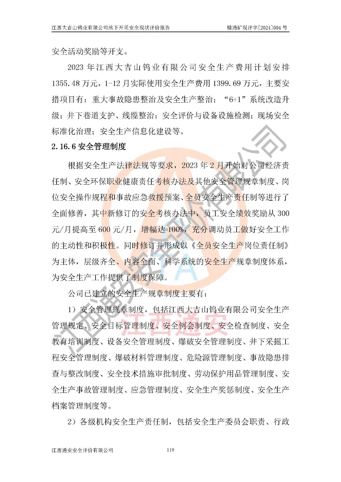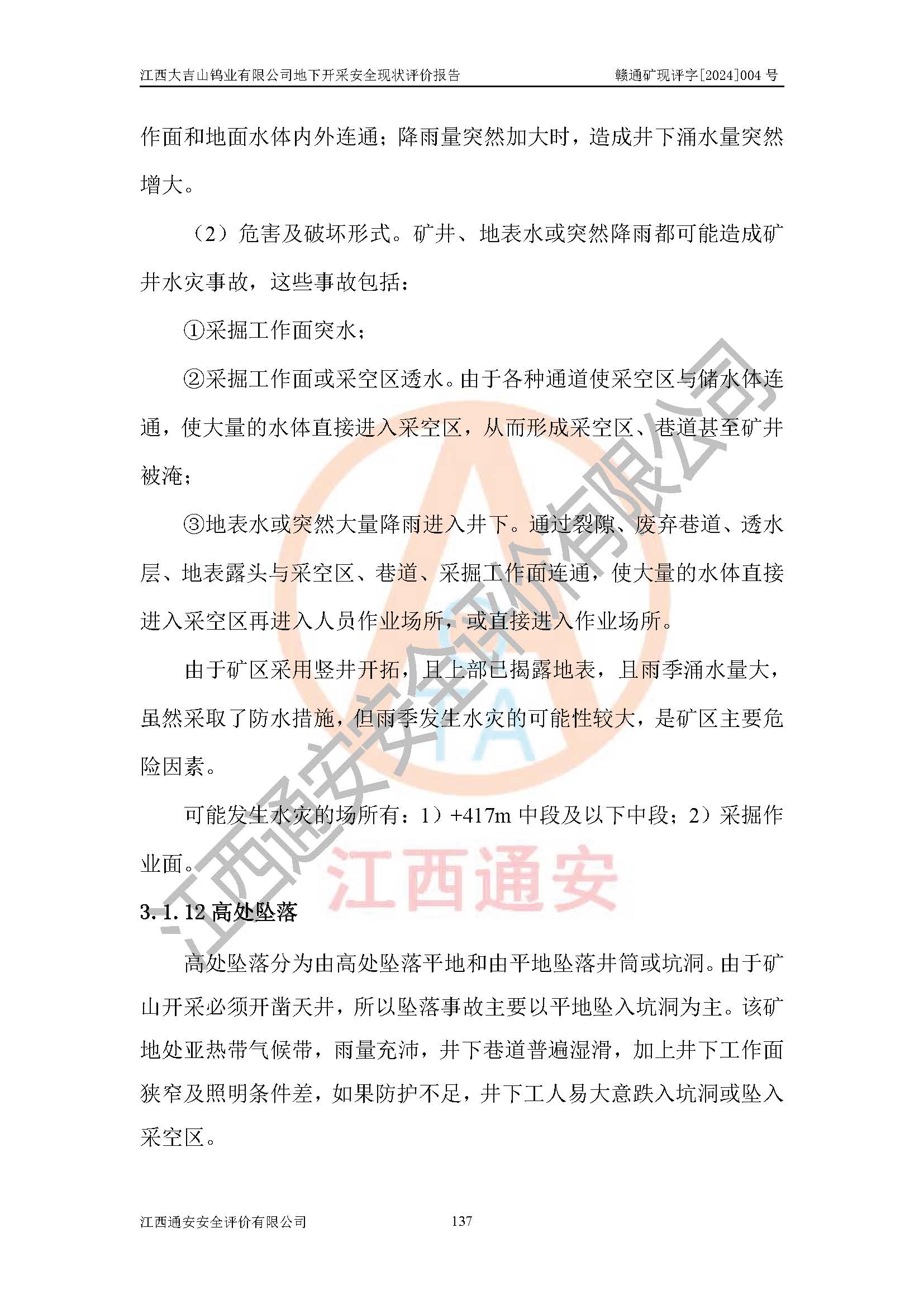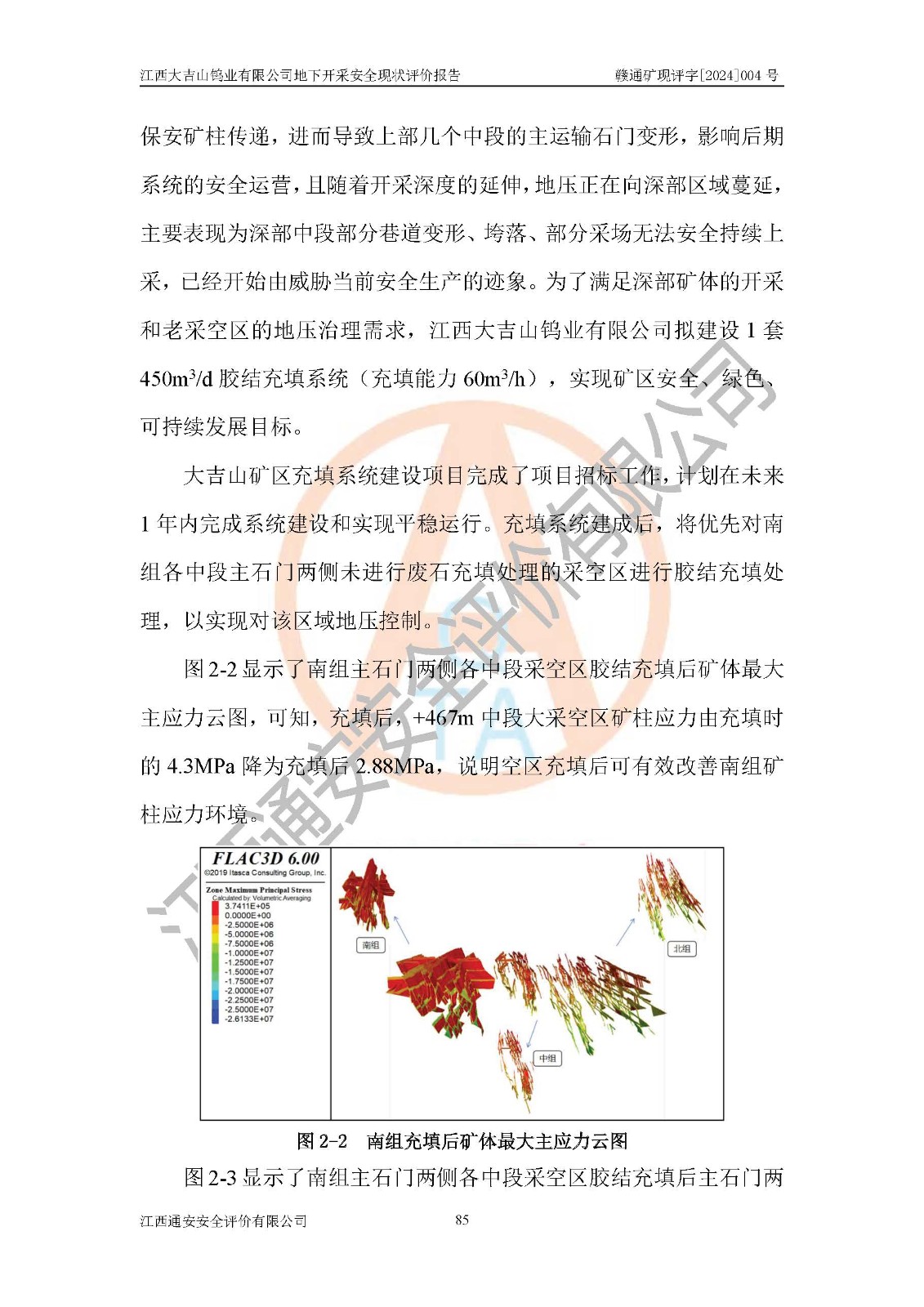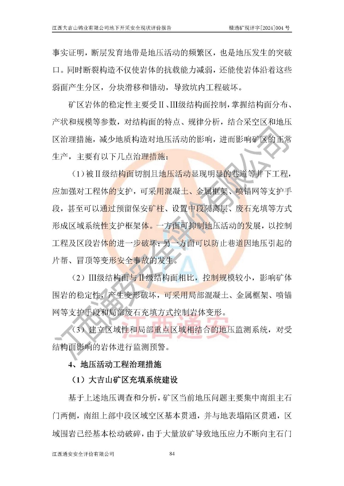 項(xiàng)目簡介 | 江西大吉山鎢業(yè)有限公司大吉山礦區(qū)位于全南縣城255°方位,直距25**處,屬于南嶺九連山脈中部,地處江西南端贛粵交界處,行政區(qū)劃屬江西省全南縣大吉山鎮(zhèn),地理坐標(biāo)為東經(jīng)114°21′30″,北緯24°31′40″,距江西省贛州市233**,另礦區(qū)內(nèi)有水泥公路到各生產(chǎn)區(qū)及輔助生產(chǎn)點(diǎn),交通便利。 礦井開拓情況現(xiàn)狀為:平硐+豎井聯(lián)合開拓,共開拓了+567m、+517m、+467m三個(gè)平硐中段和+417m、+367m、+317m、+267m中段及南組上部+732m、+666m、+625m三中段,中北組西部+729m、+662m、+625m三中段,中北組東部+680m、+632m兩中段等十四個(gè)中段。前期形成的中段**為37~67m,+567m以下中段**50m;主平窿標(biāo)高為+467m。目前作業(yè)中段有6個(gè),分別為+517m 、+467m、+367m、+317m 、+267m。+567m中段已回采完并進(jìn)行了封閉。主要開拓工程有:明副豎井(+567m~+267m)、2#箕斗井(+517m~+267m)、3#盲豎井(+467m~+317m)、鉭鈮豎井(+593.5m~+267m)、+467m主平窿;+456m放水平窿?,F(xiàn)有生產(chǎn)作業(yè)面10個(gè),分布在:+567m中段采場1個(gè)、采準(zhǔn)1個(gè);+417m中段采場1個(gè)(11#西二采);+367m中段采場1個(gè)(237西一采);+317m中段采場4個(gè)(243西四五采、231西一采、21#西四綜采、16#東二綜采);+267m中段采場2個(gè)(2513東八采、21#西三采)。 礦山取得安全生產(chǎn)許可證后,嚴(yán)格按照設(shè)計(jì)回采順序(中段按從上到下的順序開采)要求進(jìn)行開采。礦山現(xiàn)采用平窿+盲箕斗豎井+明罐籠豎井聯(lián)合開拓方式,共開拓+567m、+517m、+467m、+417m、+367m、+317m、+267m中段七個(gè)中段,目前+567m中段已回采完并進(jìn)行了封閉。 礦山隱蔽致災(zāi)因素普查治理工作由江西大吉山鎢業(yè)有限公司組織開展,贛州有色冶金研究所有限公司、江西省物化探地質(zhì)工程有限公司和贛州鑫宇礦冶有限公司提供物探和水文地質(zhì)調(diào)查等技術(shù)服務(wù)。2023年12月提交了《江西大吉山鎢業(yè)有限公司礦山隱蔽致災(zāi)因素普查治理報(bào)告》。報(bào)告基于礦山現(xiàn)有技術(shù)資料,從采空區(qū)致災(zāi)因素、水文地質(zhì)致災(zāi)因素、地壓致災(zāi)因素、火災(zāi)致災(zāi)因素等方面對(duì)大吉山鎢業(yè)礦山隱蔽致災(zāi)因素進(jìn)行了全面排查,并結(jié)合礦山實(shí)際情況對(duì)各類典型的隱蔽致災(zāi)因素進(jìn)行了風(fēng)險(xiǎn)分析與評(píng)估,在工程、技術(shù)、管理、應(yīng)急、個(gè)體防護(hù)等方面提出了相應(yīng)的防控措施。2024年1月8日企業(yè)組織專家對(duì)報(bào)告進(jìn)行了評(píng)審并通過評(píng)審。 礦山設(shè)有礦長游峰(采礦本科),總工程師吳慶吉(采礦本科,注安師),生產(chǎn)副礦長朱毅(采礦本科,采礦工程師),安全副礦長2人寧穎(采礦大專)和范小唐(測(cè)量大專),機(jī)電副礦長陳少衛(wèi)(電氣工程師)。配有采礦、地質(zhì)、測(cè)量、機(jī)電、通風(fēng)等專業(yè)技術(shù)人員18名。 根據(jù)《安全生產(chǎn)法》、《礦山安全法》、《安全生產(chǎn)許可證條例》等有關(guān)法律、法規(guī)的規(guī)定以及江西省安全生產(chǎn)監(jiān)督管理局《關(guān)于進(jìn)一步加強(qiáng)我省非煤地下礦山安全生產(chǎn)許可工作的通知》(贛安監(jiān)管一字〔2012〕253號(hào))要求,2023年10月26日,礦山委托我公司(江西通安安全評(píng)價(jià)有限公司)對(duì)江西大吉山鎢業(yè)有限公司地下開采進(jìn)行安全現(xiàn)狀評(píng)價(jià)。 | ||||