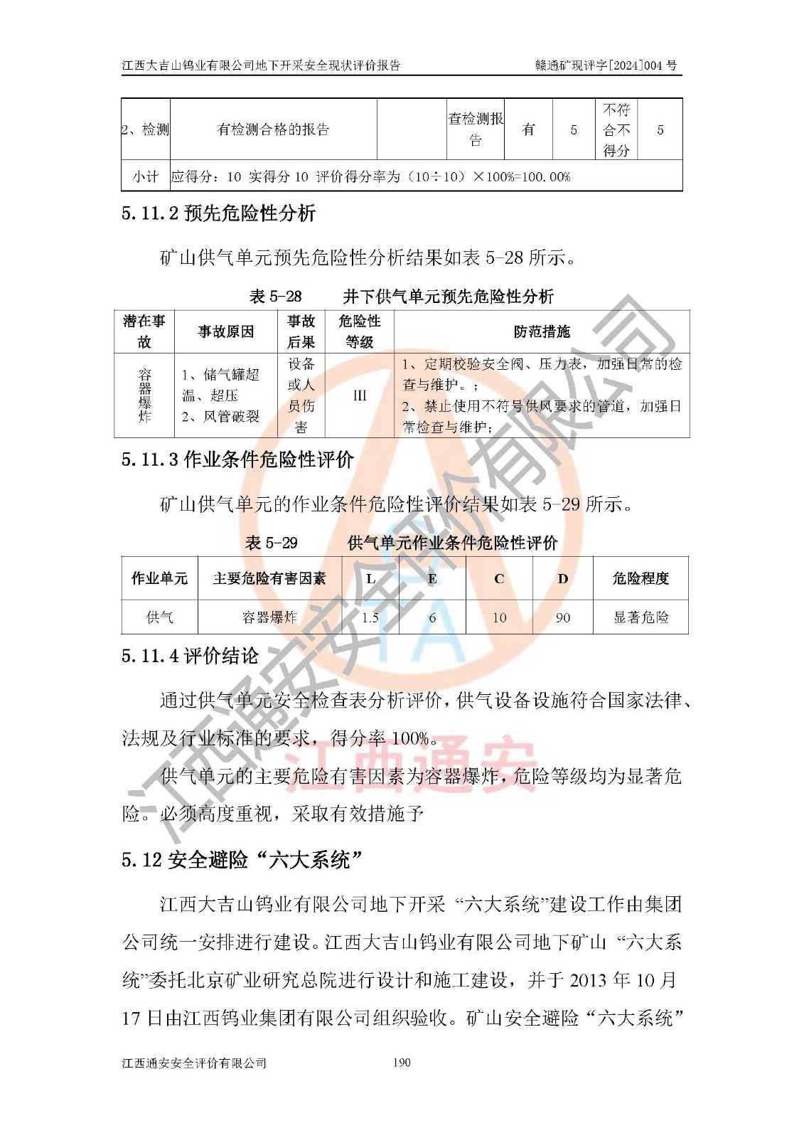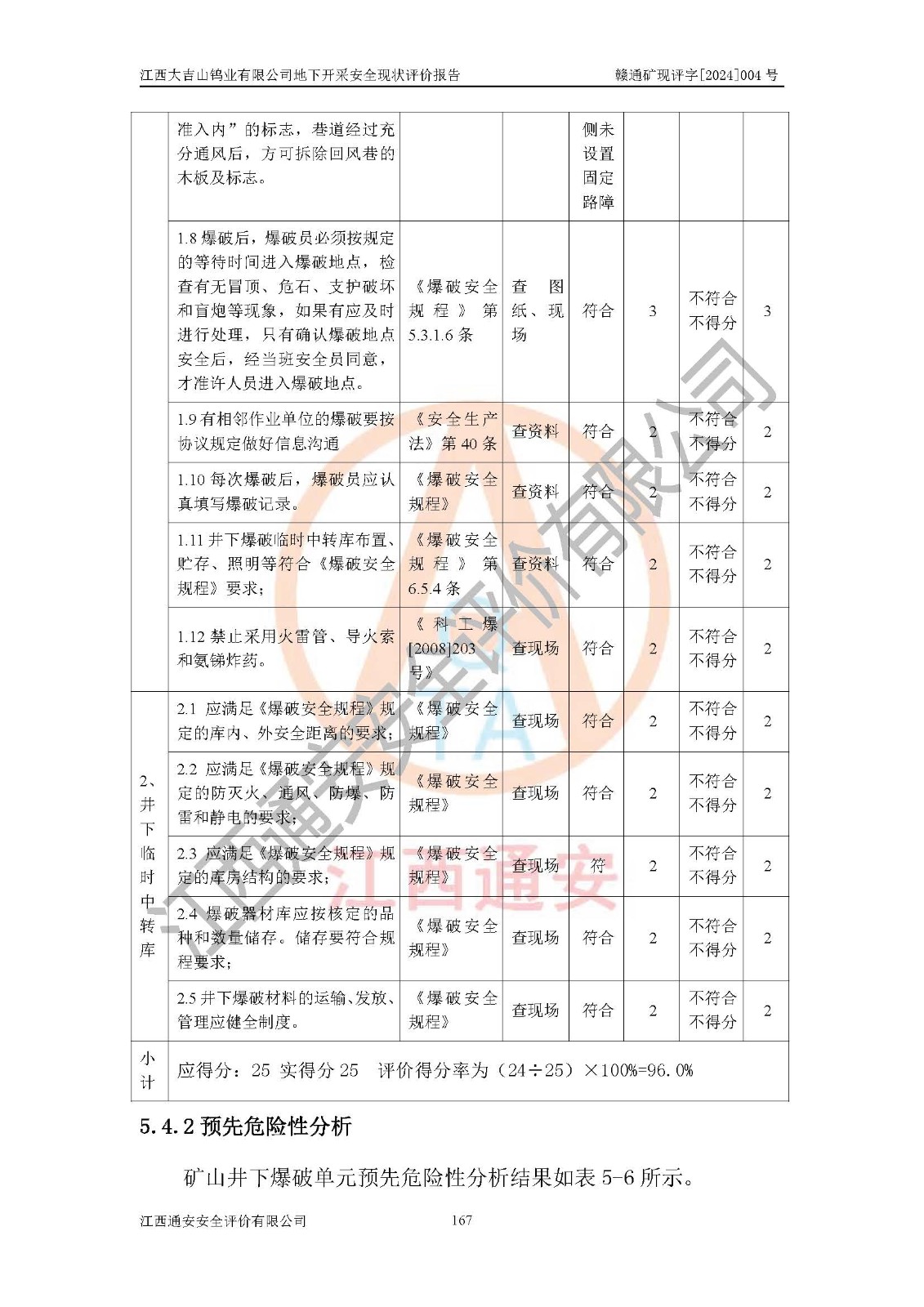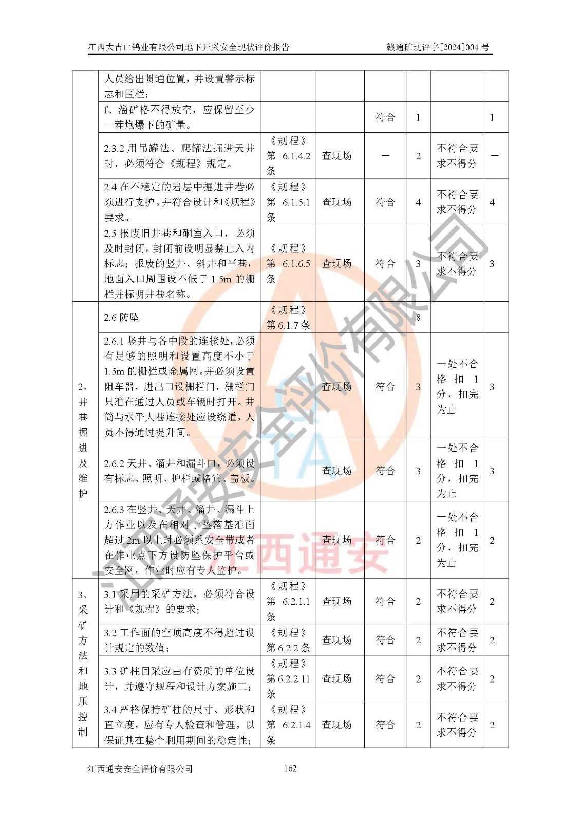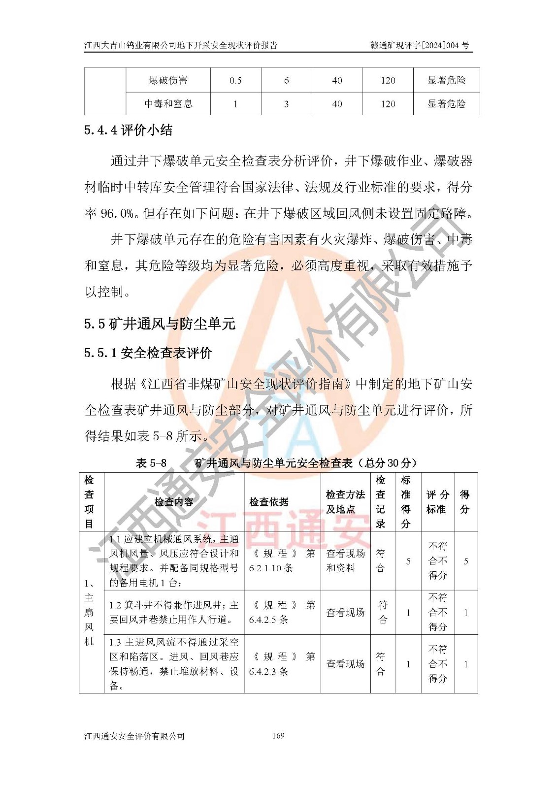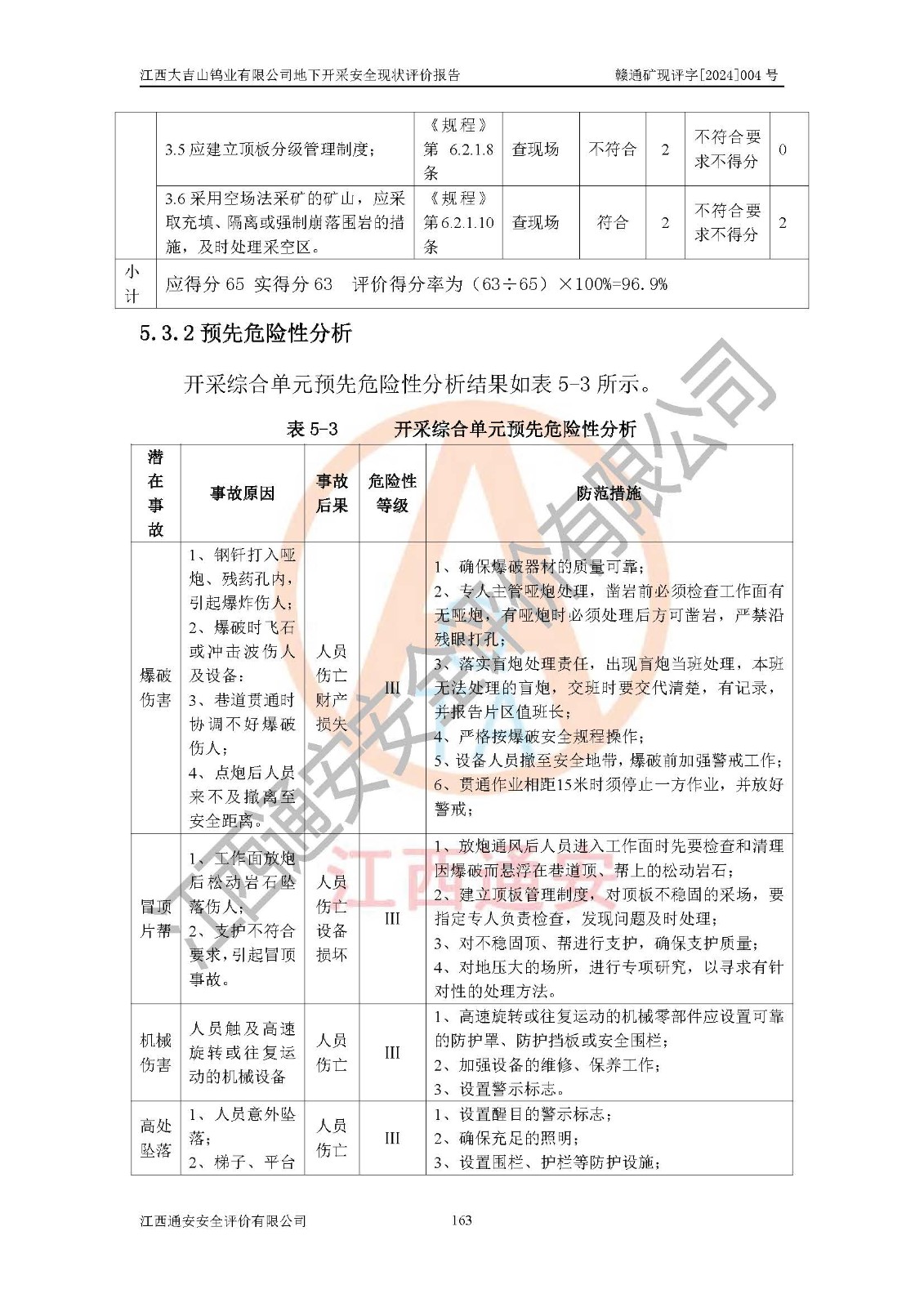 其它 | 江西大吉山鎢業(yè)有限公司地下開采在生產(chǎn)過程中存在的危險(xiǎn)、有害因素有:冒頂片幫、透水、淹溺、火災(zāi)、觸電、火藥爆炸、爆破(放炮)、容器爆炸、中毒和窒息、機(jī)械傷害、高處墜落、物體打擊、起重傷害、提升運(yùn)輸、**傷害、粉塵、噪聲、振動(dòng)等。地下開采有4個(gè)危險(xiǎn)、有害因素為災(zāi)難性的Ⅳ級(jí),有4個(gè)危險(xiǎn)、有害因素的危險(xiǎn)等級(jí)屬危險(xiǎn)的Ⅲ級(jí);有6個(gè)危險(xiǎn)、有害因素的危險(xiǎn)等級(jí)屬臨界的Ⅱ級(jí);有8個(gè)危險(xiǎn)、有害因素的危險(xiǎn)等級(jí)屬安全的Ⅰ級(jí)。 采用《江西省非煤礦山安全現(xiàn)狀評(píng)價(jià)指南》中的檢查表評(píng)價(jià)結(jié)果為:得分率96.4%, A類礦山,即屬于“安全生產(chǎn)條件較好,生產(chǎn)活動(dòng)有安全保障”的礦山江西大吉山鎢業(yè)有限公司地下開采為A類礦山。 江西大吉山鎢業(yè)有限公司地下開采的主要生產(chǎn)及輔助系統(tǒng):提升運(yùn)輸、排水、供配電、通風(fēng)、供風(fēng)、采掘、安全避險(xiǎn)“六大系統(tǒng)”等符合法律法規(guī)要求和規(guī)程、規(guī)范要求;各種危險(xiǎn)有害因素及不可接受的風(fēng)險(xiǎn)在運(yùn)行中認(rèn)真落實(shí)行之**的技術(shù)措施或管理措施,嚴(yán)格按規(guī)程,按要求加強(qiáng)管理,可以避免和控制各類事故,**安全生產(chǎn)。現(xiàn)階段礦山設(shè)備、設(shè)施和場所符合**安全生產(chǎn)有關(guān)法律、法規(guī)、標(biāo)準(zhǔn)及規(guī)范的規(guī)定。礦山采用平硐+豎井聯(lián)合開拓方式,安全生產(chǎn)條件較好;安全管理能滿足法規(guī)要求,礦山地下開采符合**規(guī)定的安全生產(chǎn)條件。 | ||||