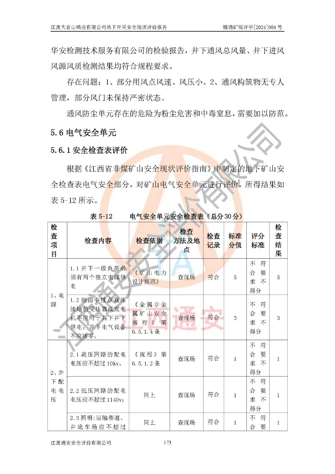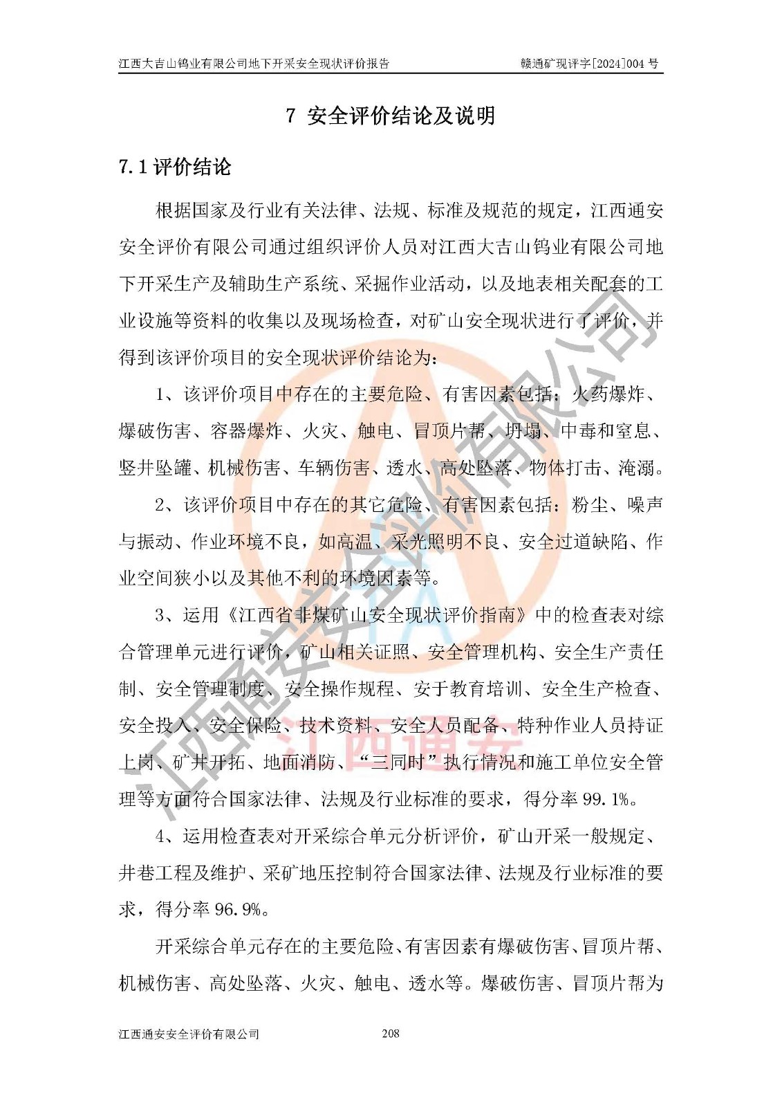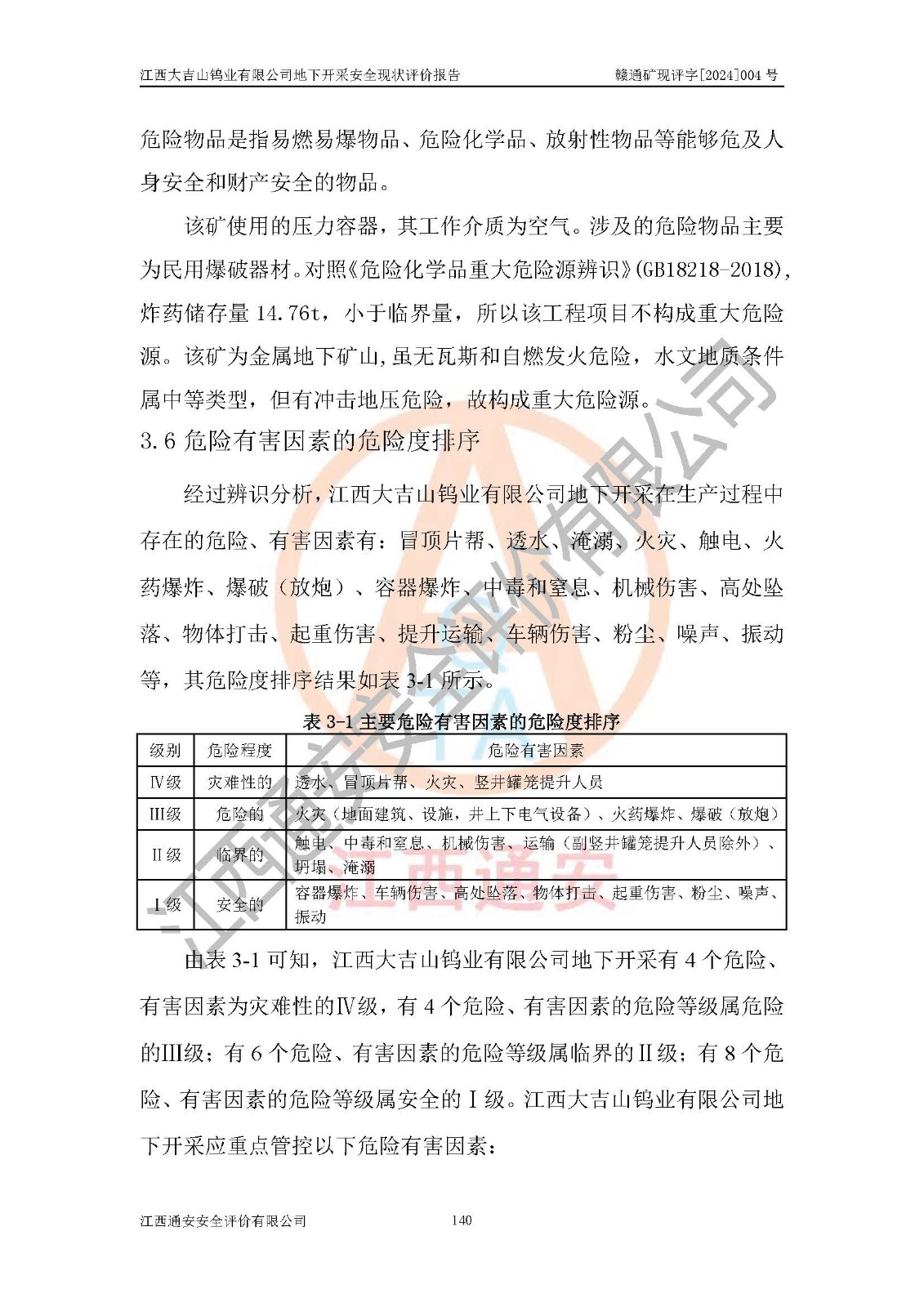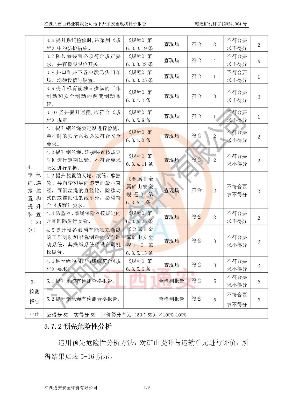 其它 | 江西大吉山鎢業(yè)有限公司地下開采在生產(chǎn)過程中存在的危險(xiǎn)、有害因素有:冒頂片幫、透水、淹溺、火災(zāi)、觸電、火藥爆炸、爆破(放炮)、容器爆炸、中毒和窒息、機(jī)械傷害、高處墜落、物體打擊、起重傷害、提升運(yùn)輸、**傷害、粉塵、噪聲、振動(dòng)等。地下開采有4個(gè)危險(xiǎn)、有害因素為災(zāi)難性的Ⅳ級(jí),有4個(gè)危險(xiǎn)、有害因素的危險(xiǎn)等級(jí)屬危險(xiǎn)的Ⅲ級(jí);有6個(gè)危險(xiǎn)、有害因素的危險(xiǎn)等級(jí)屬臨界的Ⅱ級(jí);有8個(gè)危險(xiǎn)、有害因素的危險(xiǎn)等級(jí)屬安全的Ⅰ級(jí)。 采用《江西省非煤礦山安全現(xiàn)狀評(píng)價(jià)指南》中的檢查表評(píng)價(jià)結(jié)果為:得分率96.4%, A類礦山,即屬于“安全生產(chǎn)條件較好,生產(chǎn)活動(dòng)有安全保障”的礦山江西大吉山鎢業(yè)有限公司地下開采為A類礦山。 江西大吉山鎢業(yè)有限公司地下開采的主要生產(chǎn)及輔助系統(tǒng):提升運(yùn)輸、排水、供配電、通風(fēng)、供風(fēng)、采掘、安全避險(xiǎn)“六大系統(tǒng)”等符合法律法規(guī)要求和規(guī)程、規(guī)范要求;各種危險(xiǎn)有害因素及不可接受的風(fēng)險(xiǎn)在運(yùn)行中認(rèn)真落實(shí)行之**的技術(shù)措施或管理措施,嚴(yán)格按規(guī)程,按要求加強(qiáng)管理,可以避免和控制各類事故,**安全生產(chǎn)。現(xiàn)階段礦山設(shè)備、設(shè)施和場所符合**安全生產(chǎn)有關(guān)法律、法規(guī)、標(biāo)準(zhǔn)及規(guī)范的規(guī)定。礦山采用平硐+豎井聯(lián)合開拓方式,安全生產(chǎn)條件較好;安全管理能滿足法規(guī)要求,礦山地下開采符合**規(guī)定的安全生產(chǎn)條件。 | ||||